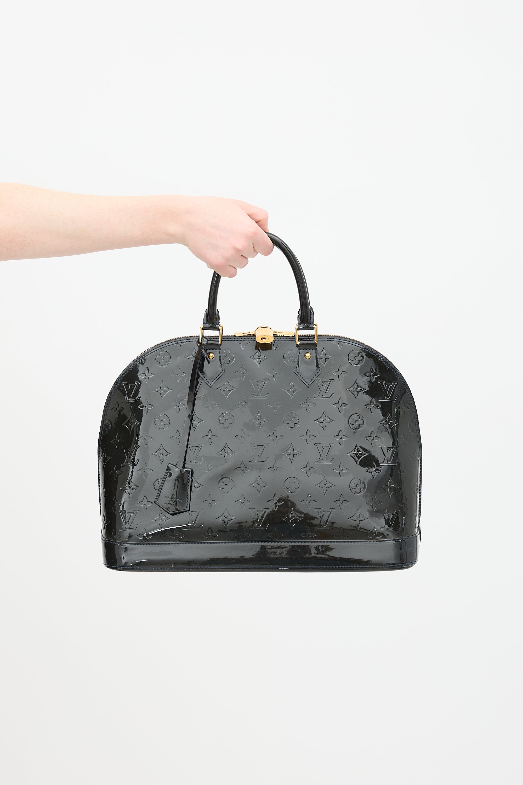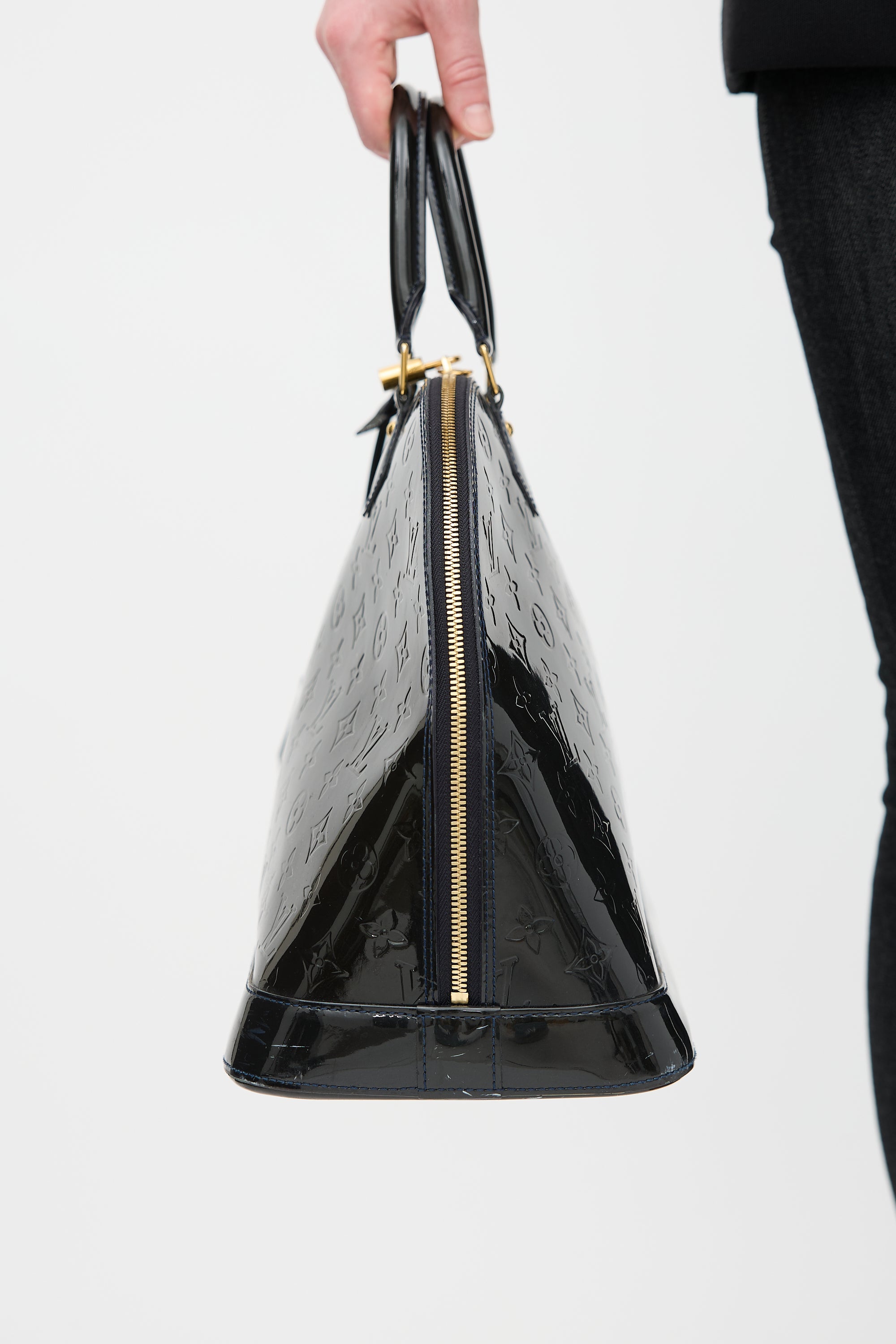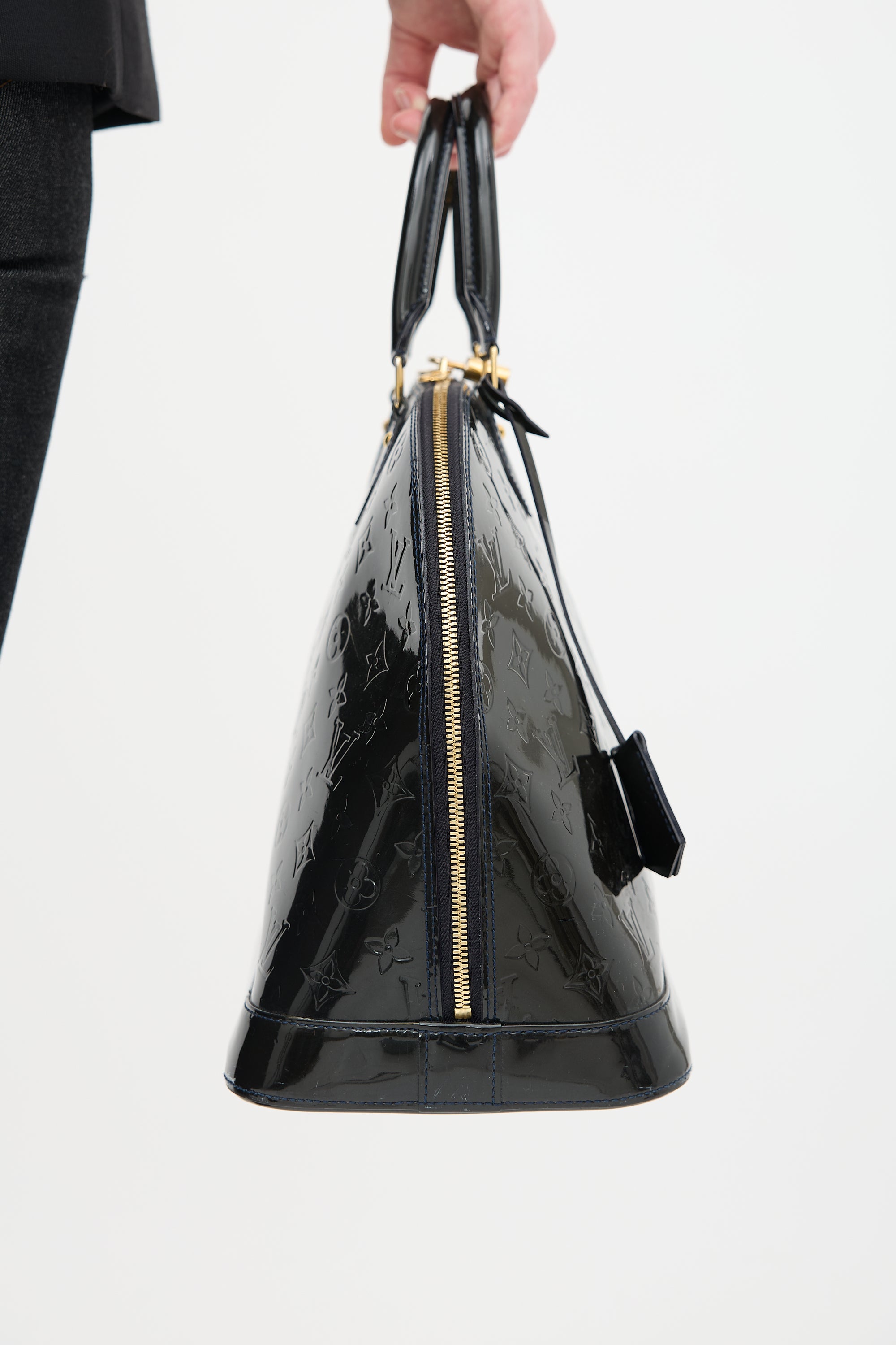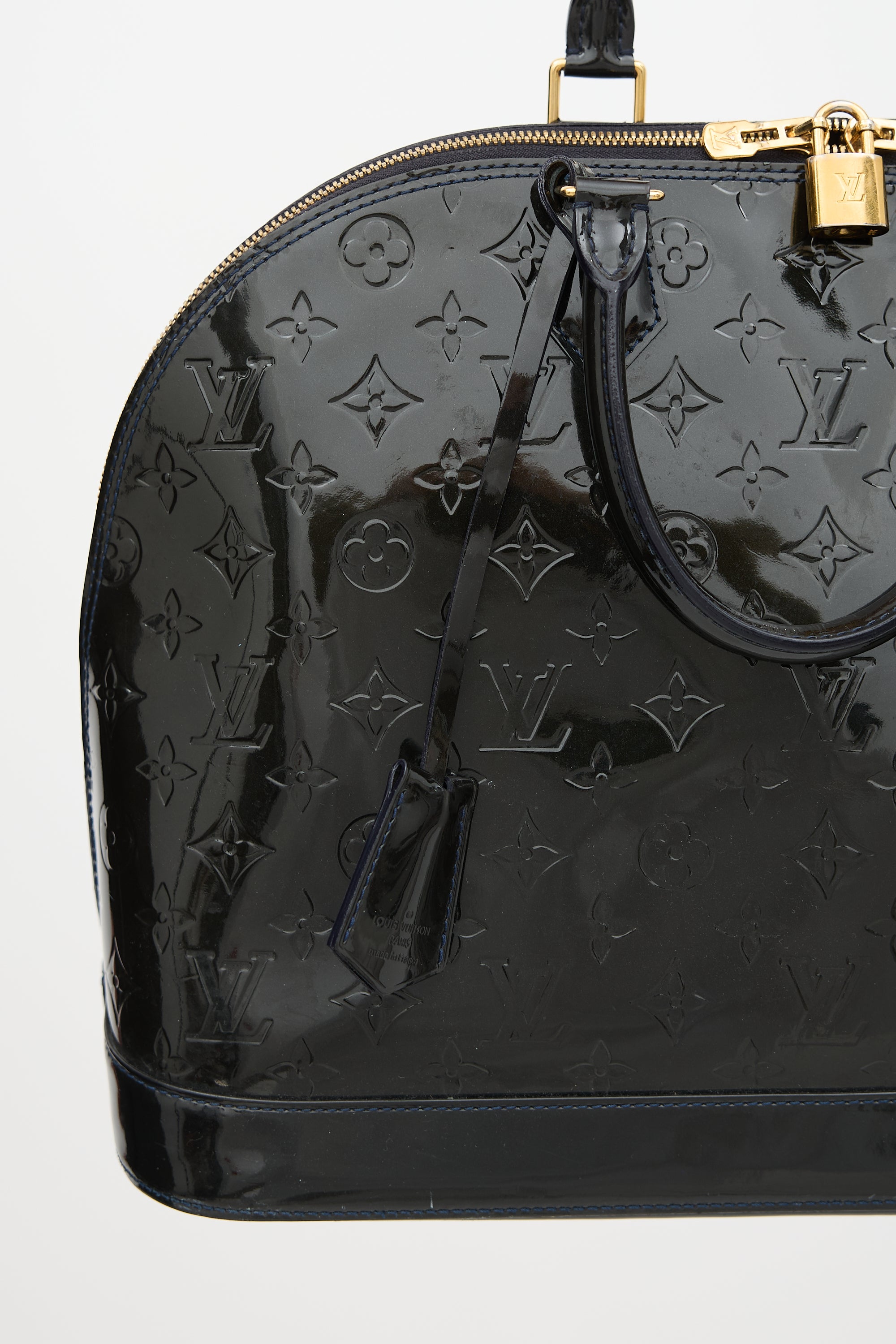 Pre-owned Louis Vuitton 2010 black Vernis Alma bag featuring dual rolled top handles, gold tone hardware, blue stitching throughout, clochette, protective metal feet, dual zip closure top with pull tabs and lock, and canvas lined main compartment with two slip pockets.