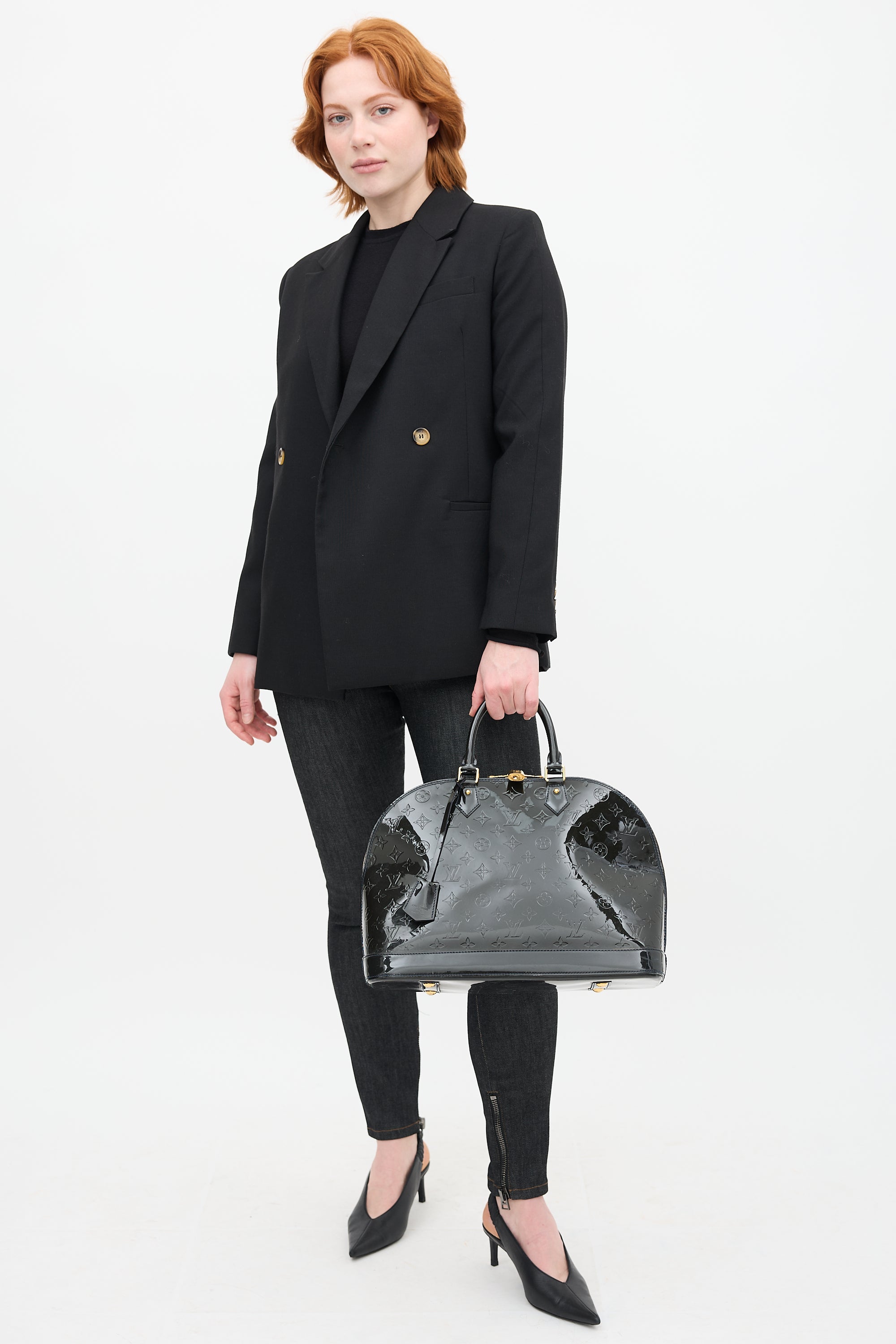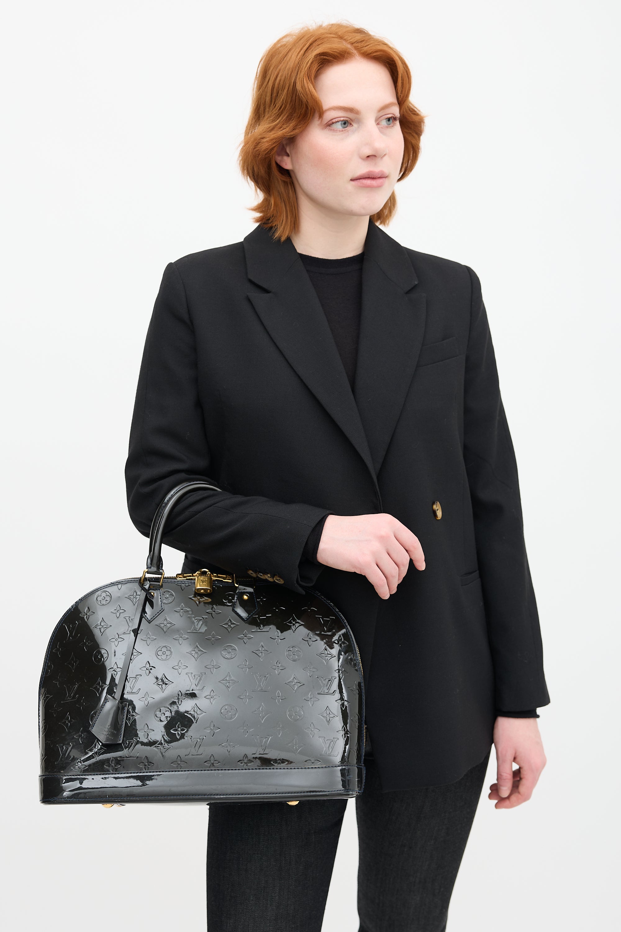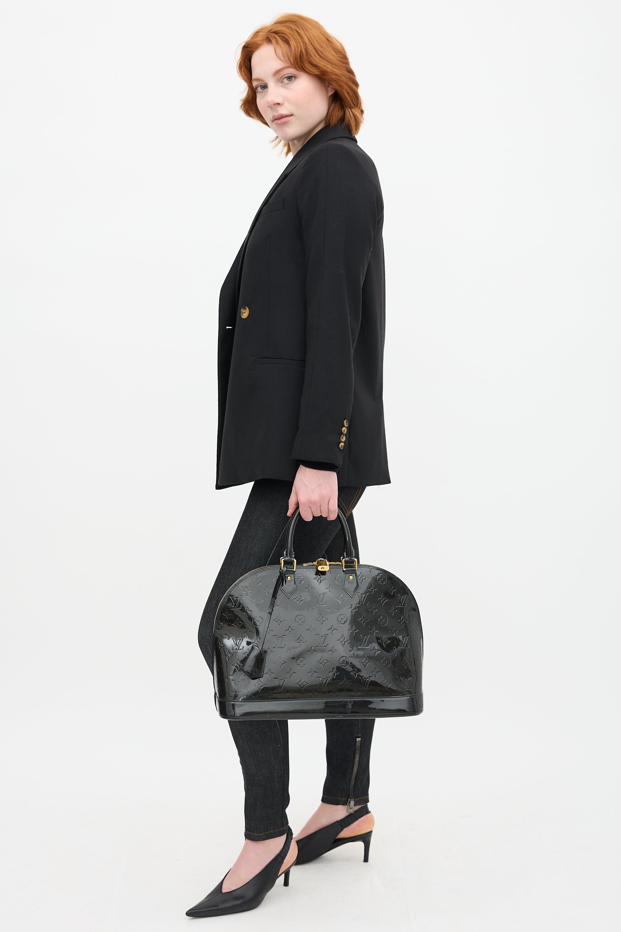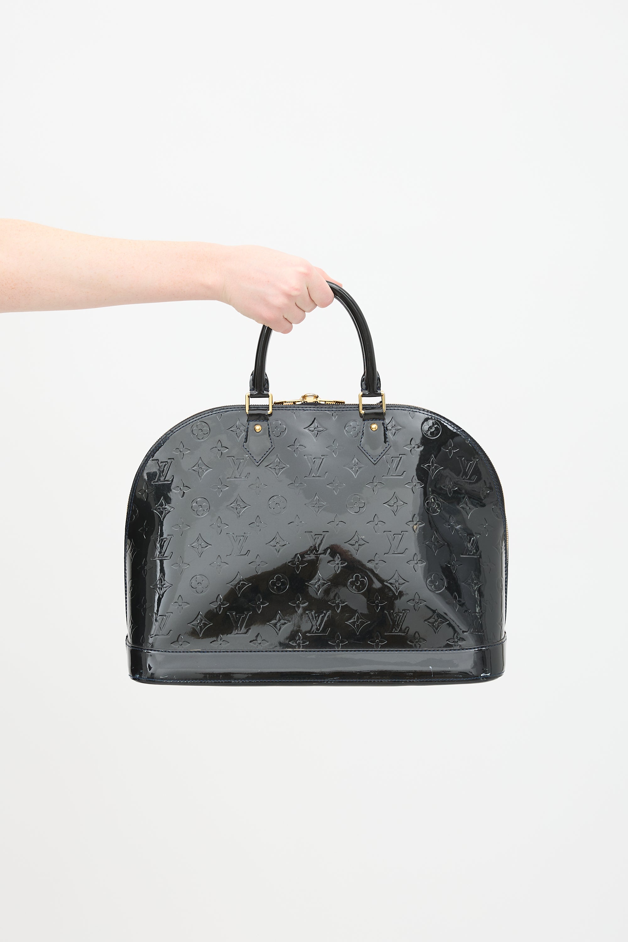 Pre-owned Louis Vuitton 2010 black Vernis Alma bag featuring dual rolled top handles, gold tone hardware, blue stitching throughout, clochette, protective metal feet, dual zip closure top with pull tabs and lock, and canvas lined main compartment with two slip pockets.
