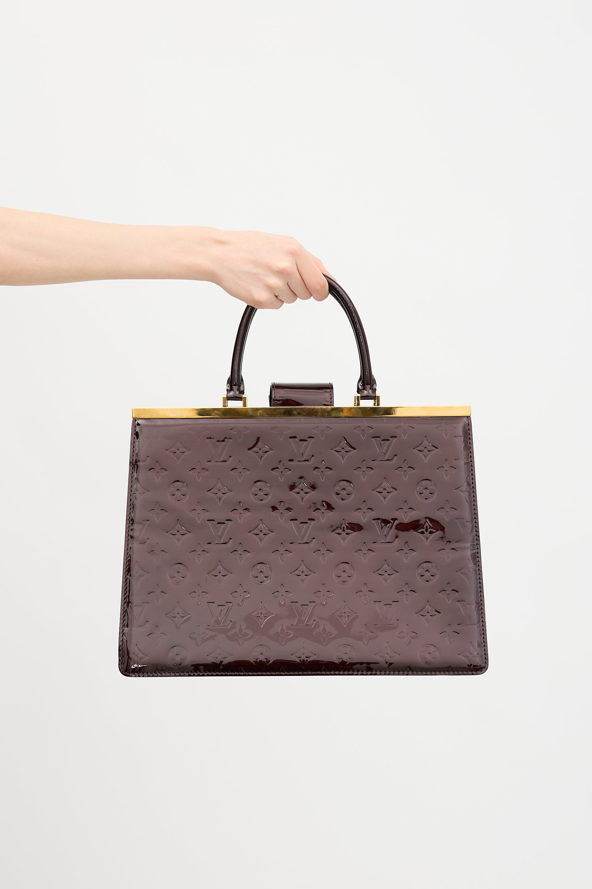 Pre-owned Louis Vuitton 2012 Deesee GM bag featuring a signature monogram debossed Amarante Vernis leather body, gold tone hardware, dual rolled top handles, open top with magnetic strap closure, one zip compartment, and two lined main compartments with two slip pockets. Comes with original dust bag.