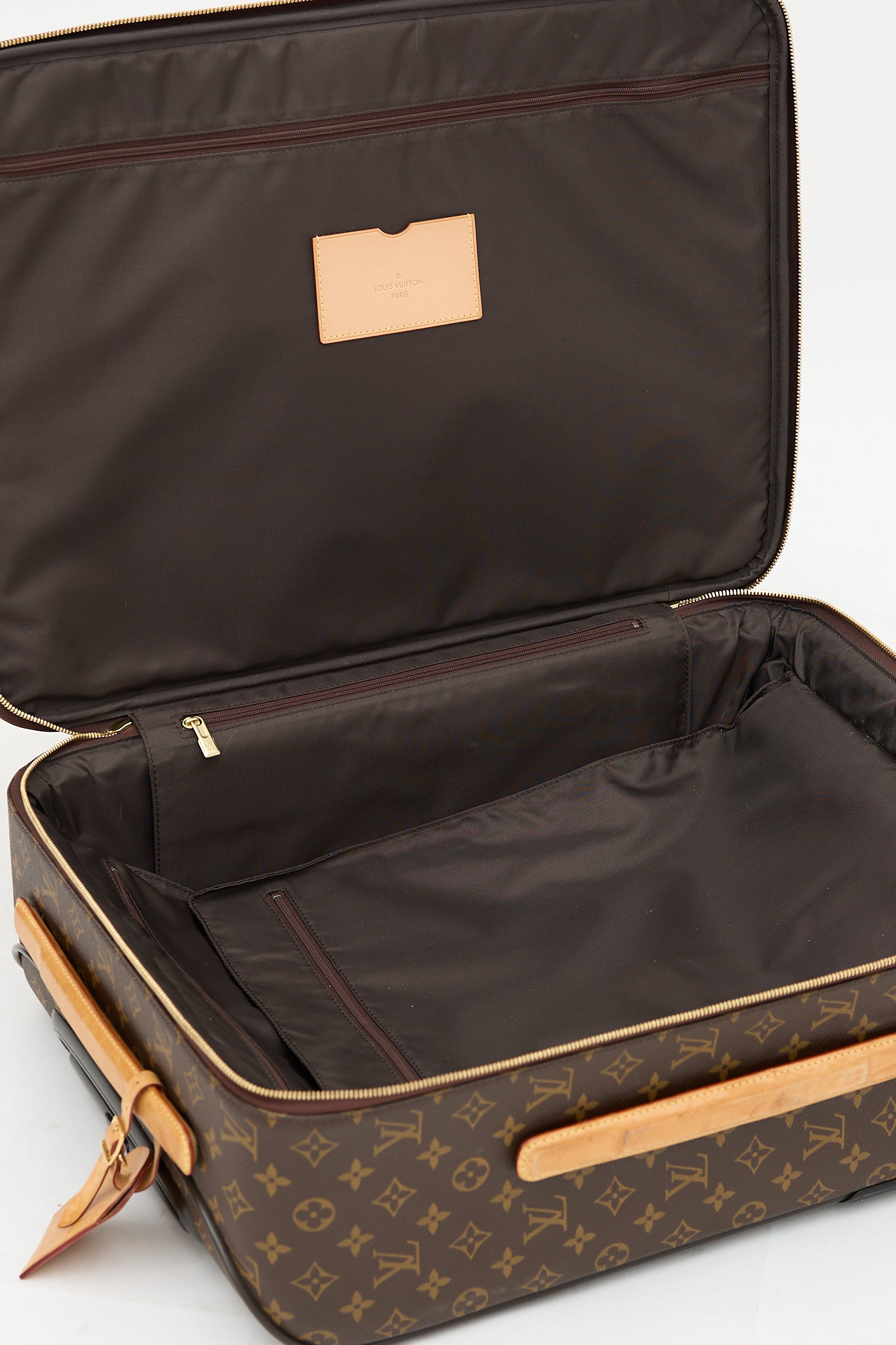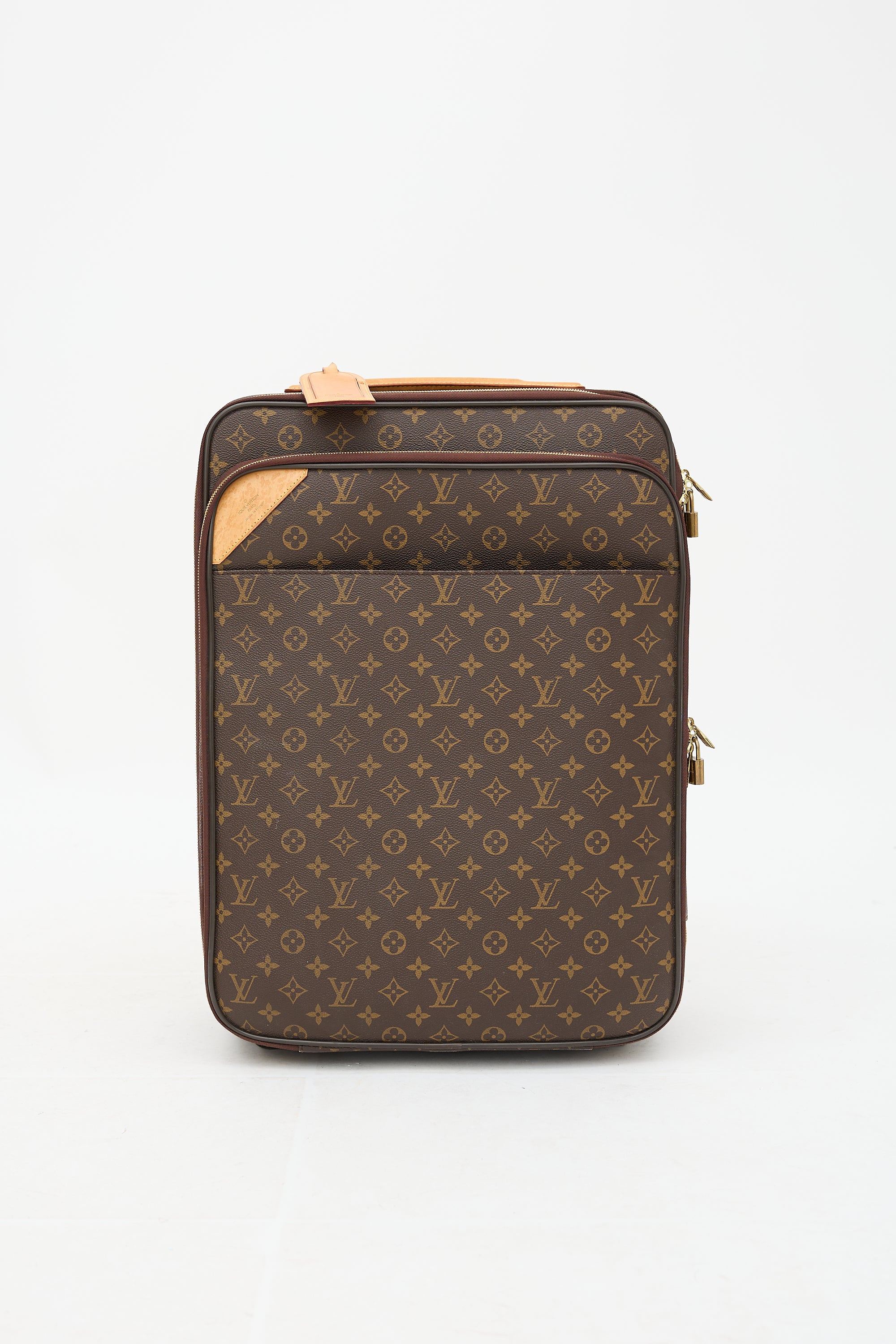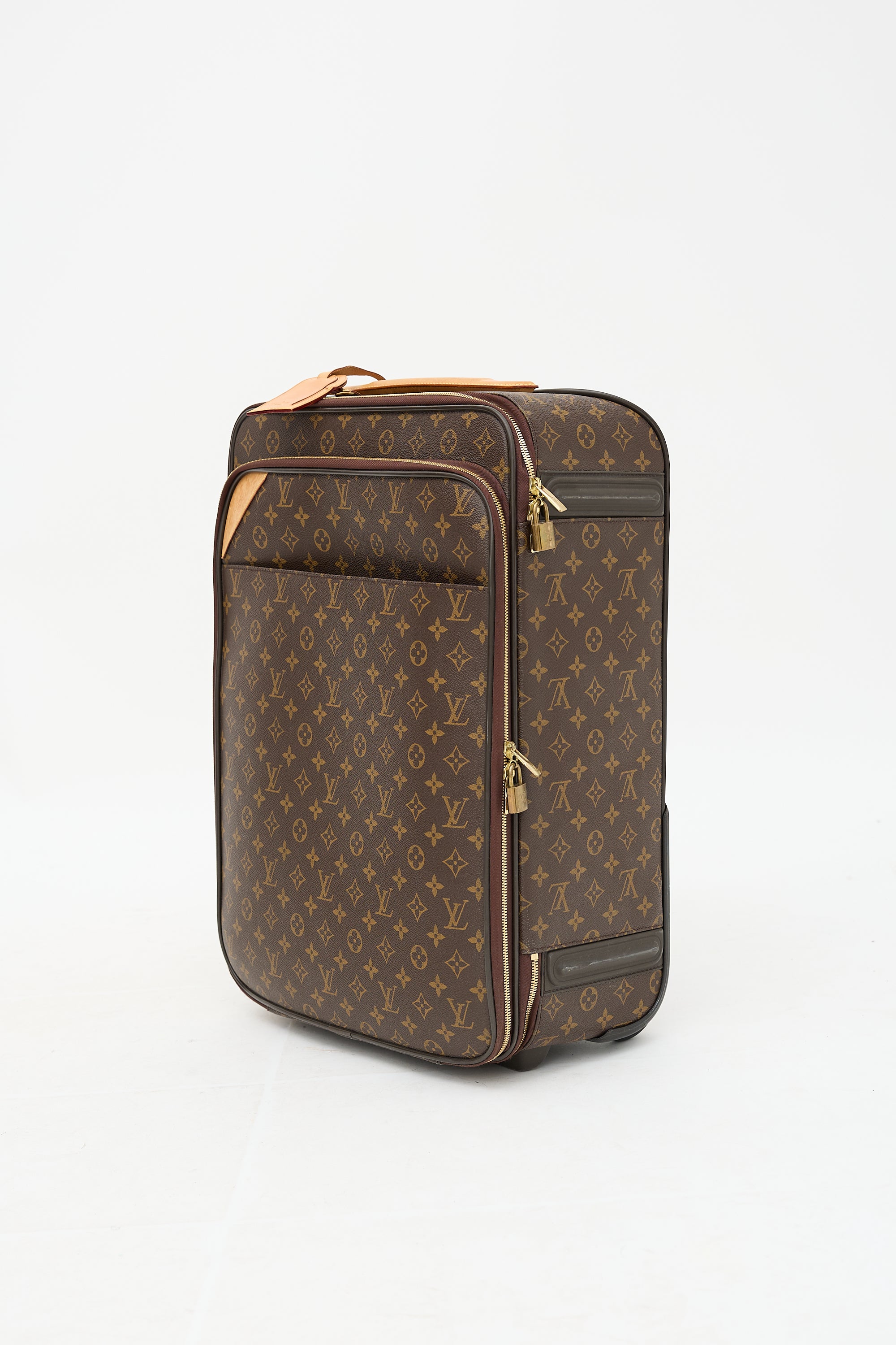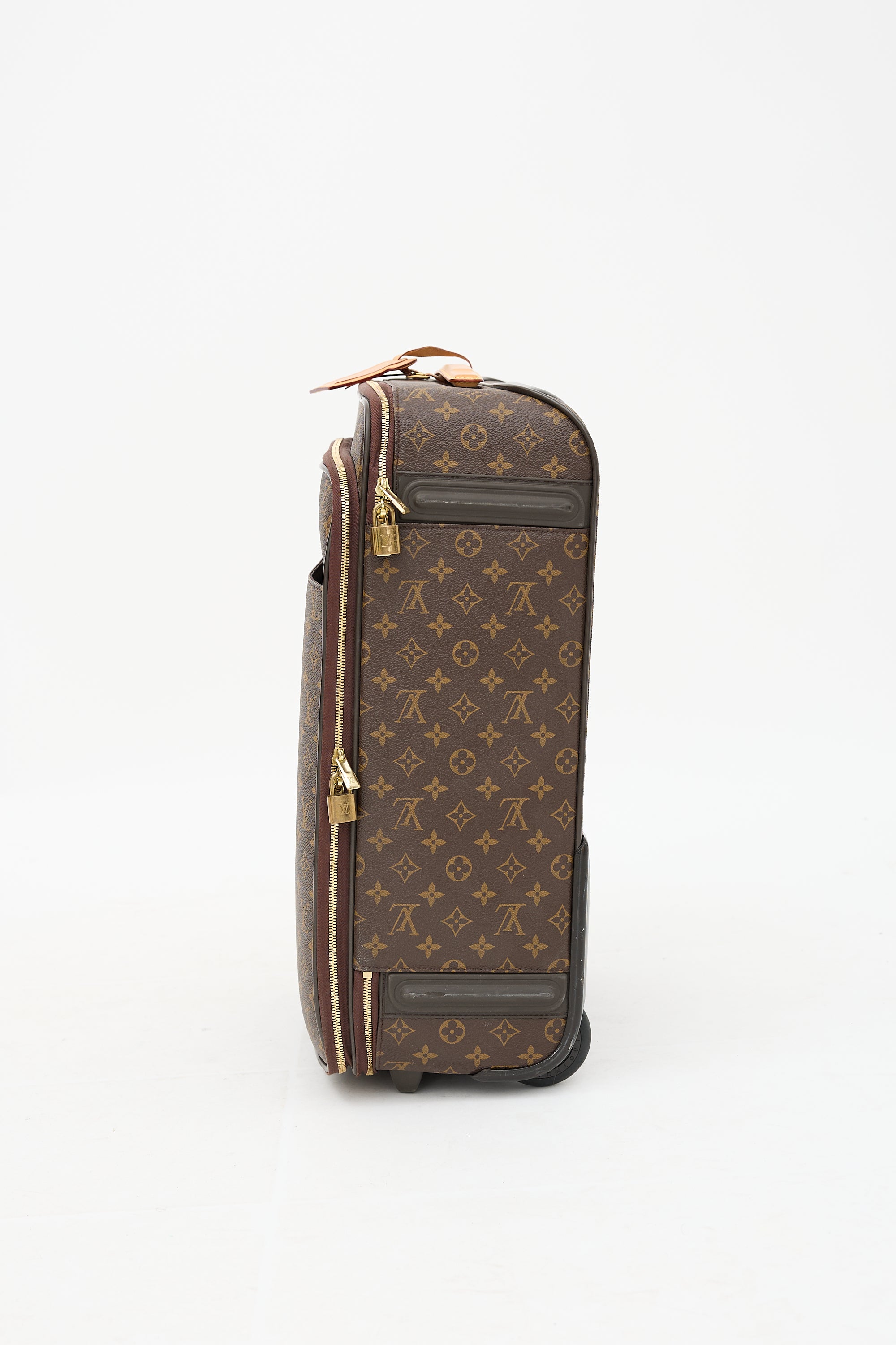 Pre-owned Louis Vuitton brown 2012 Monogram Pégase 55 luggage featuring signature brown monogram coated canvas, Vachetta leather trim, exterior pocket, two way zip closure, attached lock, single top handle, single side handle, protective feet at side and bottom, two wheels at bottom, canvas lining, detachable luggage tag, garment strap with clasp fastening, and two attached loops inside. Comes with brown canvas garment bag with gold tone hanger and brown canvas luggage cover.