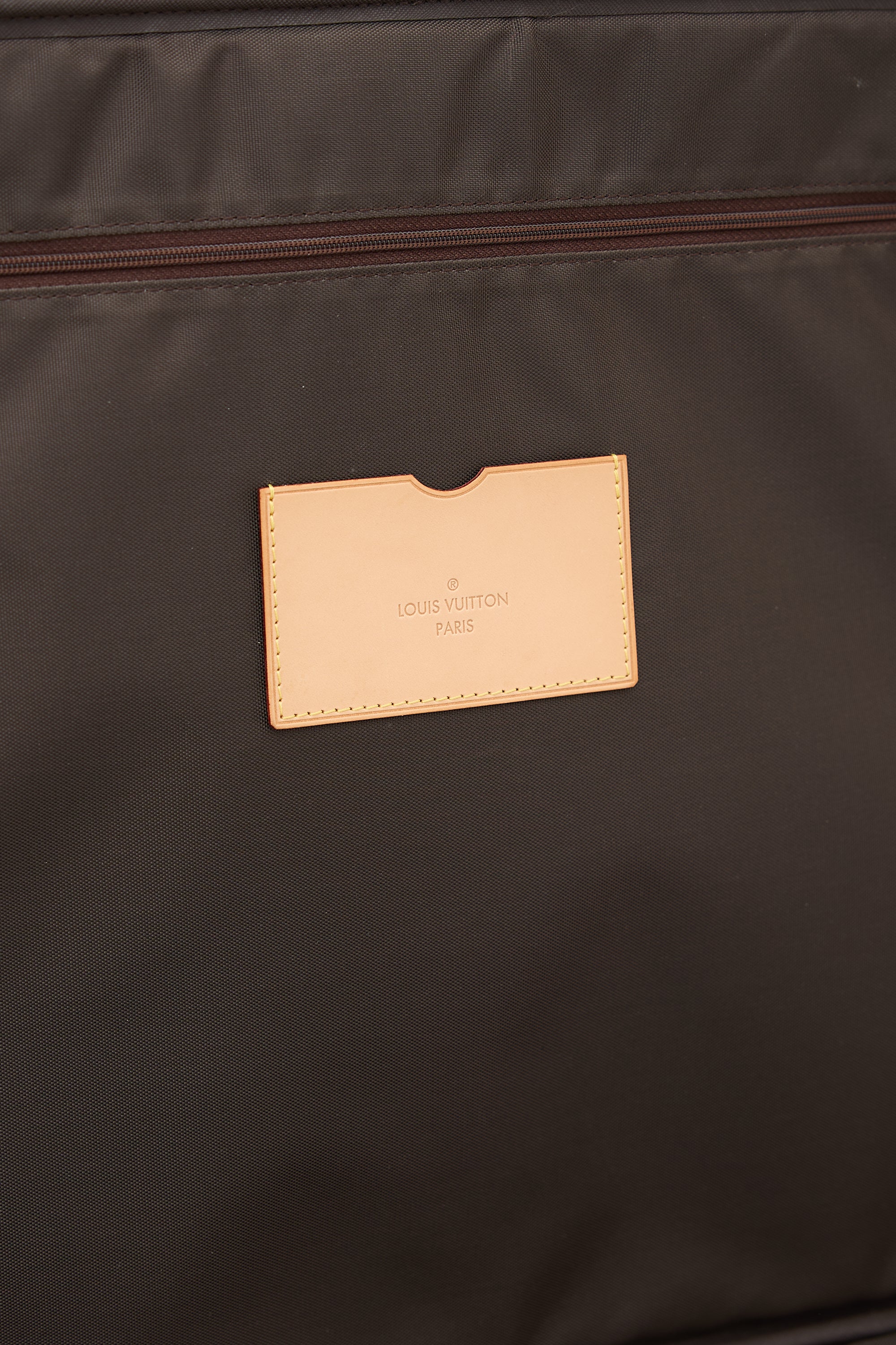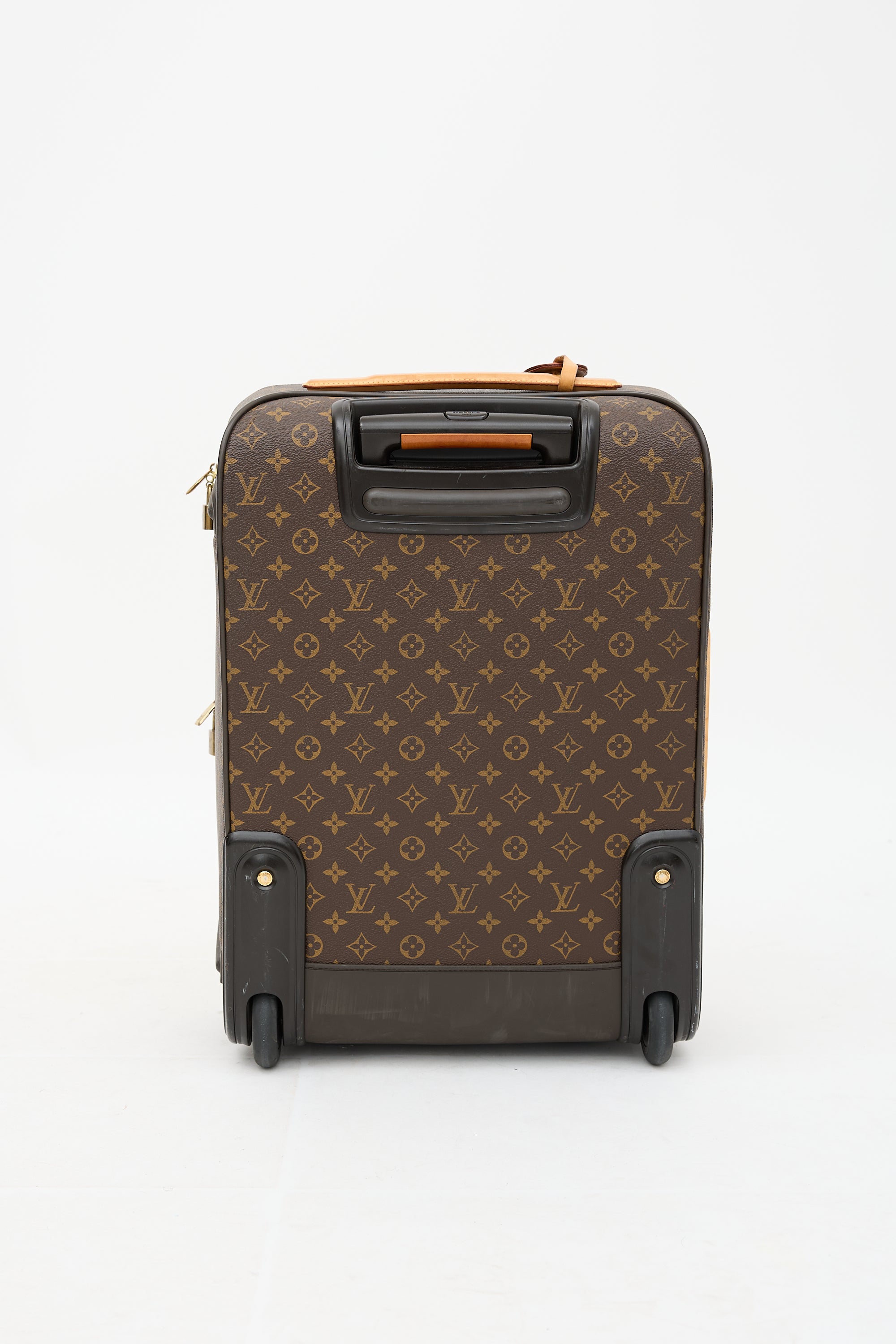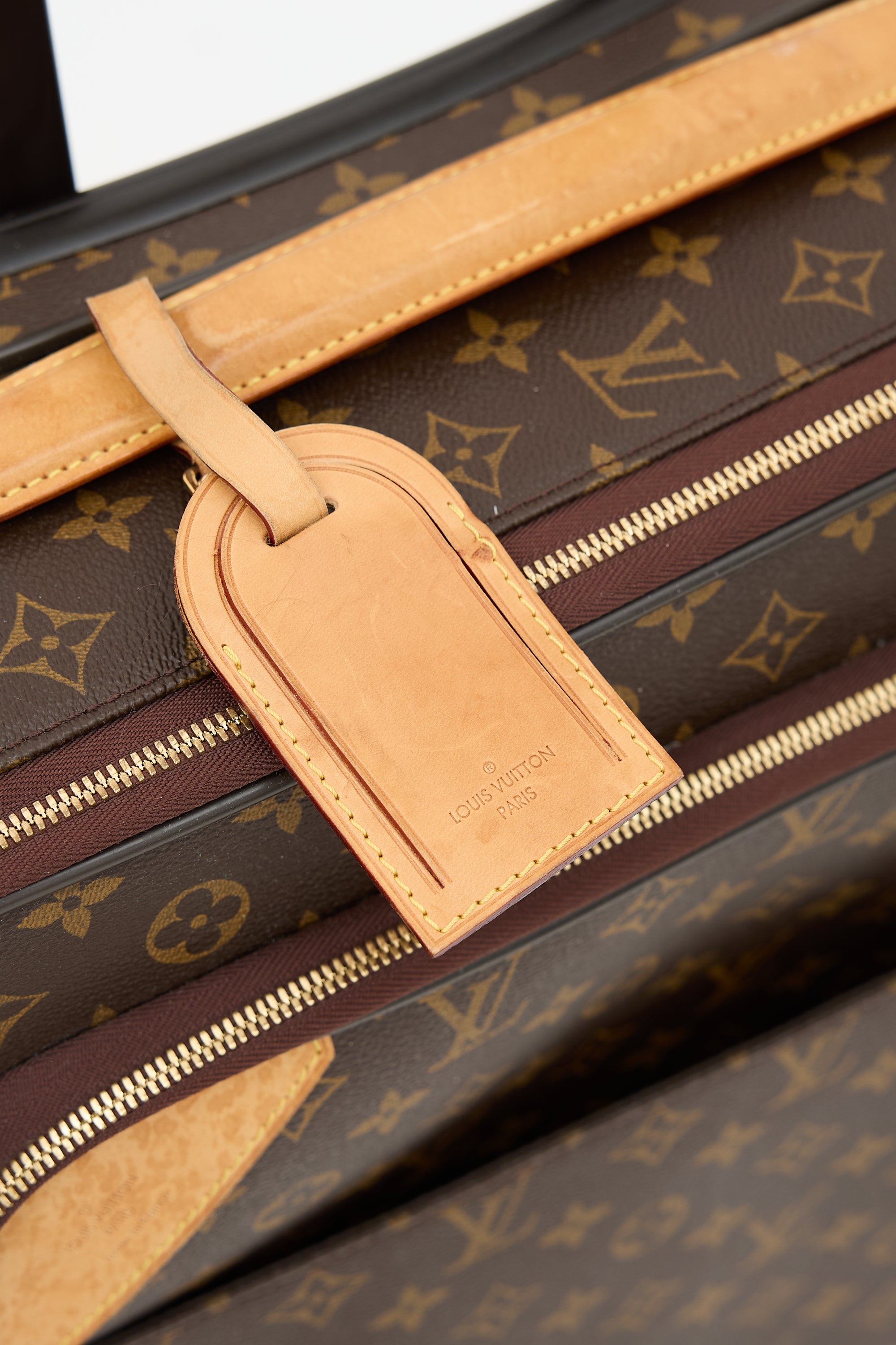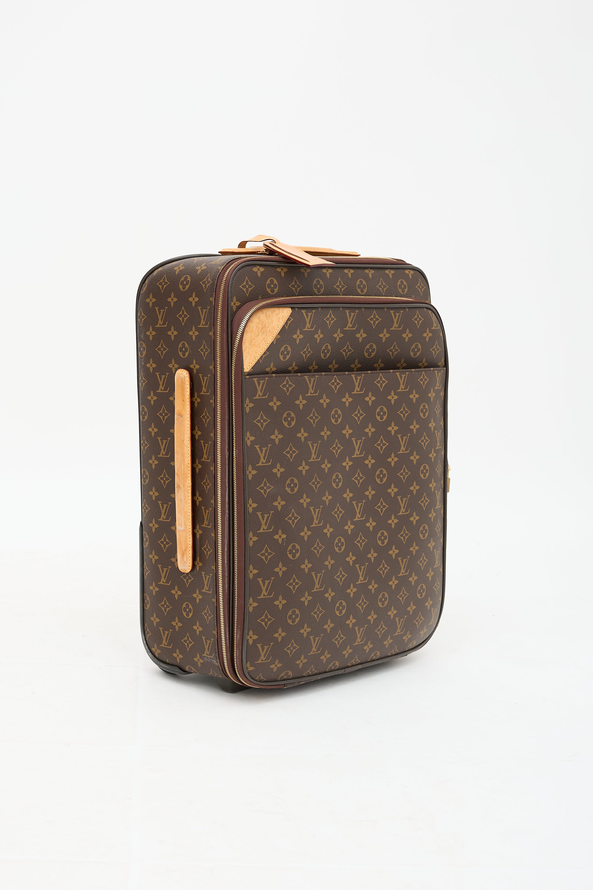 Pre-owned Louis Vuitton brown 2012 Monogram Pégase 55 luggage featuring signature brown monogram coated canvas, Vachetta leather trim, exterior pocket, two way zip closure, attached lock, single top handle, single side handle, protective feet at side and bottom, two wheels at bottom, canvas lining, detachable luggage tag, garment strap with clasp fastening, and two attached loops inside. Comes with brown canvas garment bag with gold tone hanger and brown canvas luggage cover.