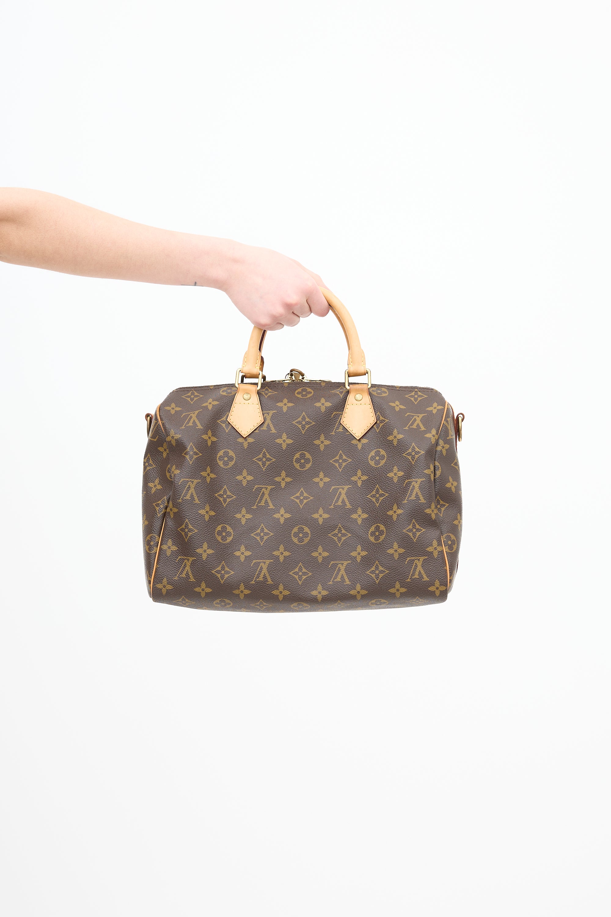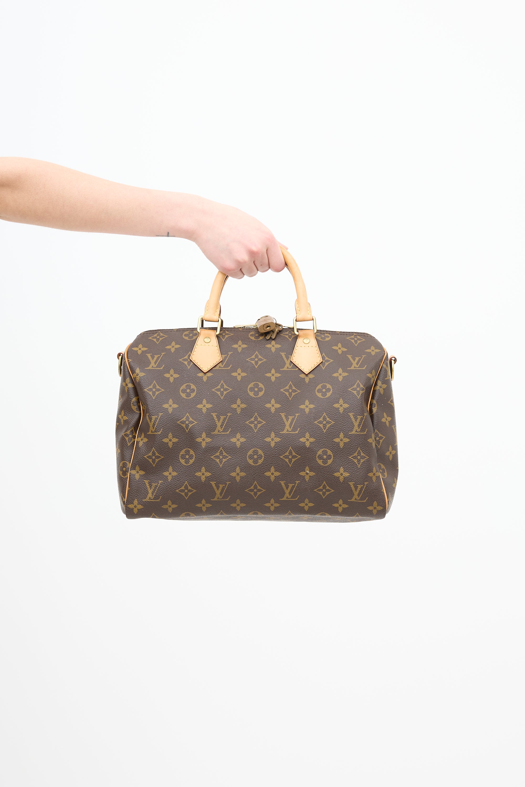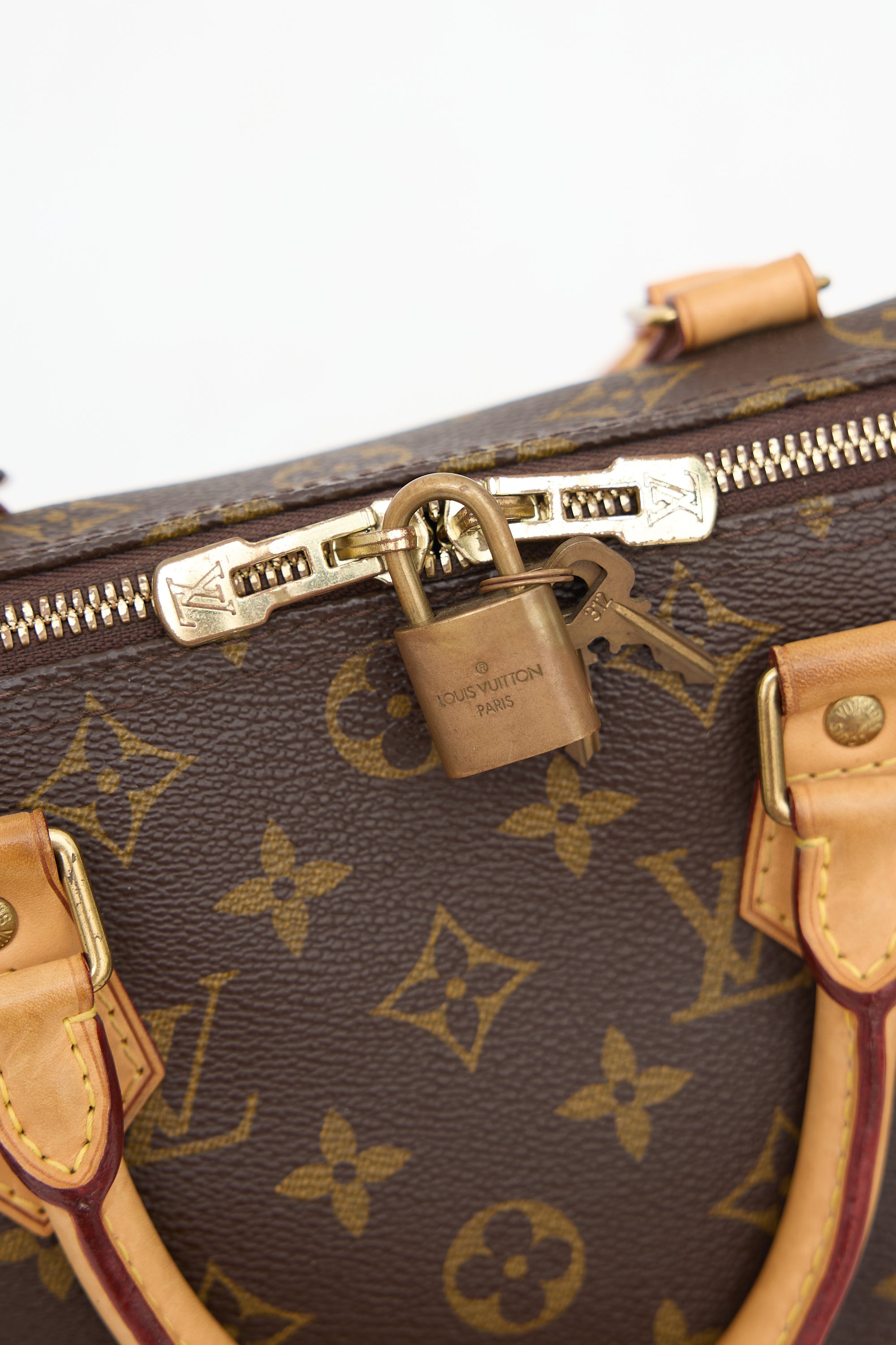 Pre-owned Louis Vuitton 2014 brown coated canvas Speedy 35 hand bag featuring signature monogram print, brown Vachetta leather details, gold tone hardware, dual rolled top handles, removable and adjustable shoulder strap, top double zip closure, padlock and keys at zipper, and one lined main compartment with one slip pocket.
