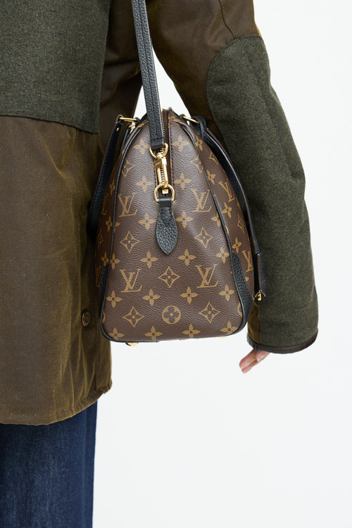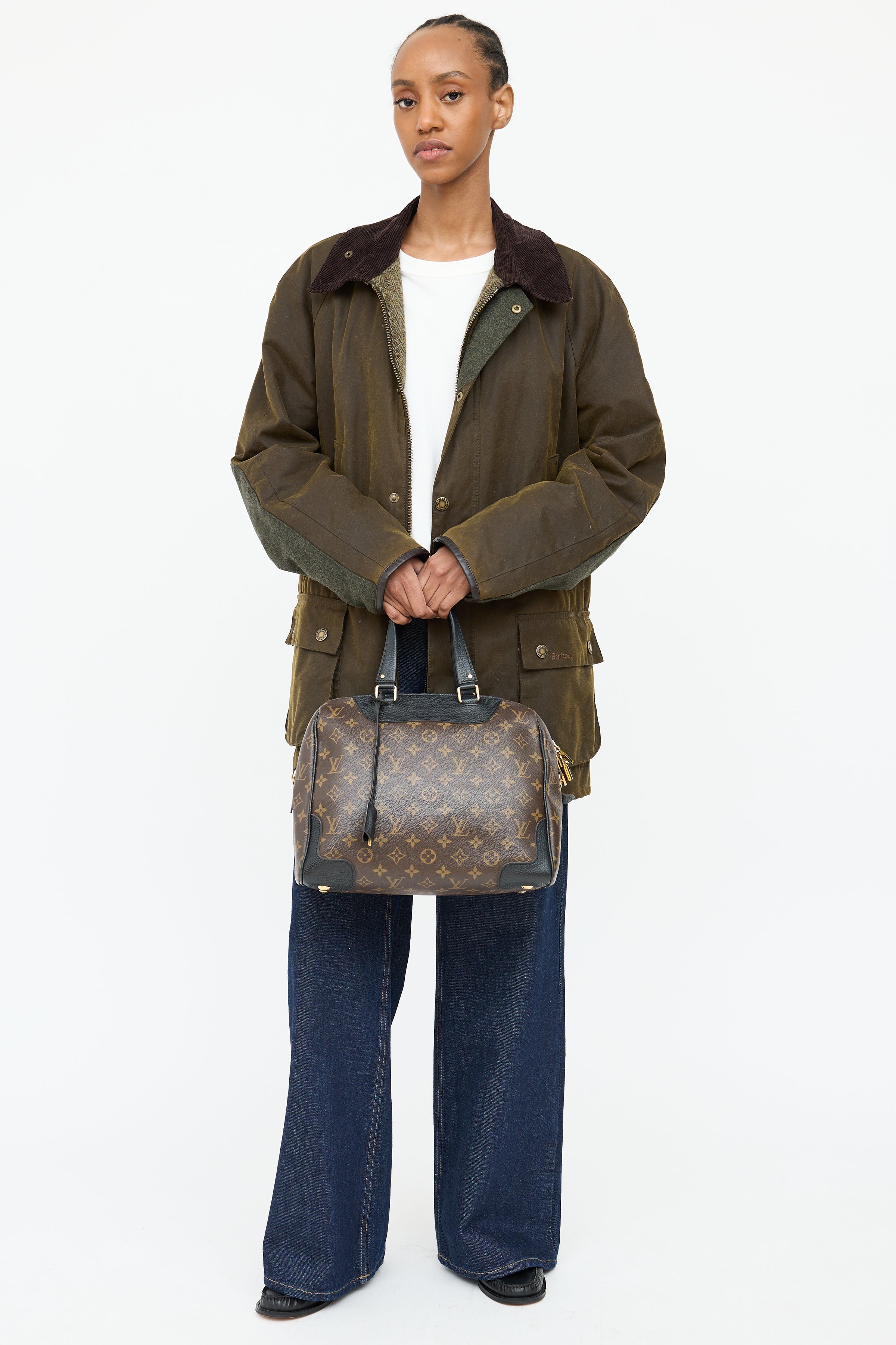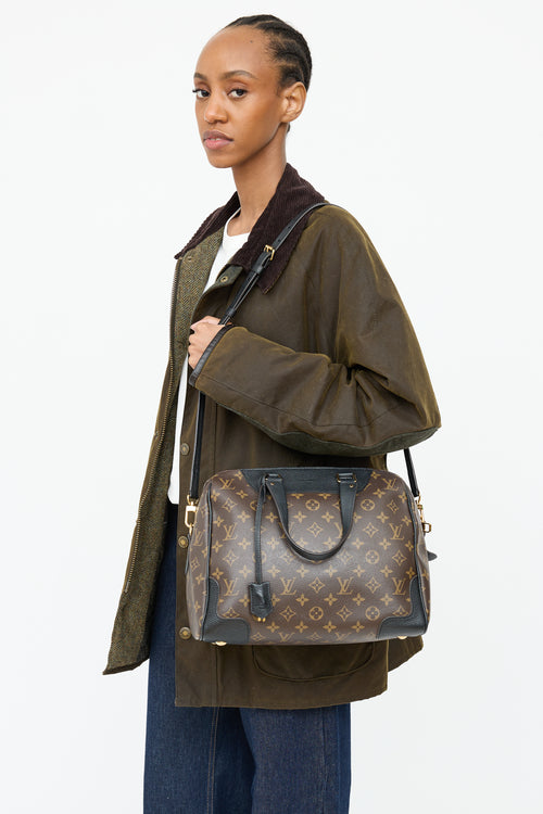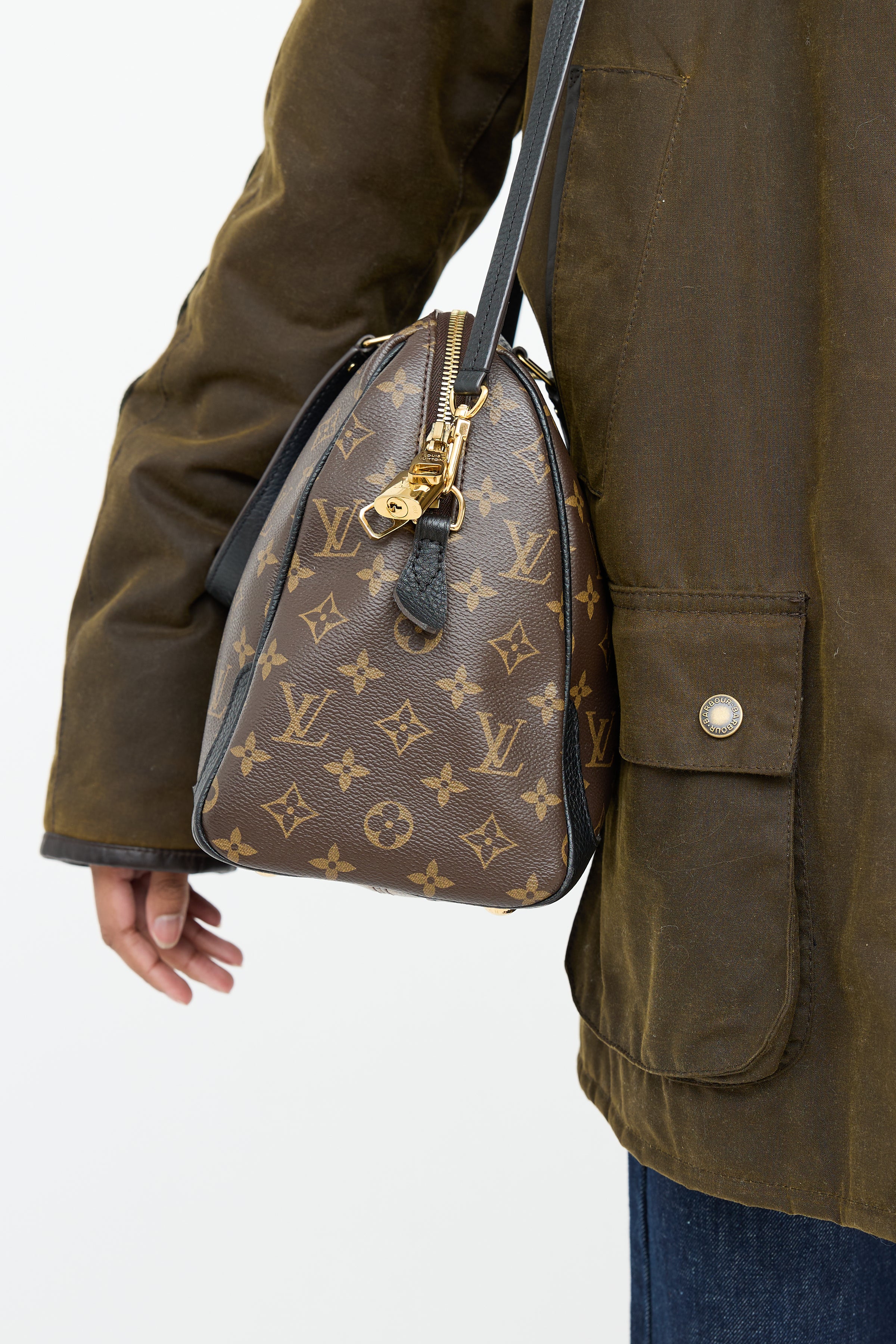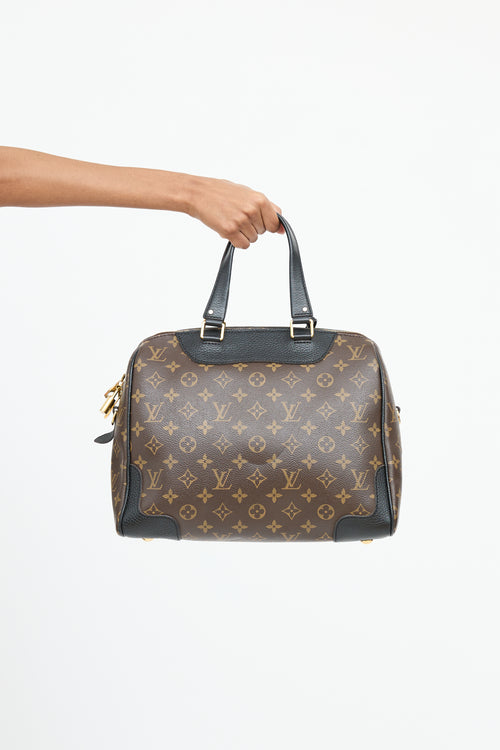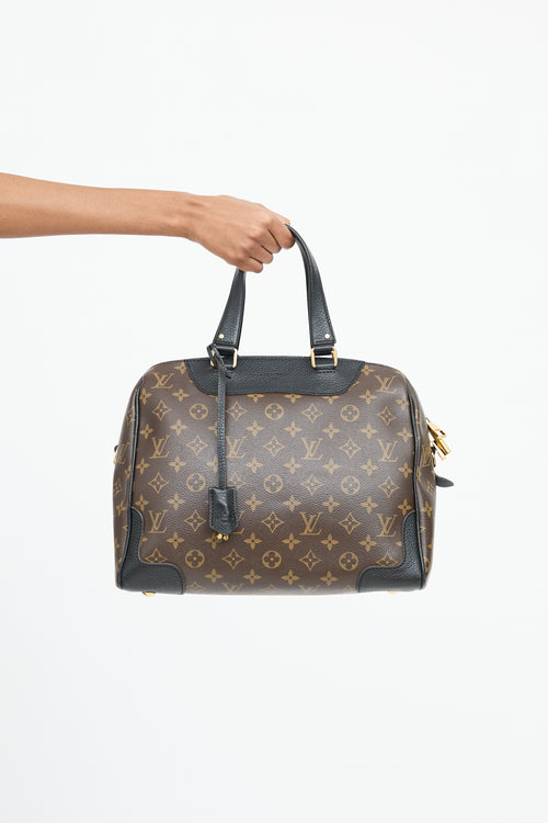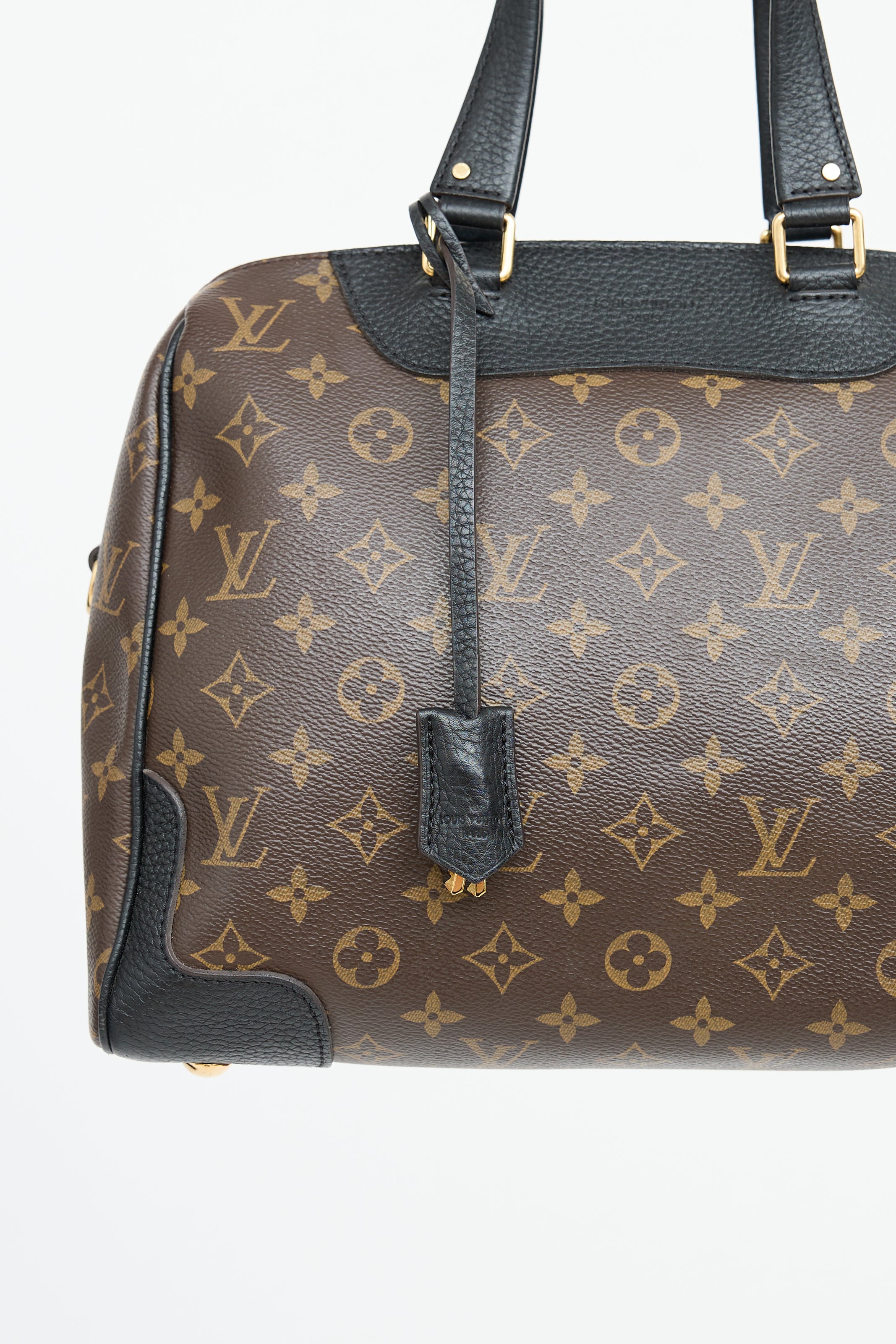 Pre-owned Louis Vuitton 2015 Retiro brown monogram bag featuring two flat top handles in black pebbled leather, two way top zip closure, clochette, gold tone hardware, adjustable and removeable shoulder strap and protective feet at base. Suede lined interior featuring three slip pockets.