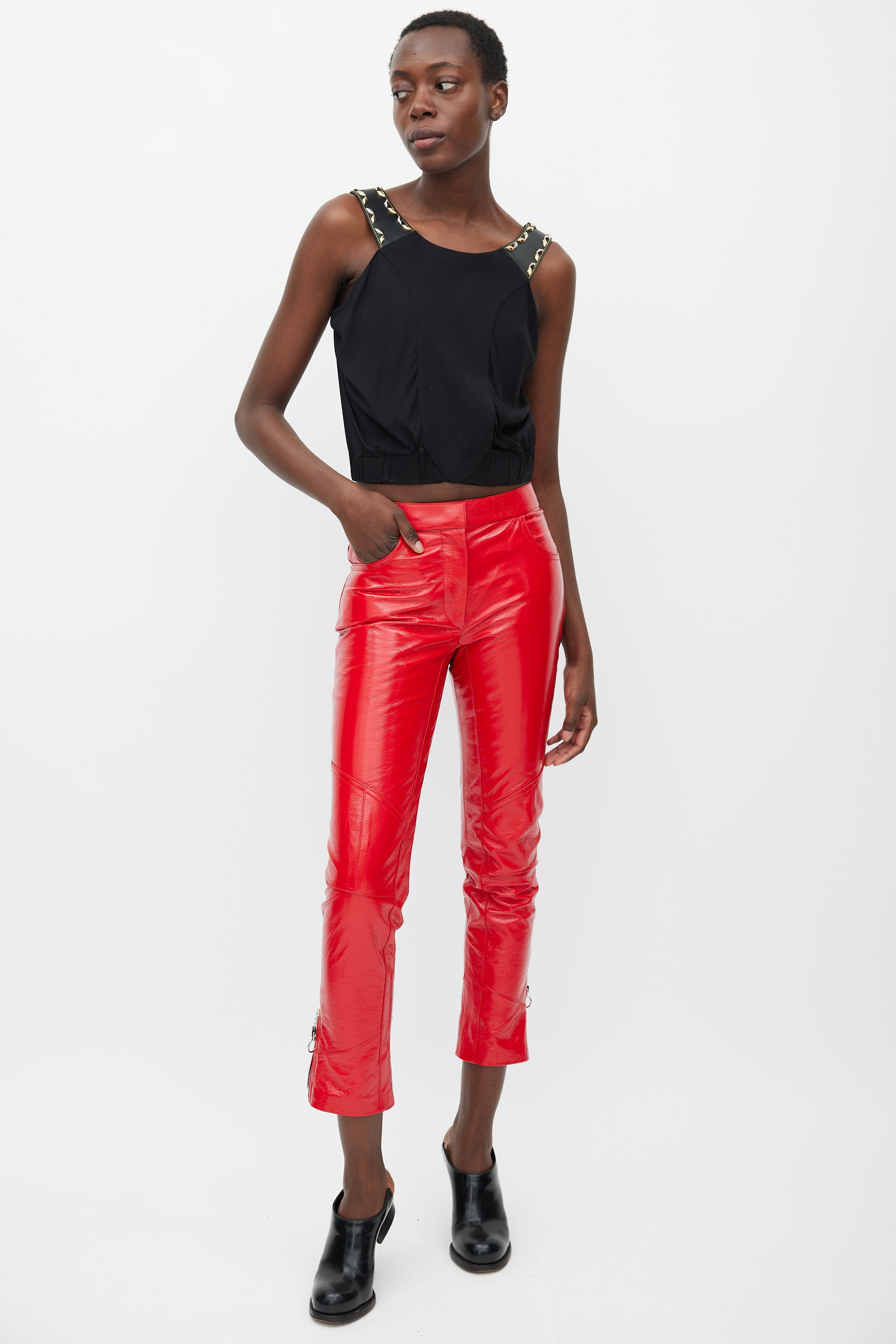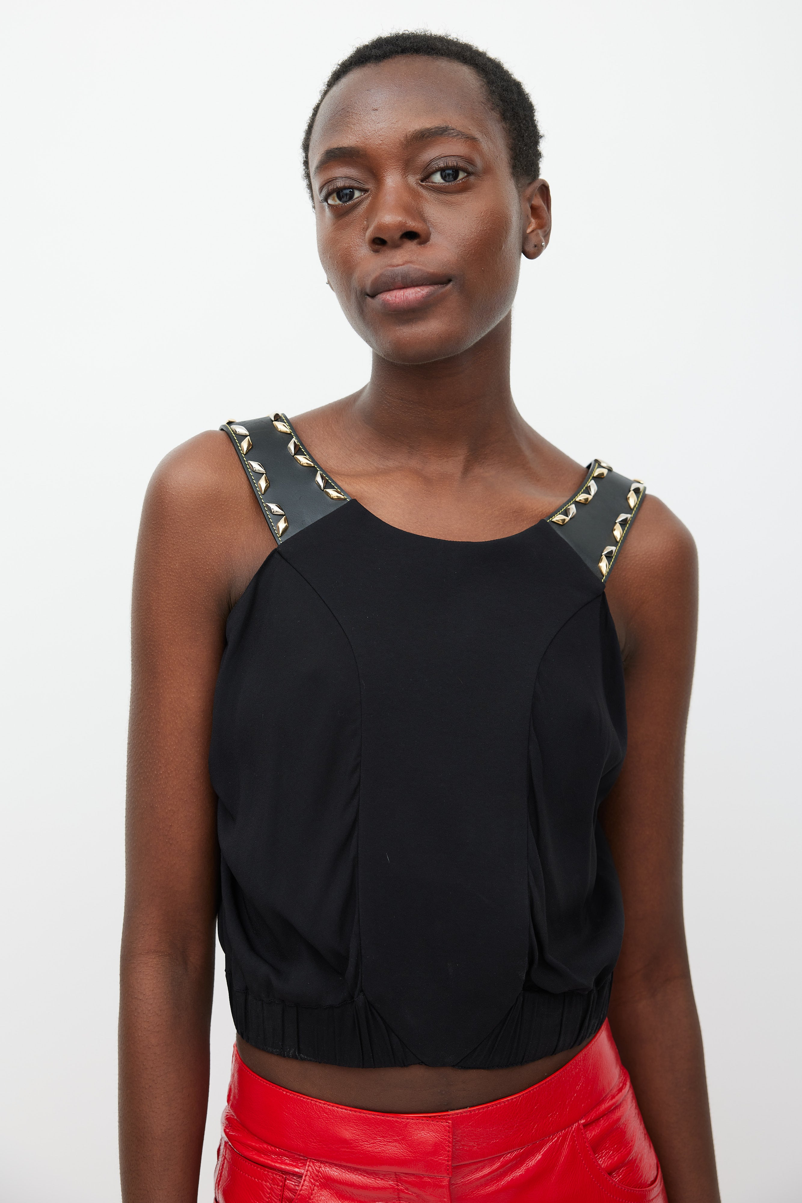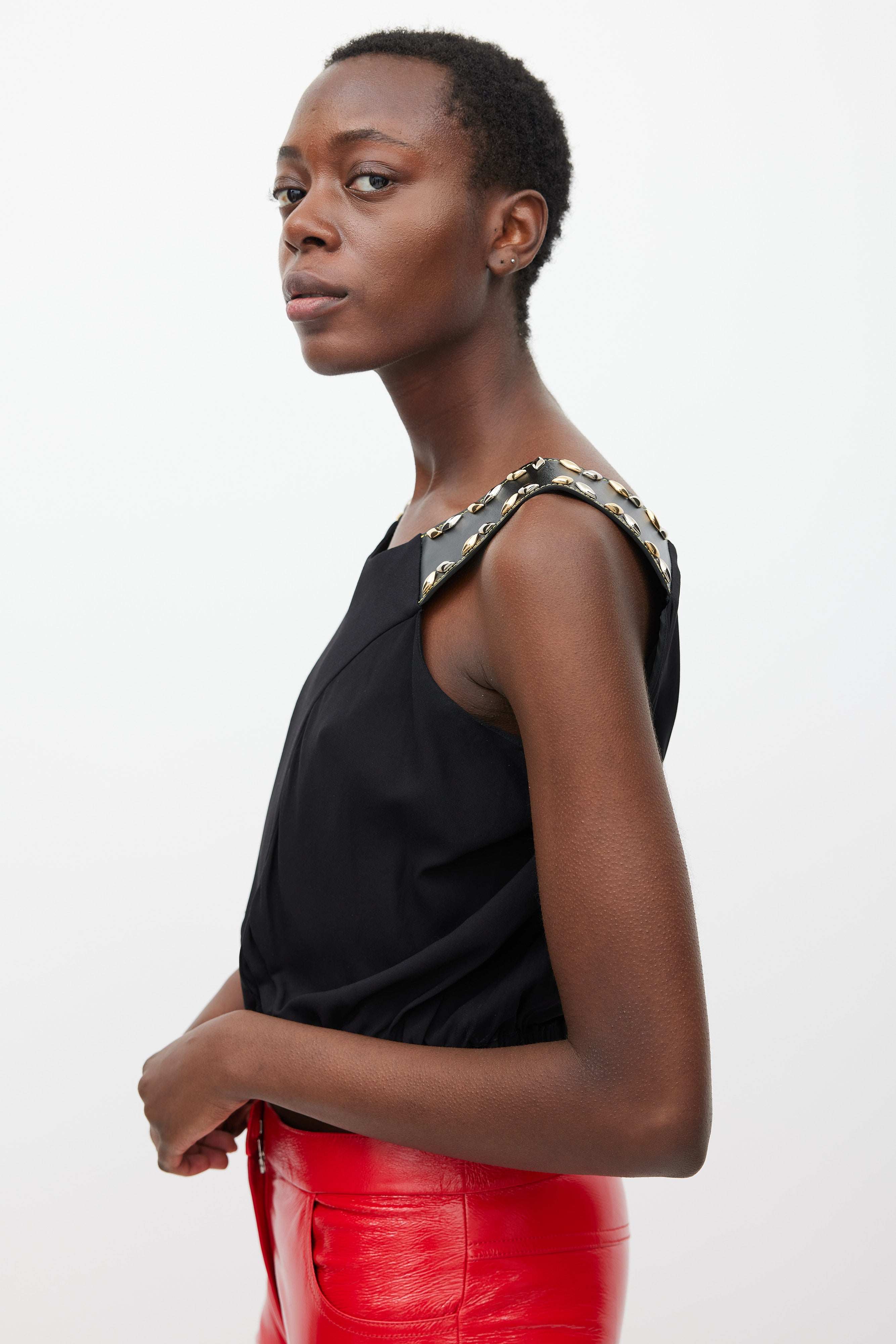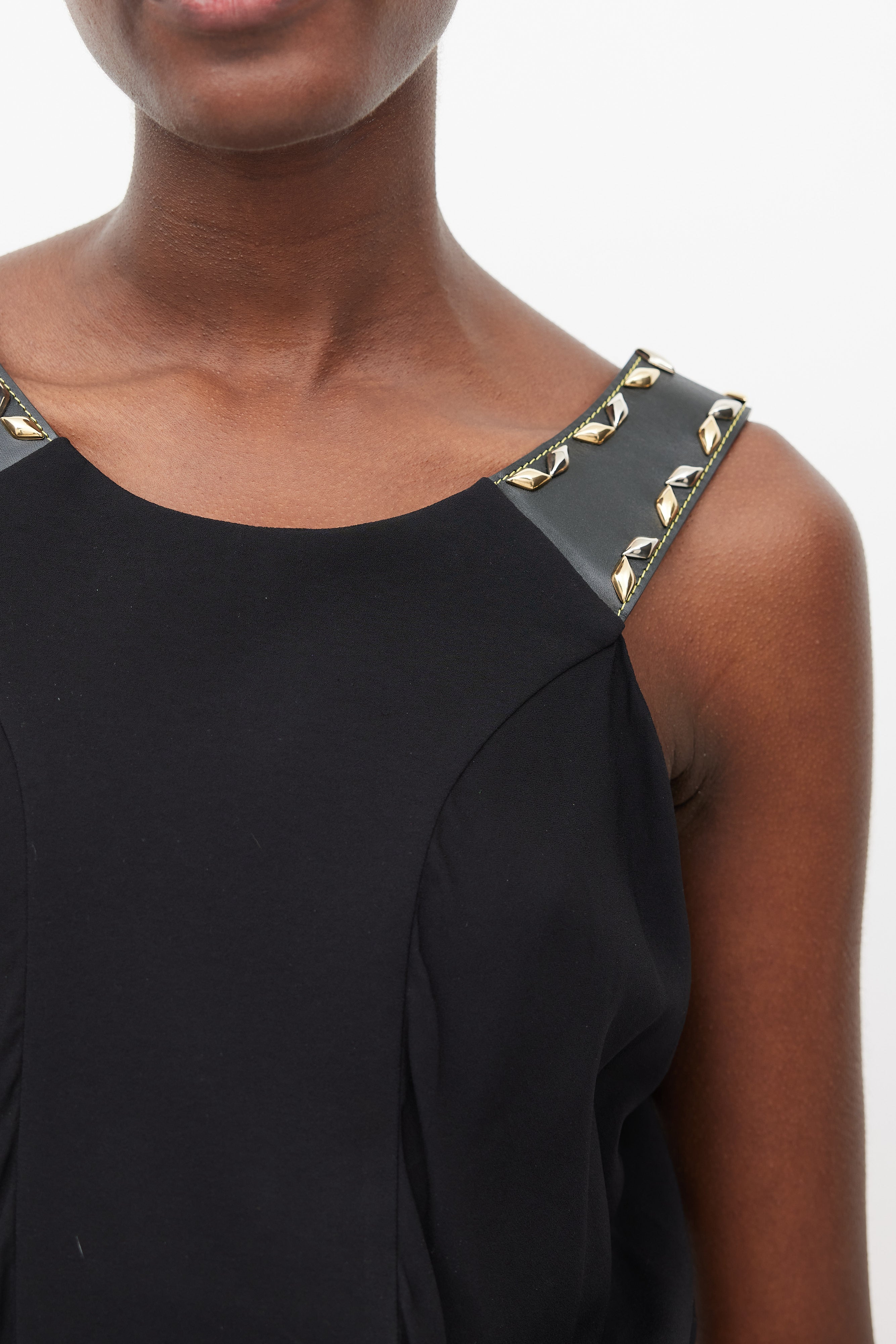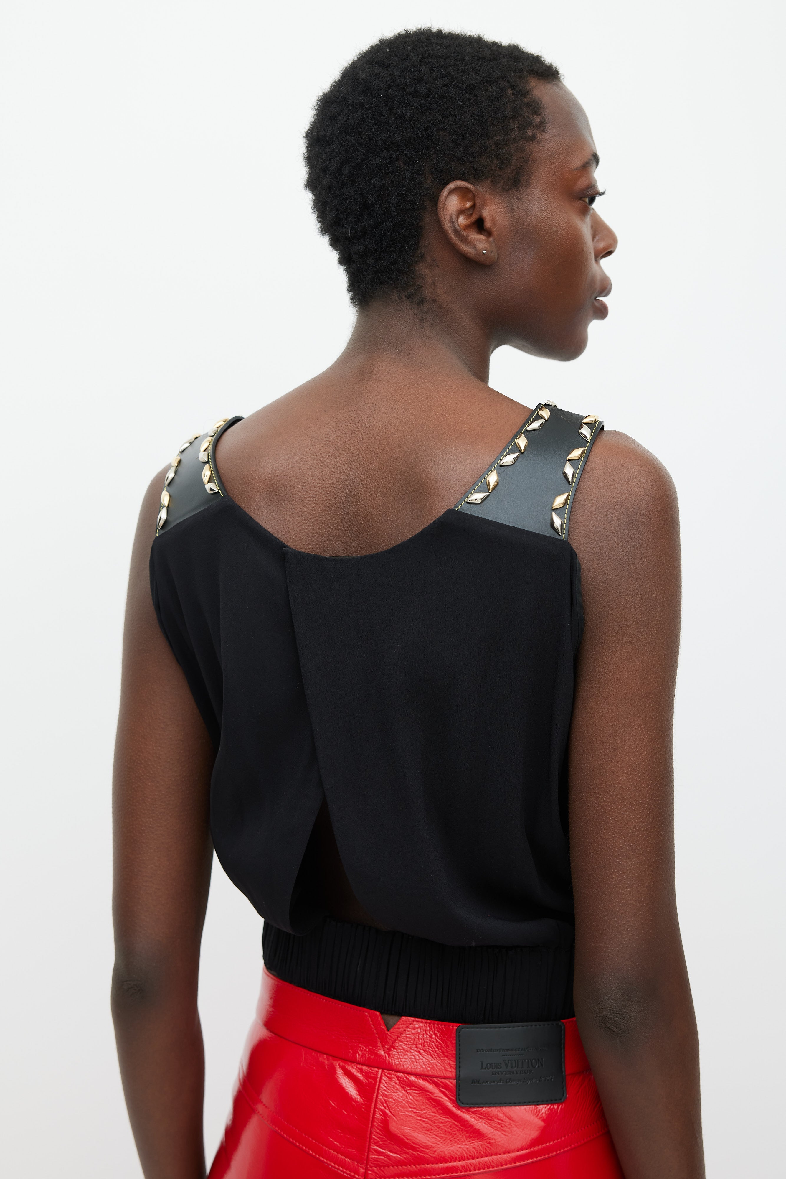 Pre-owned Louis Vuitton black top featuring round neckline, leather shoulder straps with contrast stitching, gold and silver tone stud embellishments at shoulders, cutout at back, and elasticized hem.