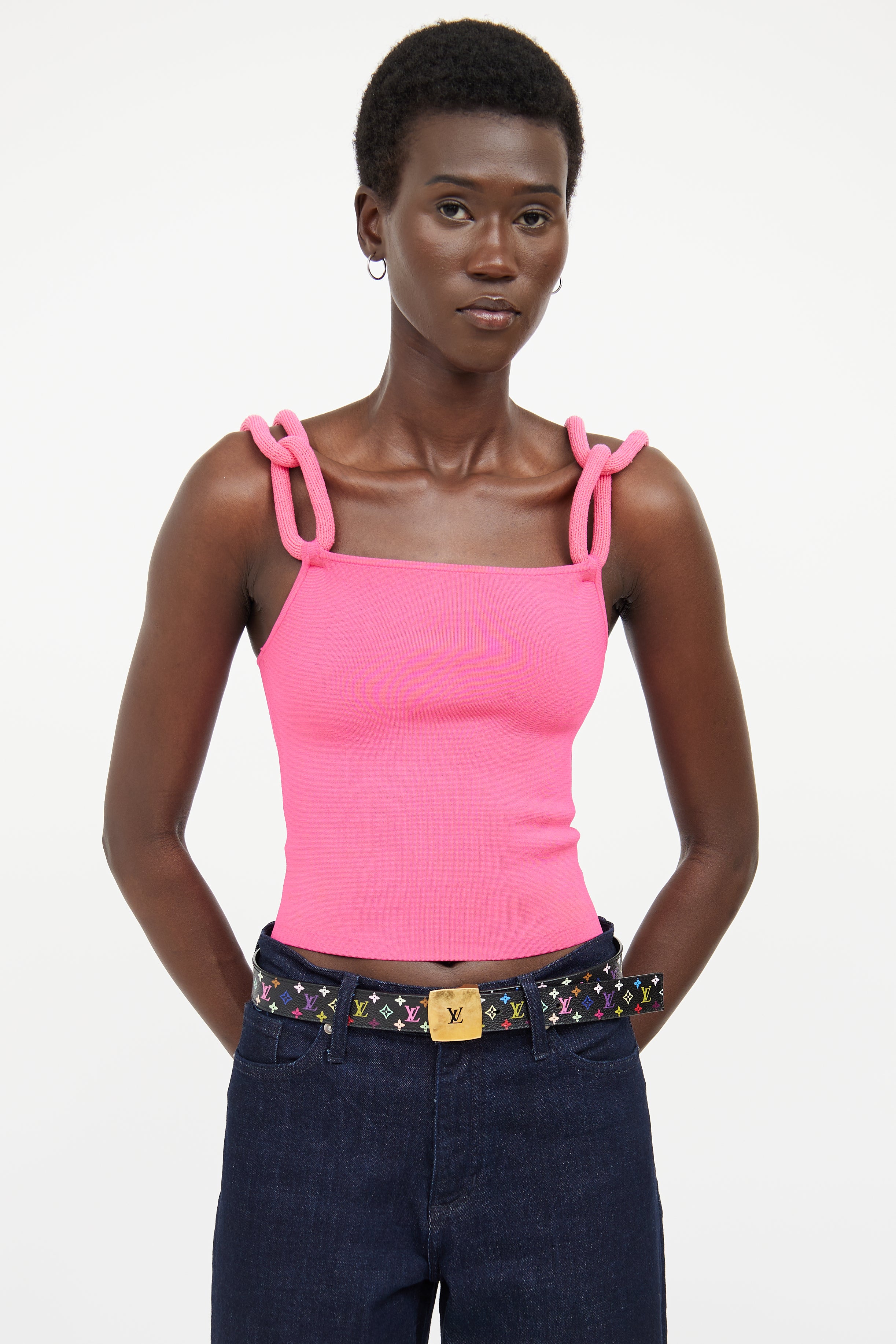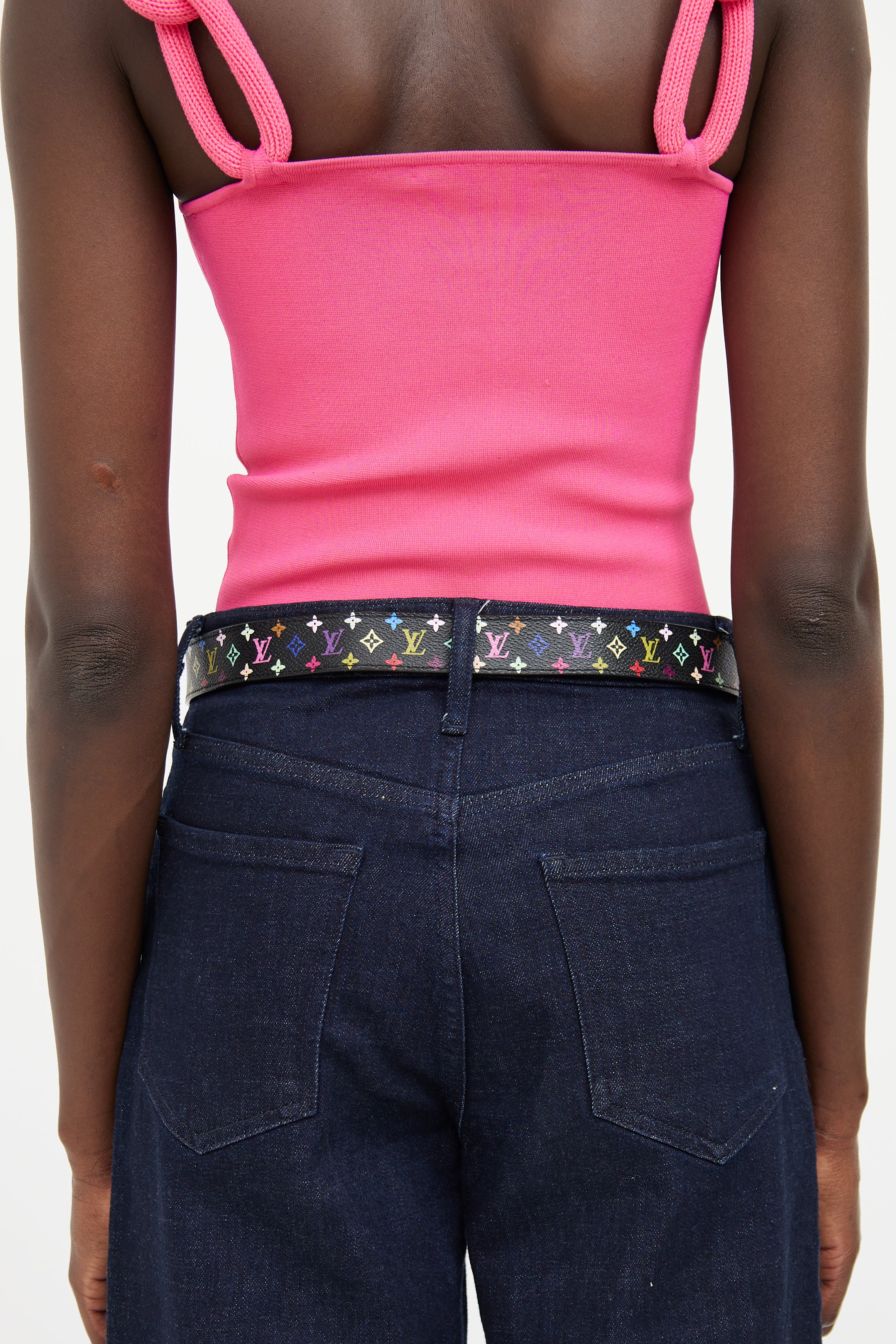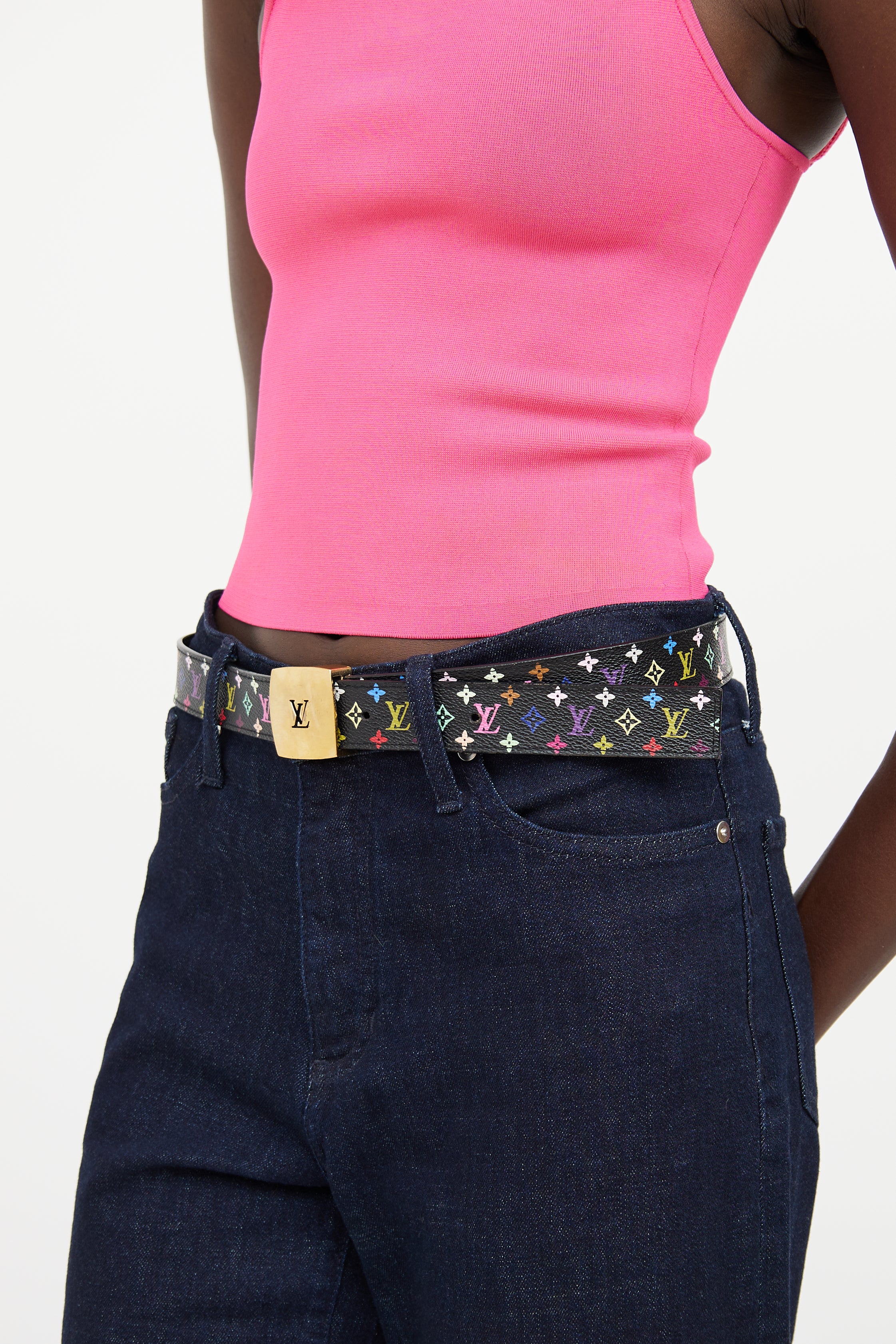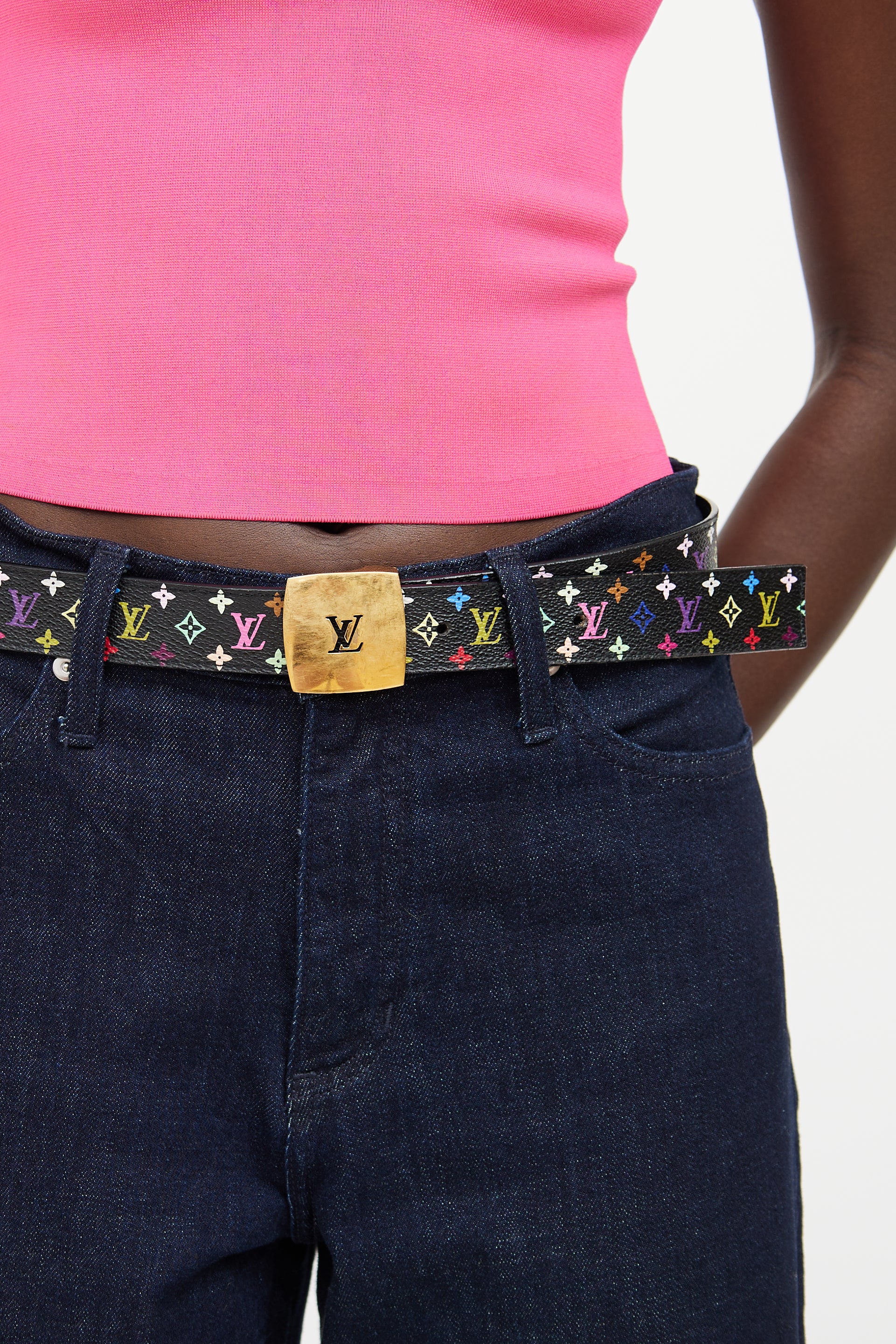 Pre-owned Louis Vuitton adjustable black leather Murakami belt featuring black grained leather with multicoloured LV Monogram print throughout finished with gold-tone logo plaque buckle.