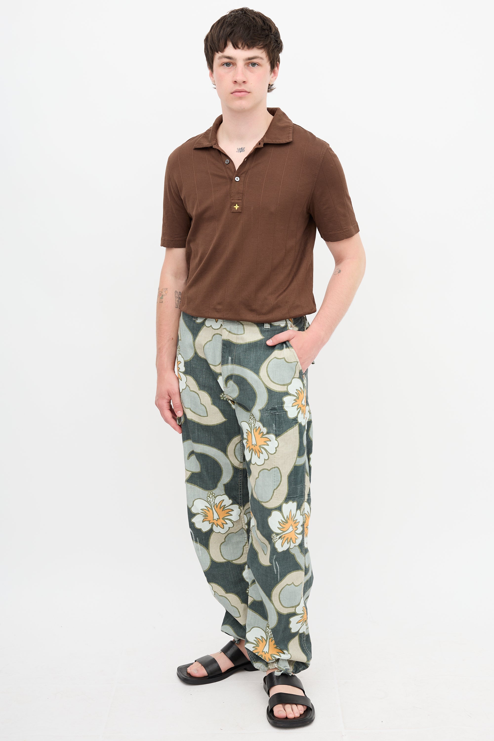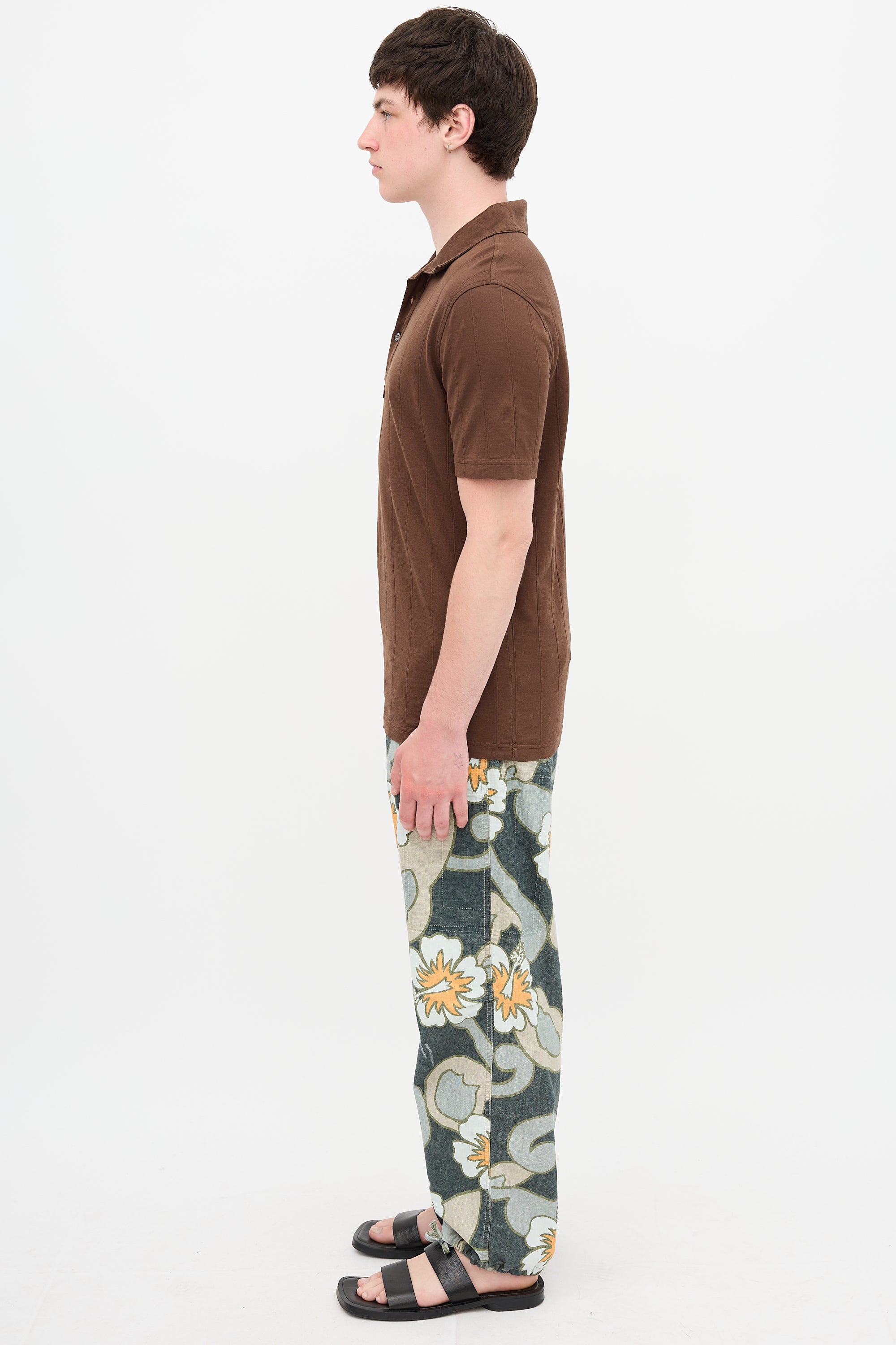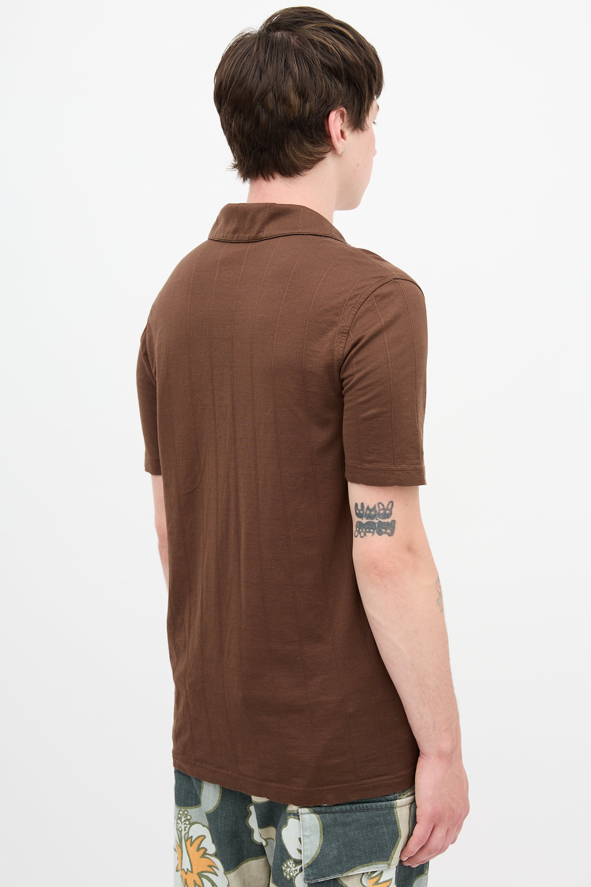 Pre-owned Louis Vuitton brown polo featuring collar with quarter button closure, signature embroidered blossom star logo at chest, and ribbing.