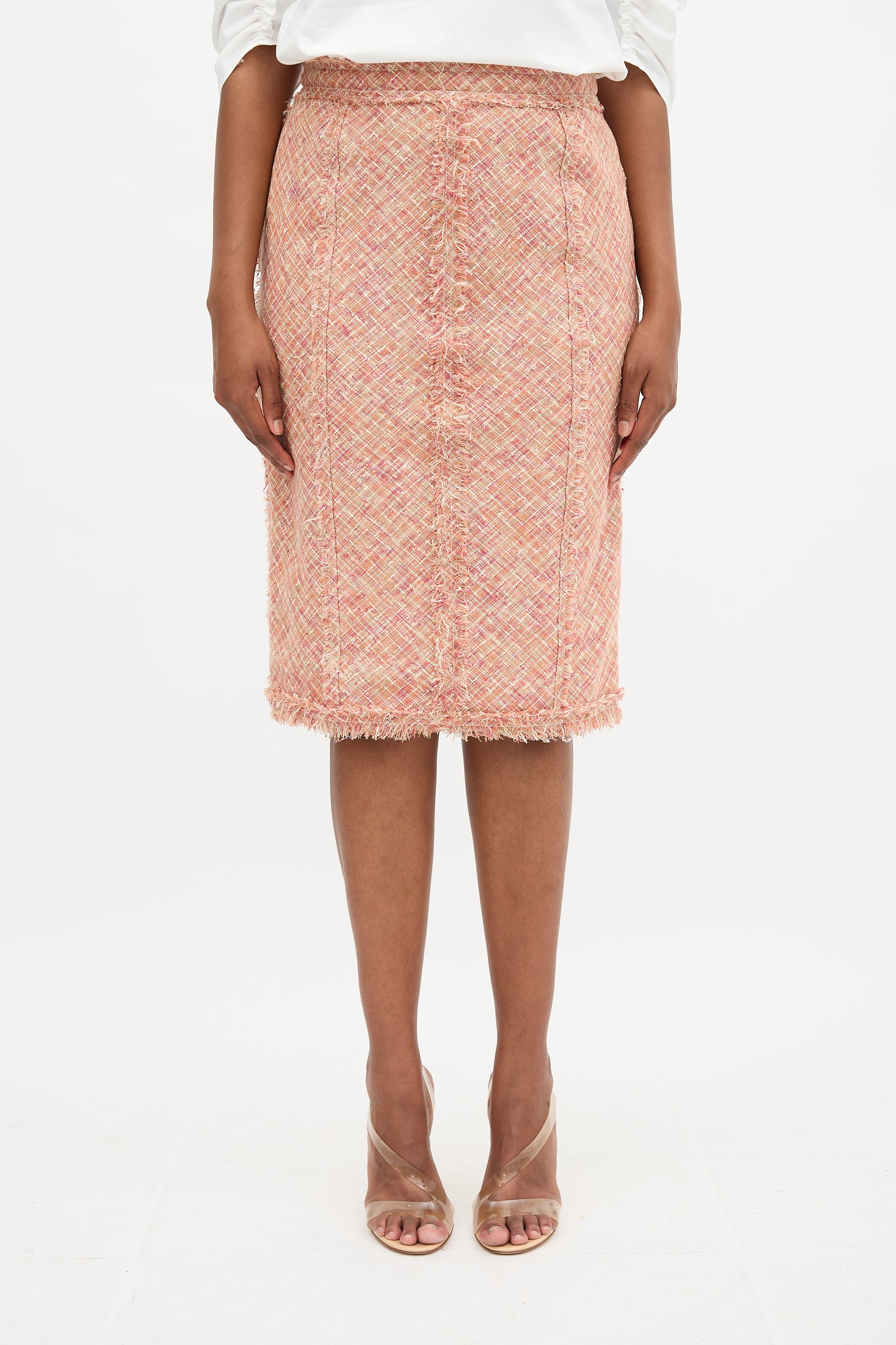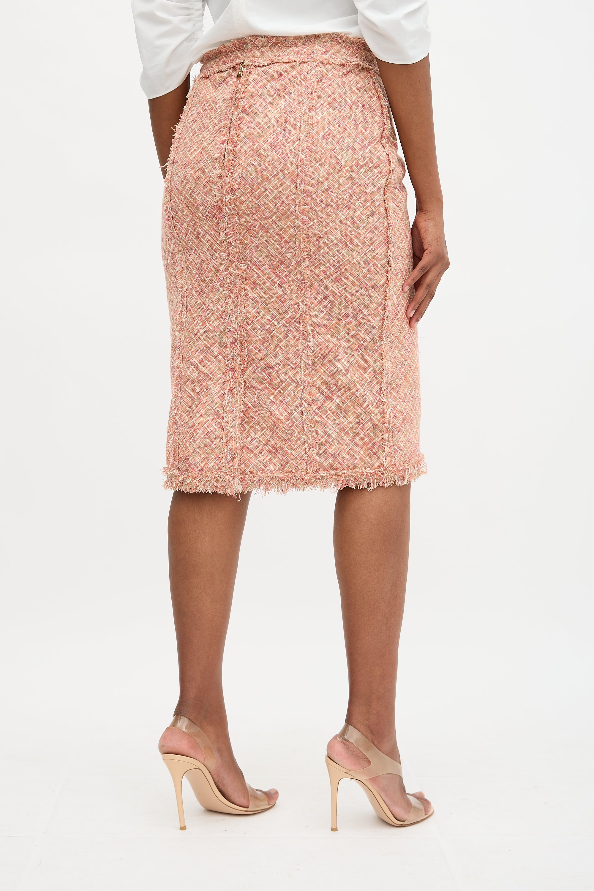 Pre-owned Louis Vuitton pink and multicolour tweed midi pencil skirt featuring exposed seams with raw edges, back vent, and concealed back zip. Lined. Clipped to fit model.