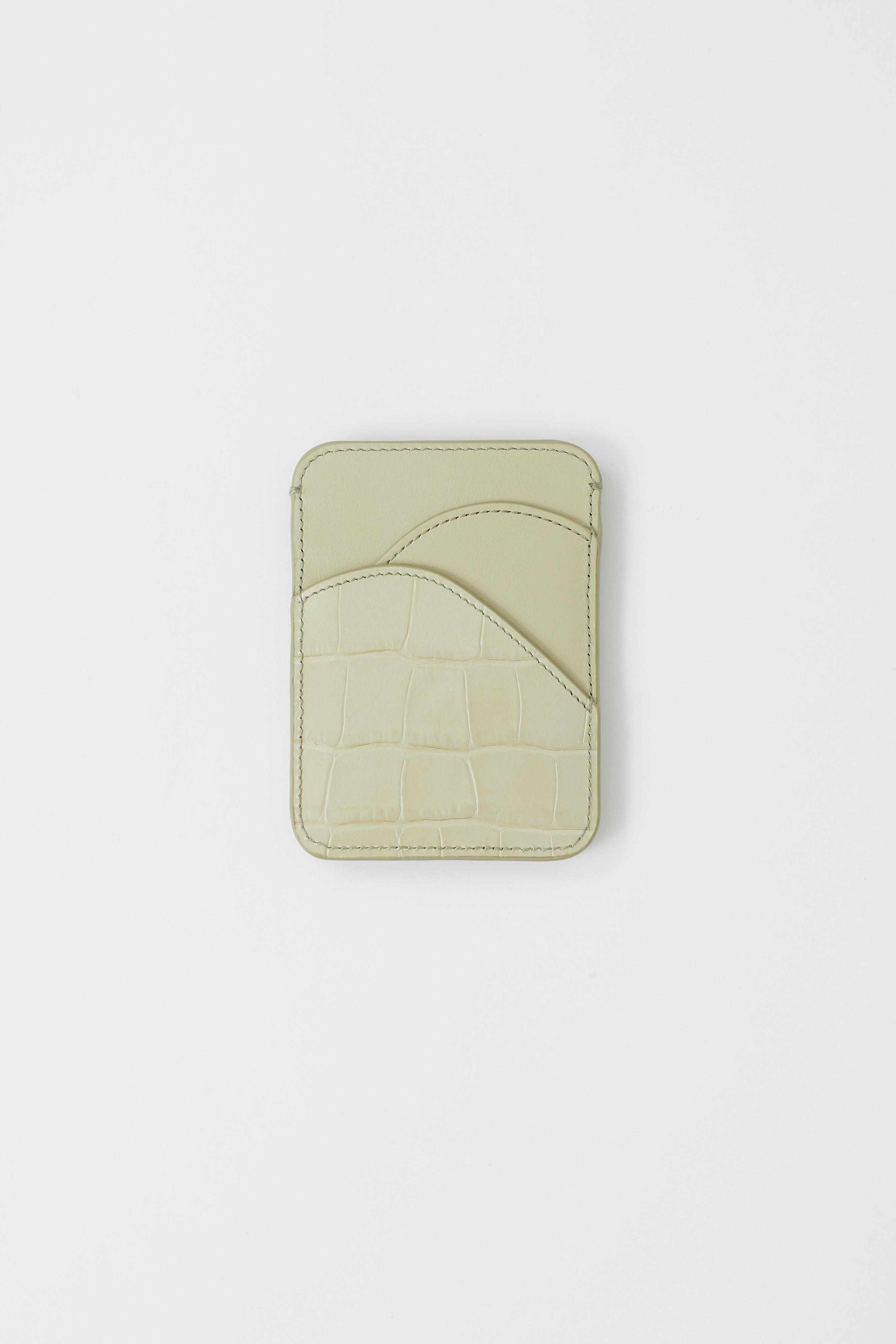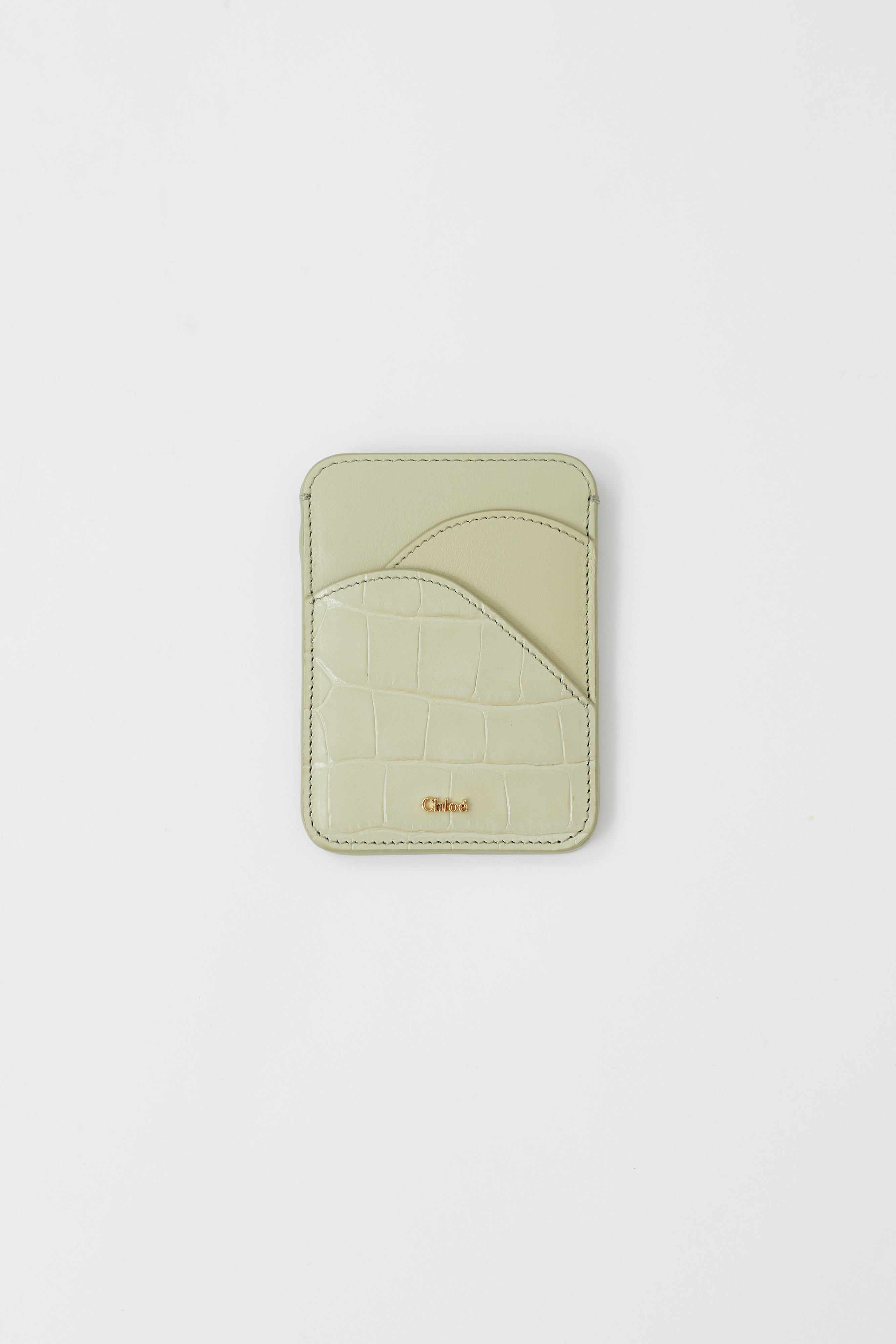 Pre-owned Chloé green Walden card holder featuring gold tone logo hardware at face, croc effect embossed leather, four card slots, one central note slot, and beige lining. Comes with original dust bag and box.