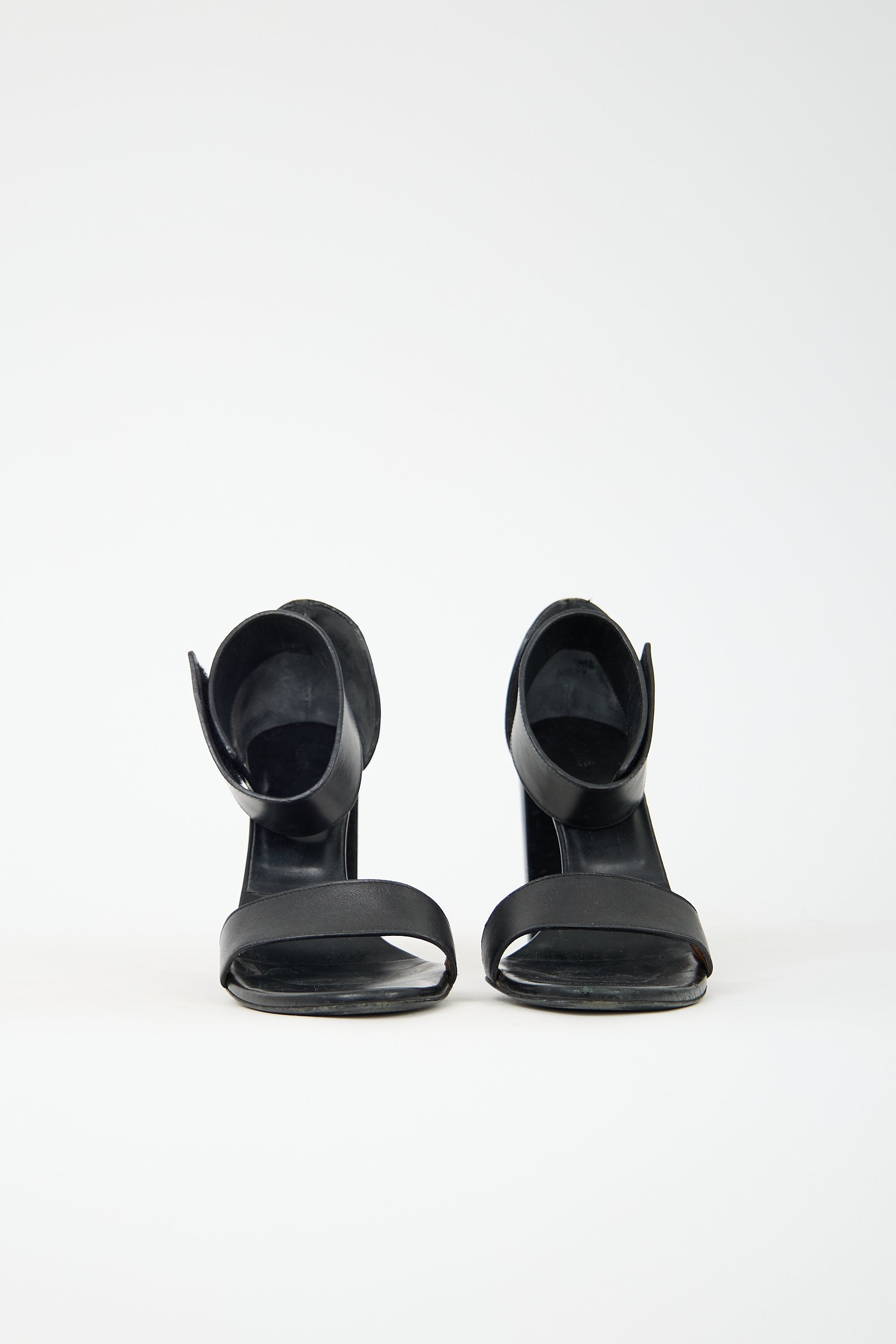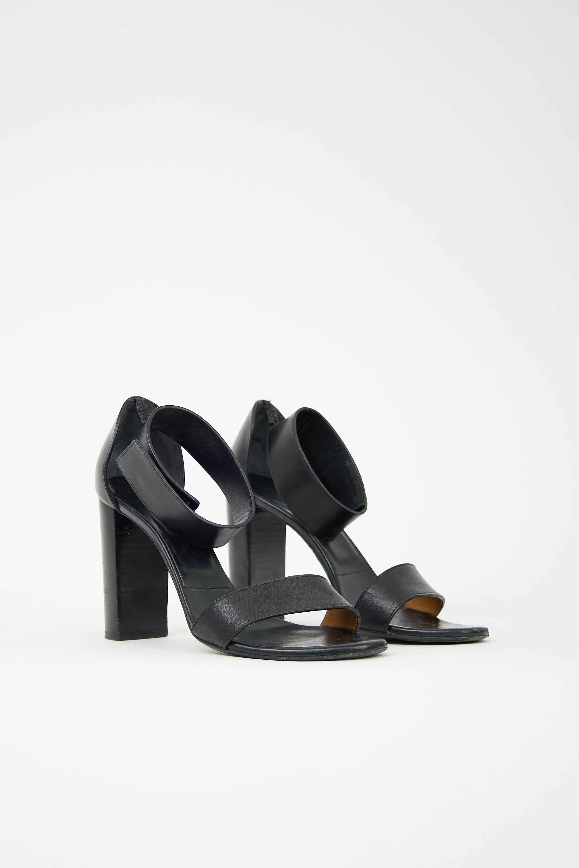 As Is Moderate scuffing at toe, heel, and sole. Ankle strap attachment shows wear.