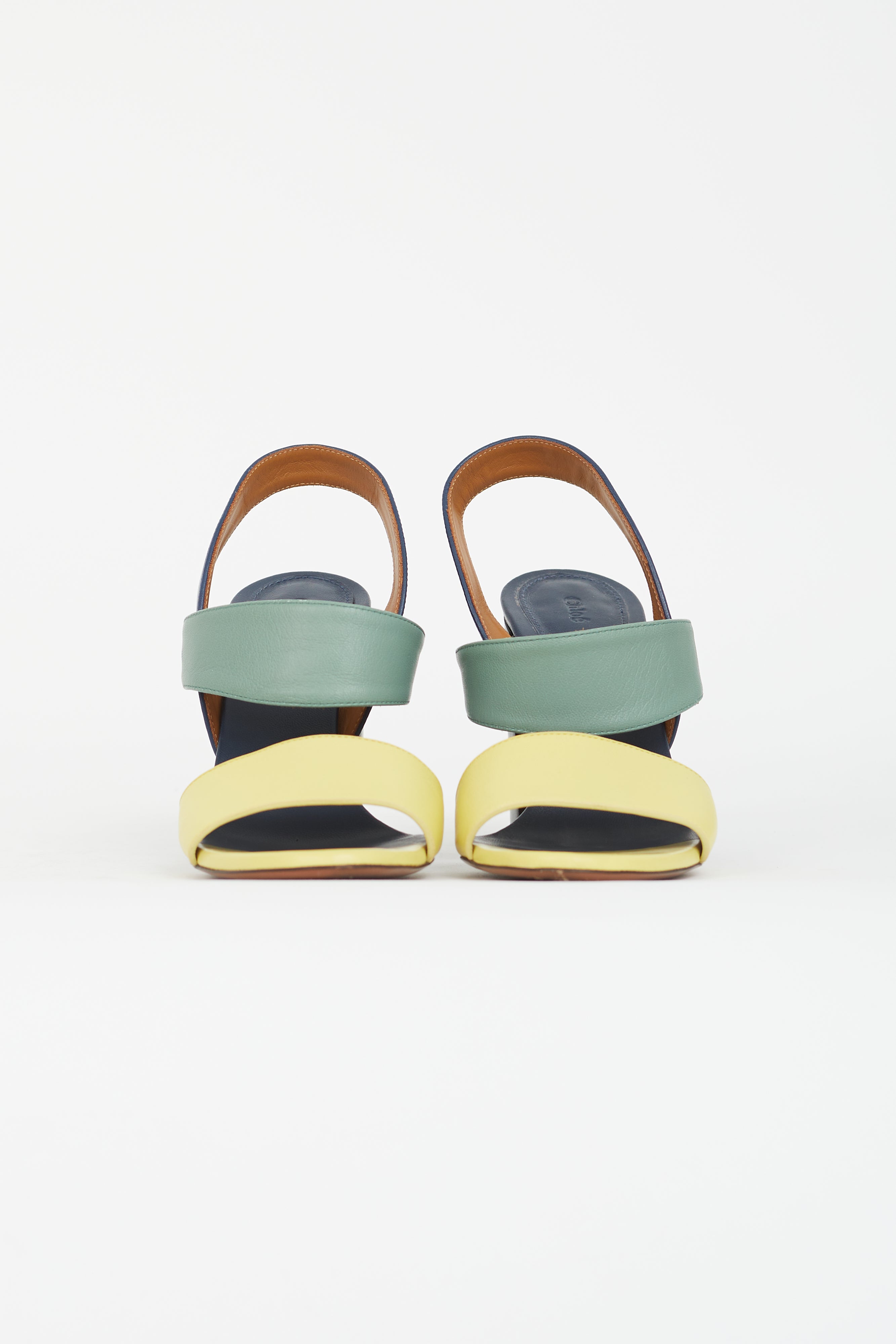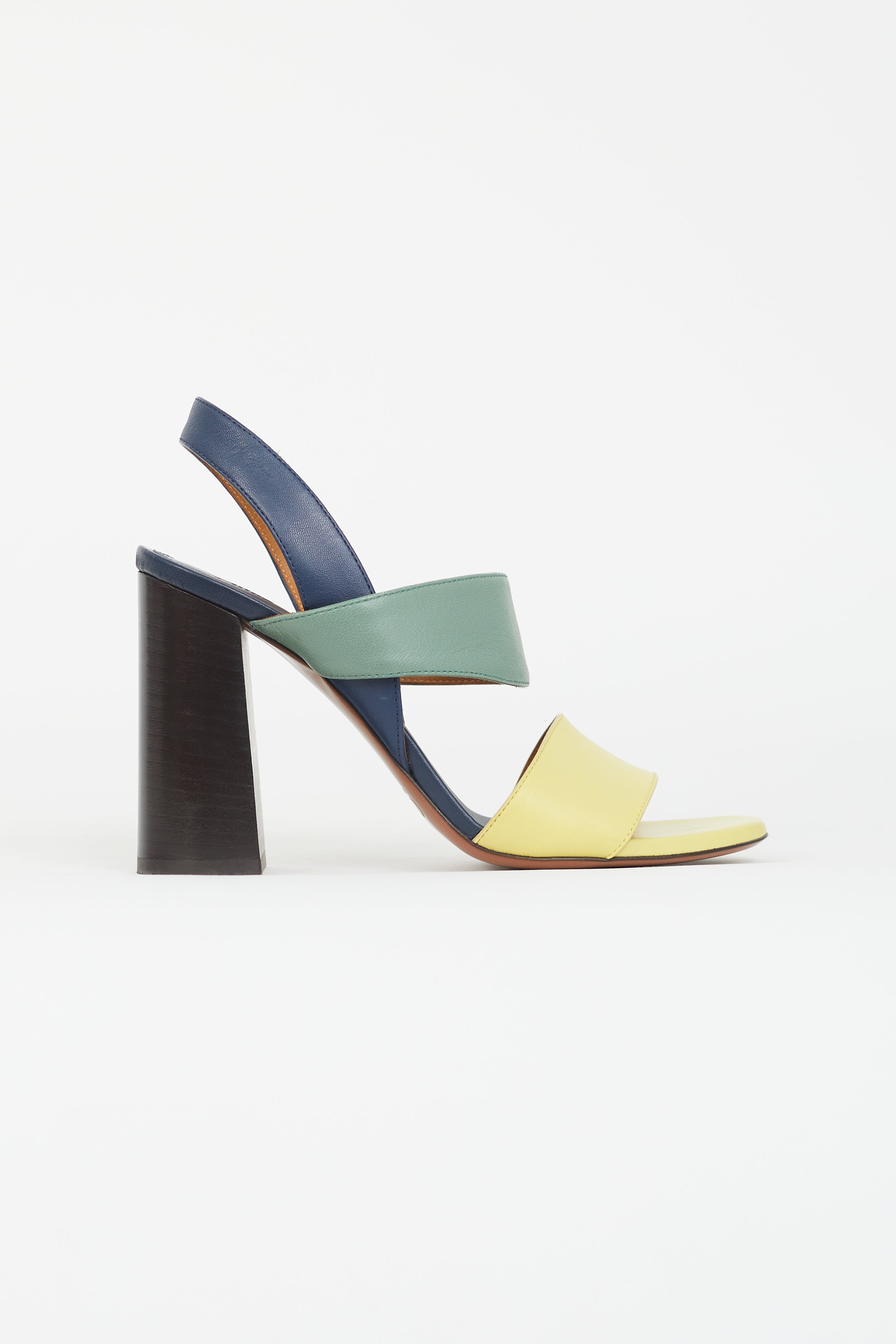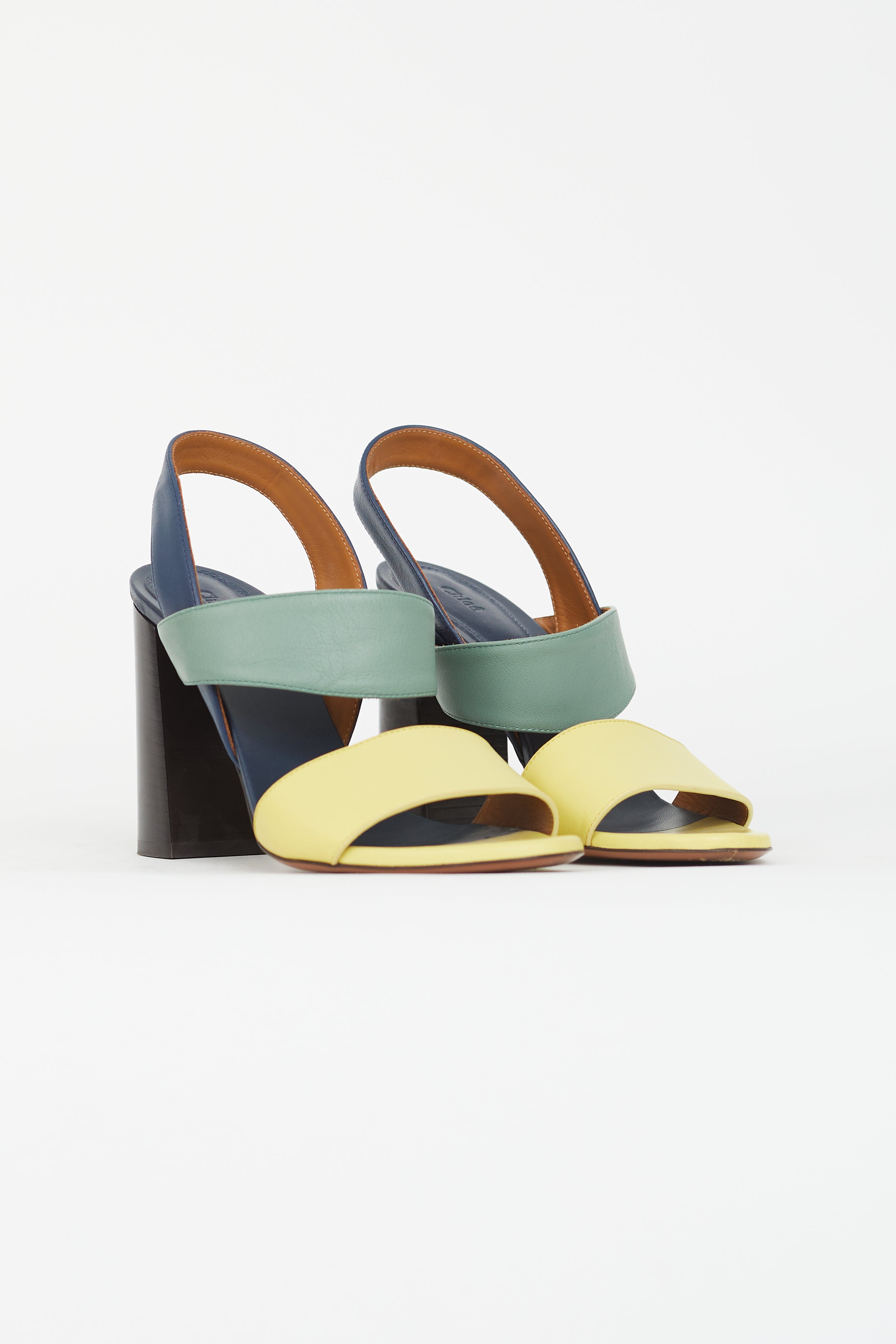 Pre-owned Chloé colour block heeled sandals featuring almond toe, yellow leather strap at toe, green vamp strap, navy ankle strap, and stacked block heel.