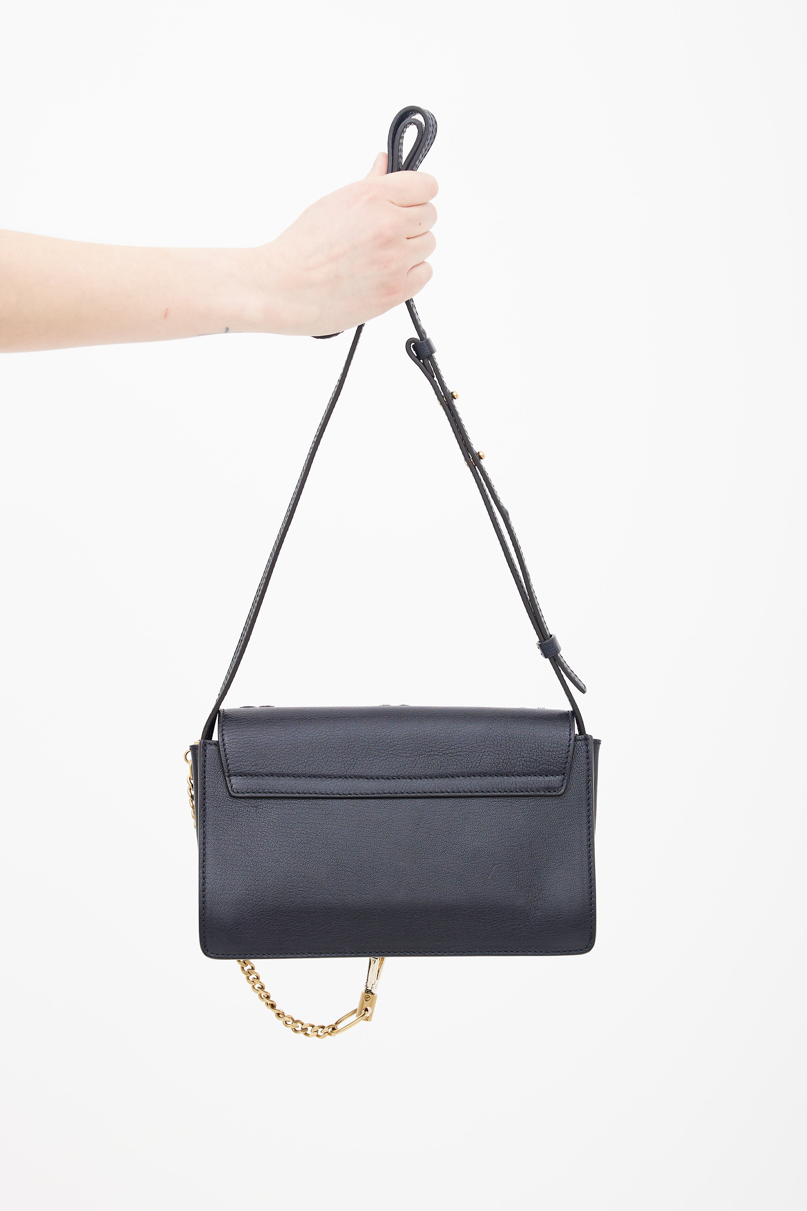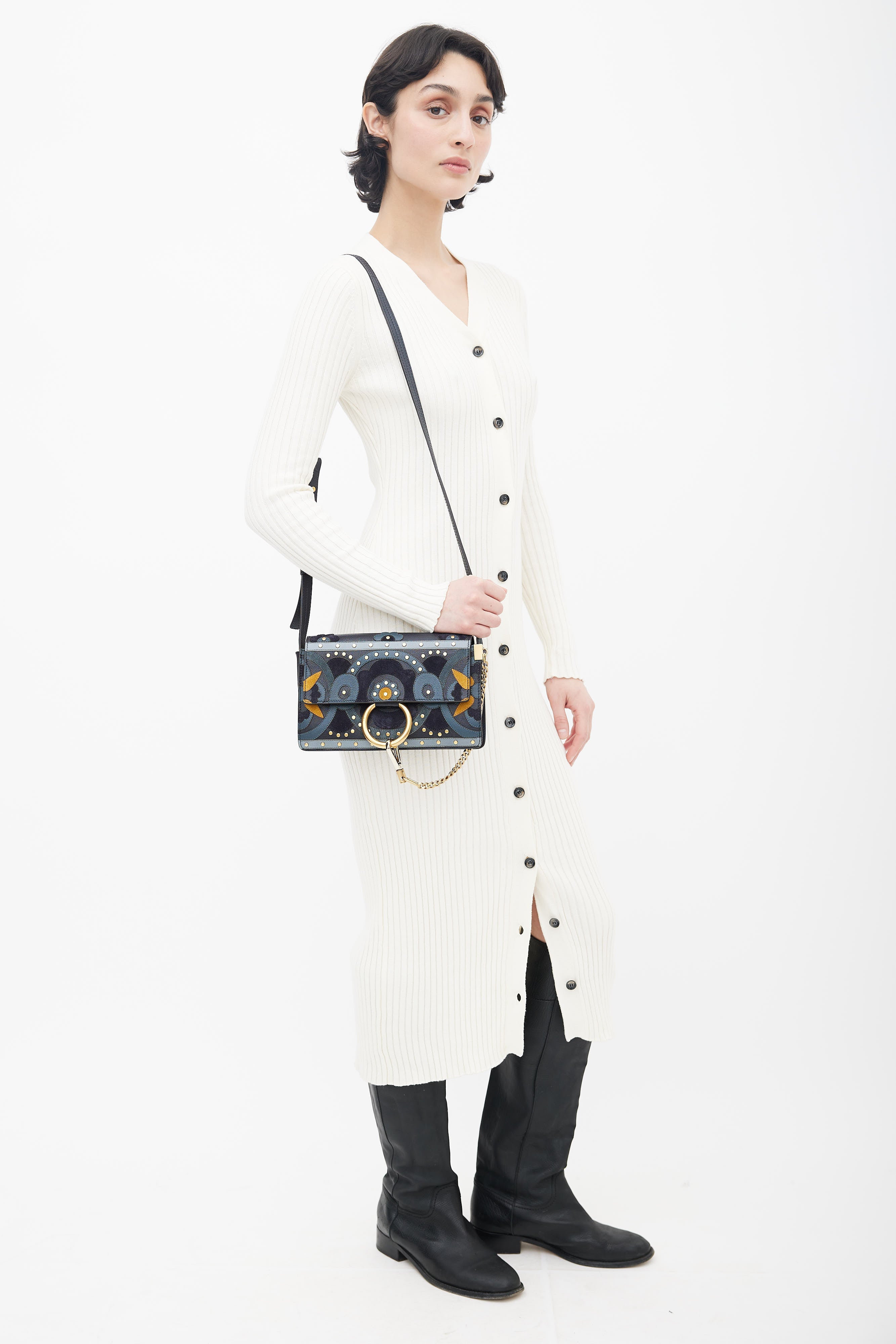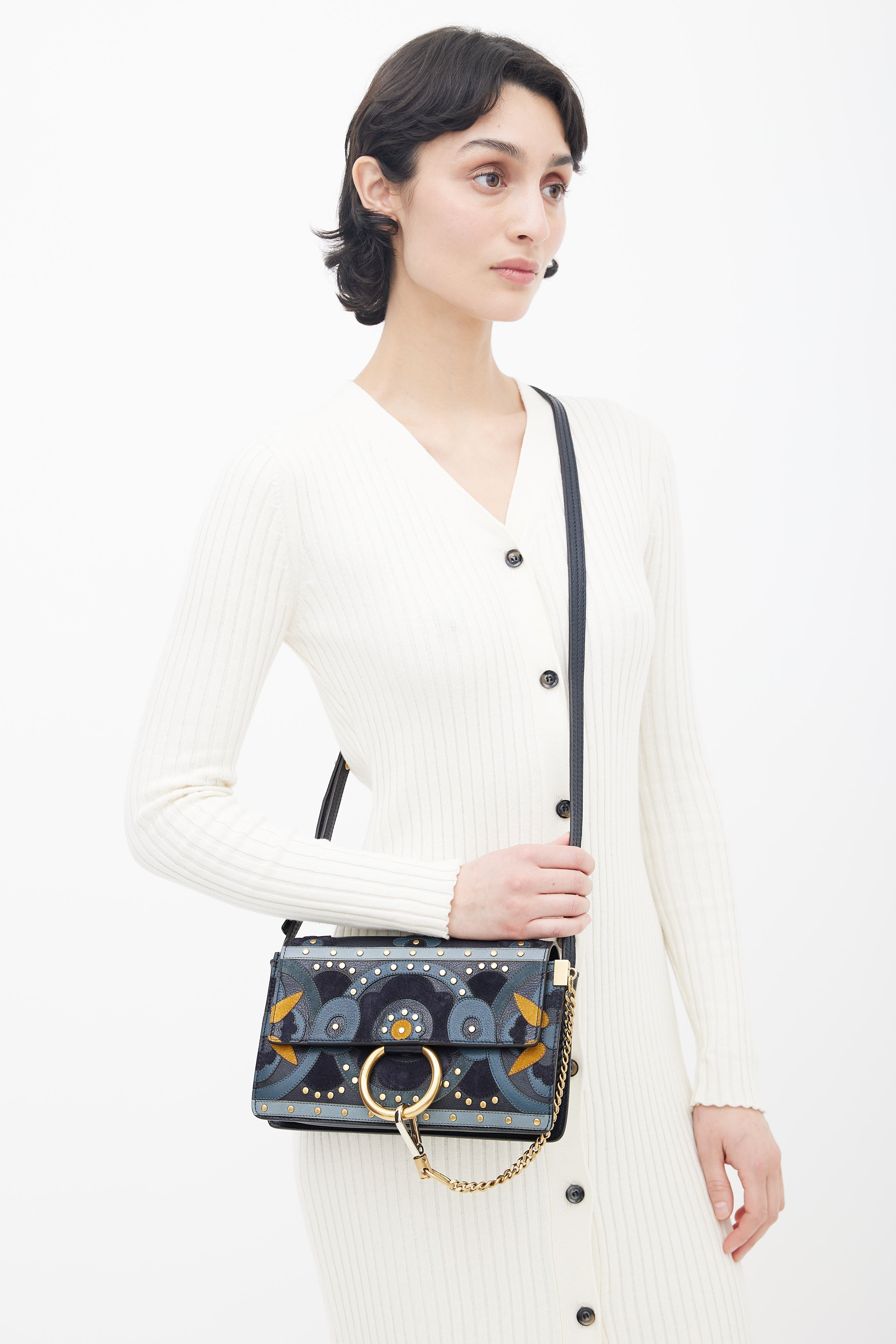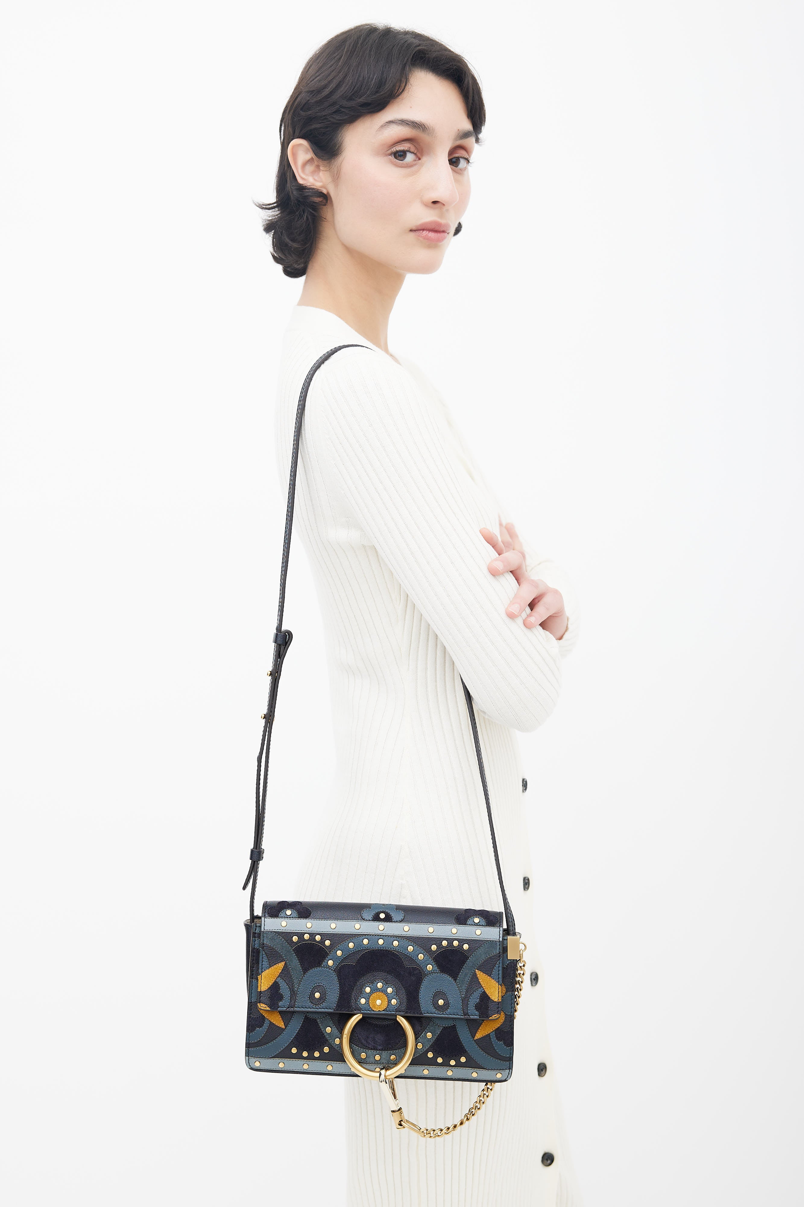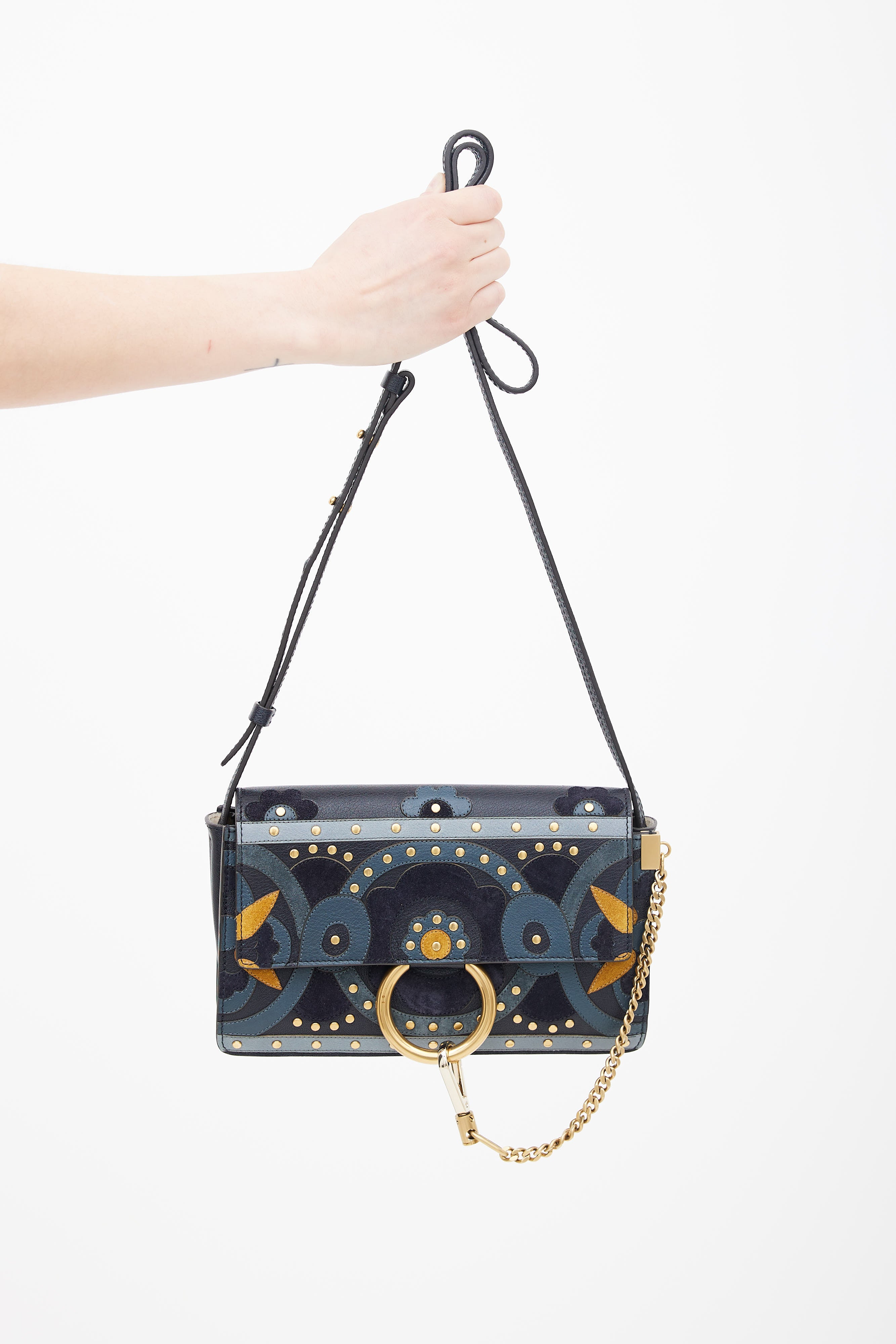Pre-owned Pre-Fall 2017 Chloé Faye shoulder bag in black featuring multicolor floral patchwork at front, gold tone hardware, oversized ring at face with detachable clasp, adjustable shoulder strap, top flap, three main compartments, interior slip pocket with embossed logo, and suede lining.