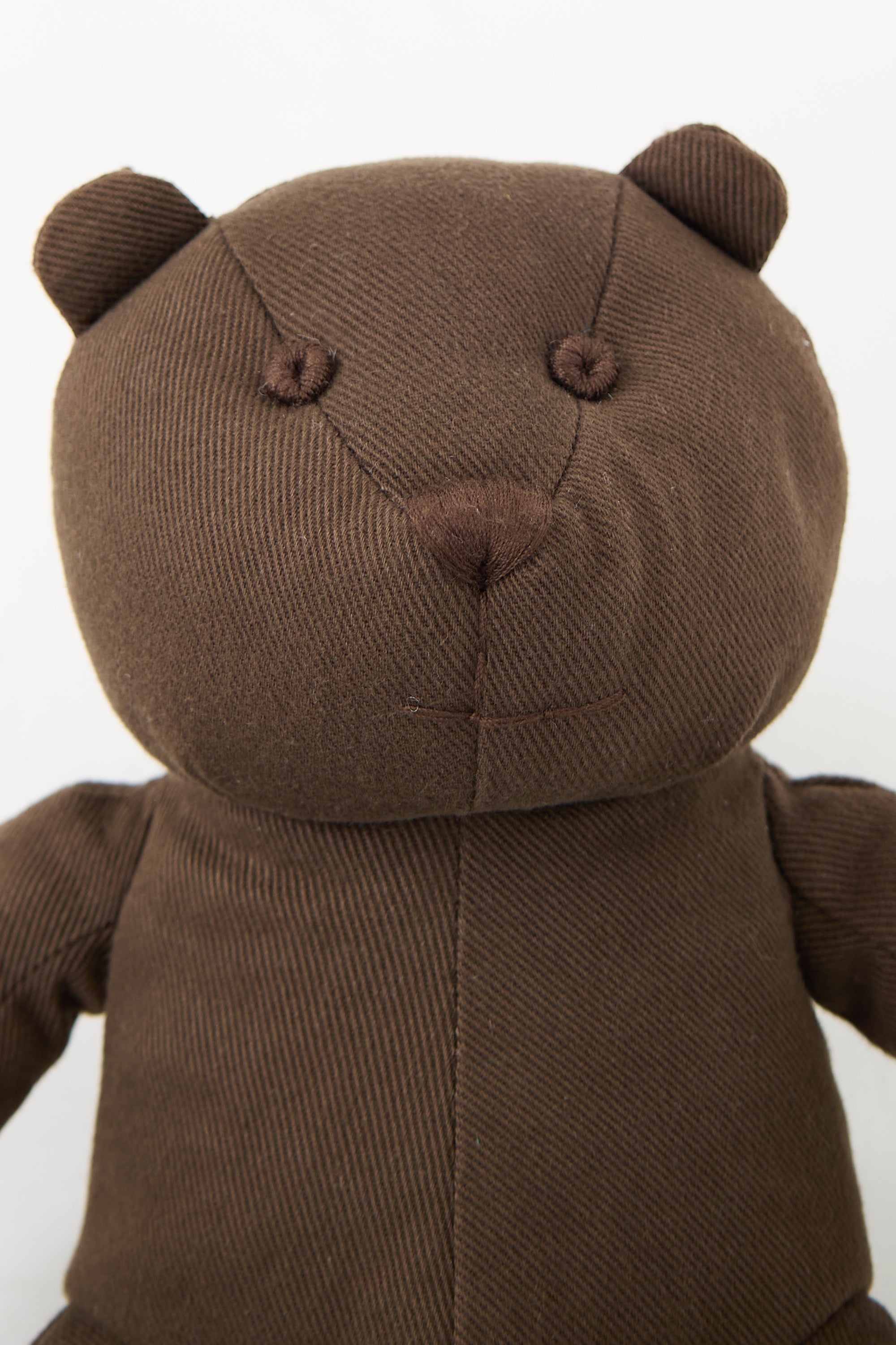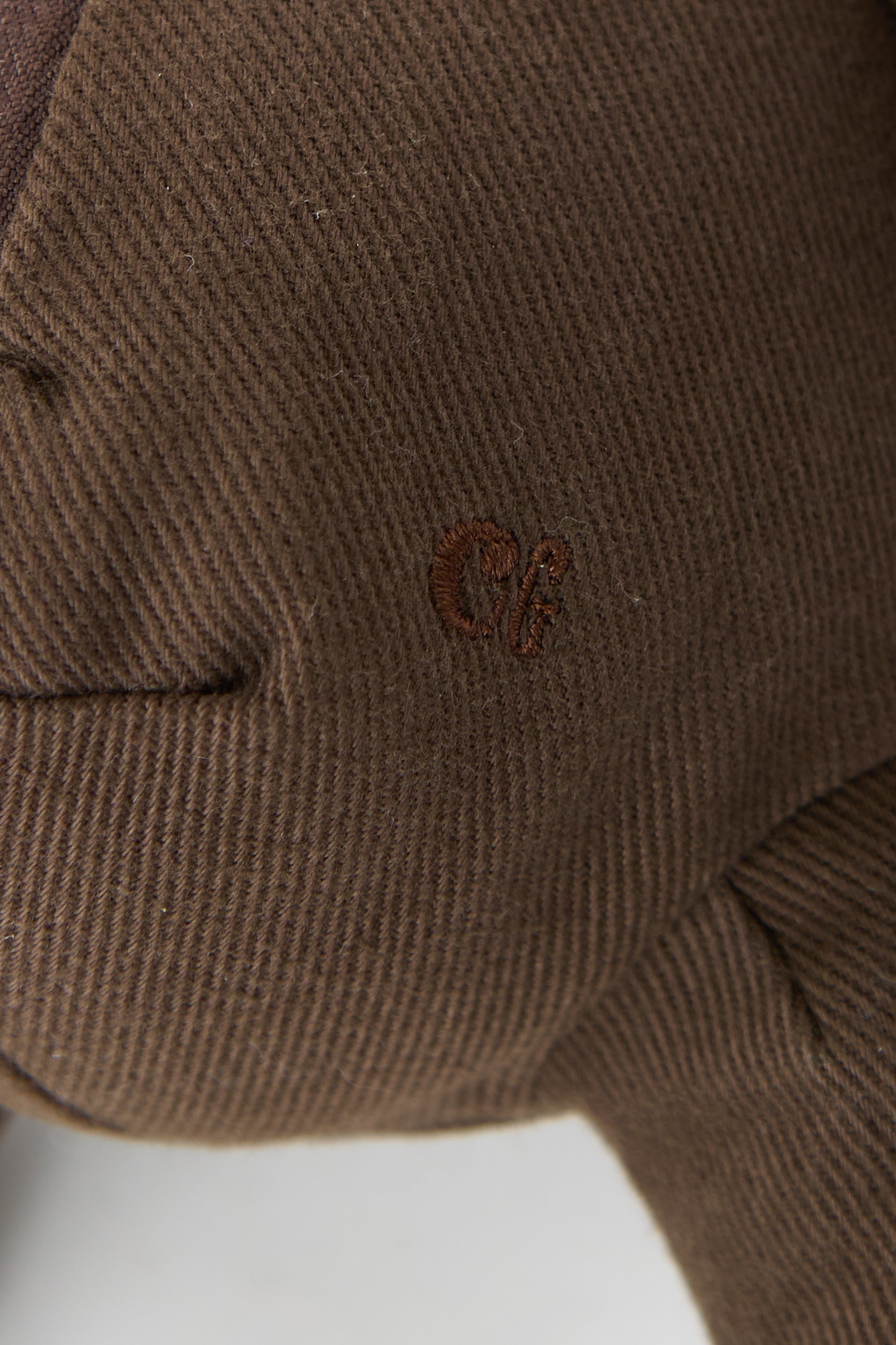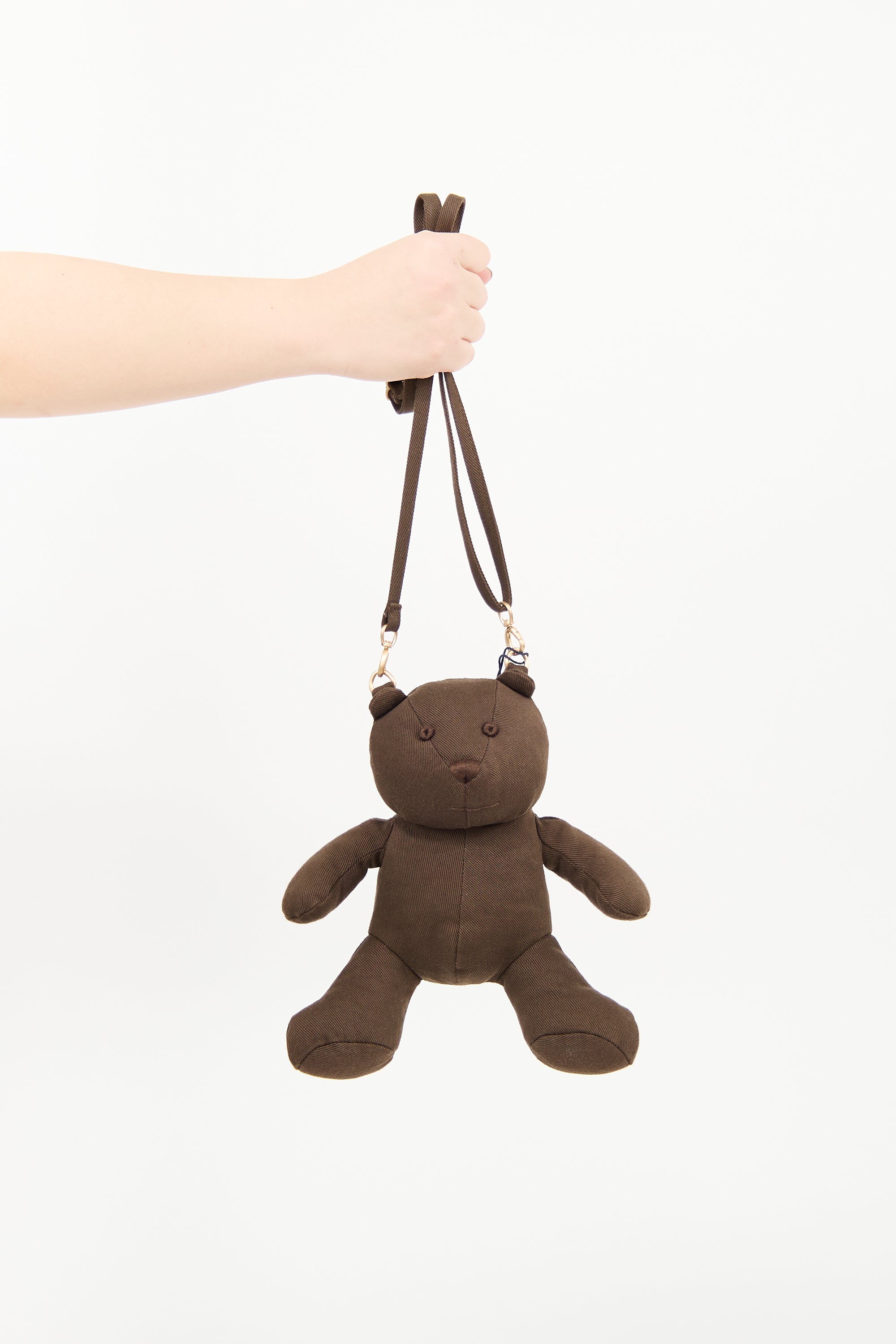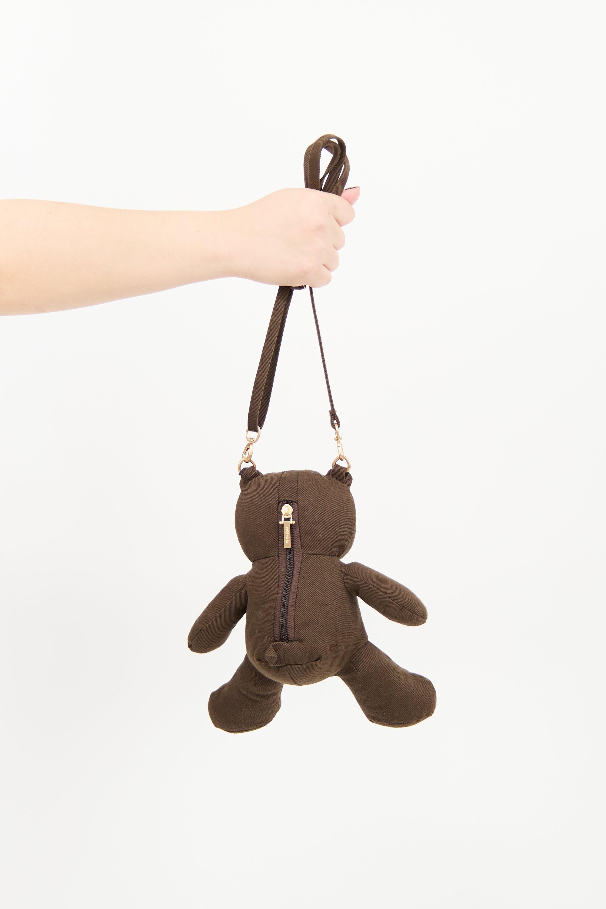 Pre-owned Cult Gaia brown cotton teddy bear bag featuring a detachable adjustable cross body strap with gold tone hardware, embroidered logo at base, and one lined zip compartment.