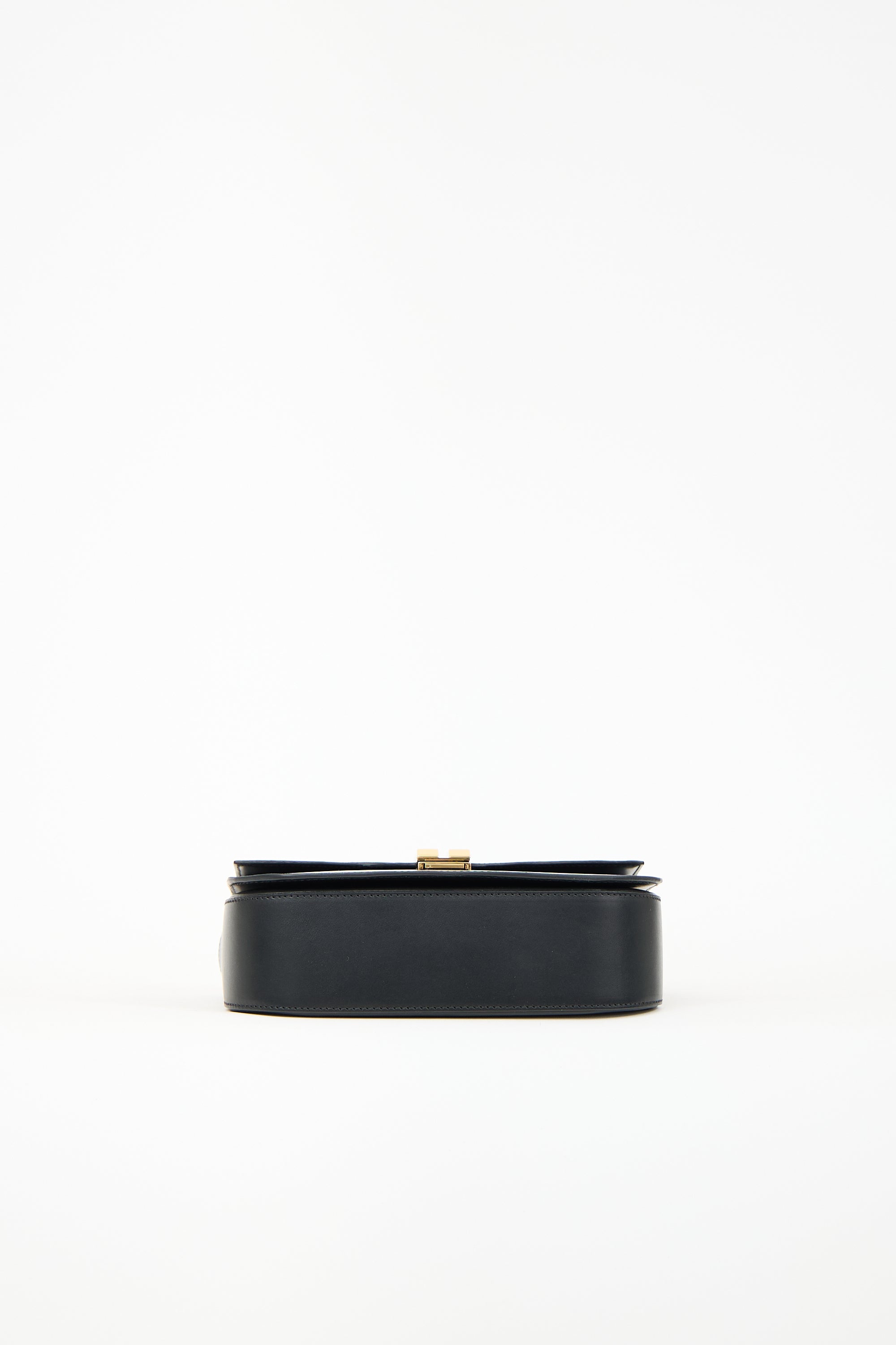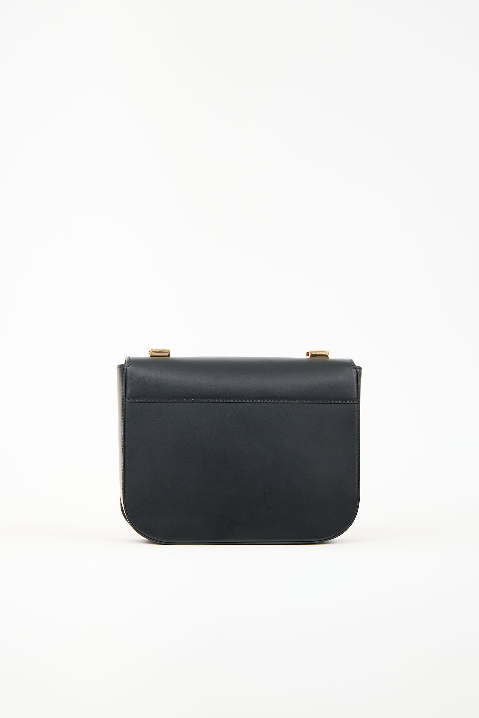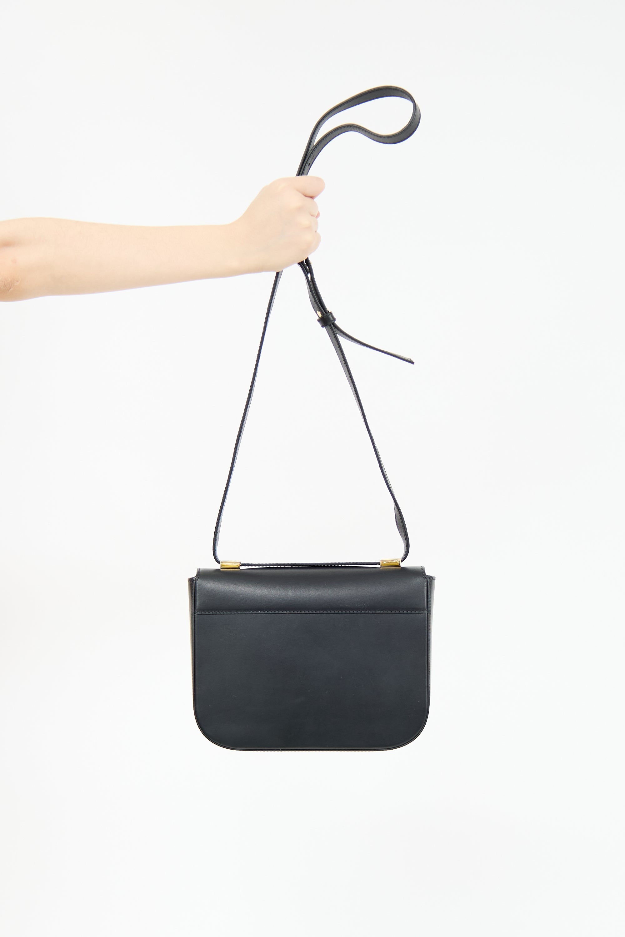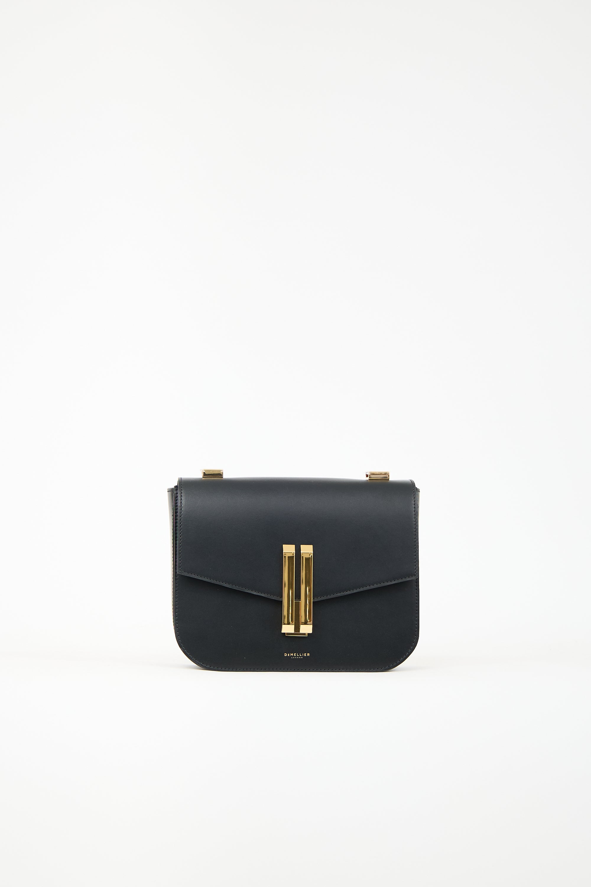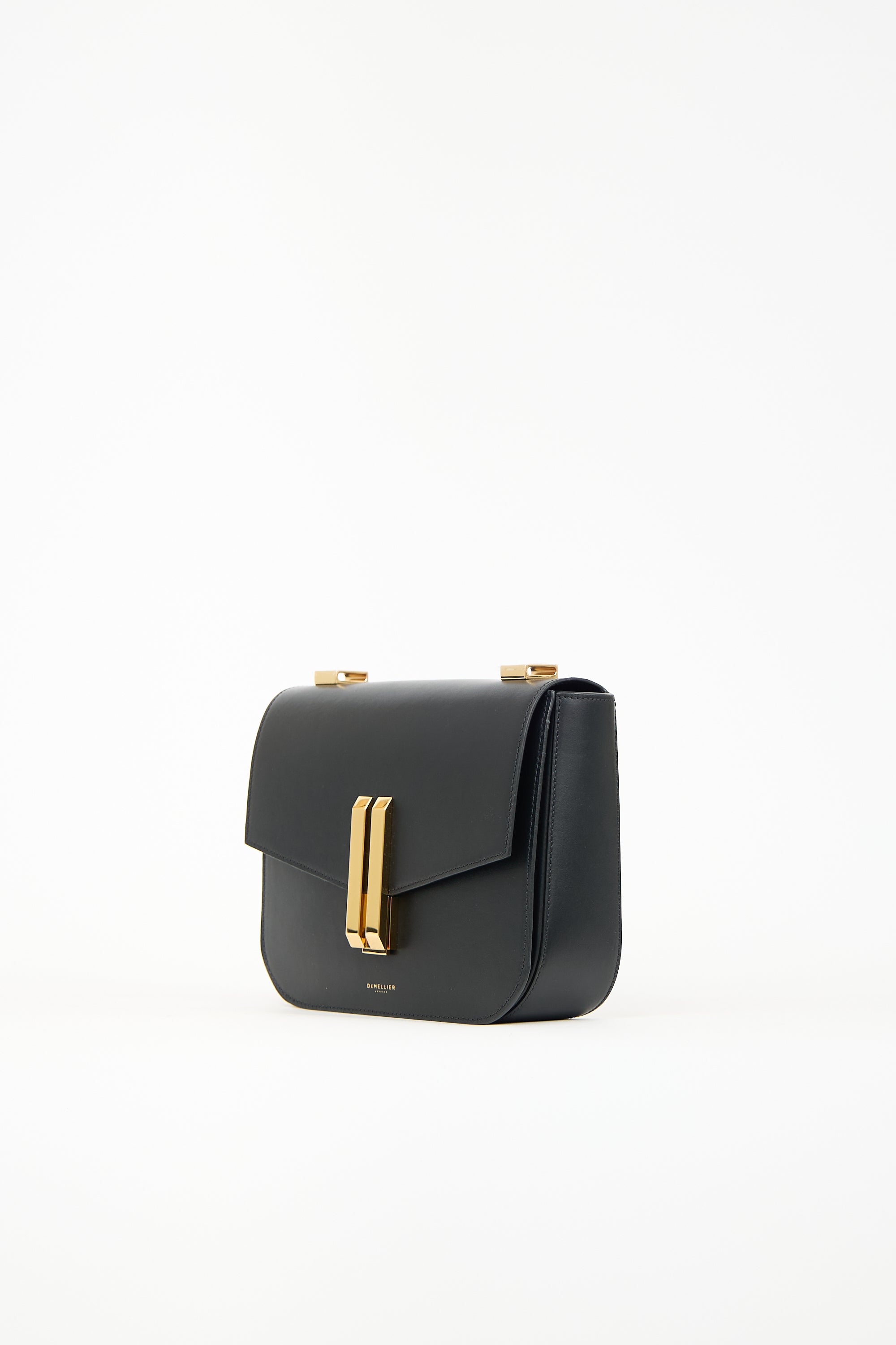 Pre-owned Demellier black leather The Vancouver crossbody bag featuring a detachable adjustable strap, gold tone hardware, push lock closure at top flap, two lined compartments, and one zip pocket. Comes with original dust bag.