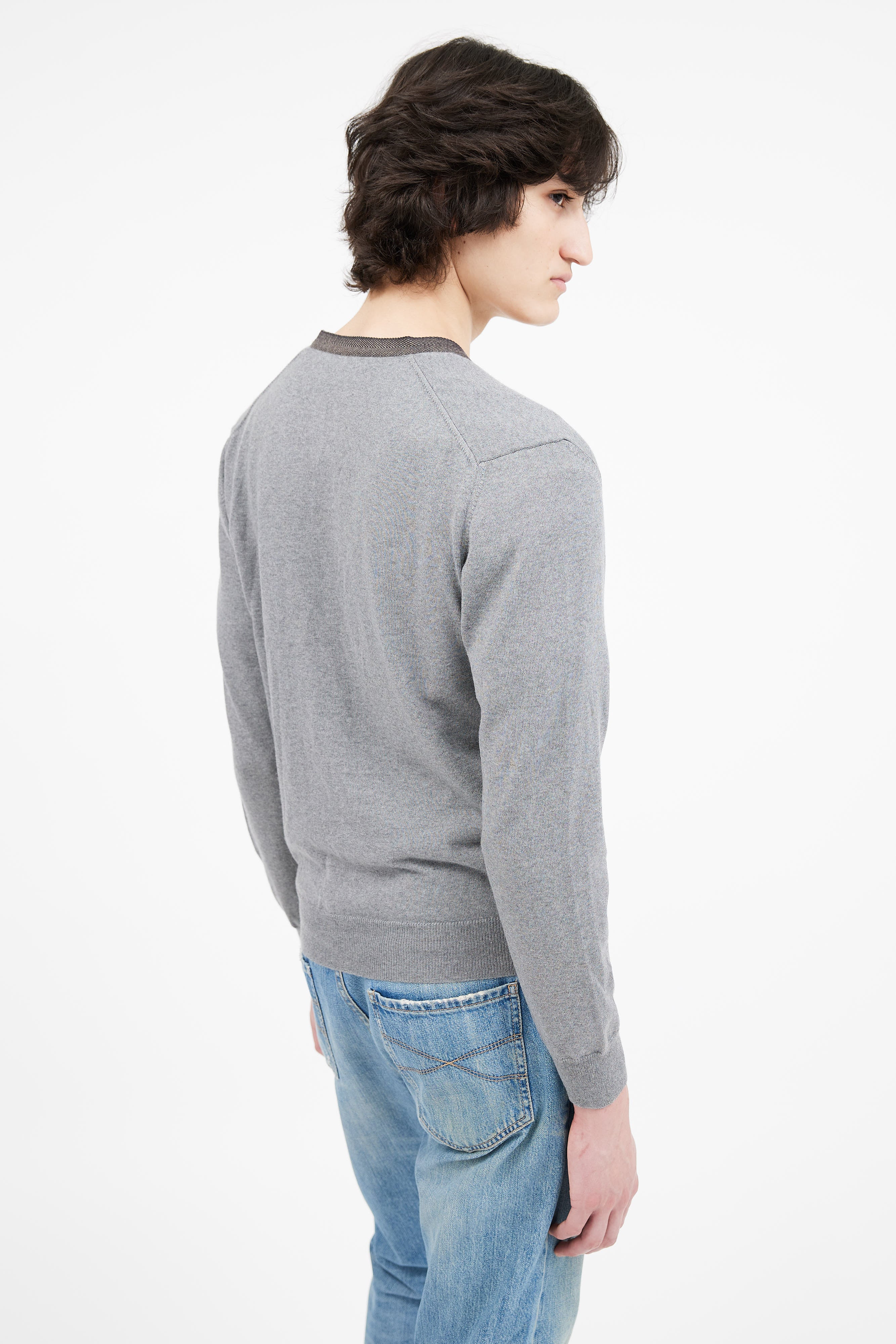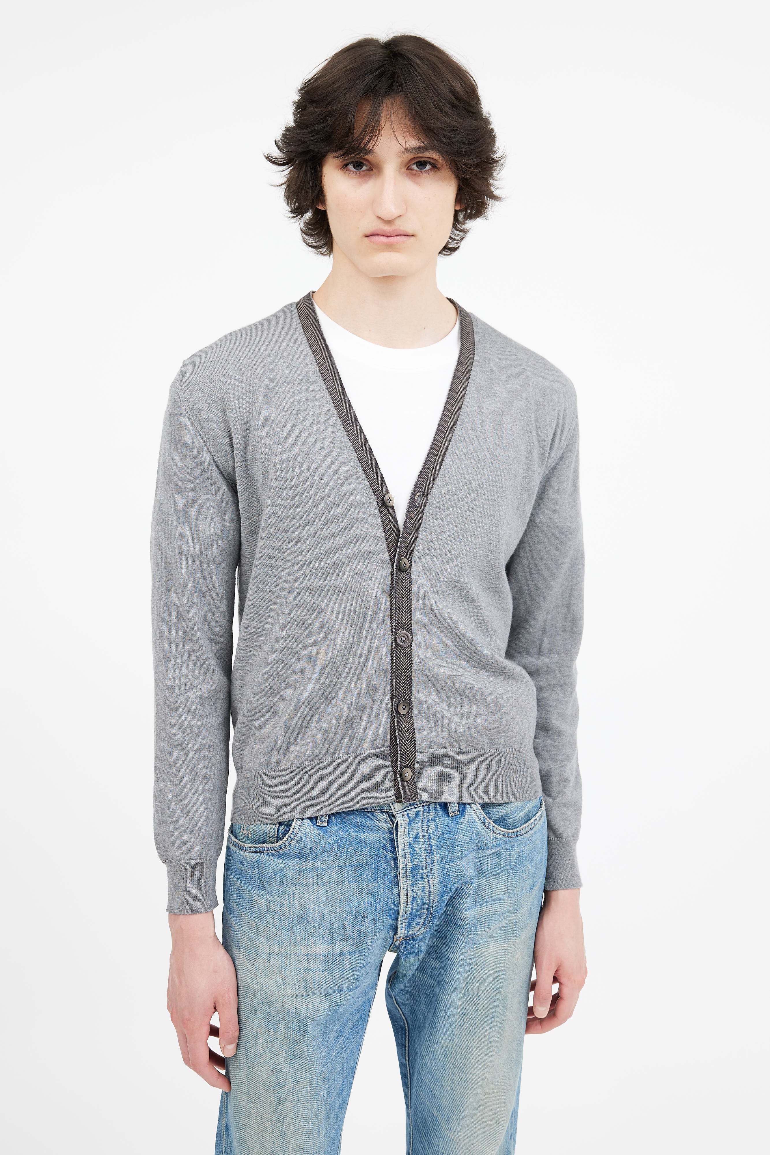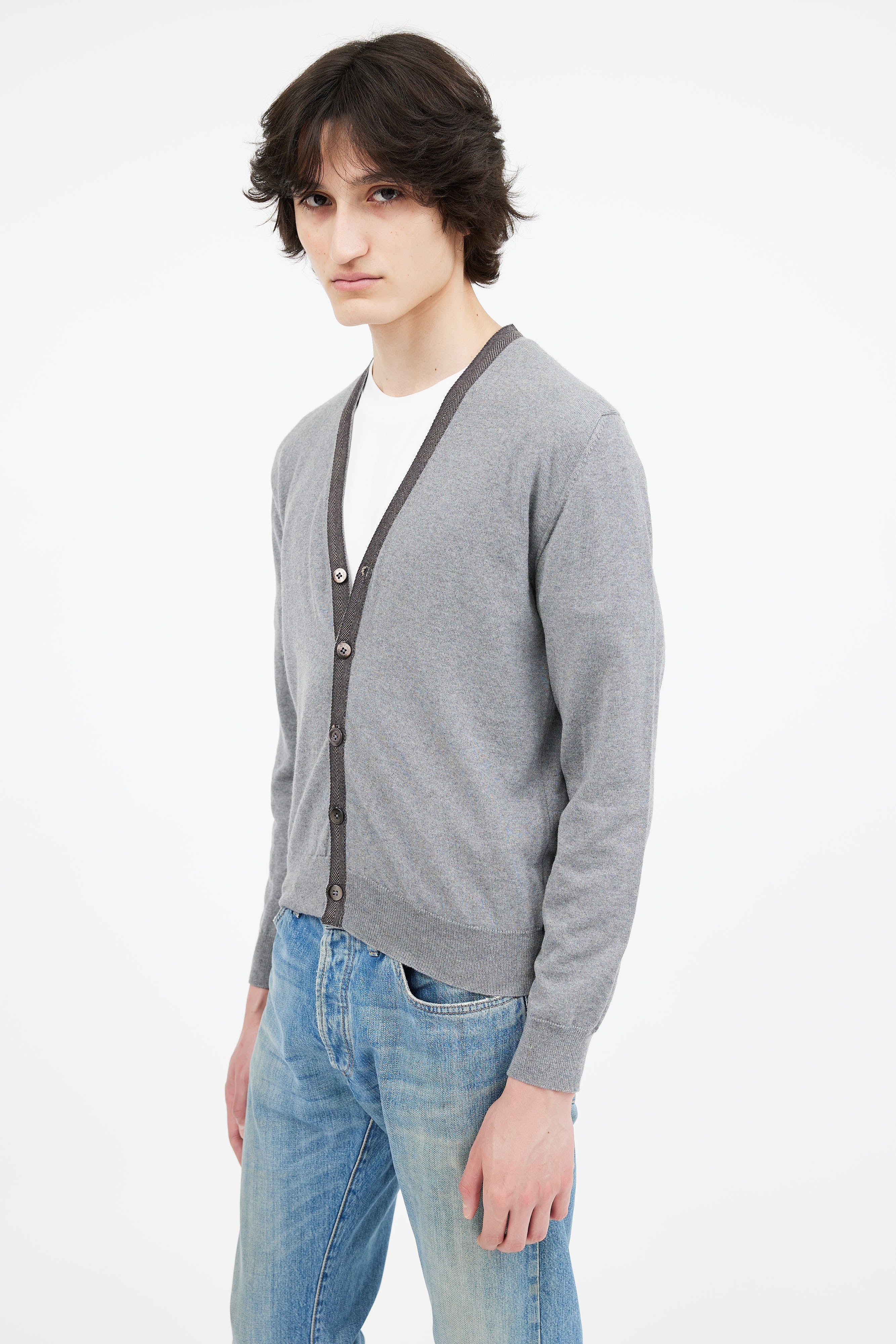 Pre-owned Etro grey wool cardigan featuring V-neckline, button up front, and dark grey chevron trim.