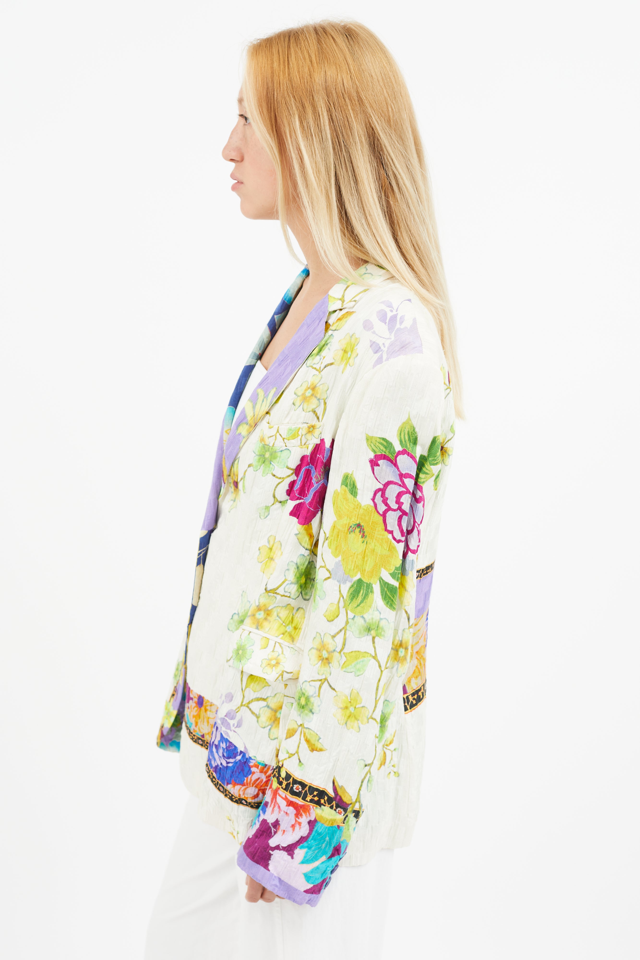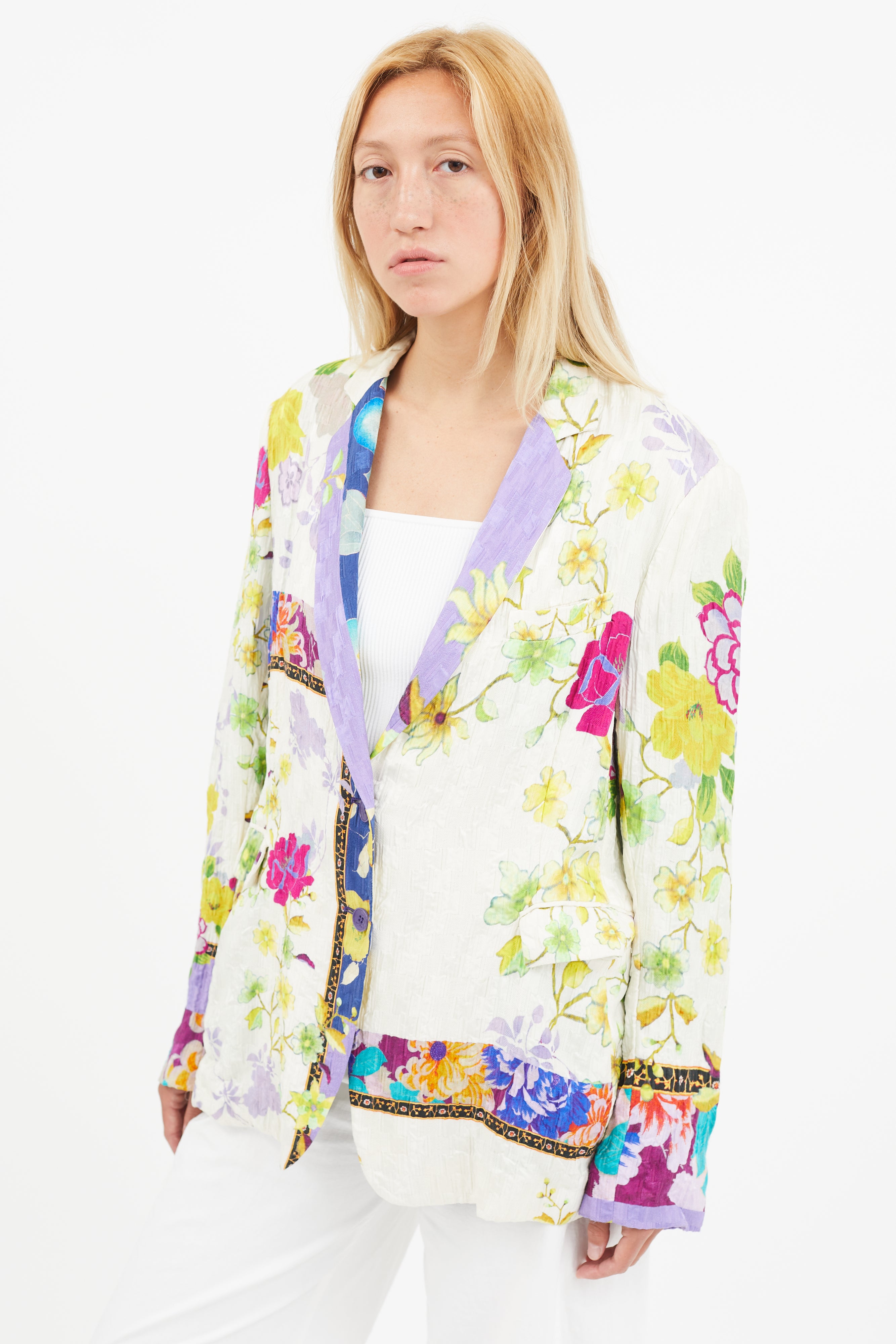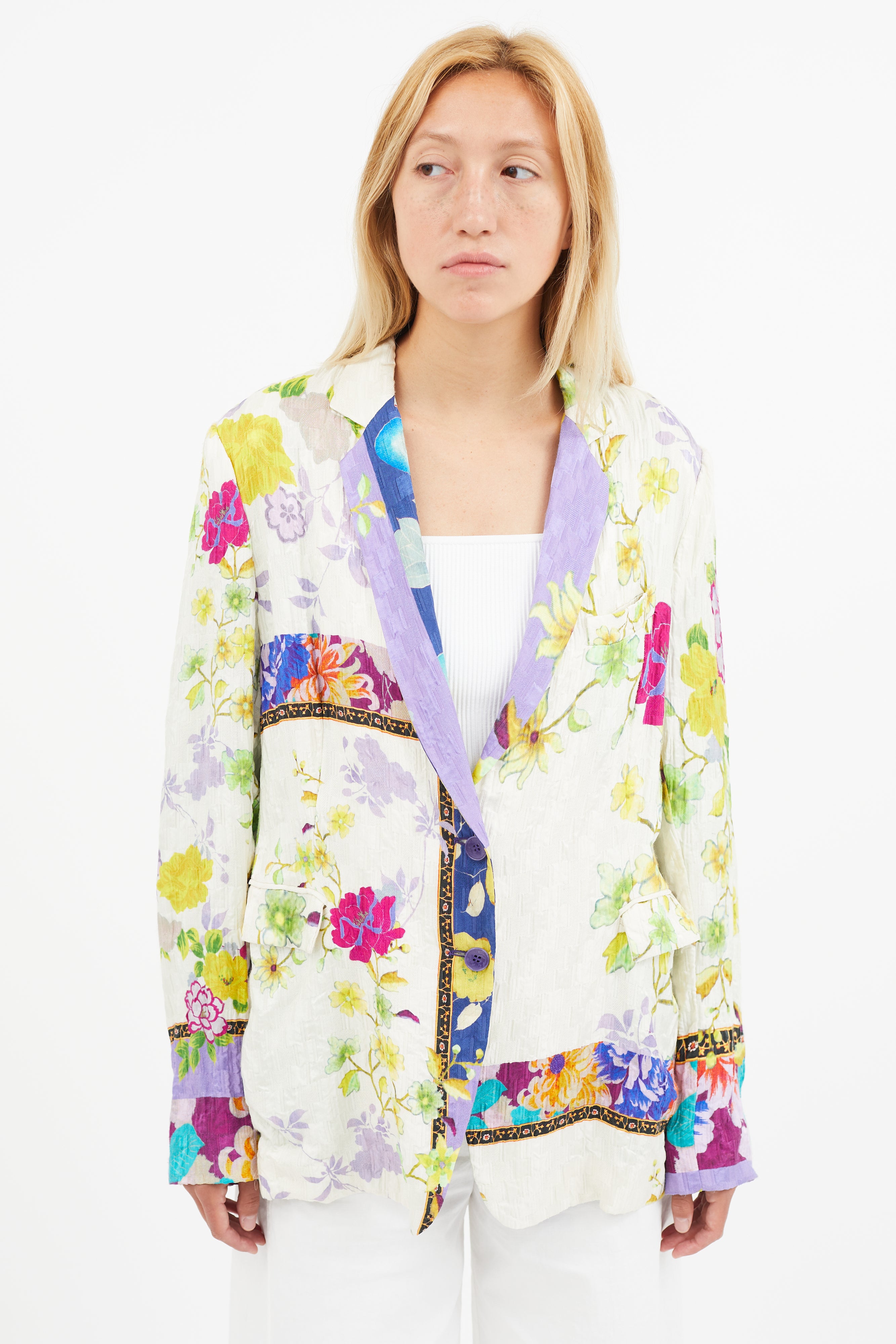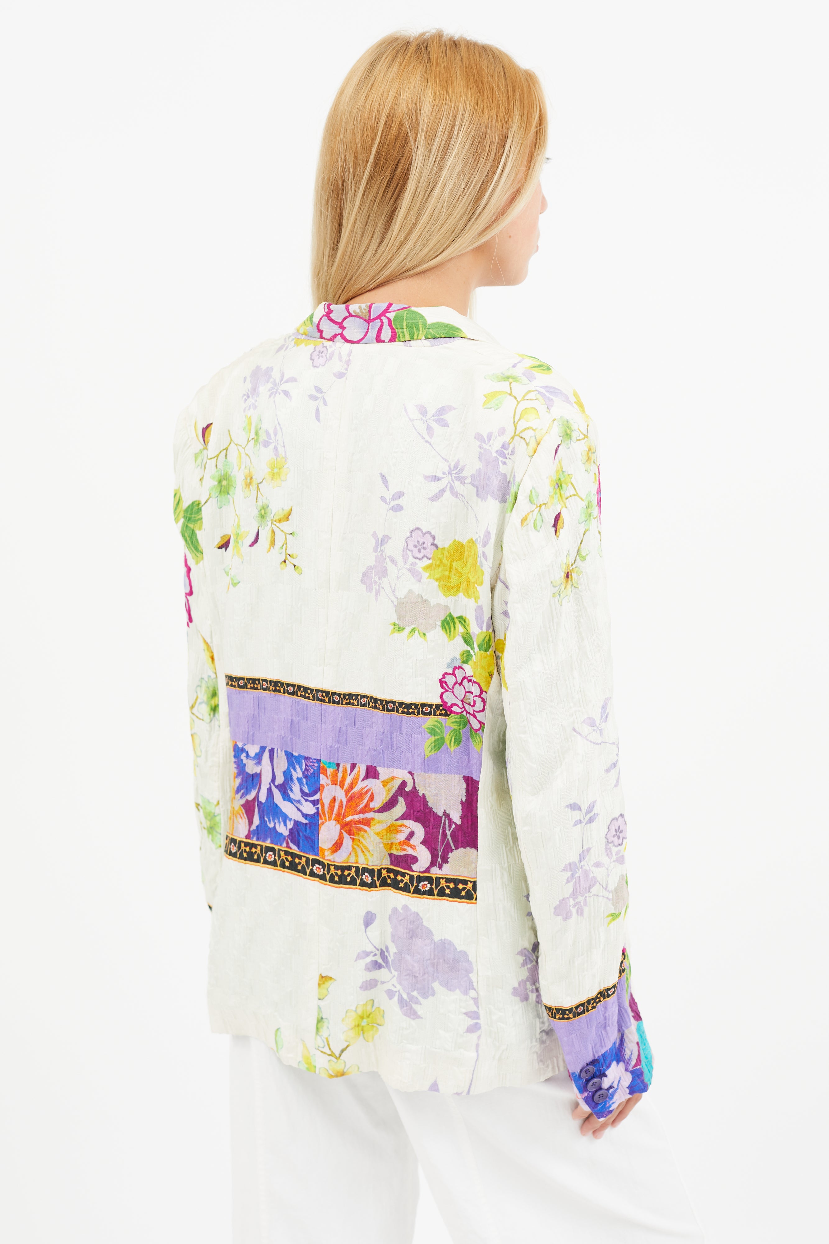 Pre-owned Etro white textured blazer featuring multicolour floral print, notch lapel, one welt pocket at chest, two flap pockets at hips, and single button up front. Silk lined.