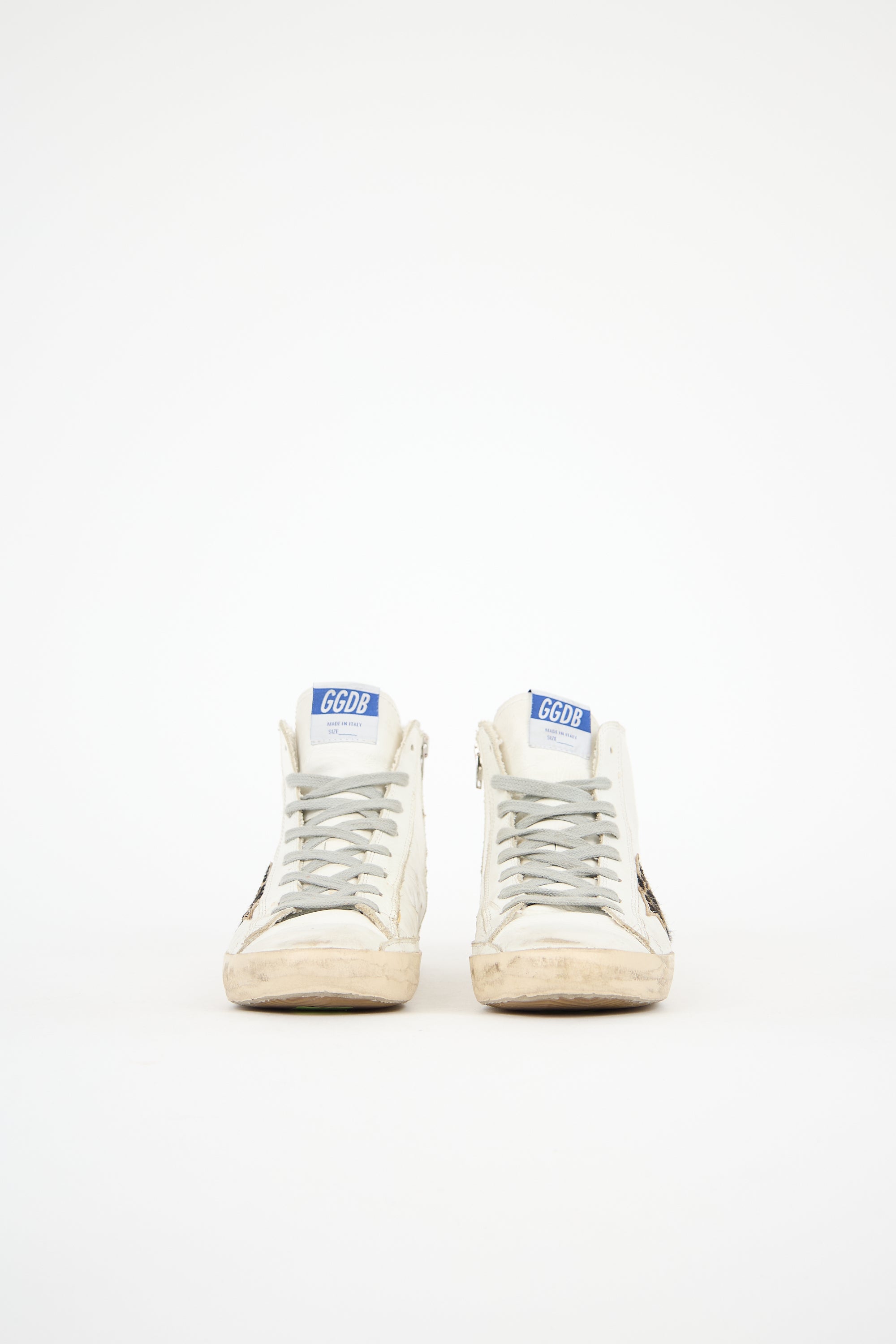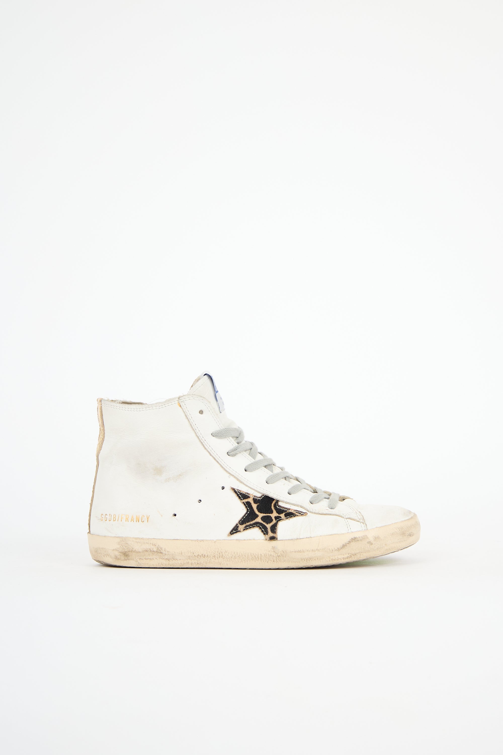 Pre-owned Golden Goose white leather Francy sneakers featuring intentional distressing, rounded toe, lace up front, leopard print pony hair star patch at side, side zip with rubberized logo embellishment, and rubber sole. Comes with original dust bag.