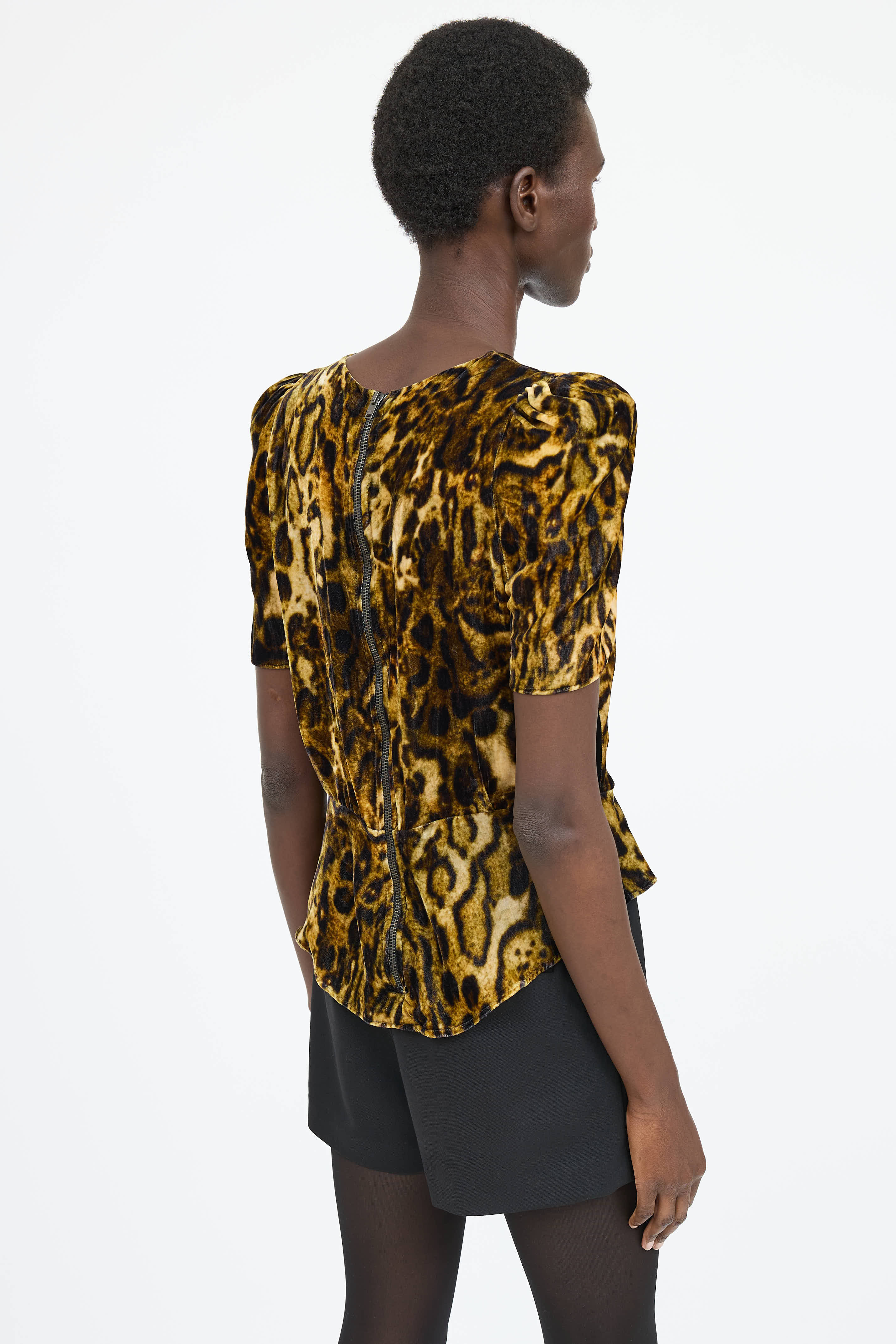 Pre-owned Isabel Marant brown and multicolor short sleeve top featuring leopard print, round neckline, pleated at shoulder, high low hemline, and zip closure at back.
