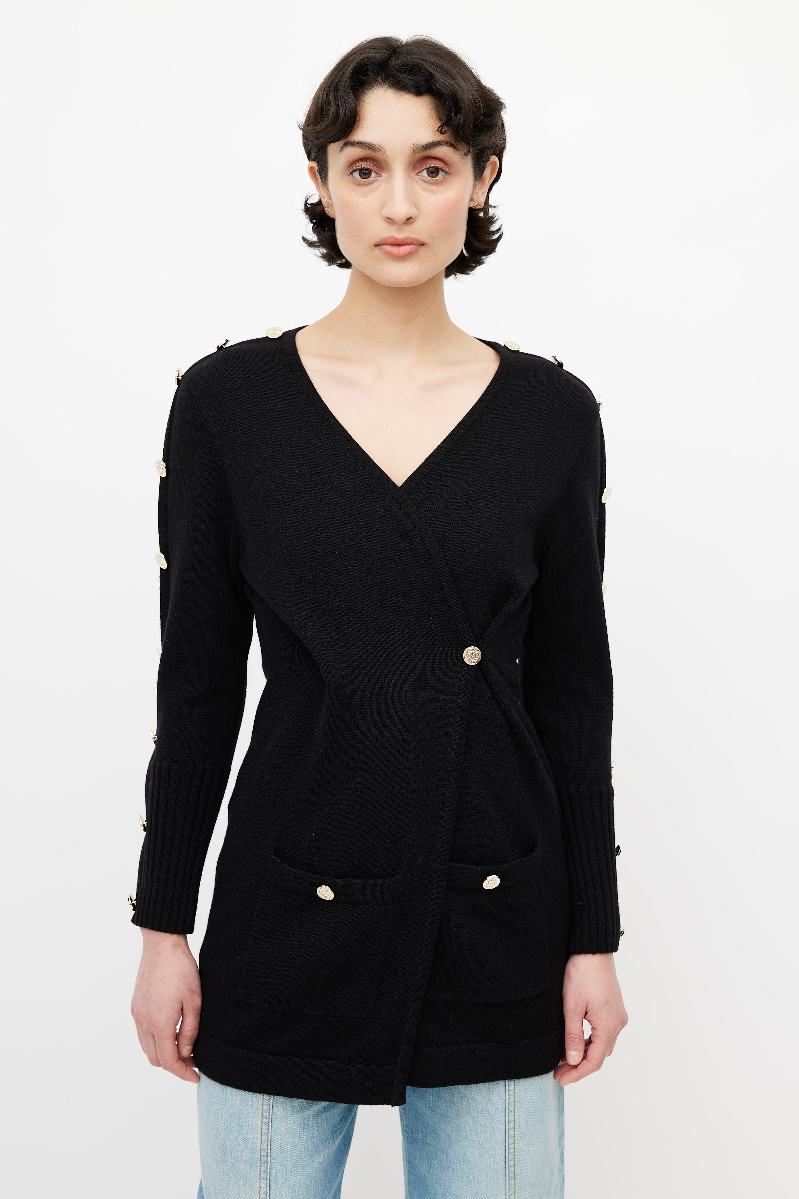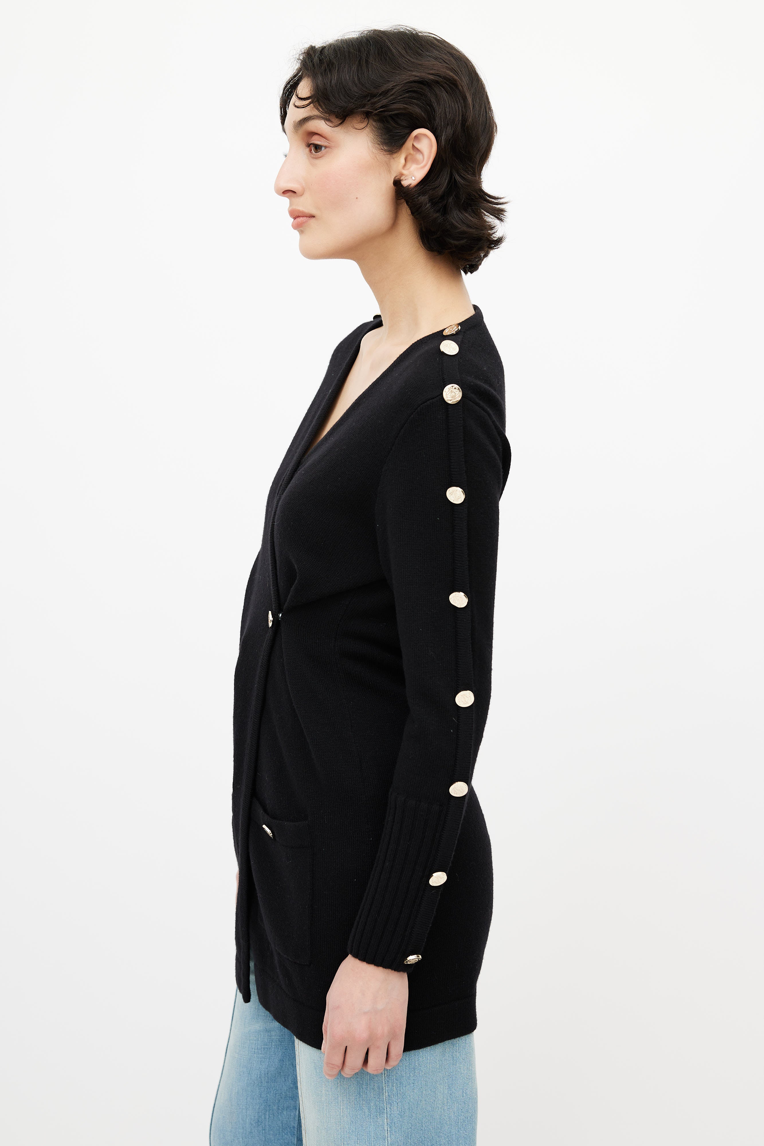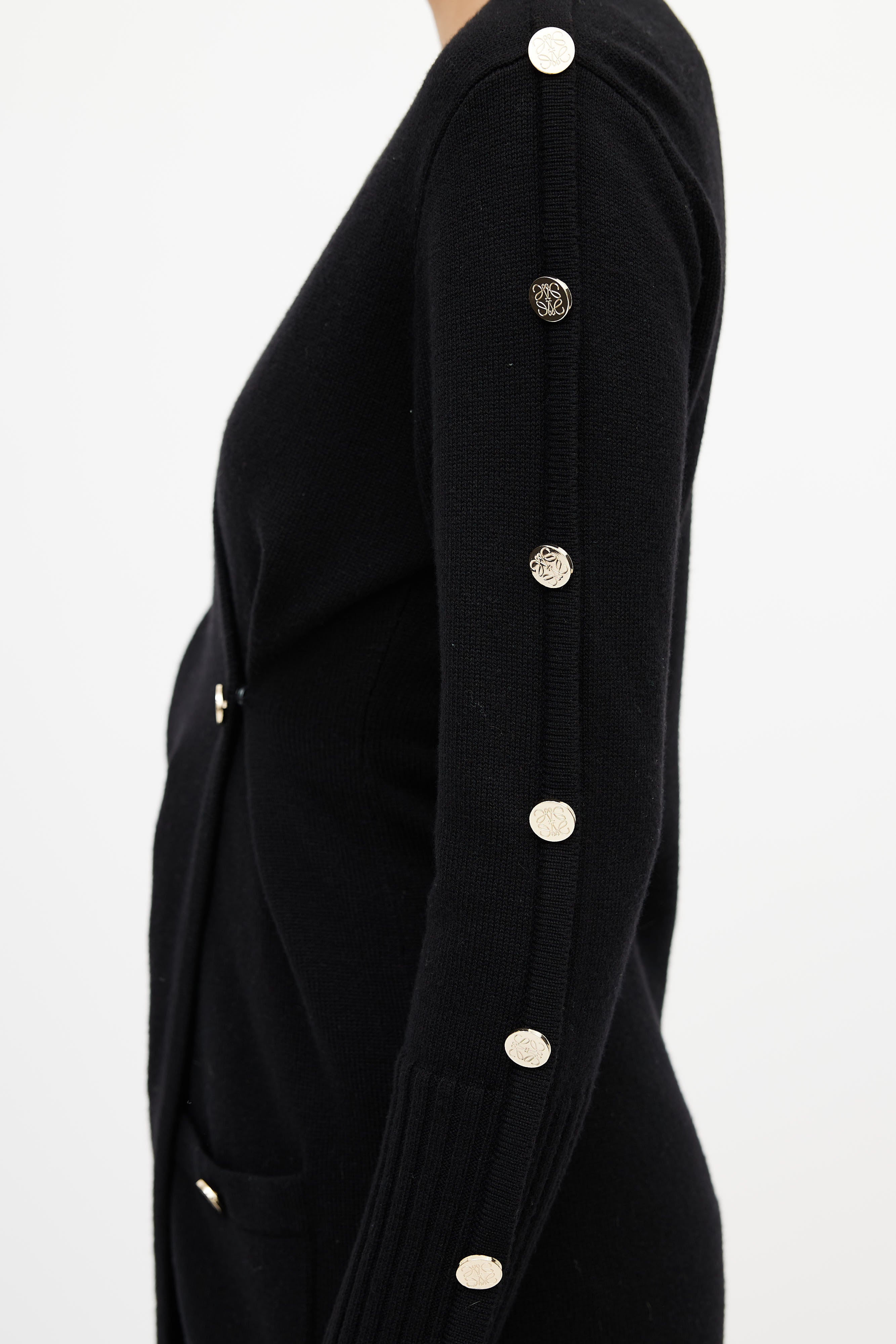 Pre-owned Loewe black cardigan featuring surplice neckline, button fastening, two buttoned pockets at waist, and gold tone engraved buttons at long sleeves.