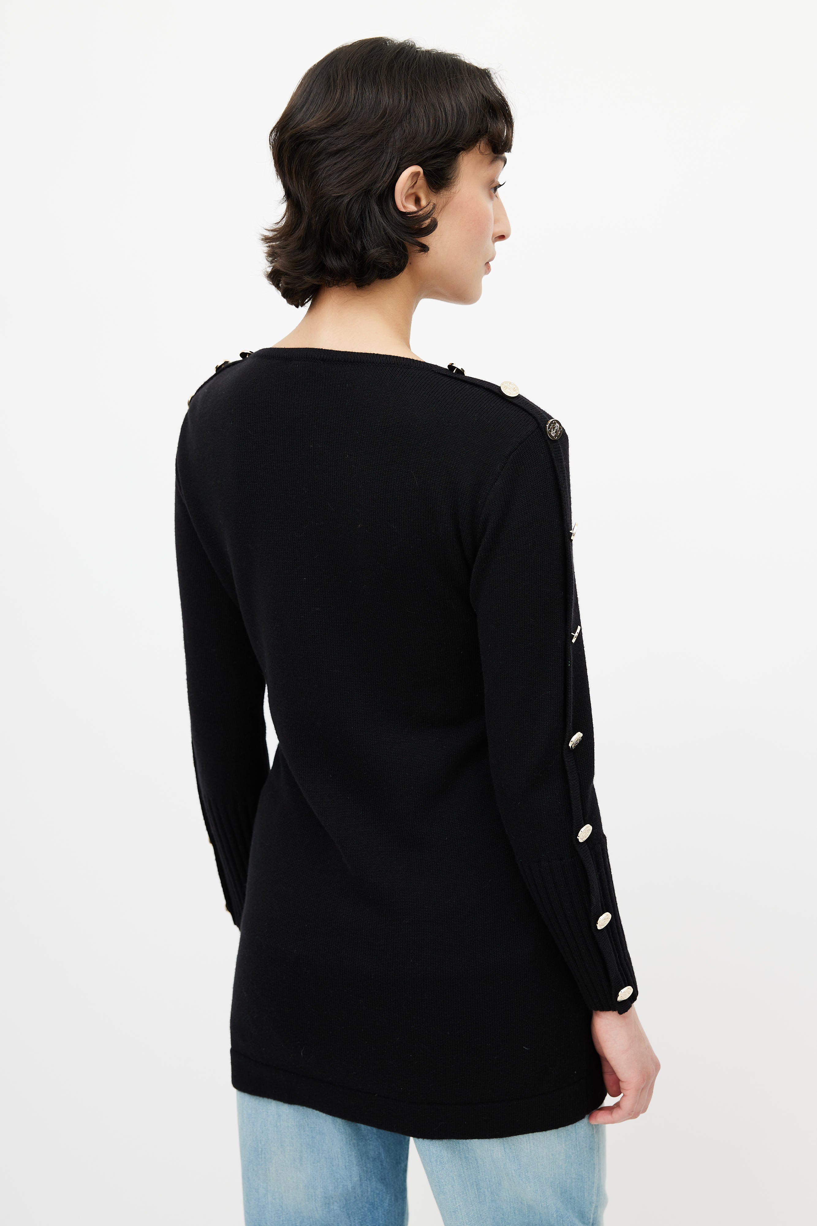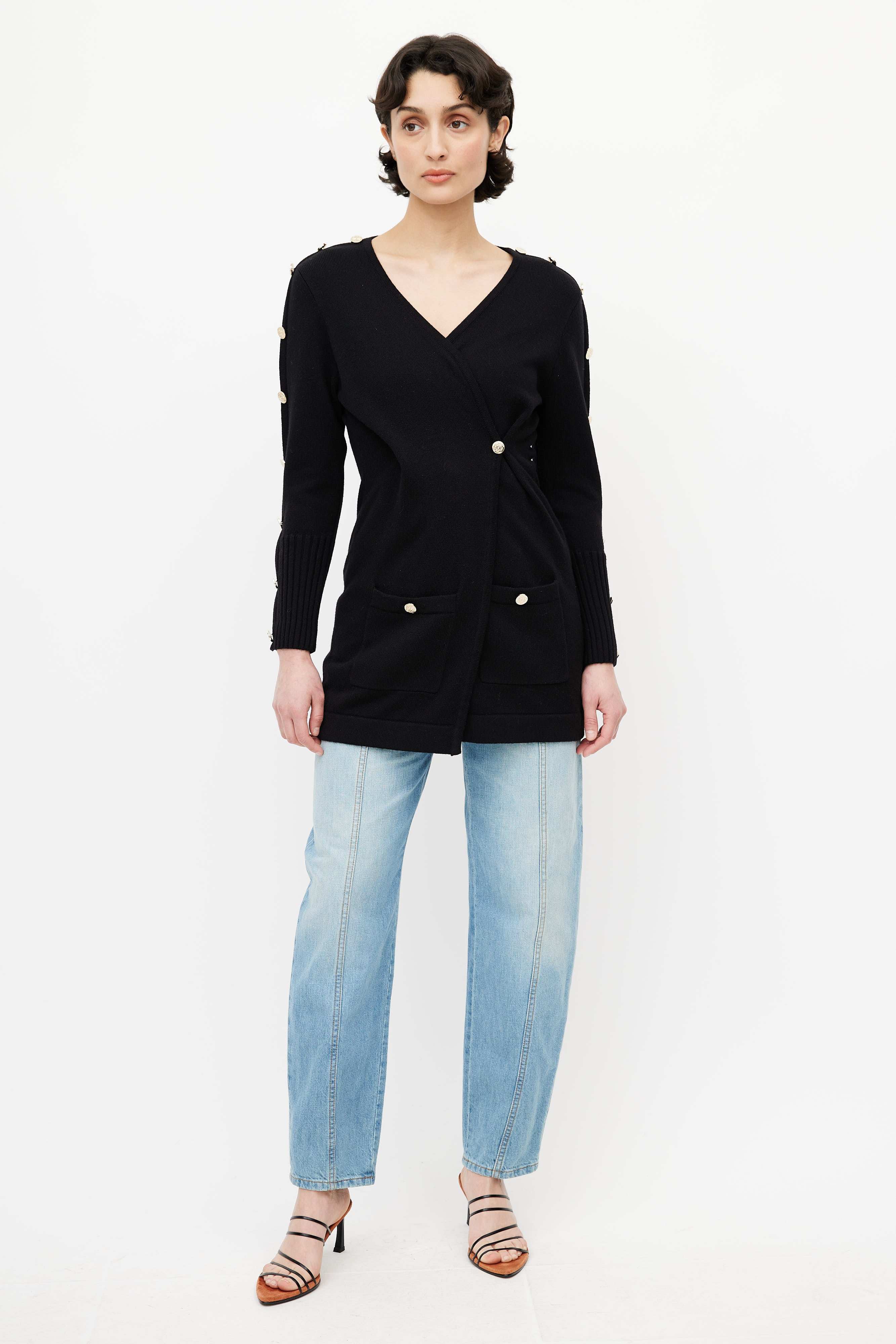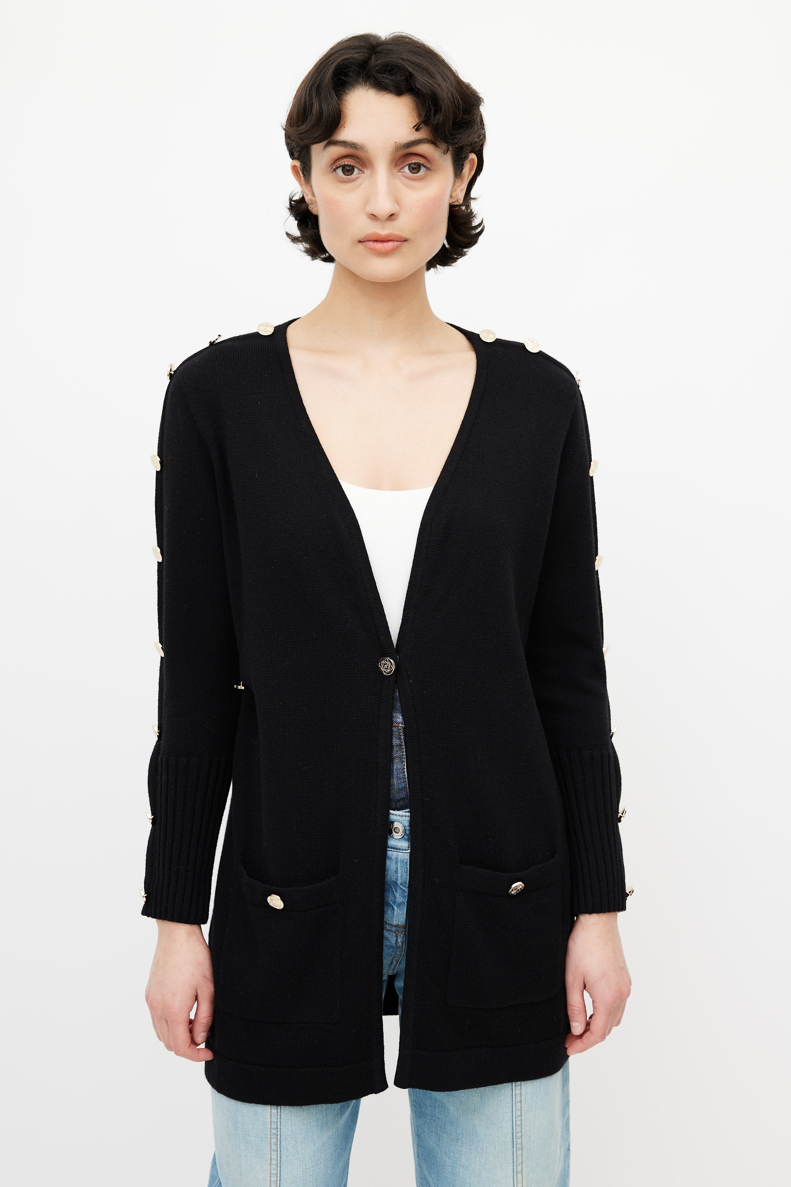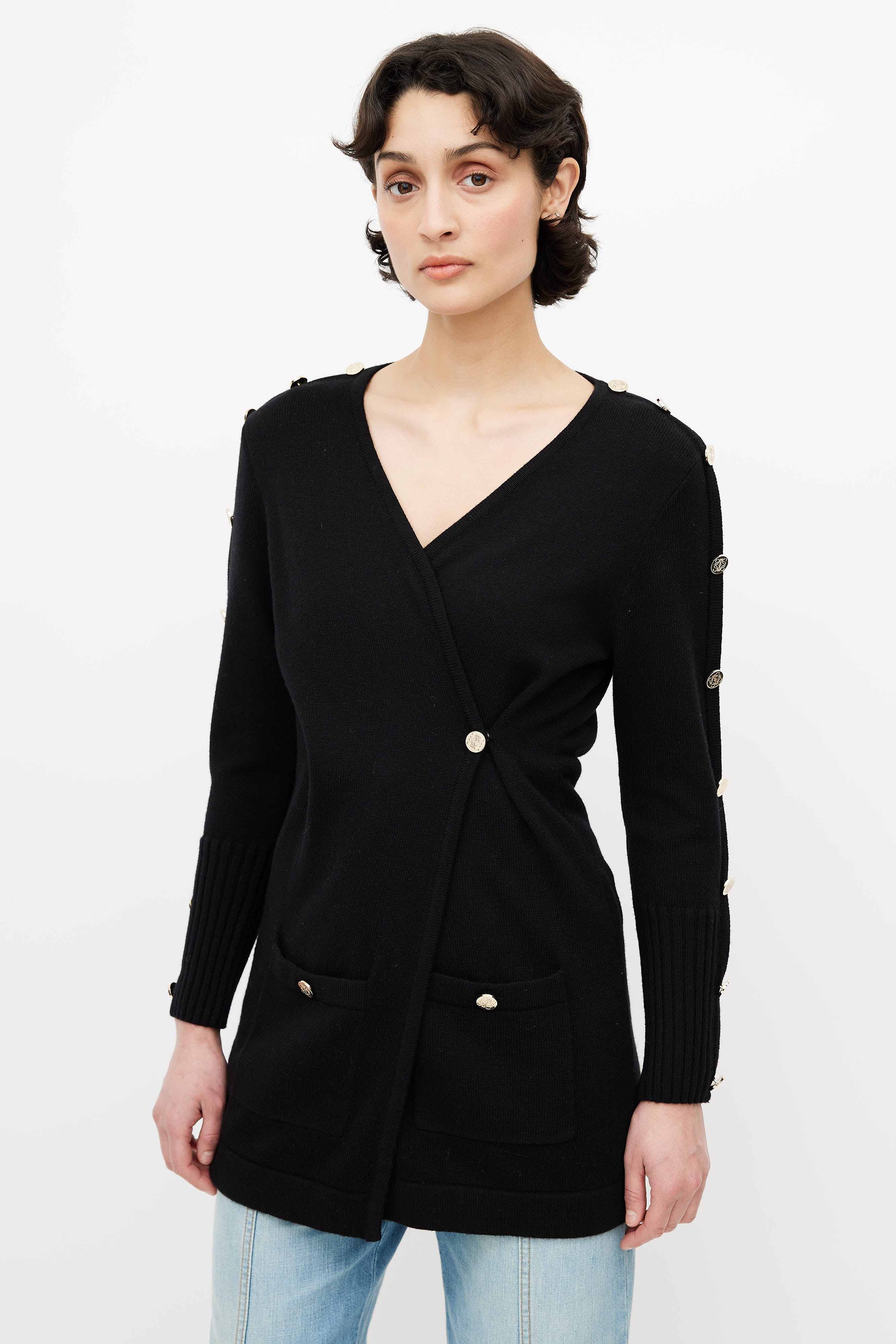 Pre-owned Loewe black cardigan featuring surplice neckline, button fastening, two buttoned pockets at waist, and gold tone engraved buttons at long sleeves.