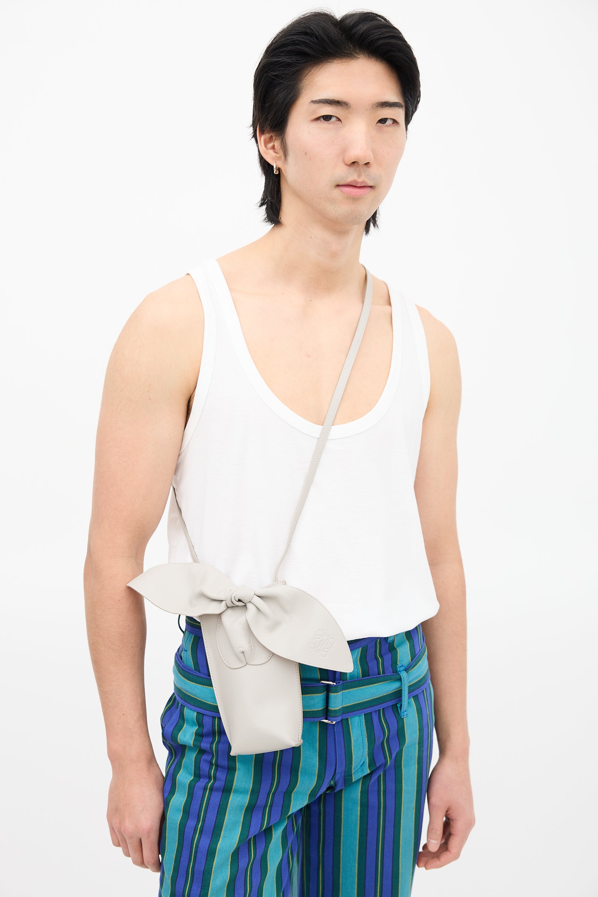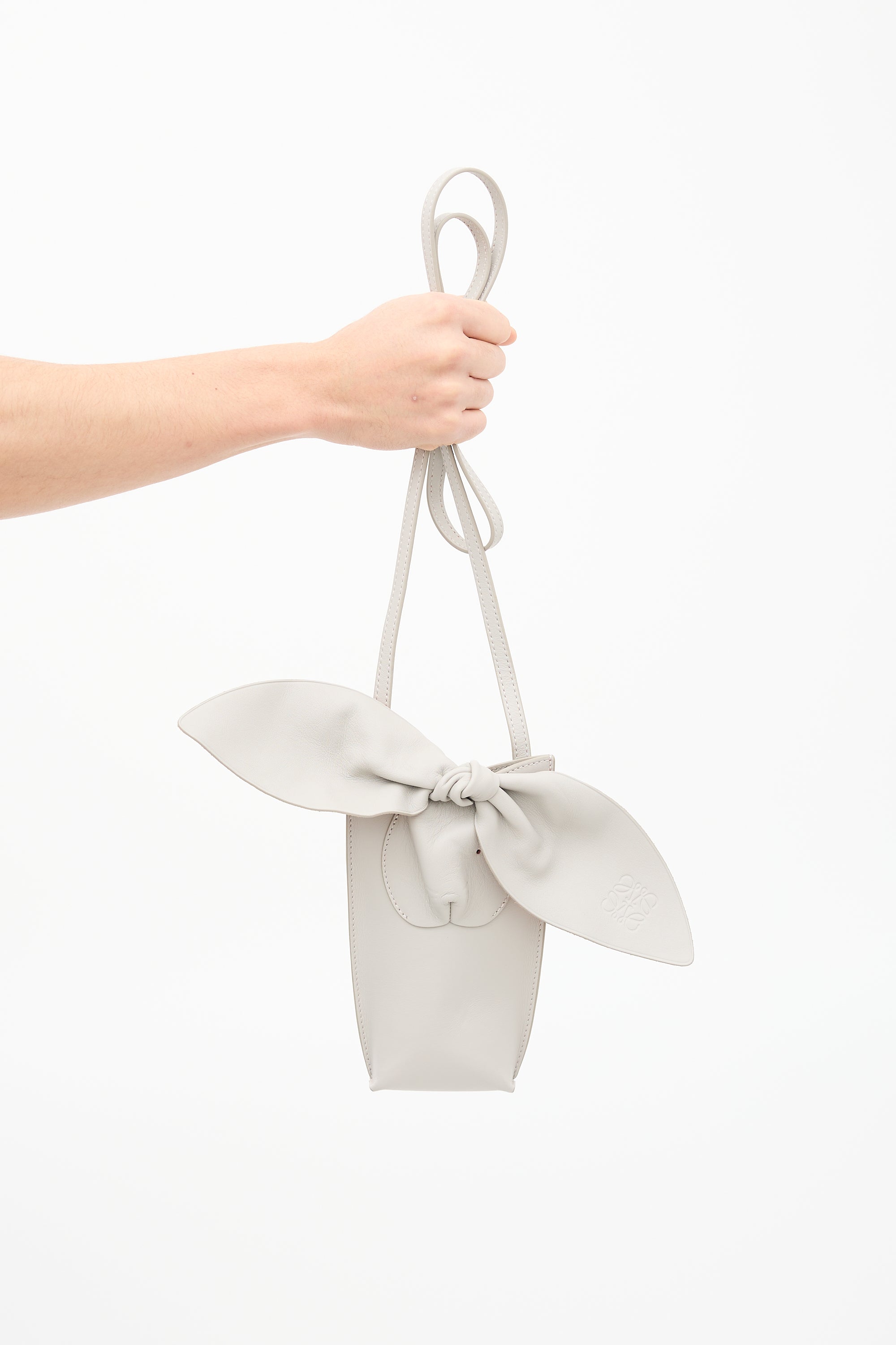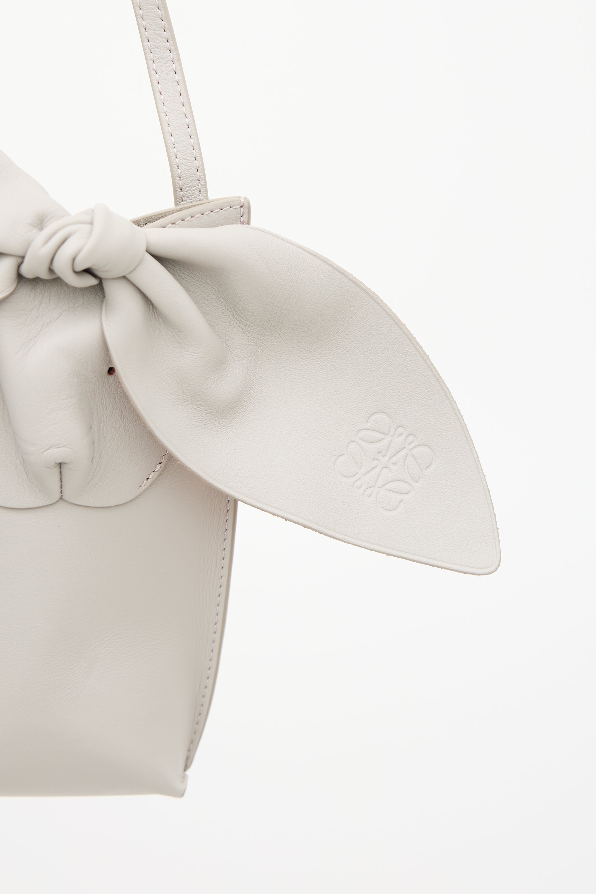 Pre-owned Loewe grey leather Bunny bag featuring knotted bow with debossed logo, snap buttoned strap closure, slip pocket at back, one lined main compartment, and one attached crossbody strap. Comes with original dust bag.