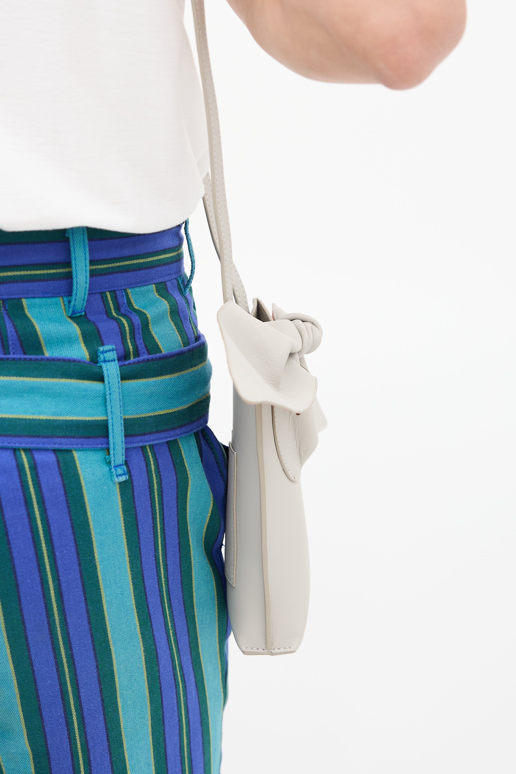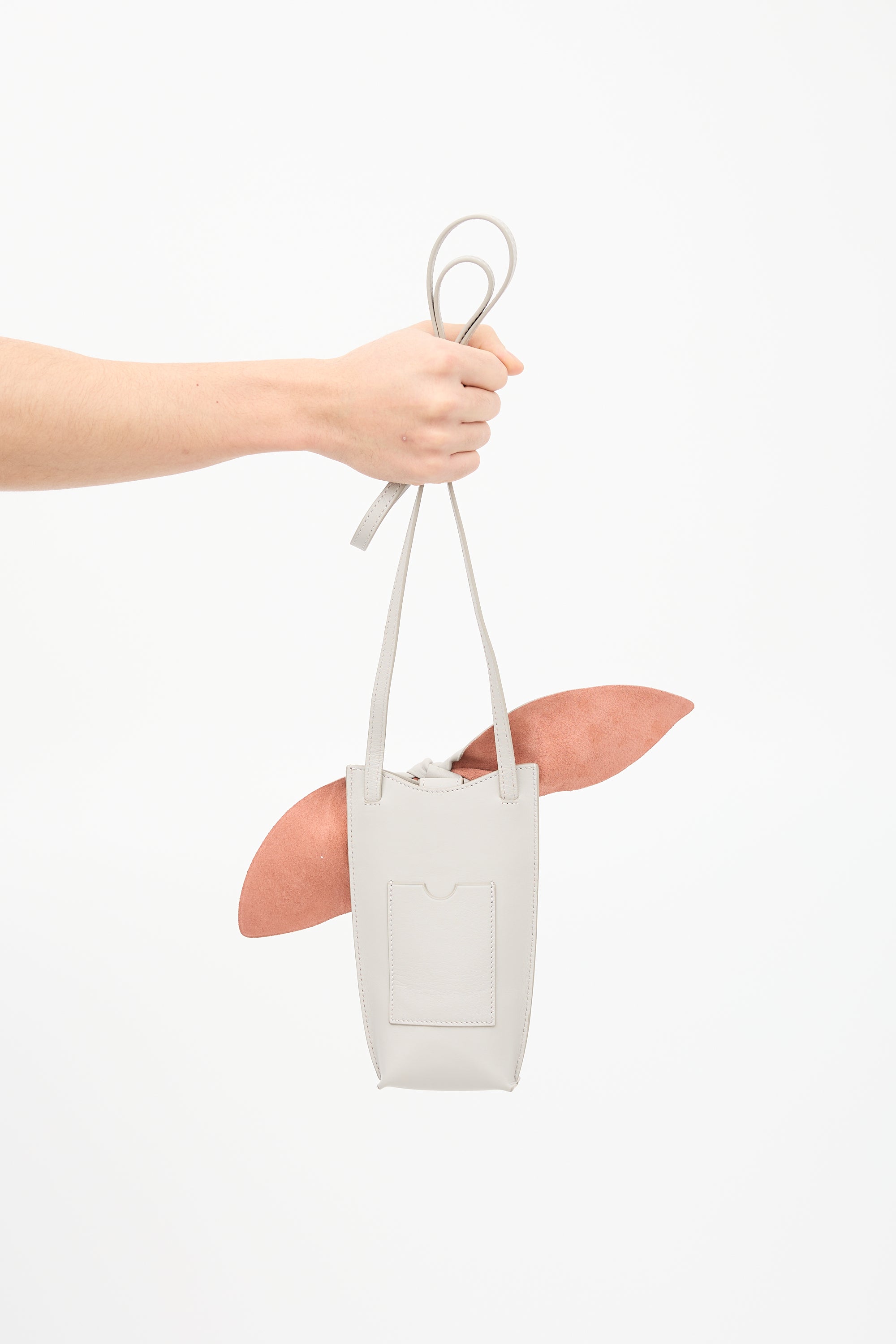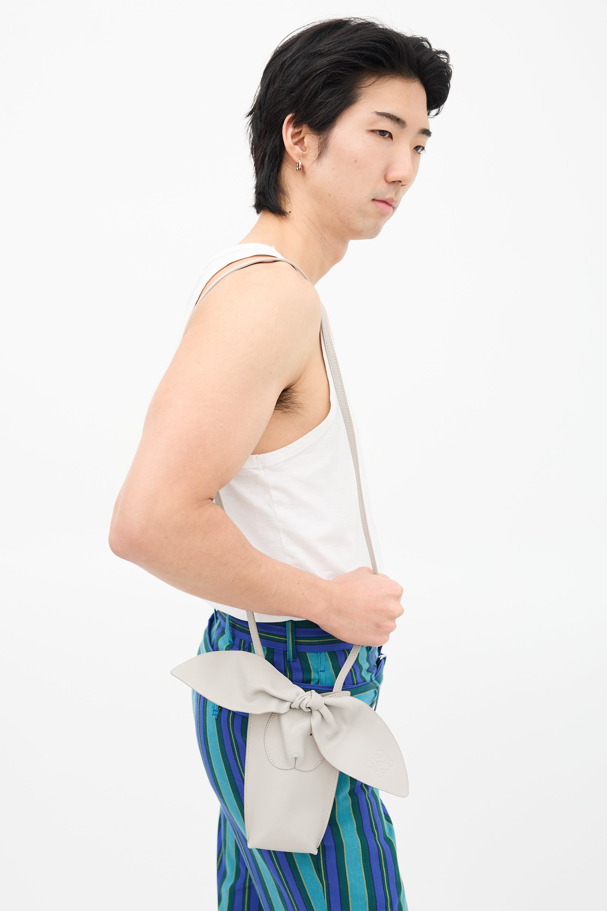 Pre-owned Loewe grey leather Bunny bag featuring knotted bow with debossed logo, snap buttoned strap closure, slip pocket at back, one lined main compartment, and one attached crossbody strap. Comes with original dust bag.