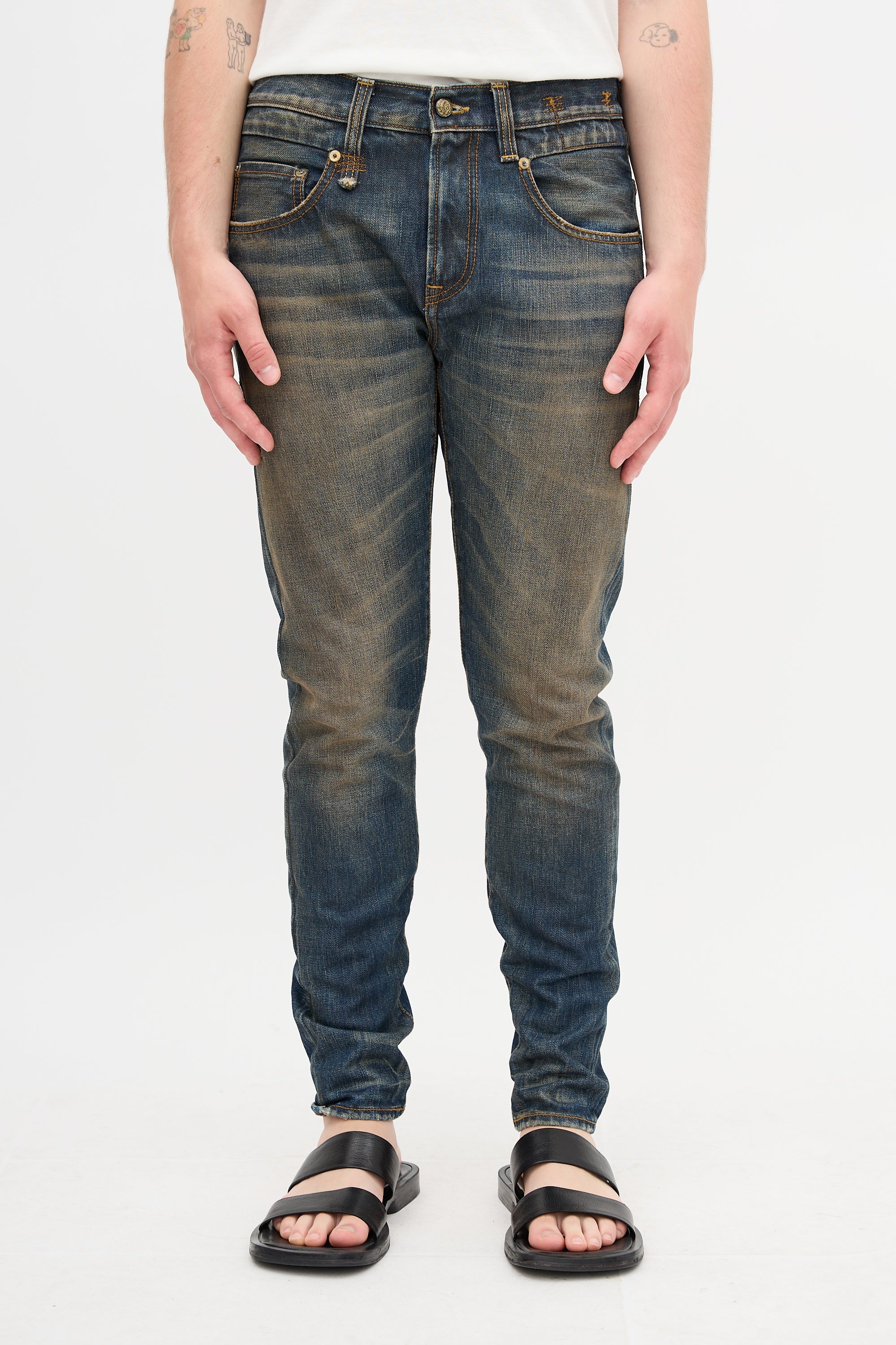 Pre-owned R13 mud wash distressed Boy jeans featuring mid rise, sashiko stitching, tapered leg,five pocket styling, black leather Jacron patch, and zip fly.