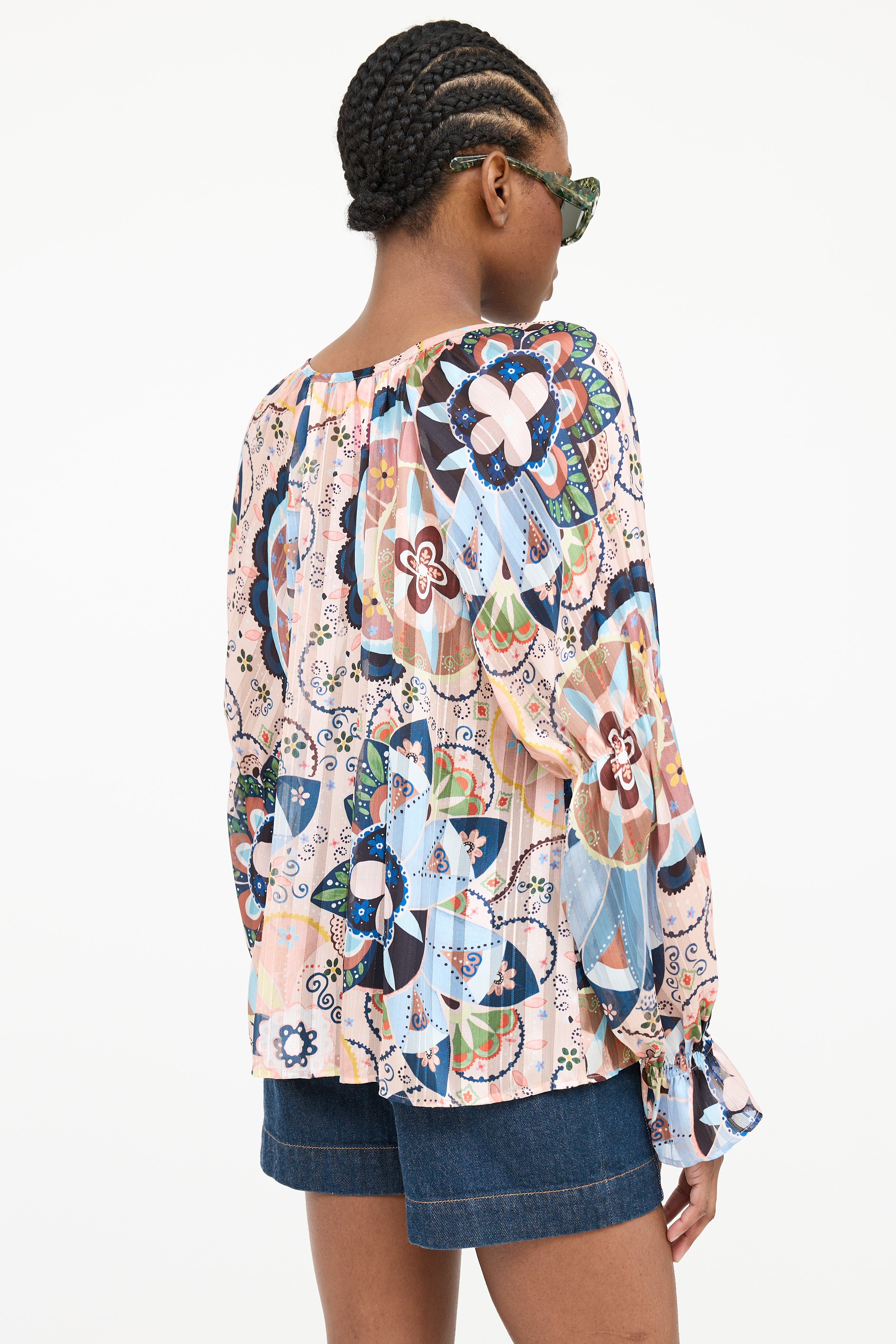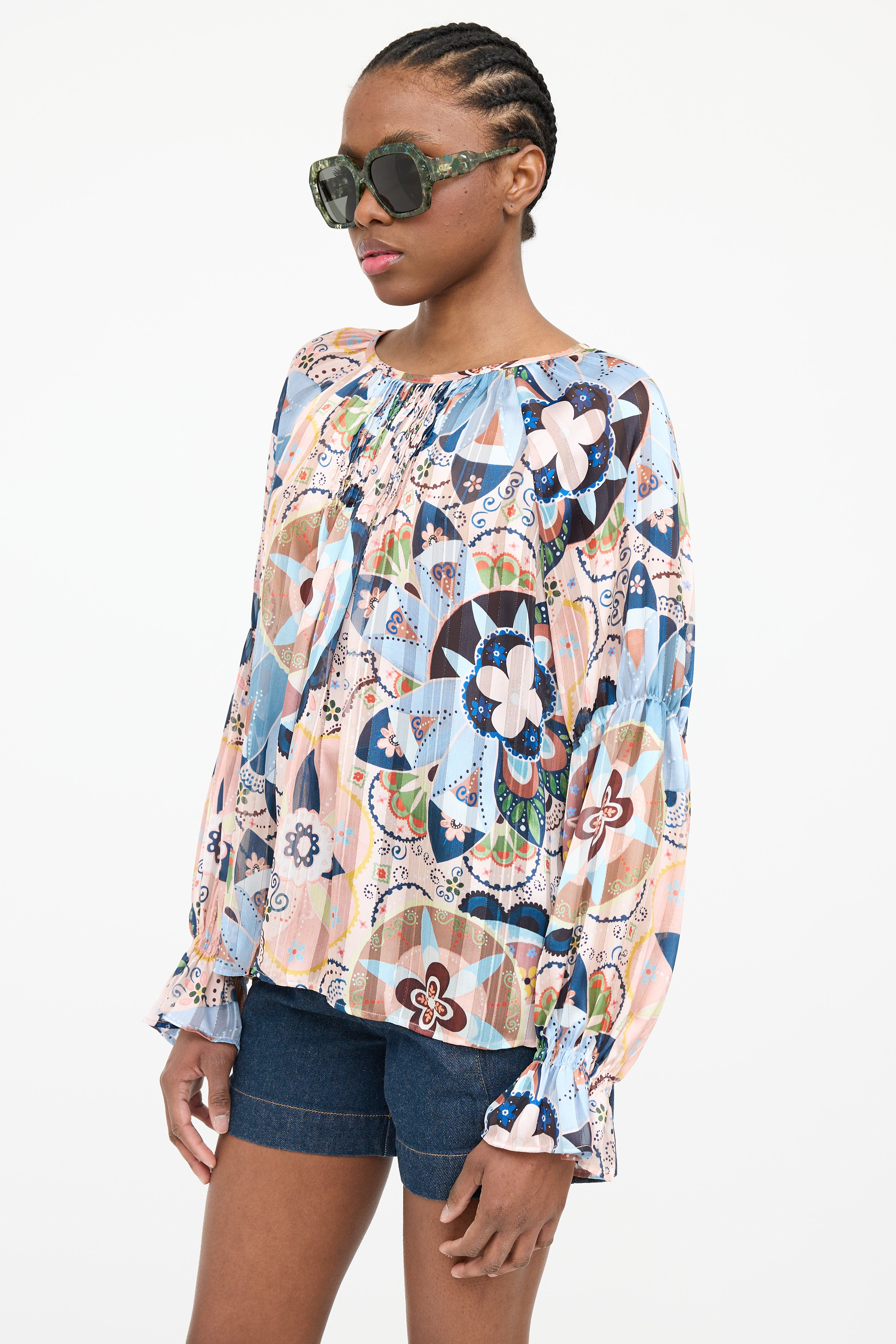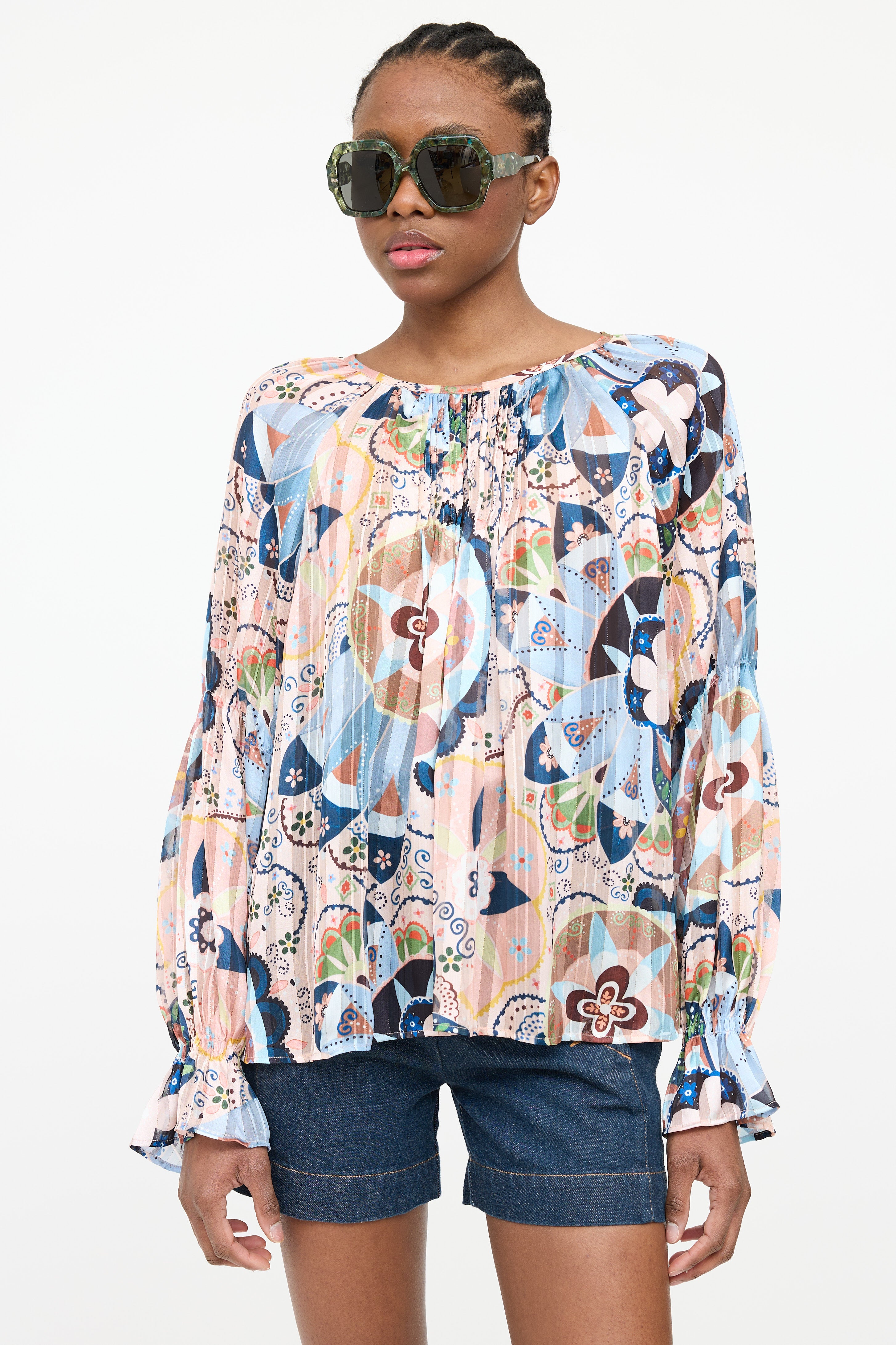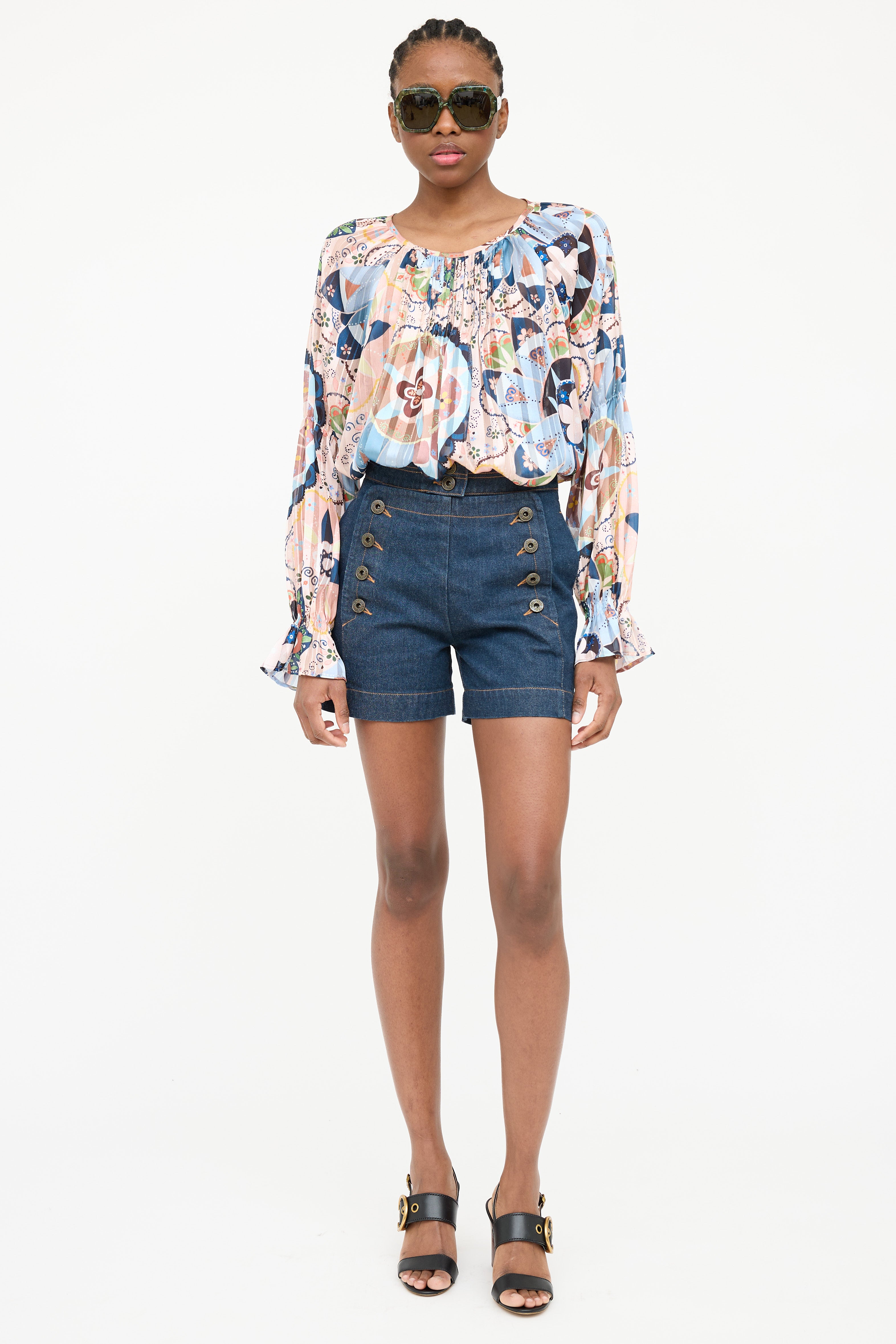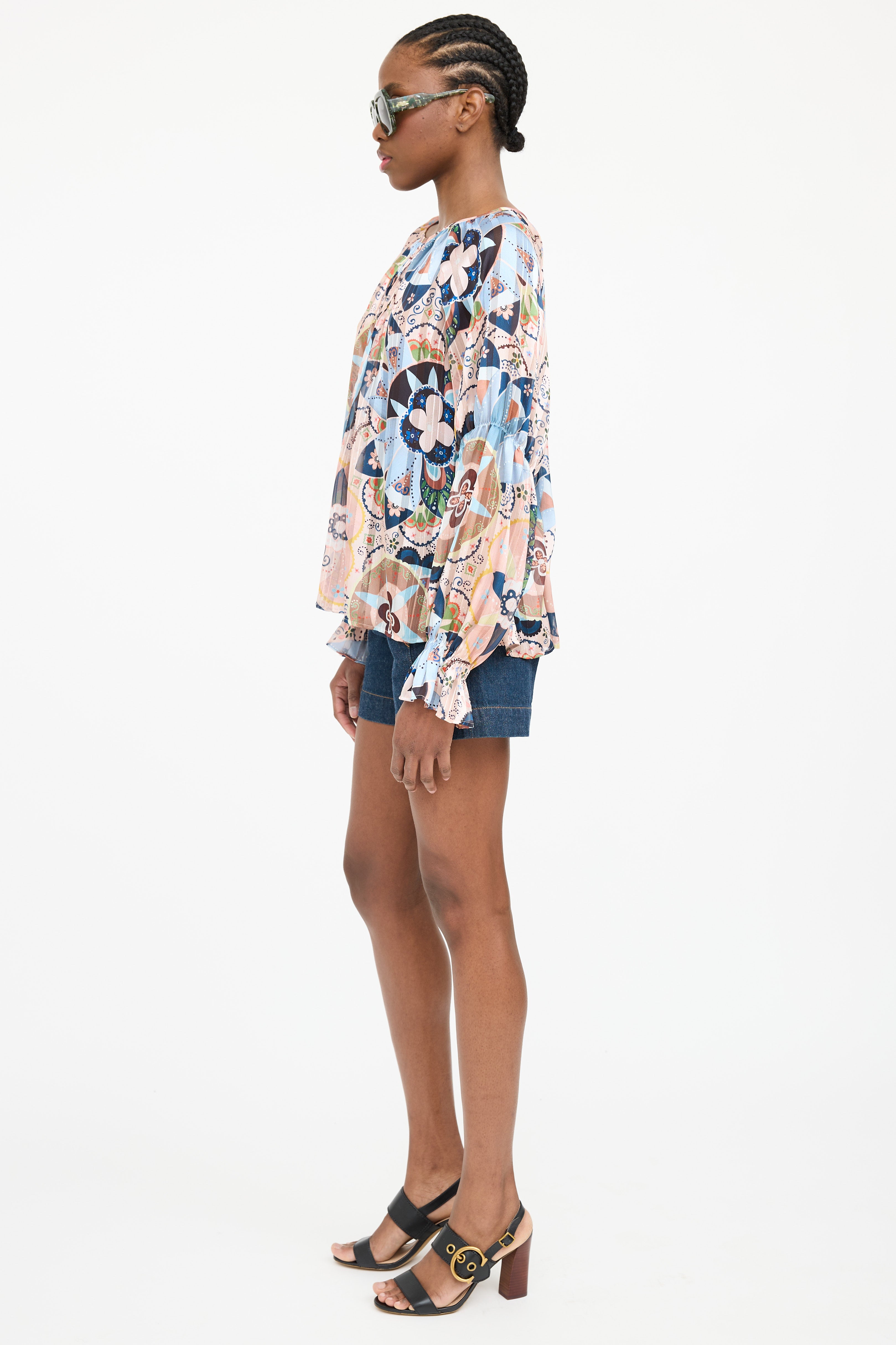 Pre-owned See By Chloé blue and multicolour long sleeve blouse featuring round neck, floral graphic print, shimmer finish, pleating and cinched elastic cuff.