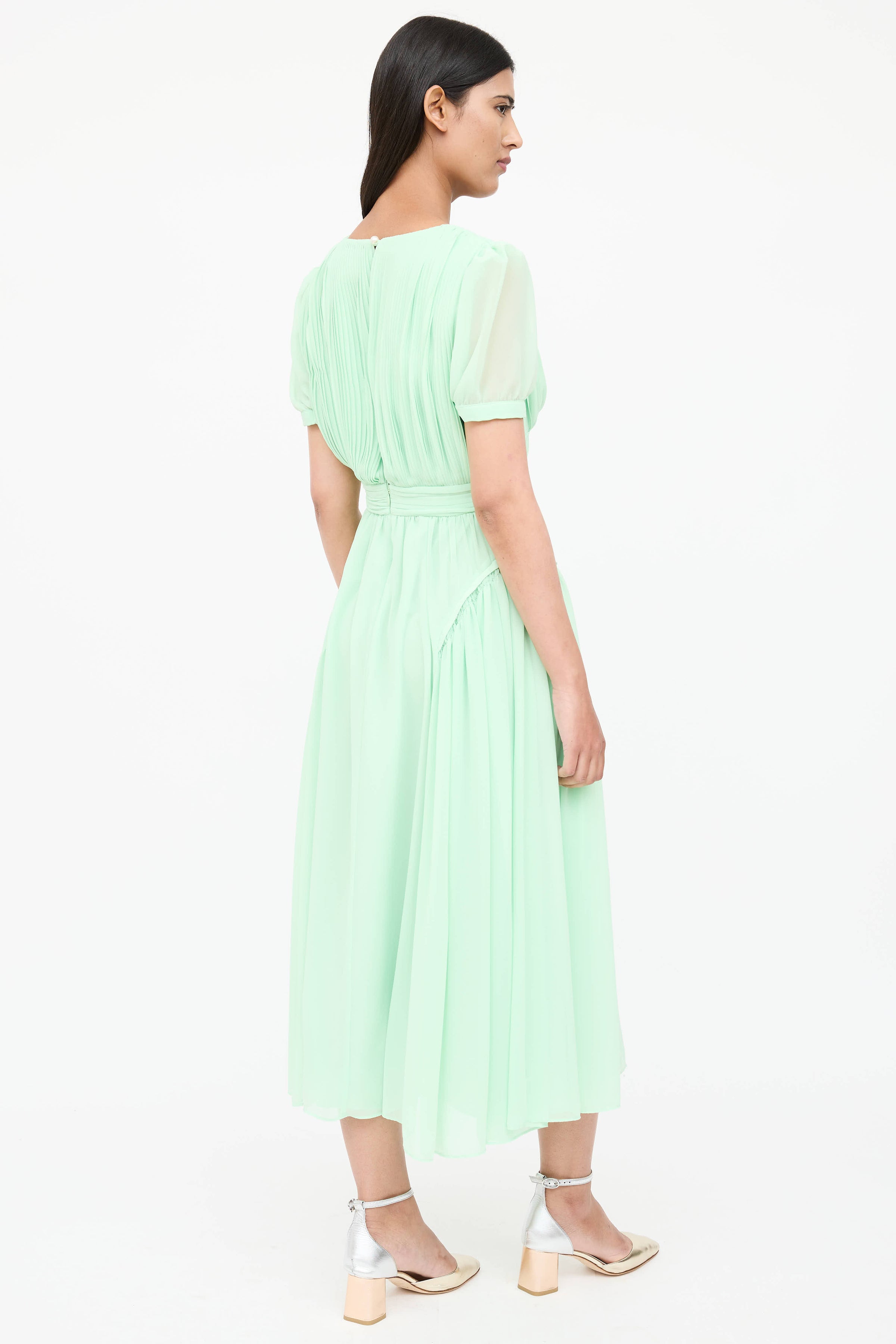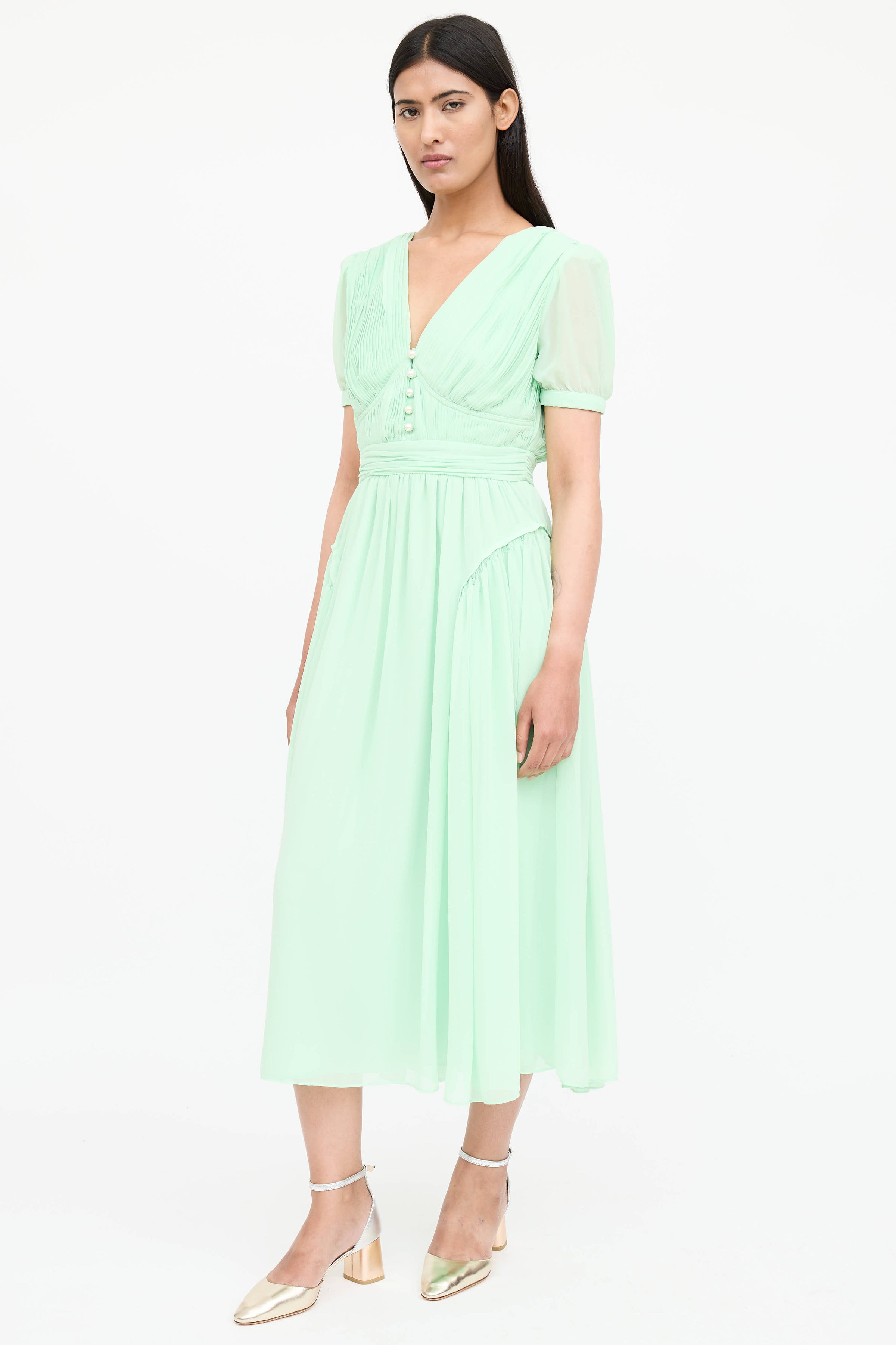 Pre-owned Self-Portrait green short sleeve dress featuring v-neckline, pleated bodice, pearl button up front, shirred at cuffs and at skirt, and concealed zip at back with pearl button closure. Lined.