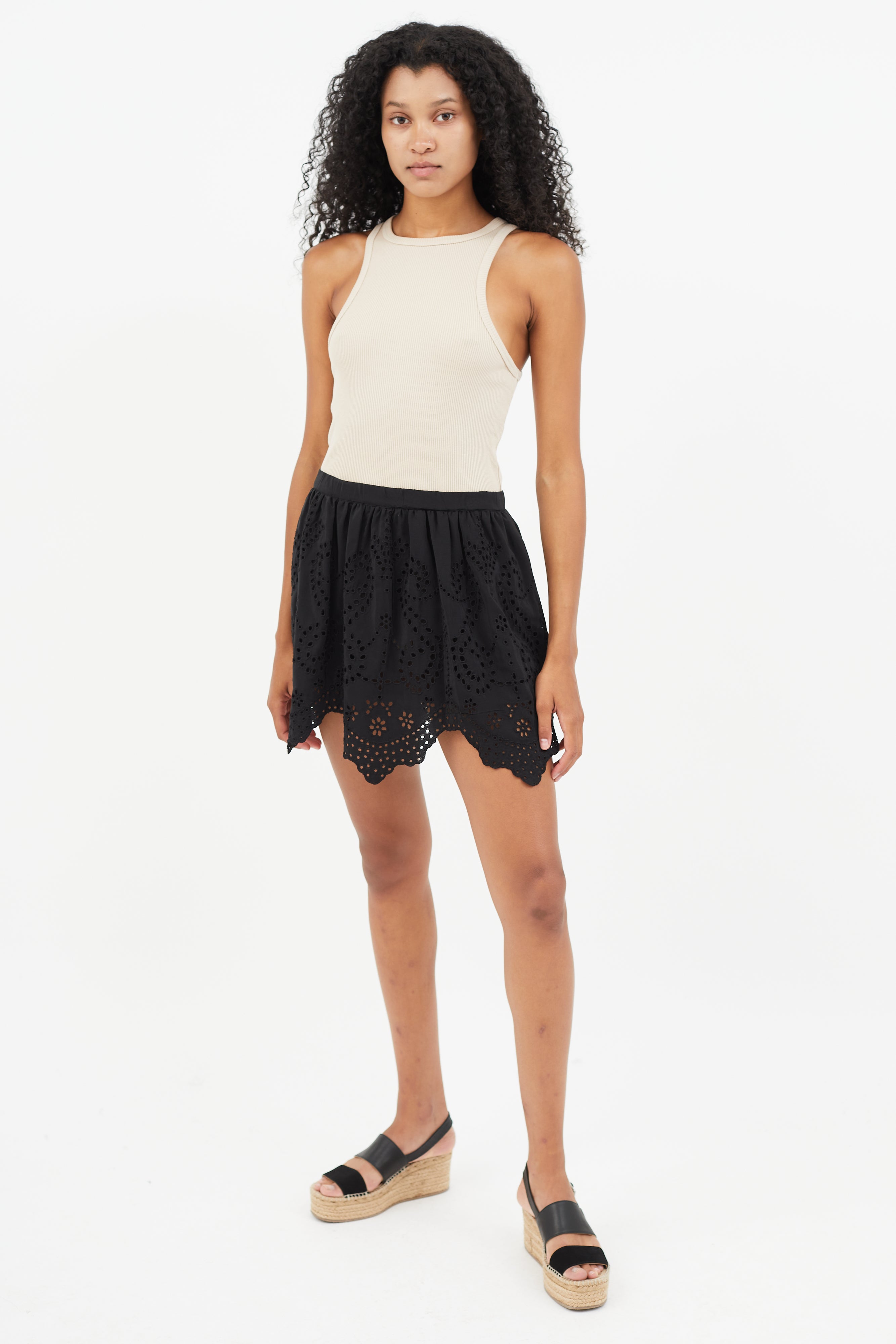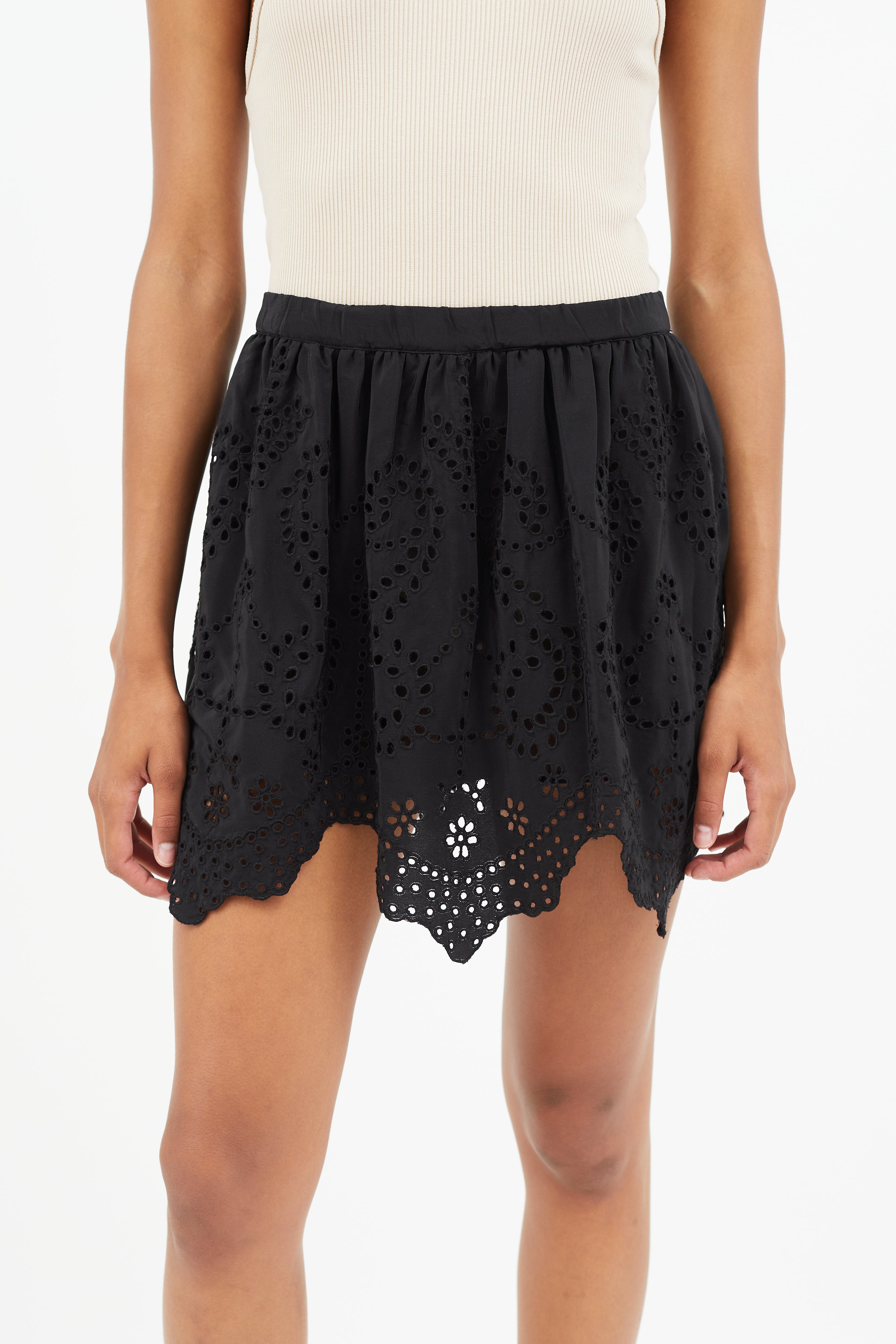 Pre-owned Ulla Johnson black skirt featuring eyelet detailing, elasticized waist, crochet scalloped hem, and pleating throughout. Lined.