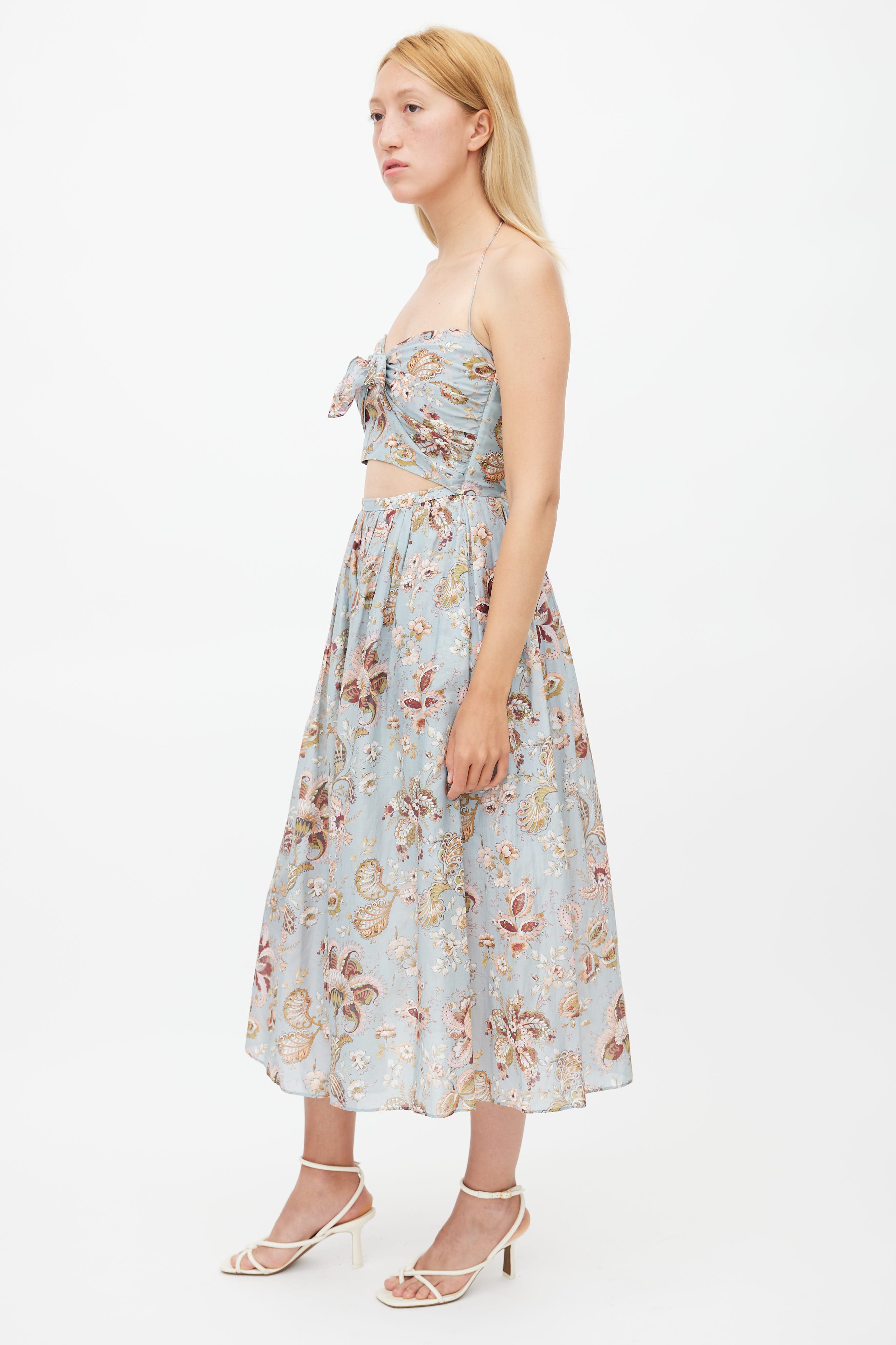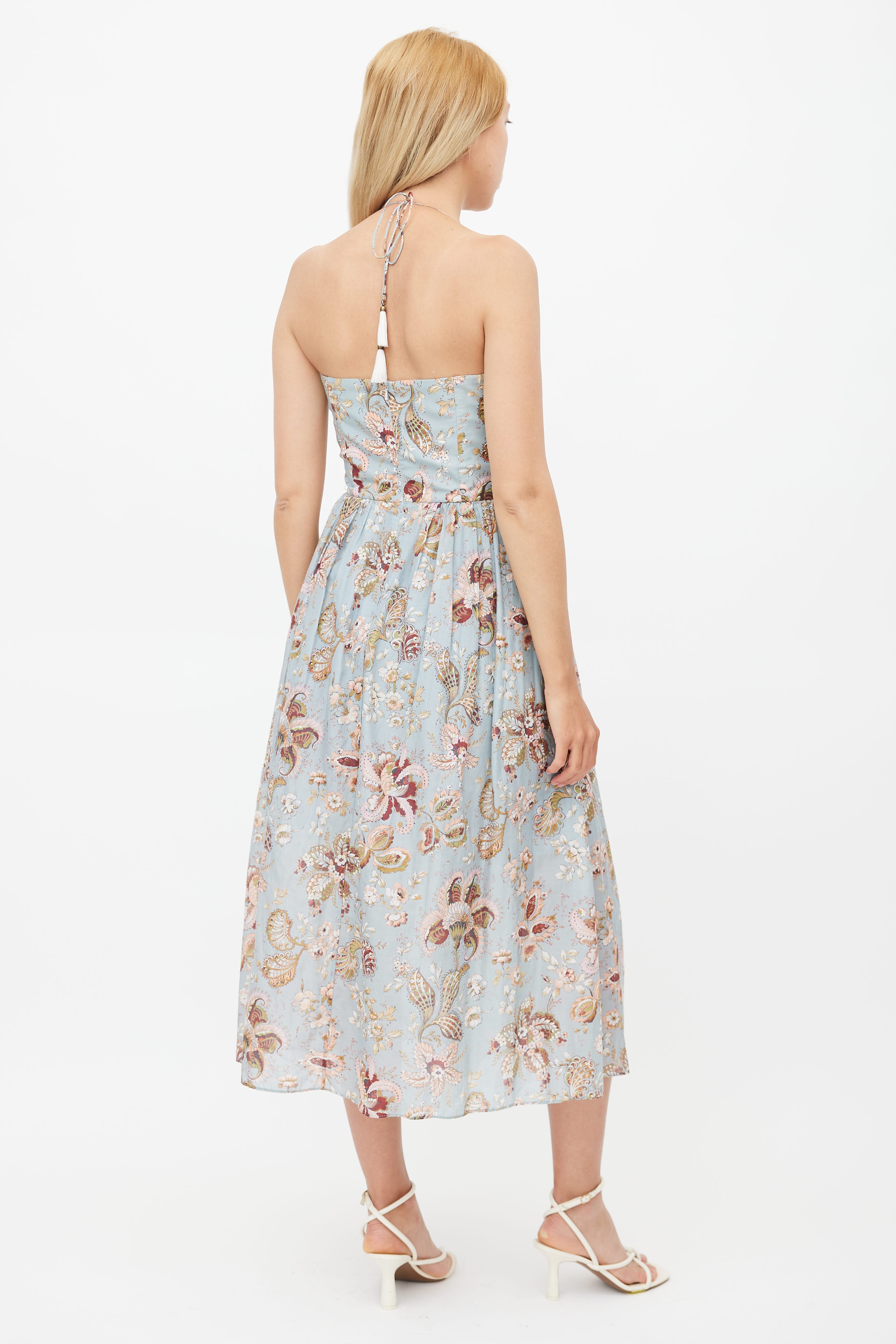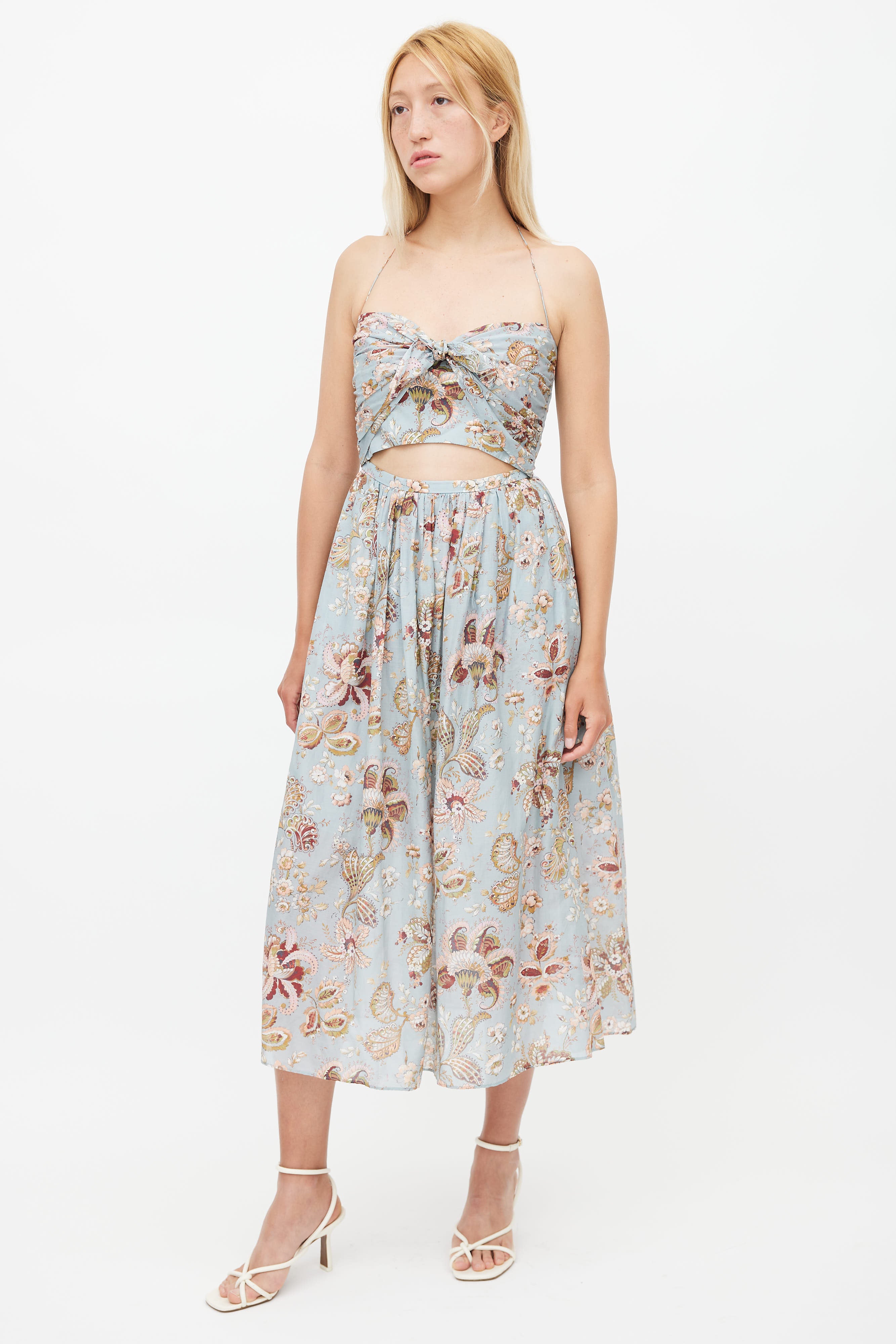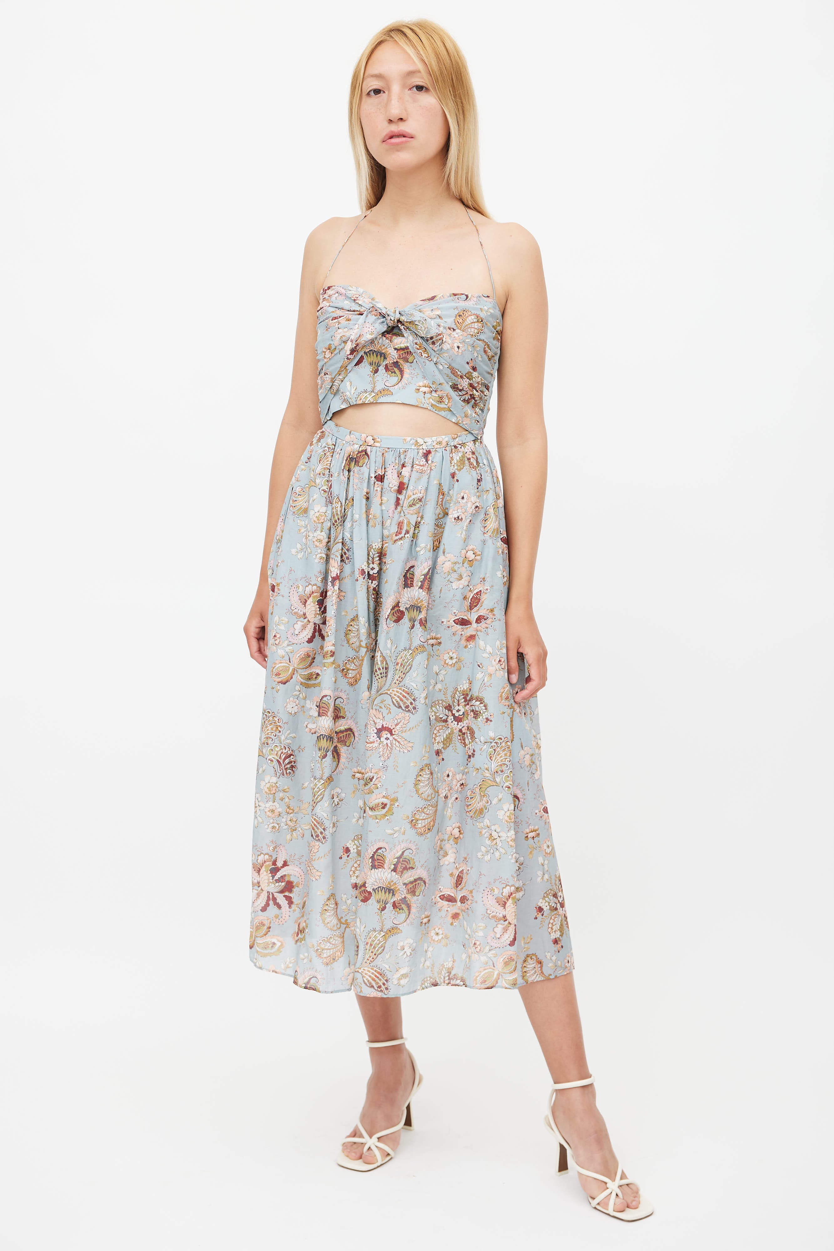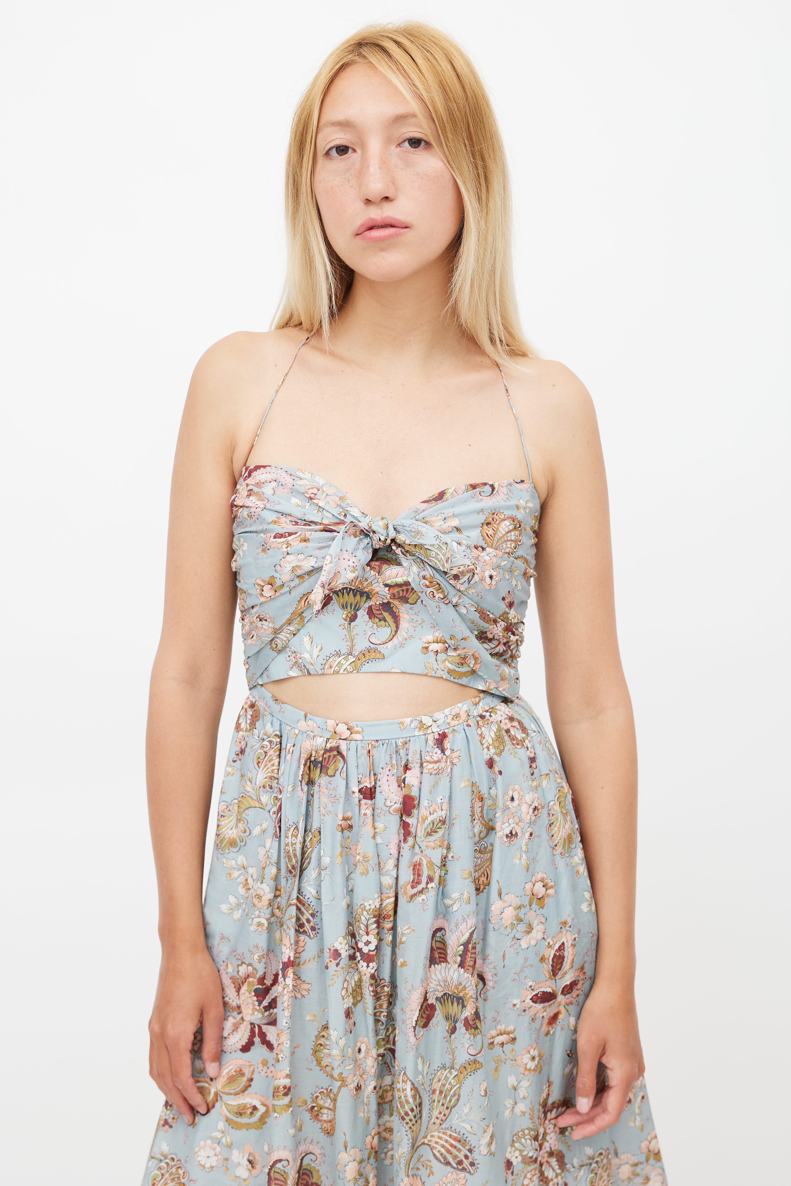 Pre-owned Zimmermann blue dress featuring multicolour floral print, concealed zip closure at back, strapless bodice with knot at front, shoulder tie straps with tassel ends, cutout at waist, and two hip pockets. Lined.