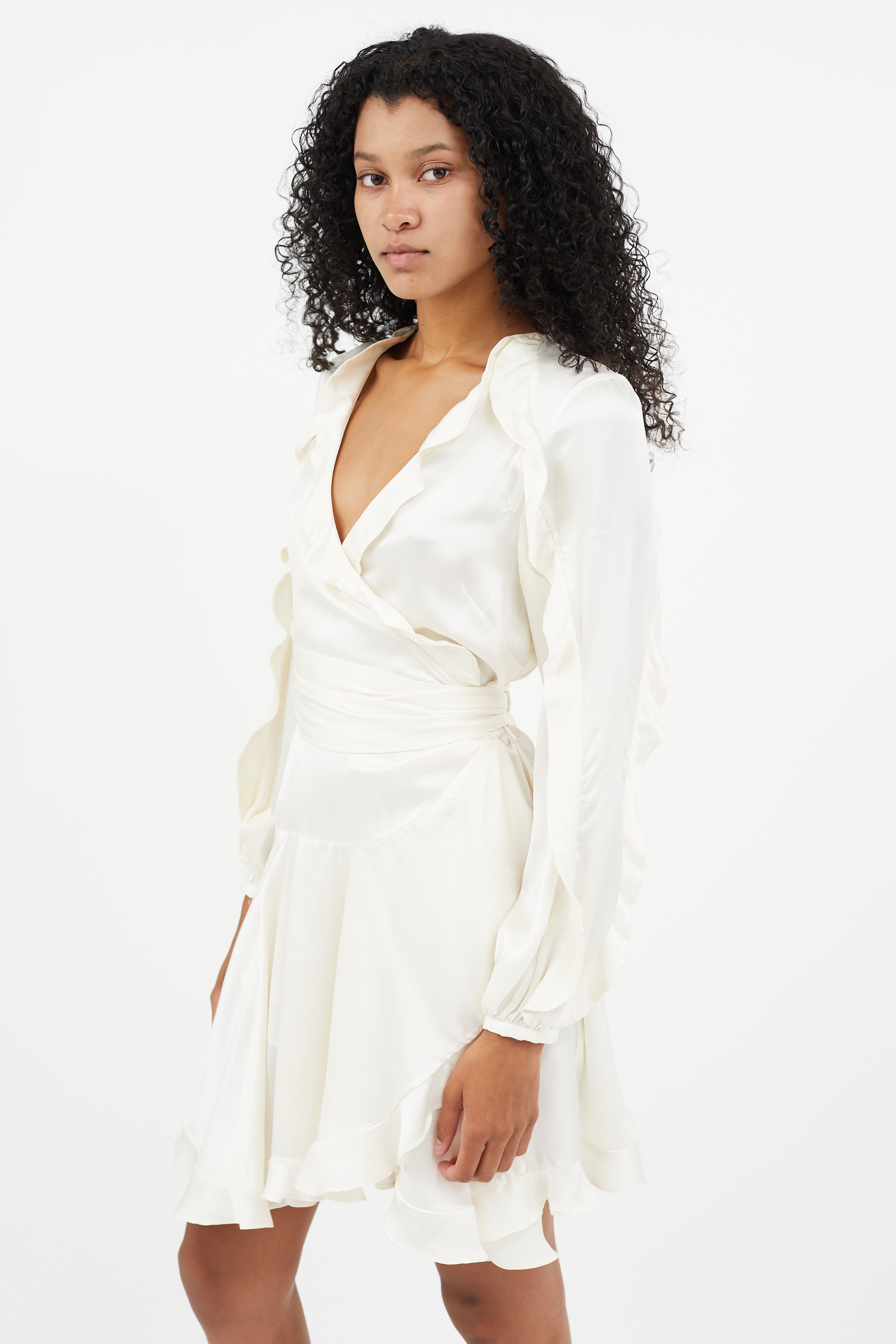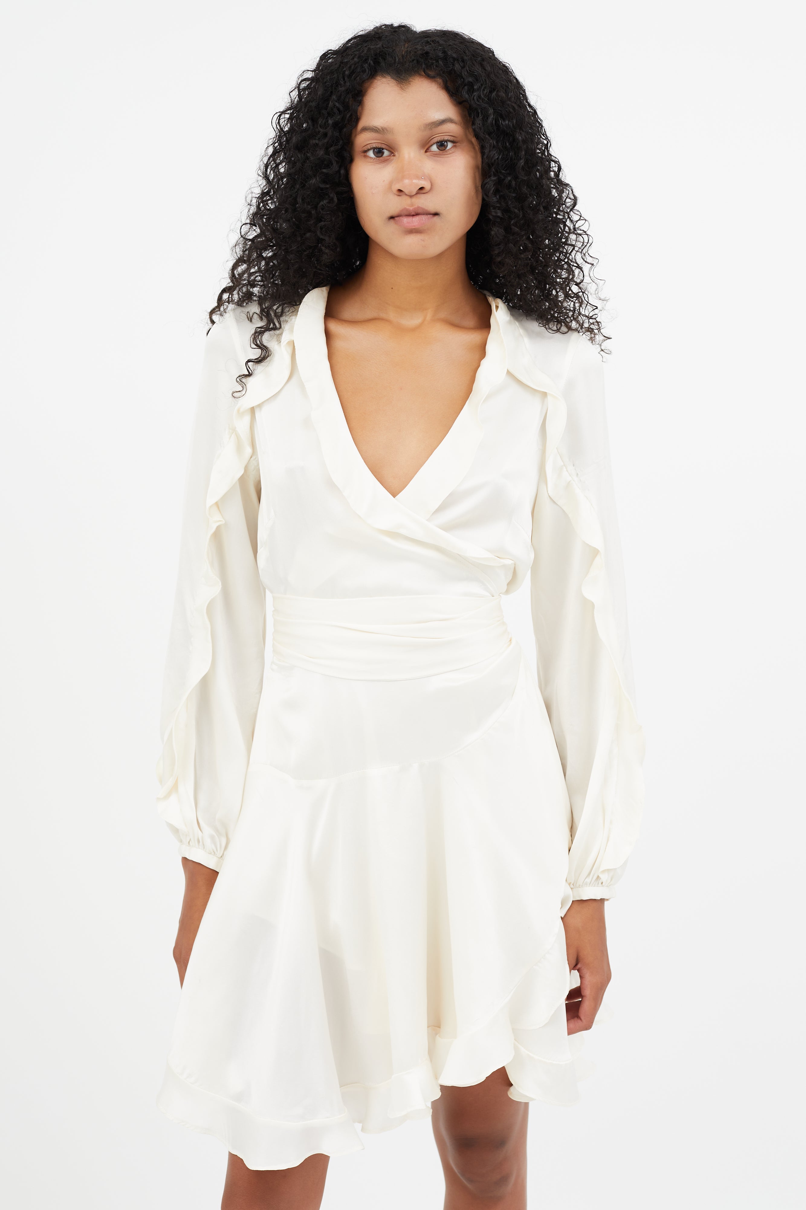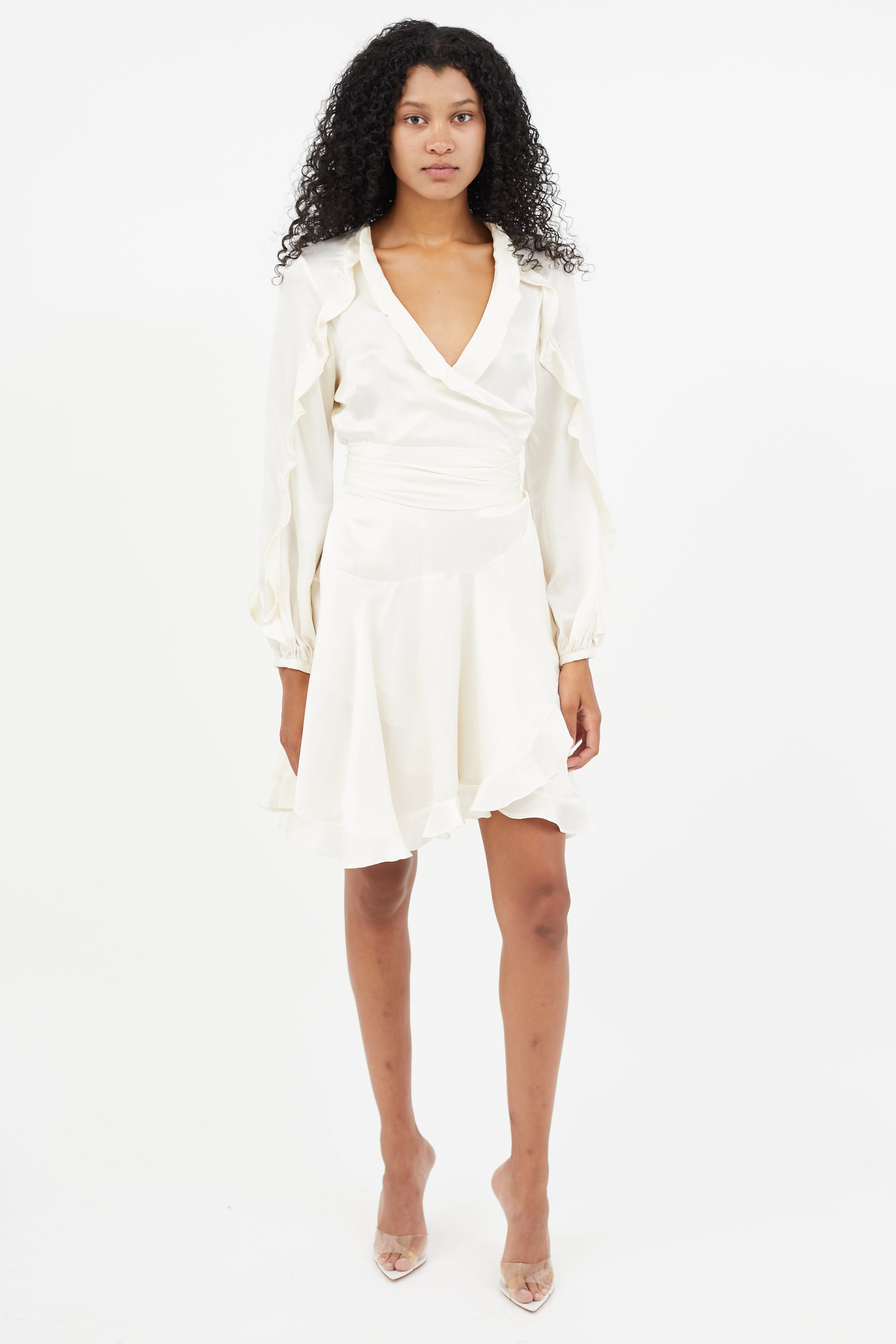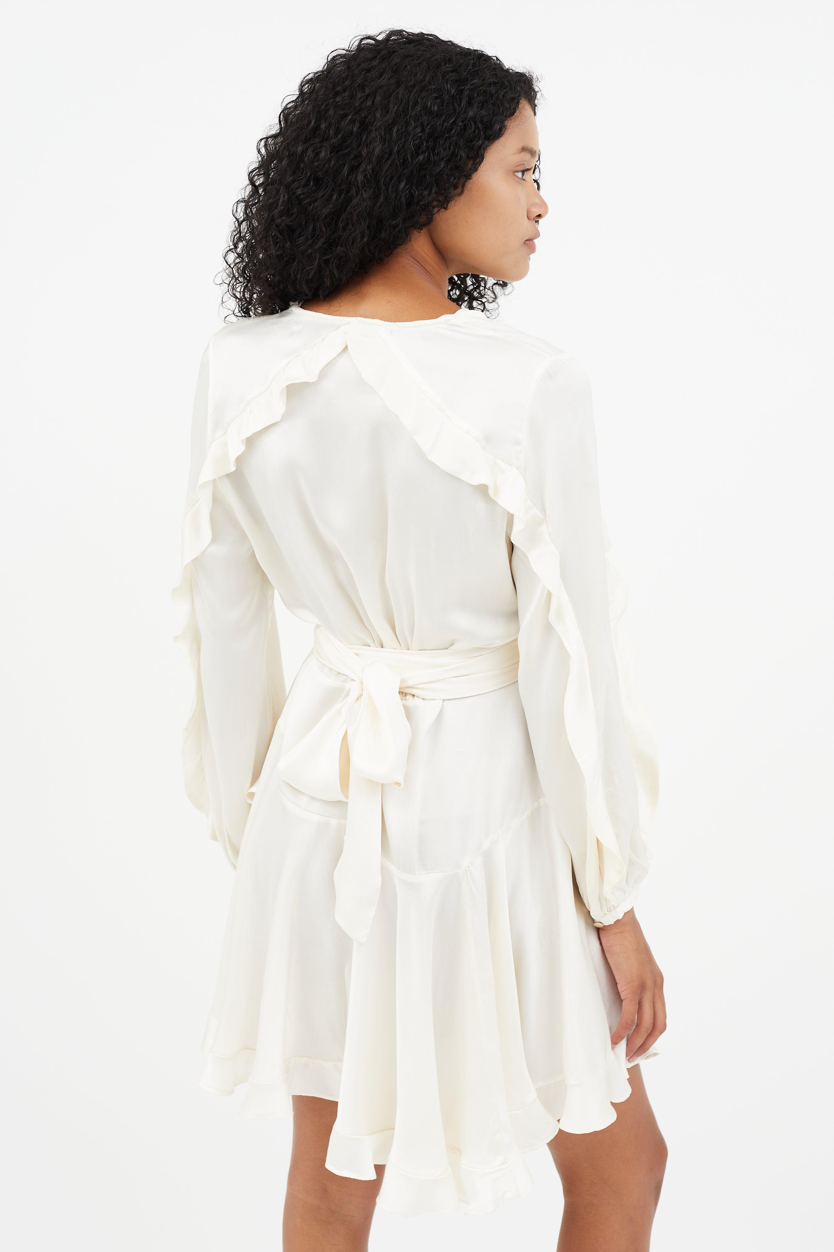 Pre-owned Zimmermann cream silk dress featuring V-neckline, long sleeves with ruffle detail and gold tone buttons, tie wrap at waist, and ruffled hem.