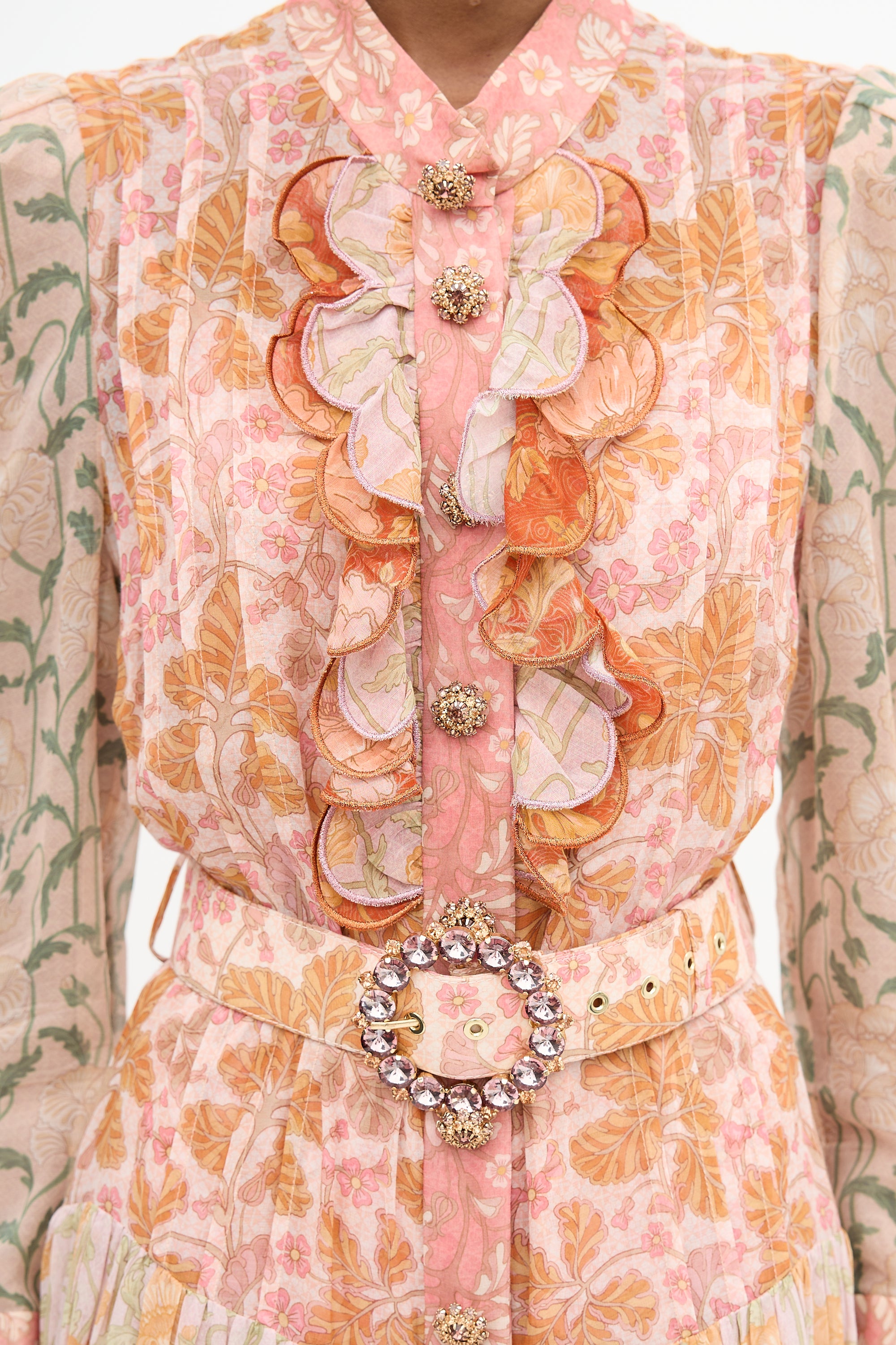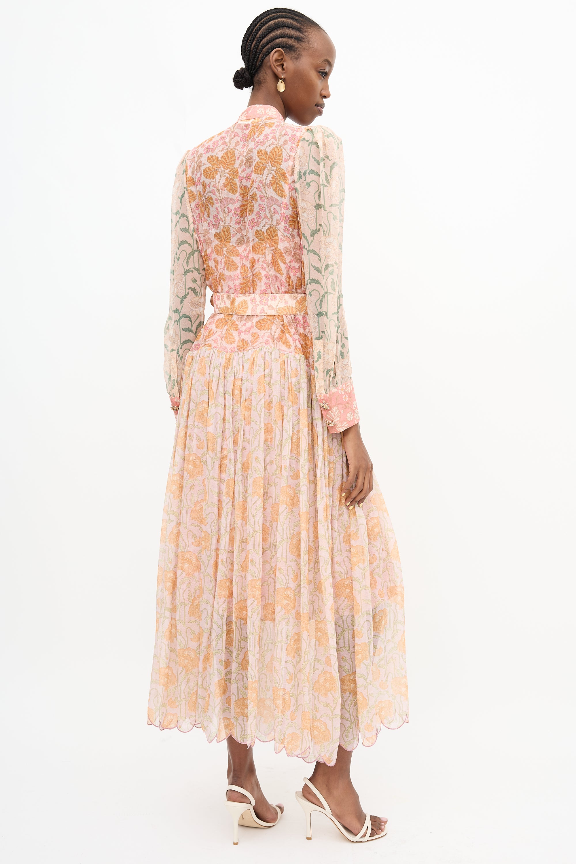 Pre-owned Zimmermann pink silk blend dress featuring a floral colourblock print, stand collar, ruffled and pleated front, gem buttons at front and cuffs, matching buckle belt, and scalloped hem. Includes matching slip.