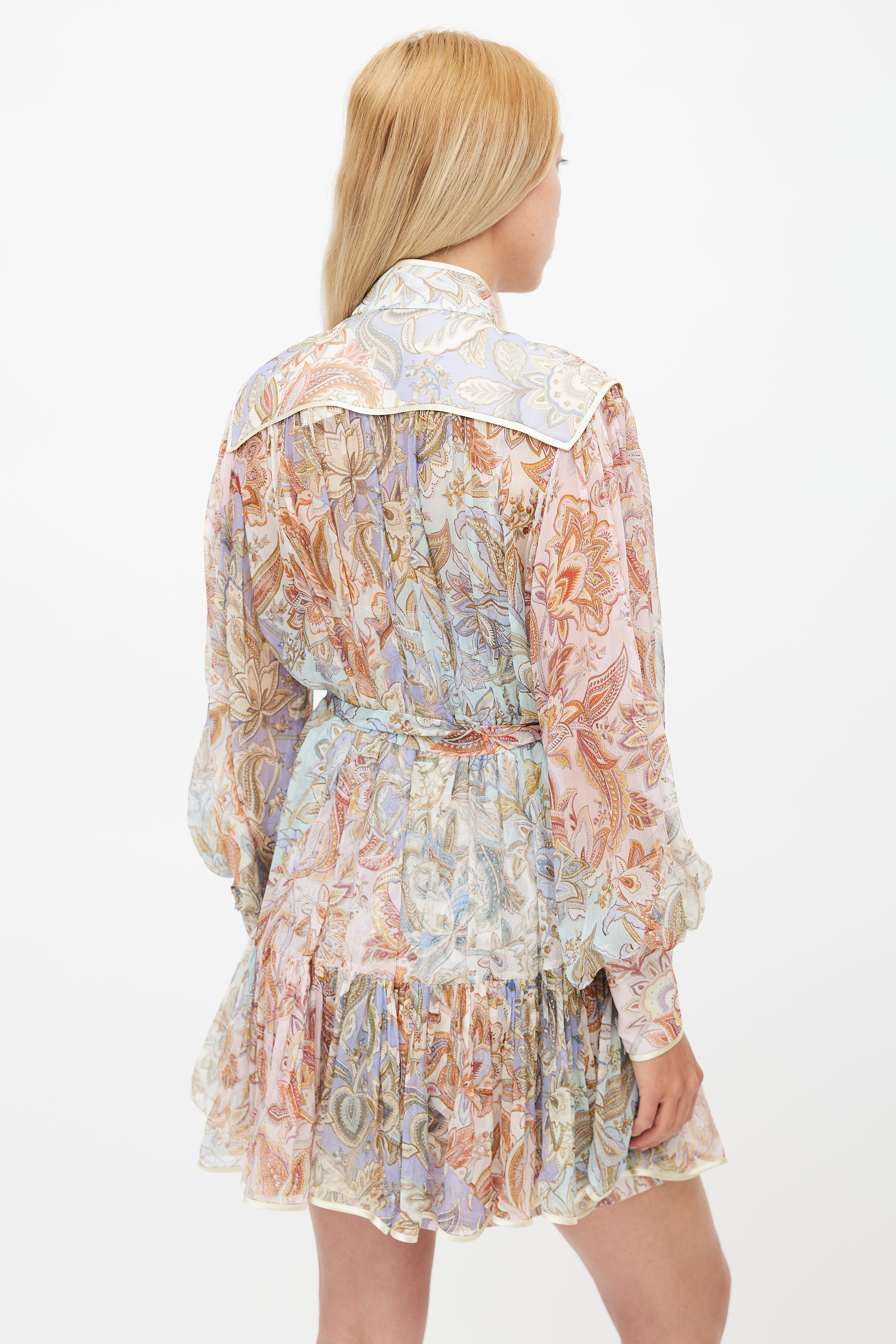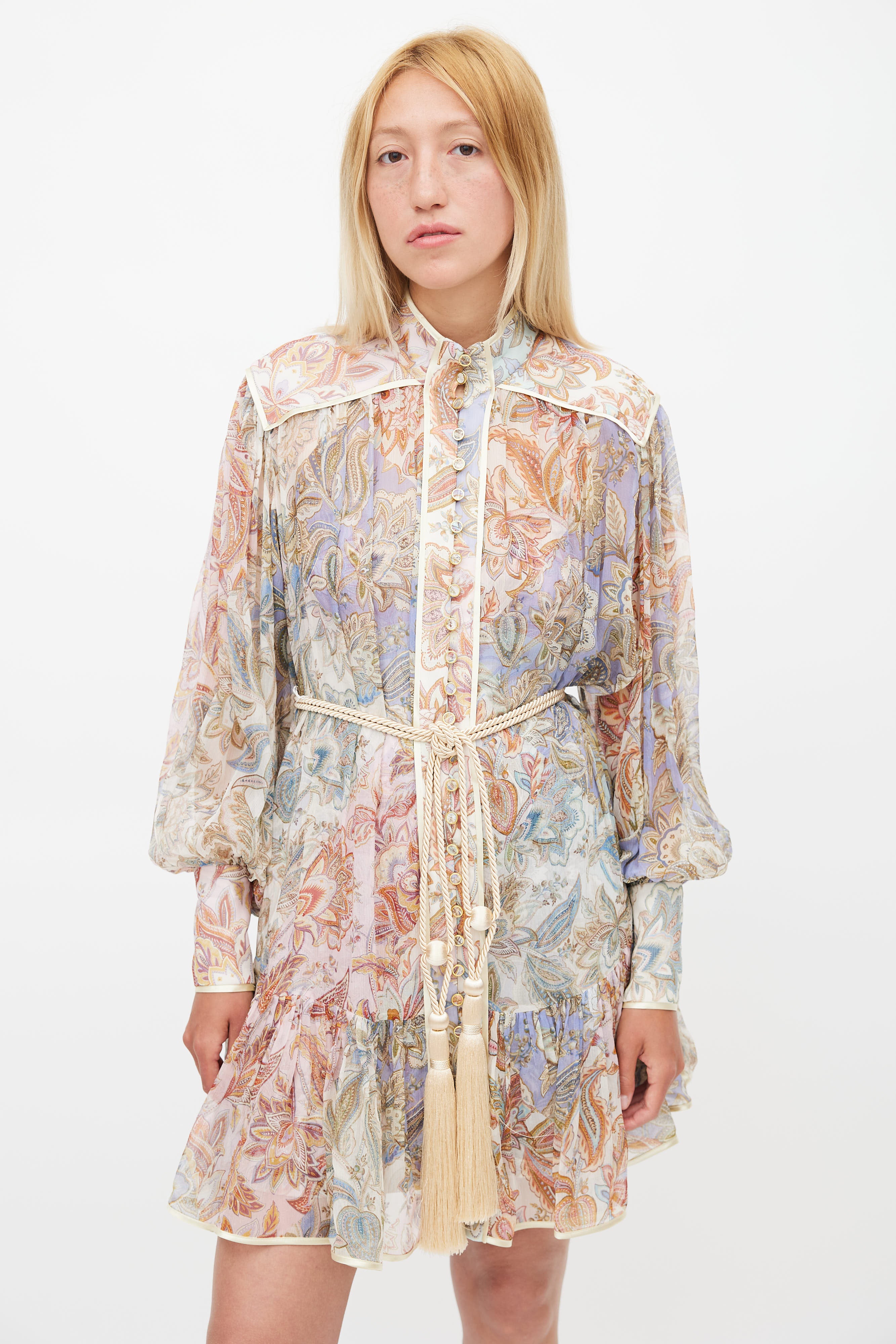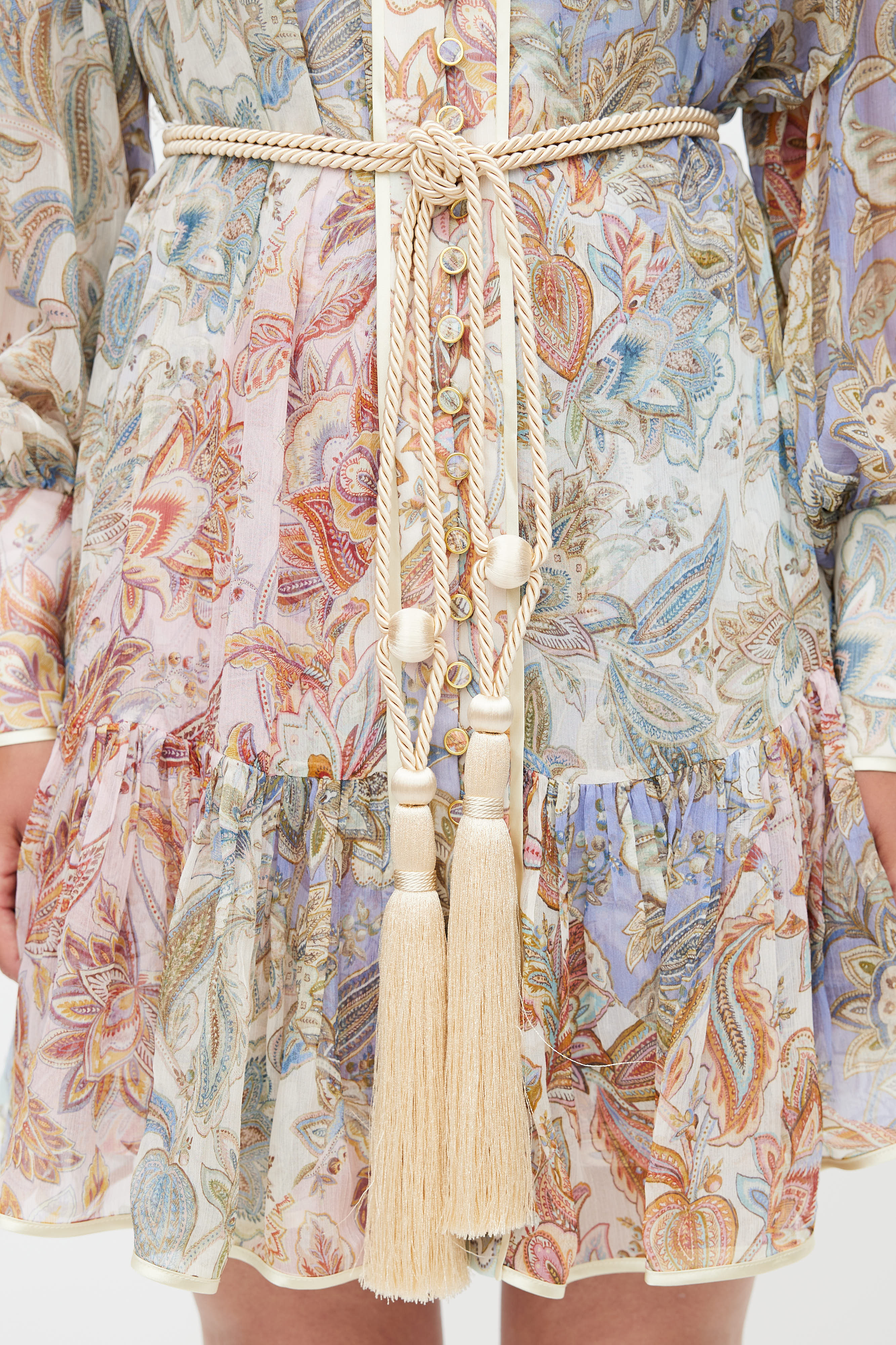 Pre-owned Zimmermann multicolour Lucky Bound dress featuring patchwork paisley print, button up front, bishop sleeves with zippered cuffs, gold satin trim, and tassel belt. Comes with slip dress and tie belt.