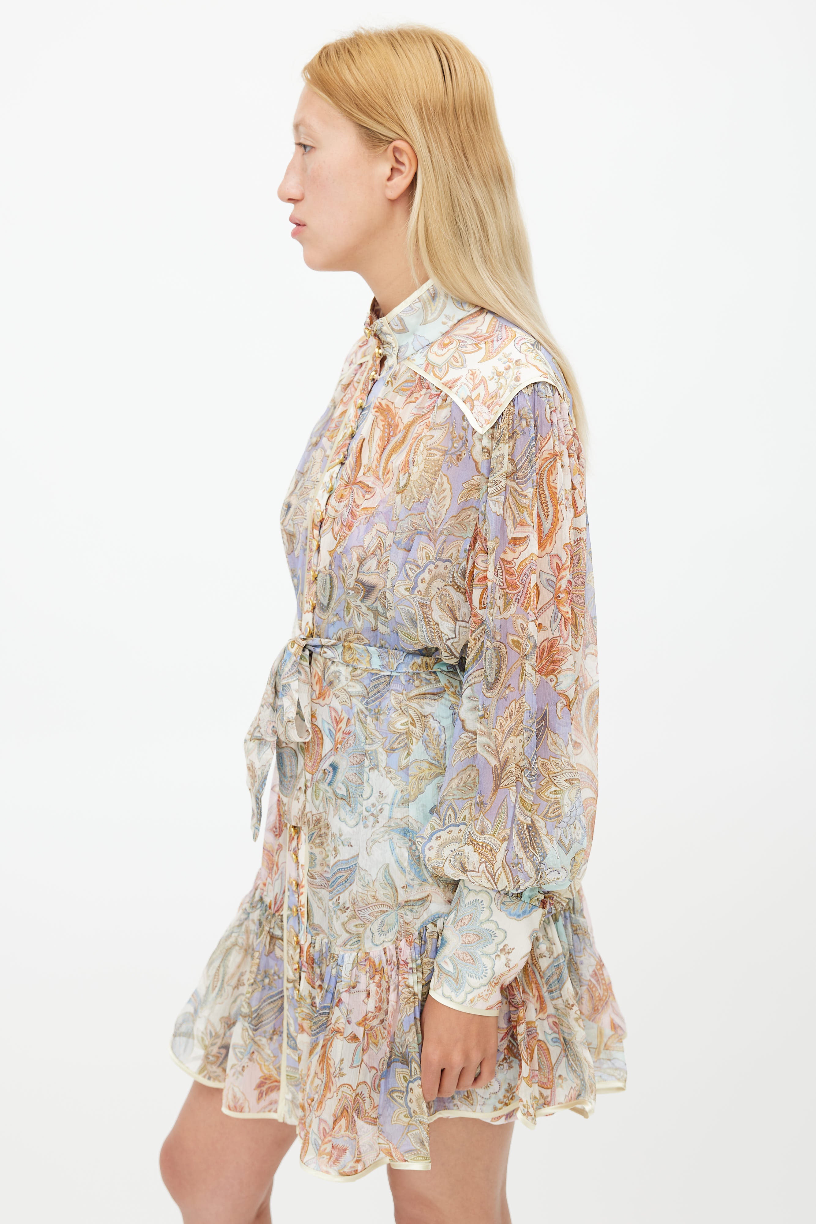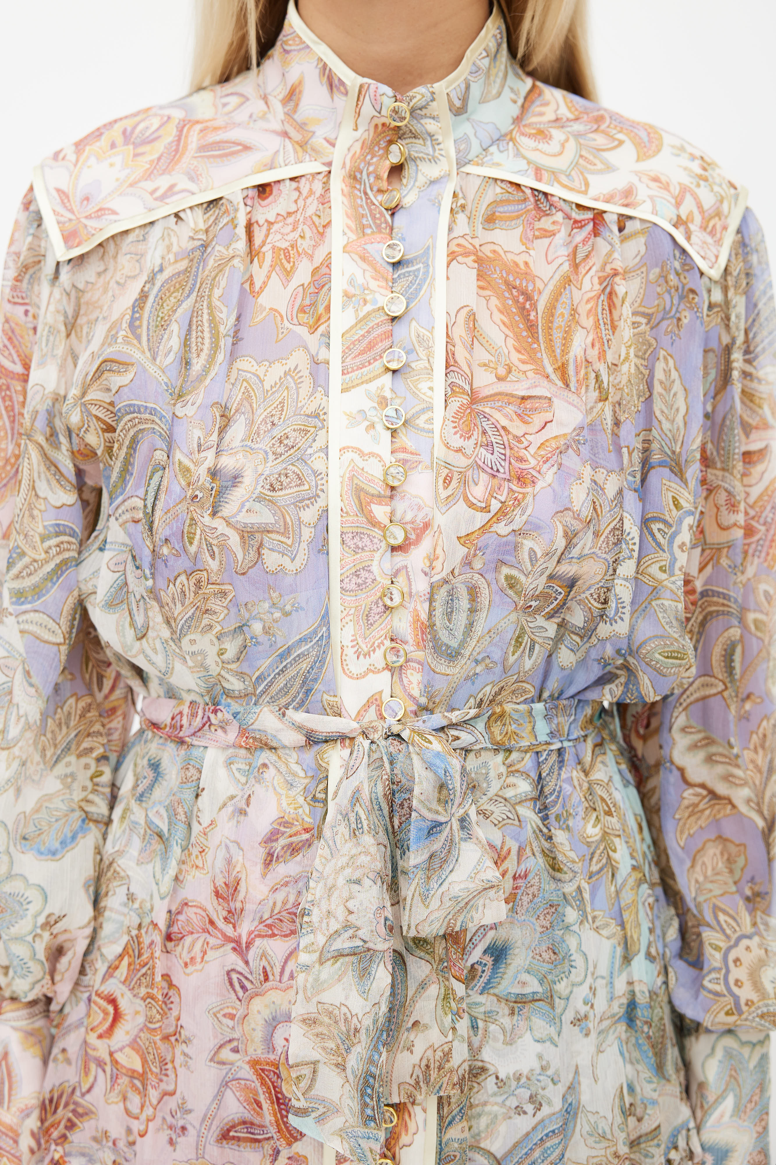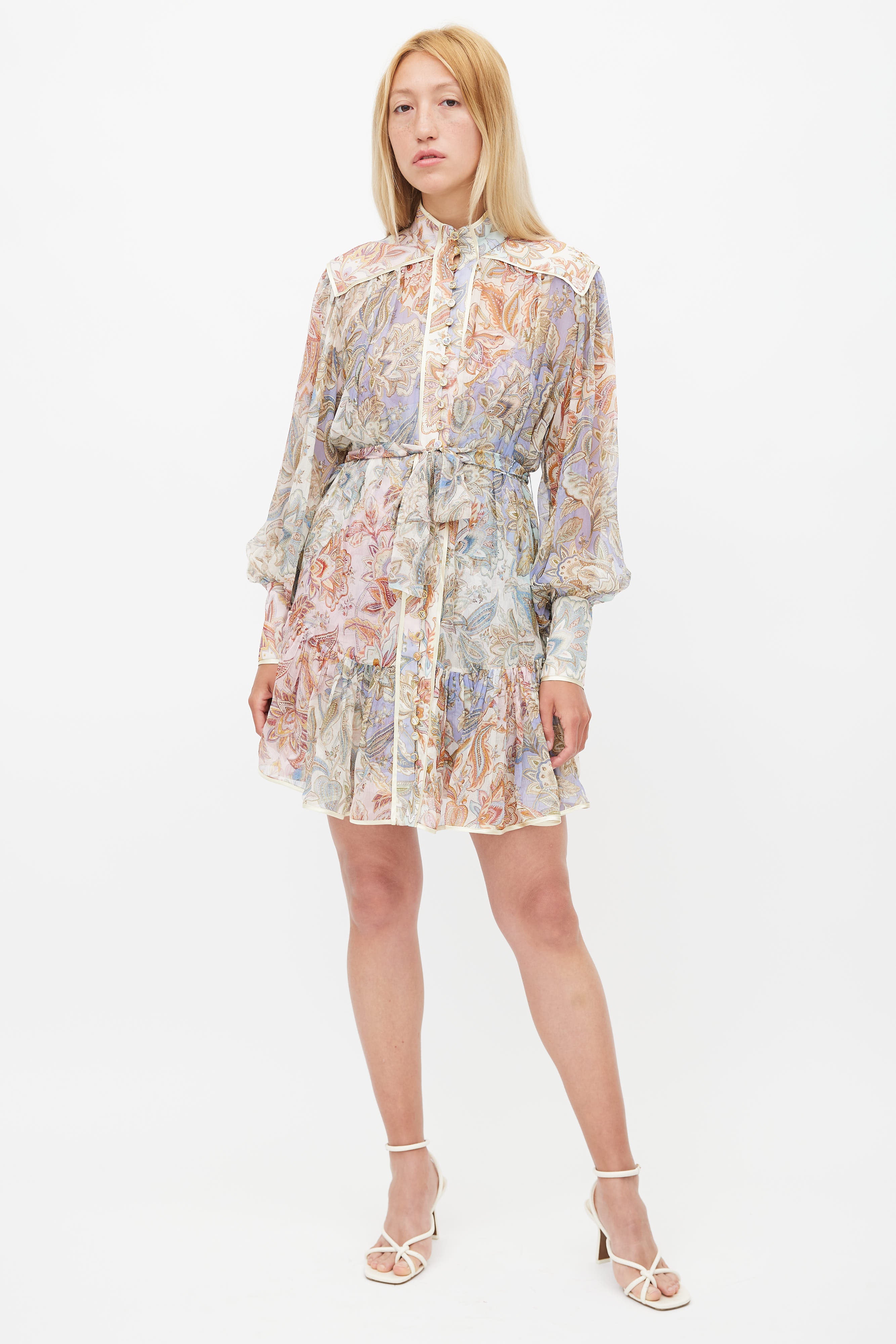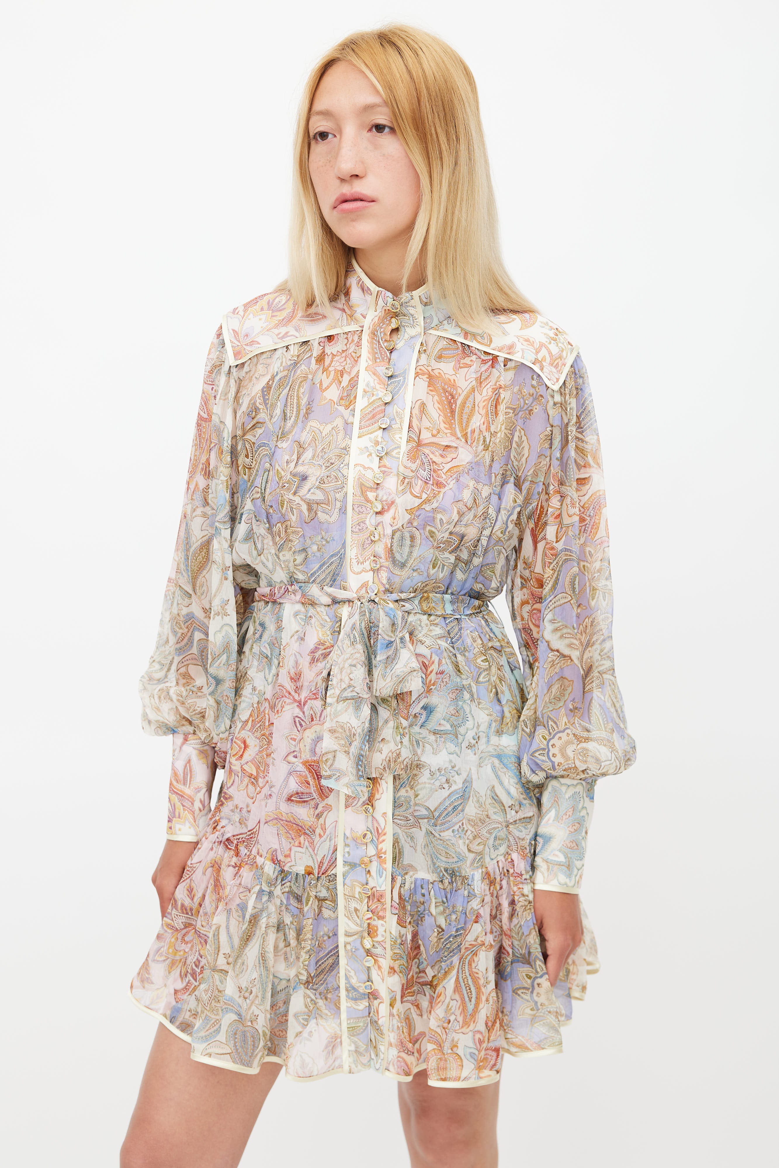 Pre-owned Zimmermann multicolour Lucky Bound dress featuring patchwork paisley print, button up front, bishop sleeves with zippered cuffs, gold satin trim, and tassel belt. Comes with slip dress and tie belt.