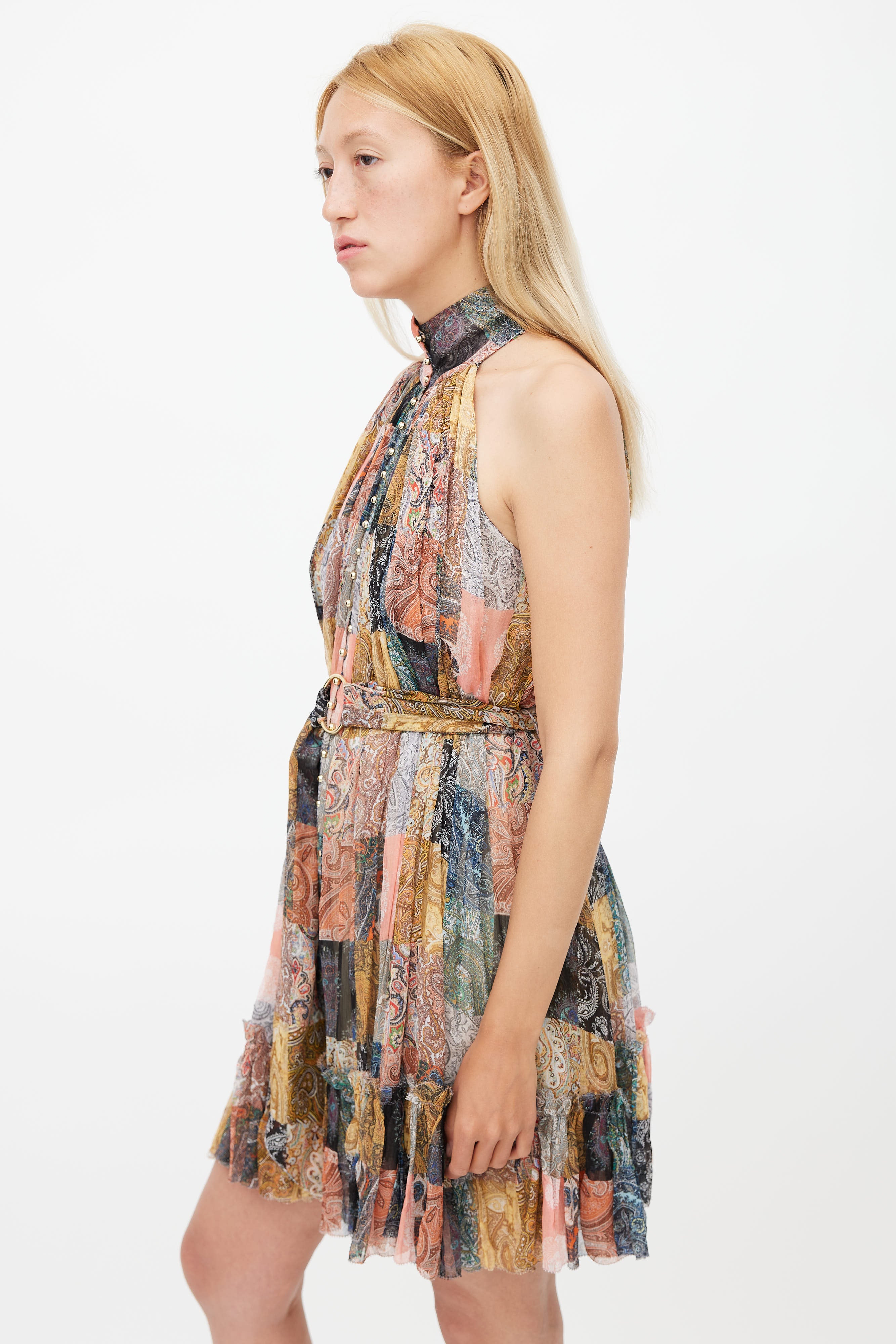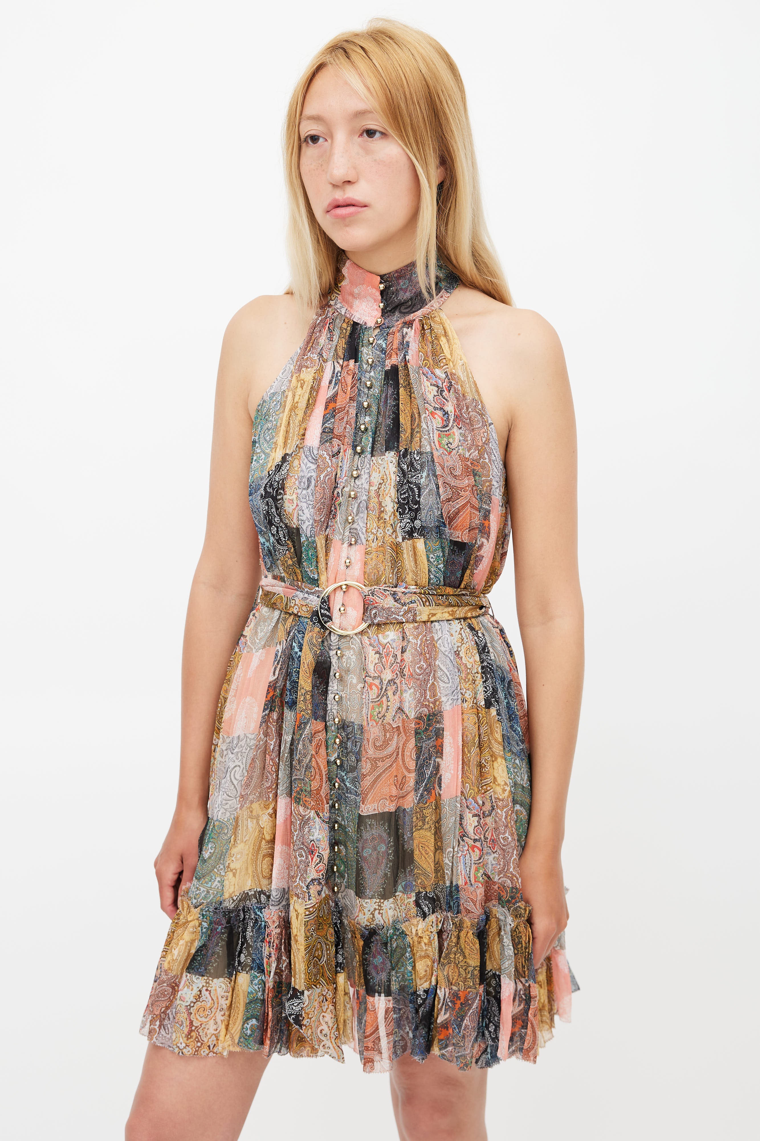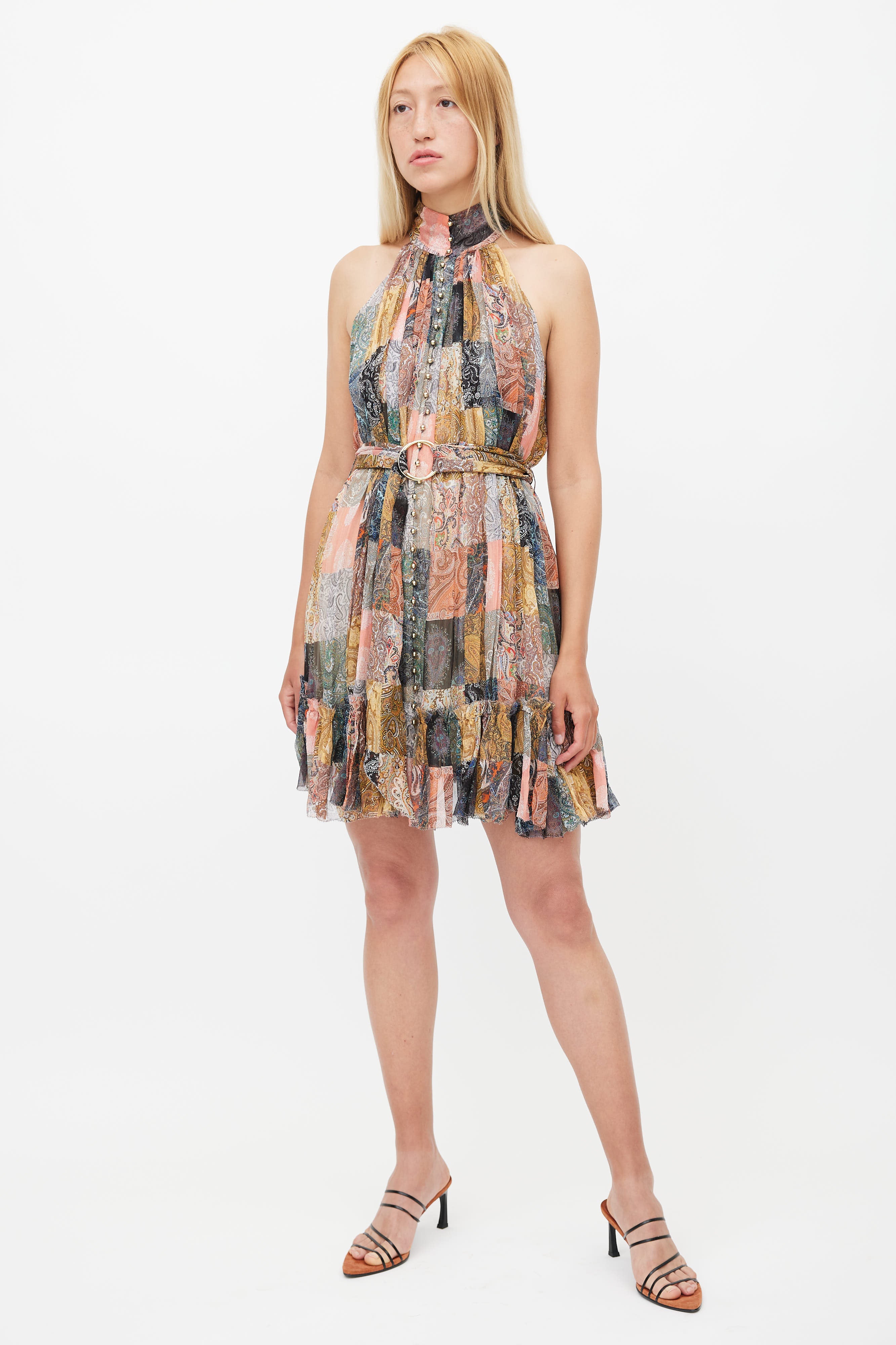 Pre-owned Zimmermann multicolour dress featuring halter neckline, patchwork paisley print, ruffle hem, button up front, and attached waist belt with gold tone ring. Lined.