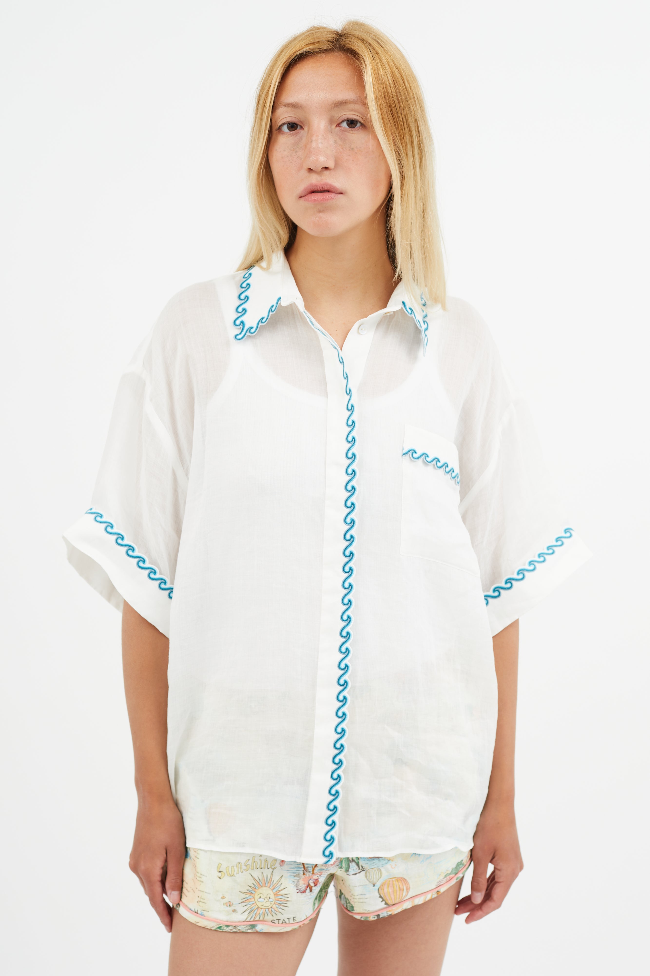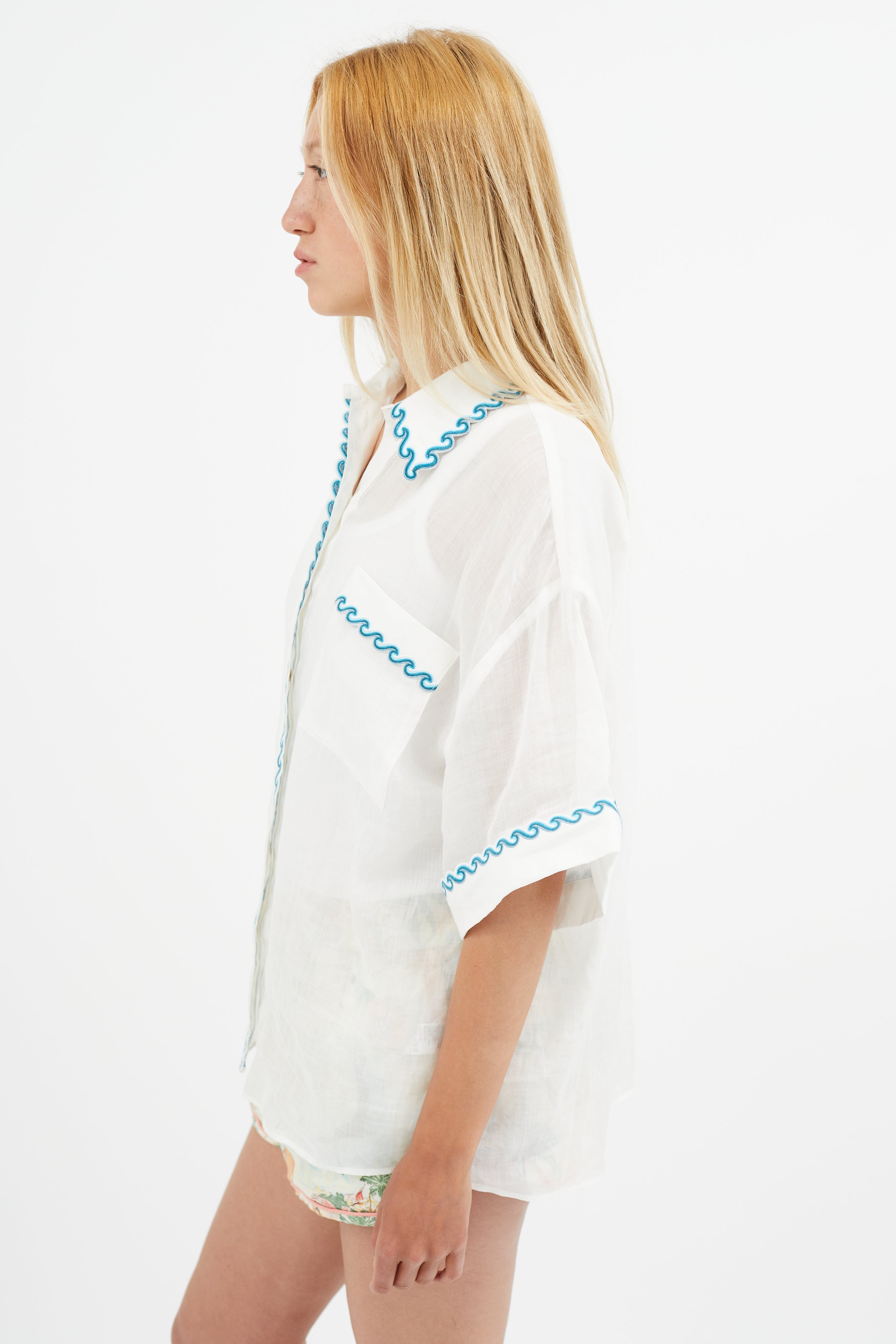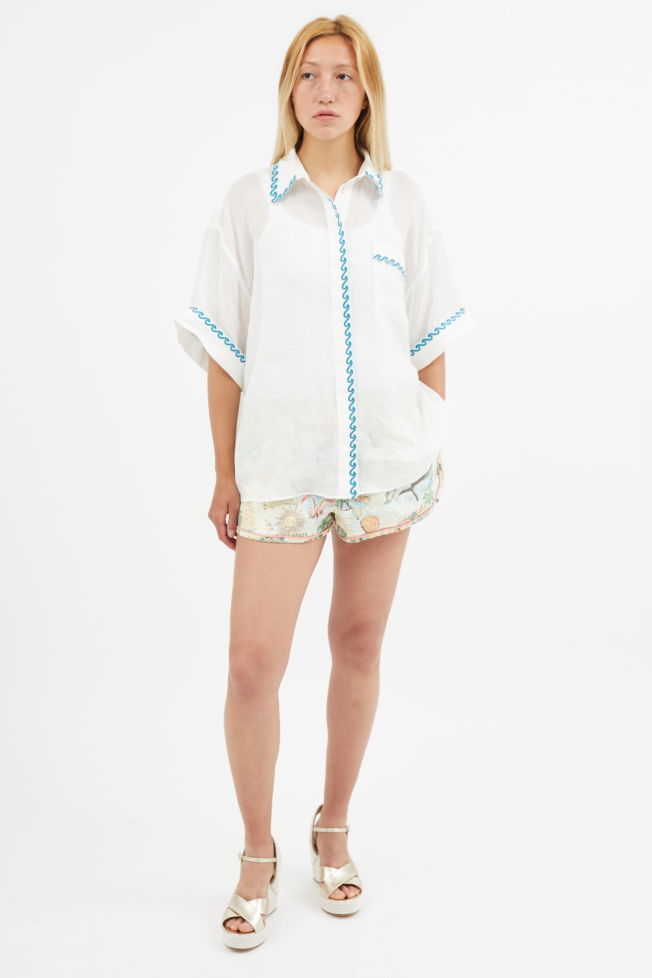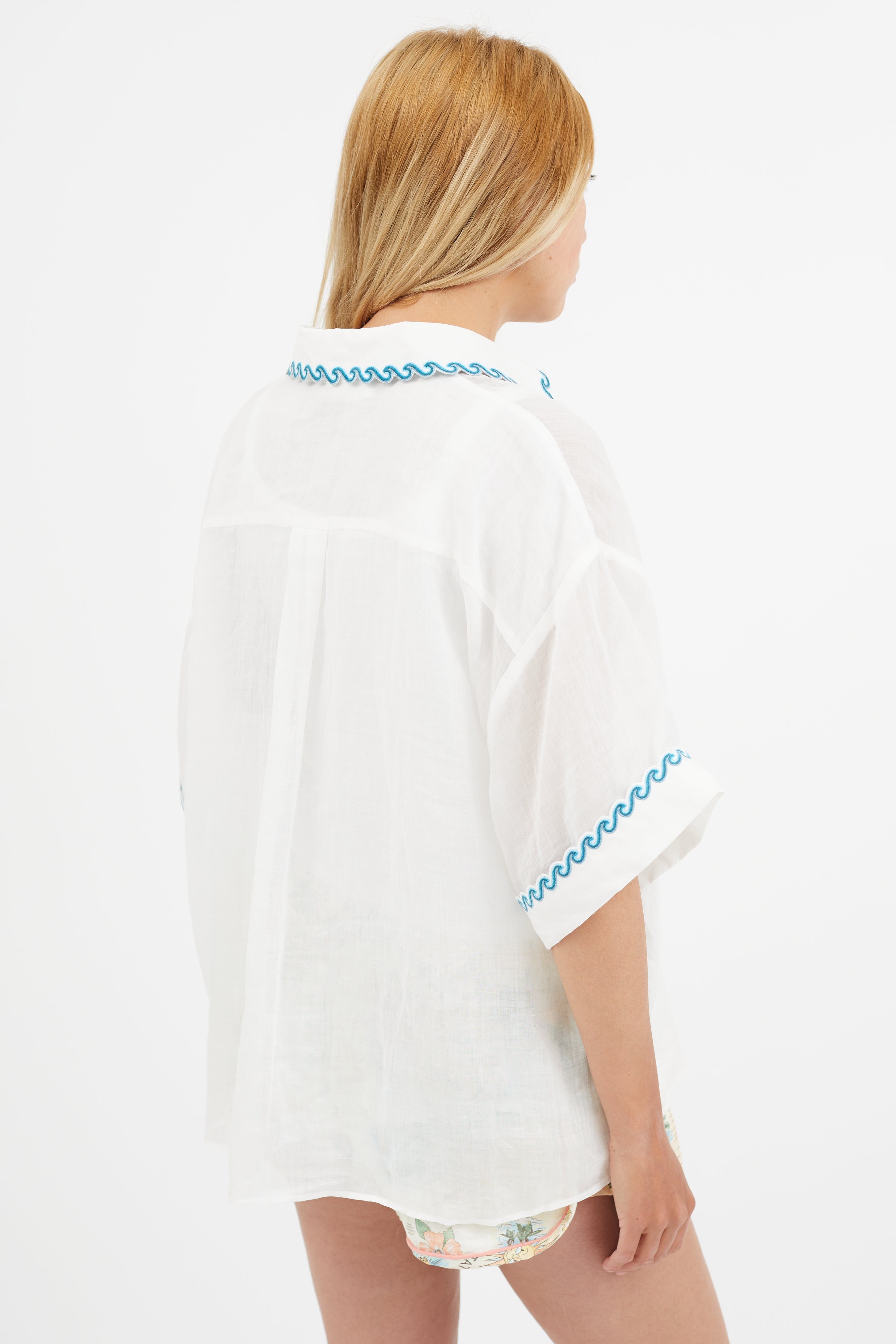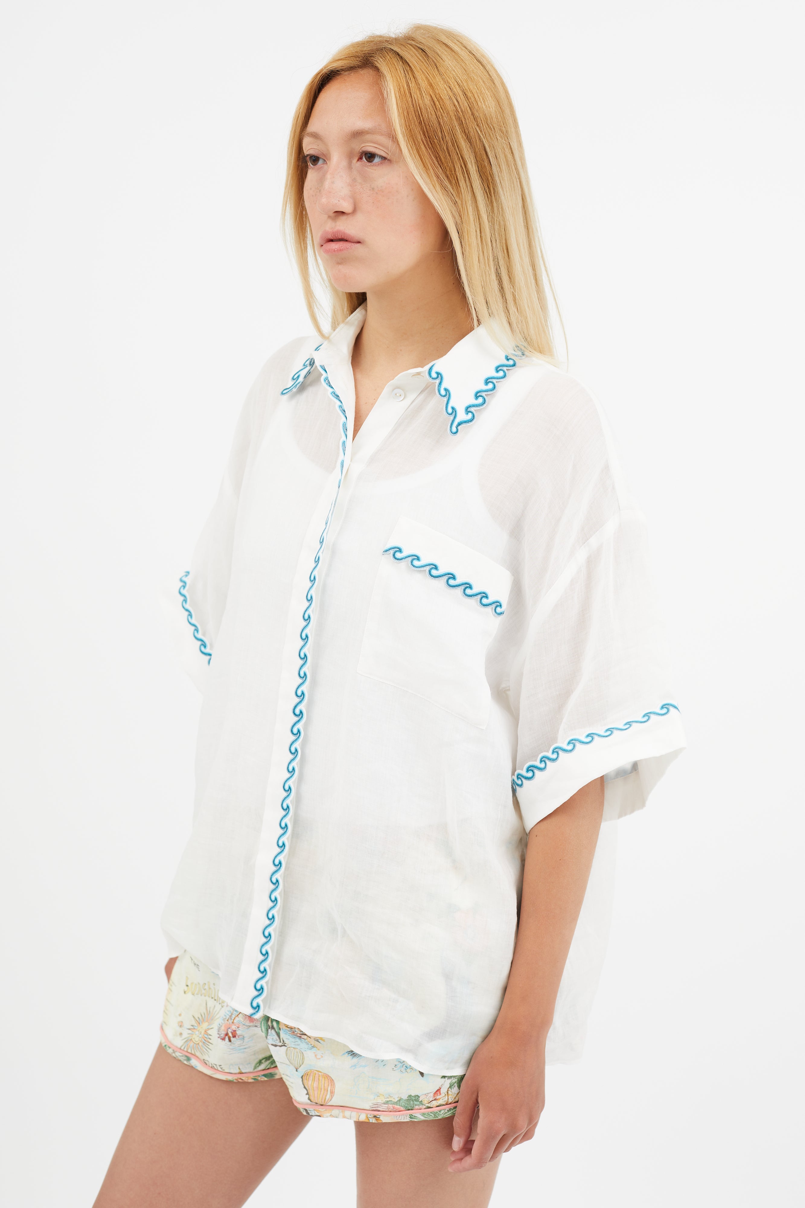 Pre-owned Zimmermann white semi sheer top featuring concealed button up front, pointed collar, chest pocket, and blue wave embroidered trim.