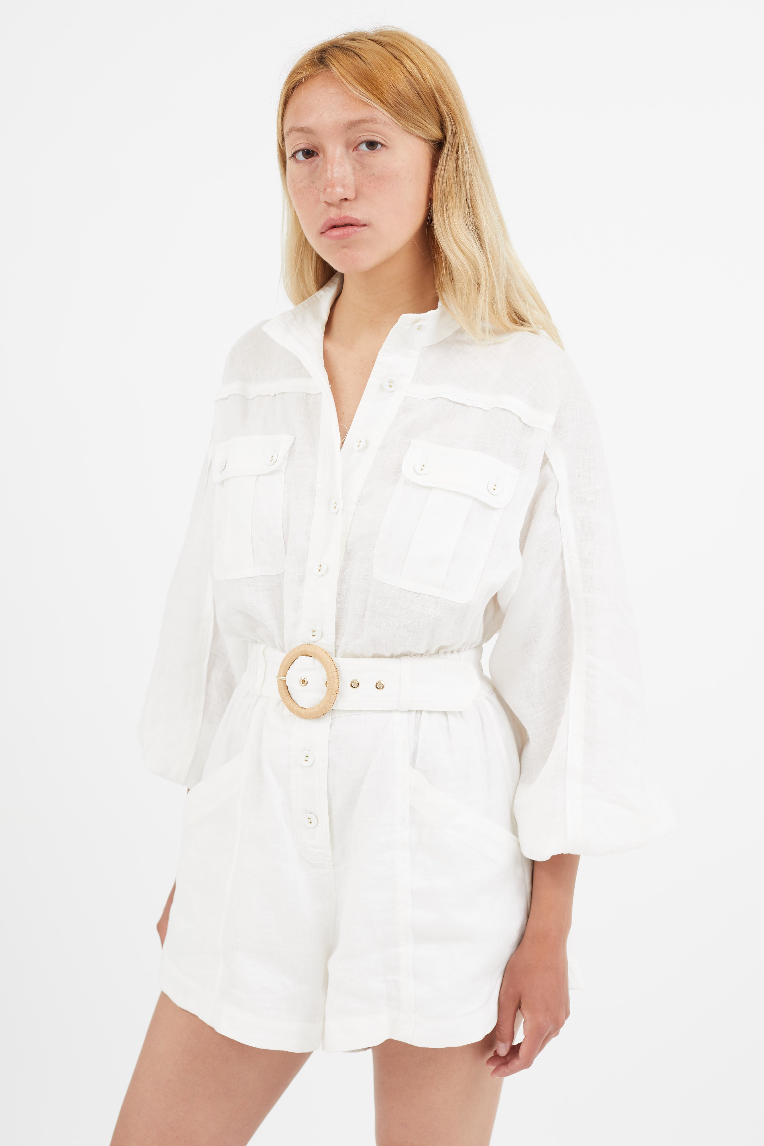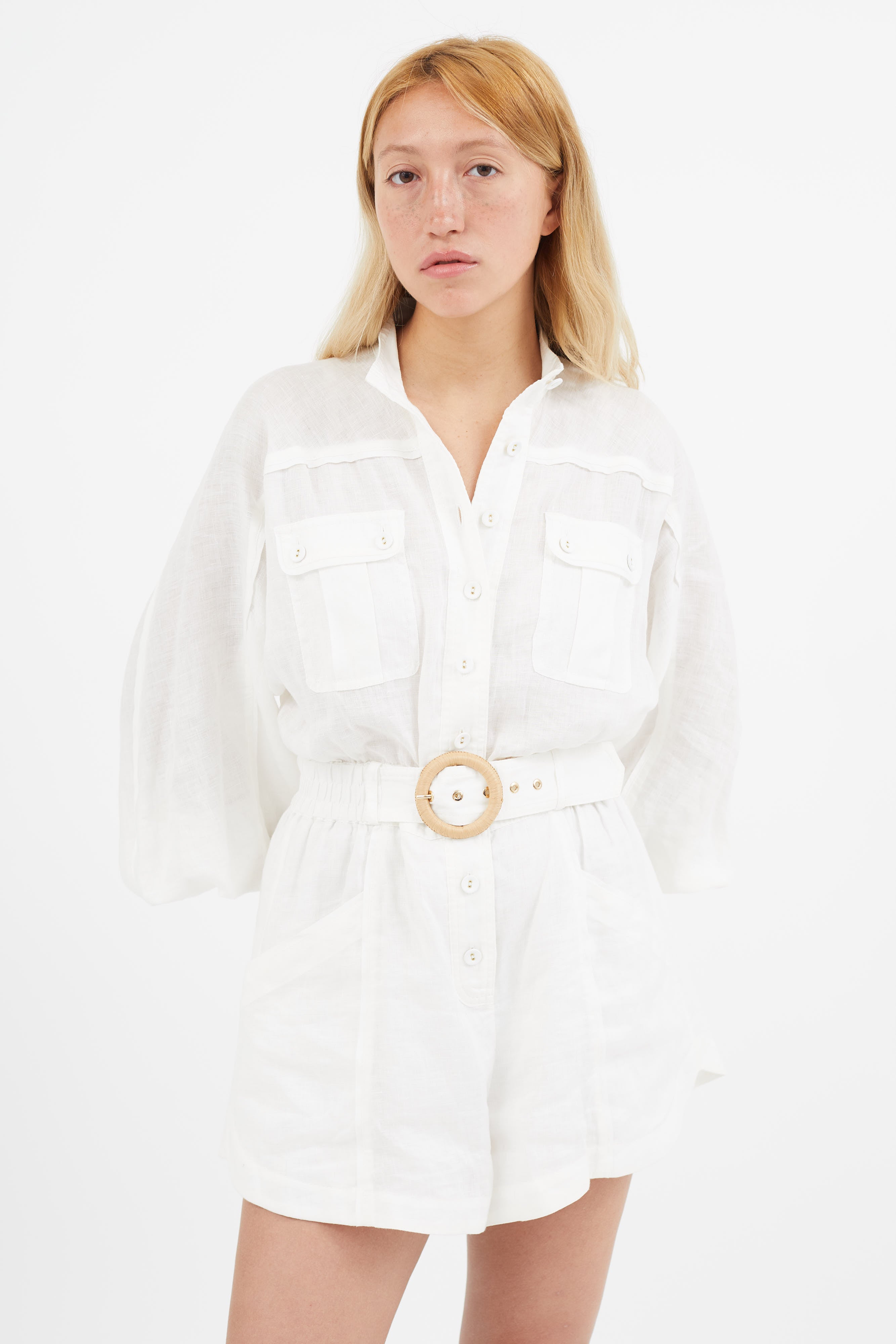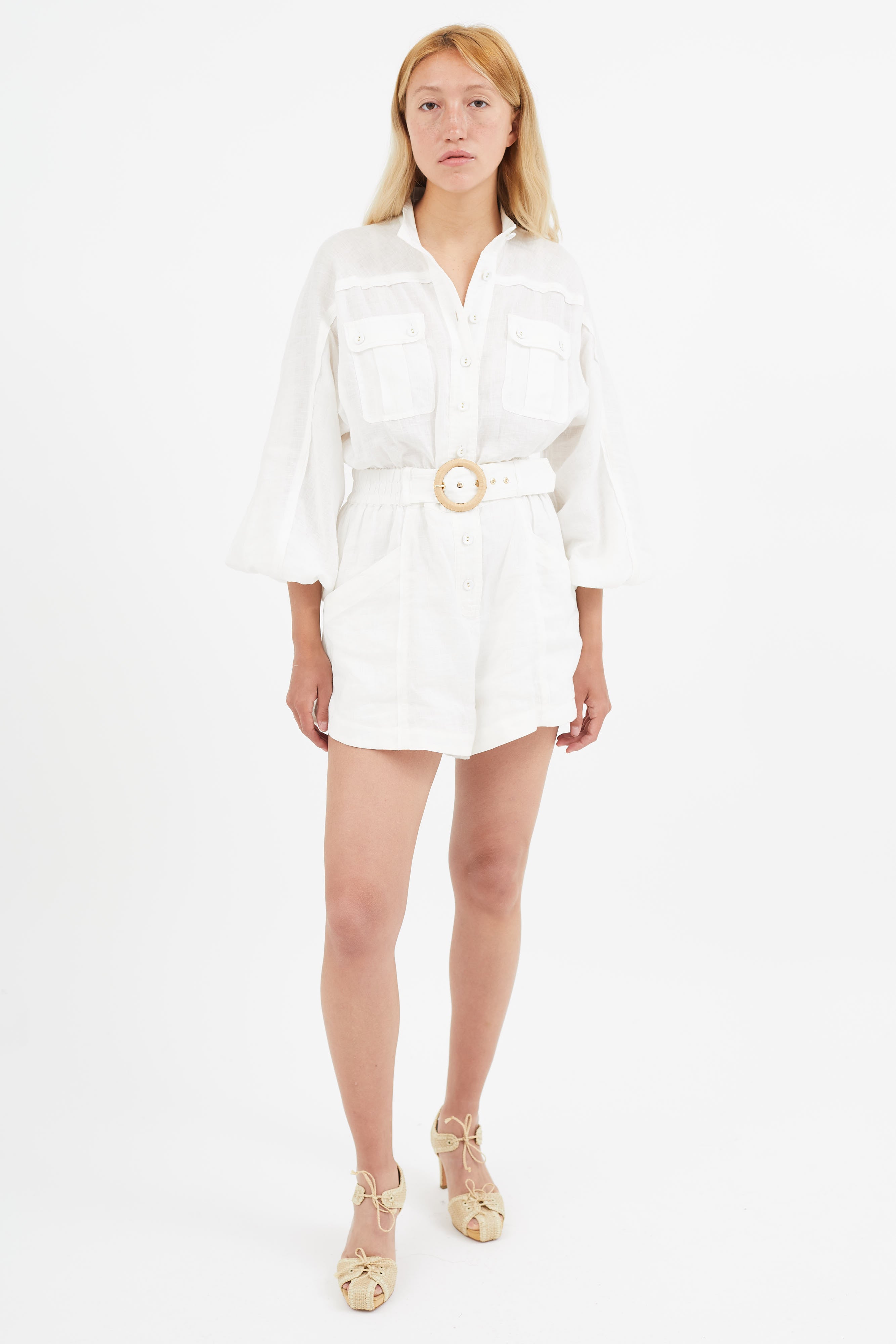 Pre-owned Zimmermann white romper featuring button up front, mock collar, two pleated chest pockets, two slash hip pockets, elasticized waist, and attached belt.