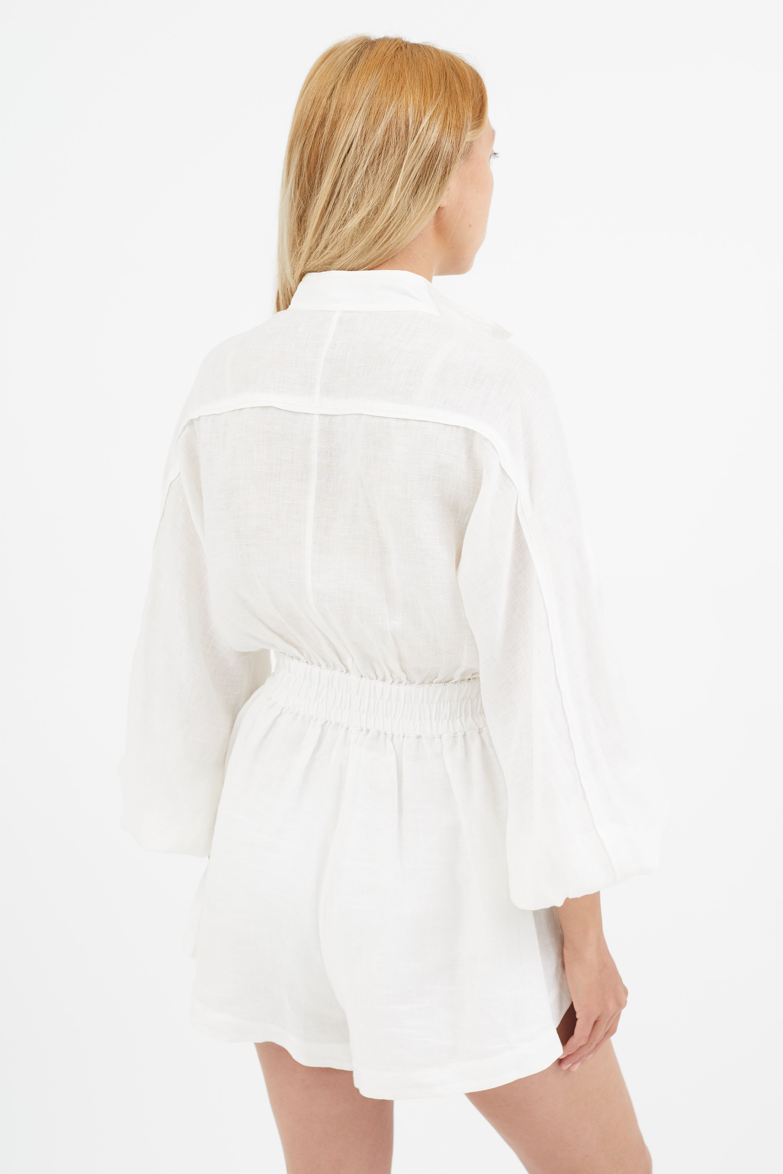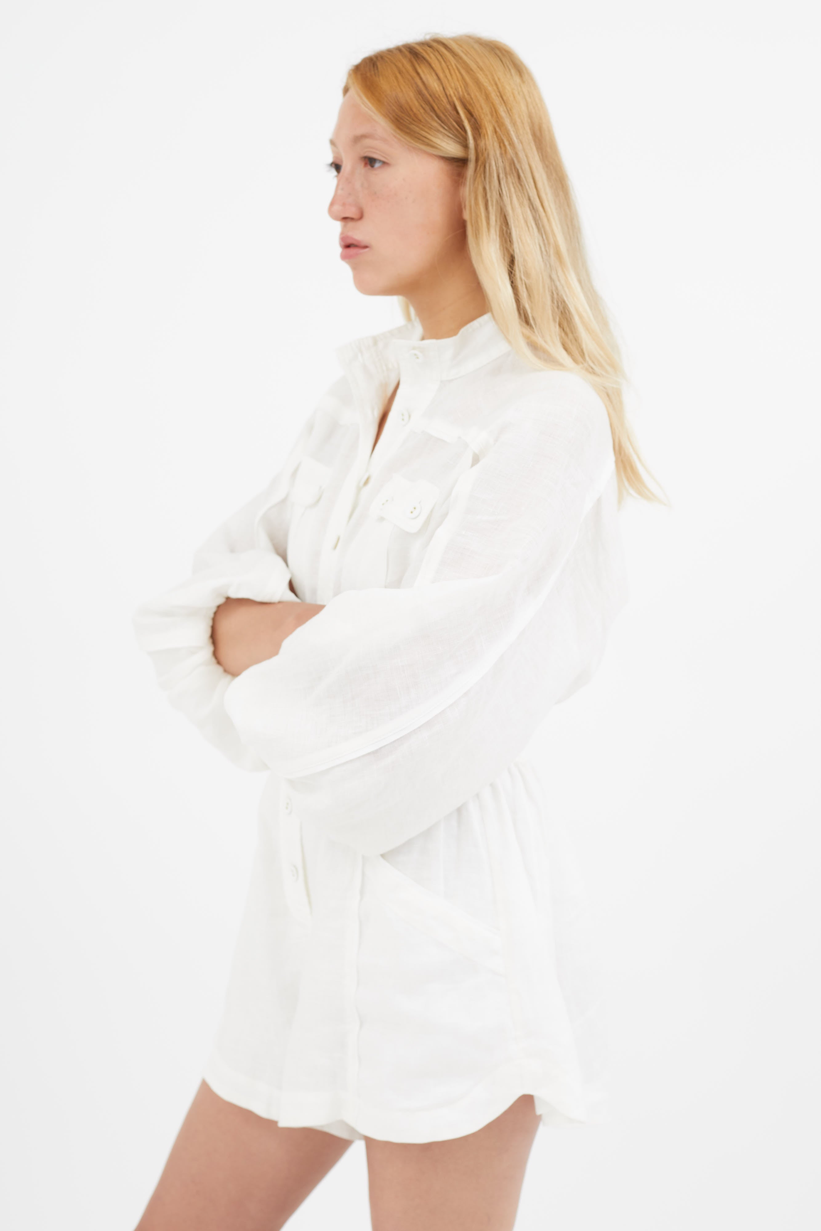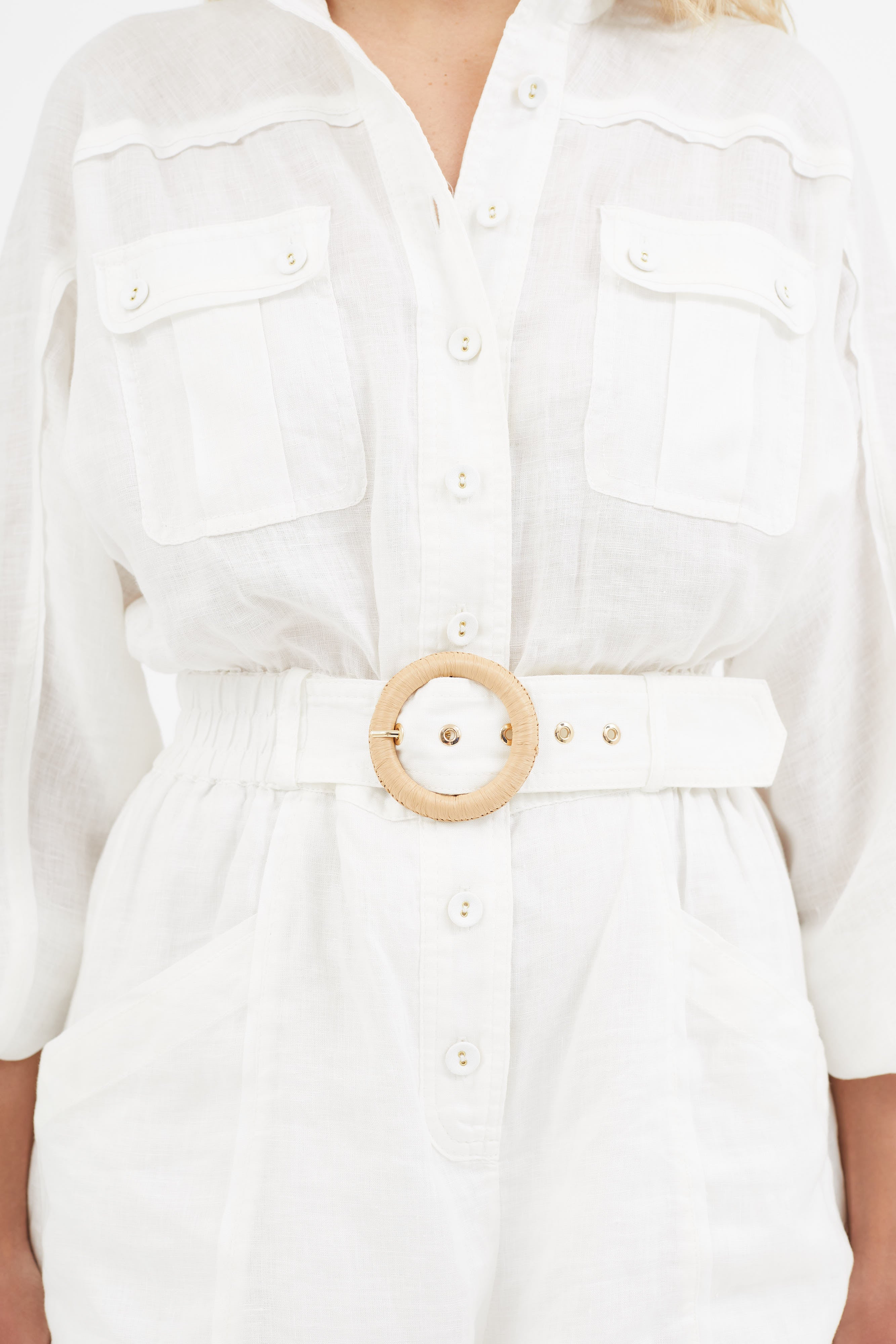 Pre-owned Zimmermann white romper featuring button up front, mock collar, two pleated chest pockets, two slash hip pockets, elasticized waist, and attached belt.
