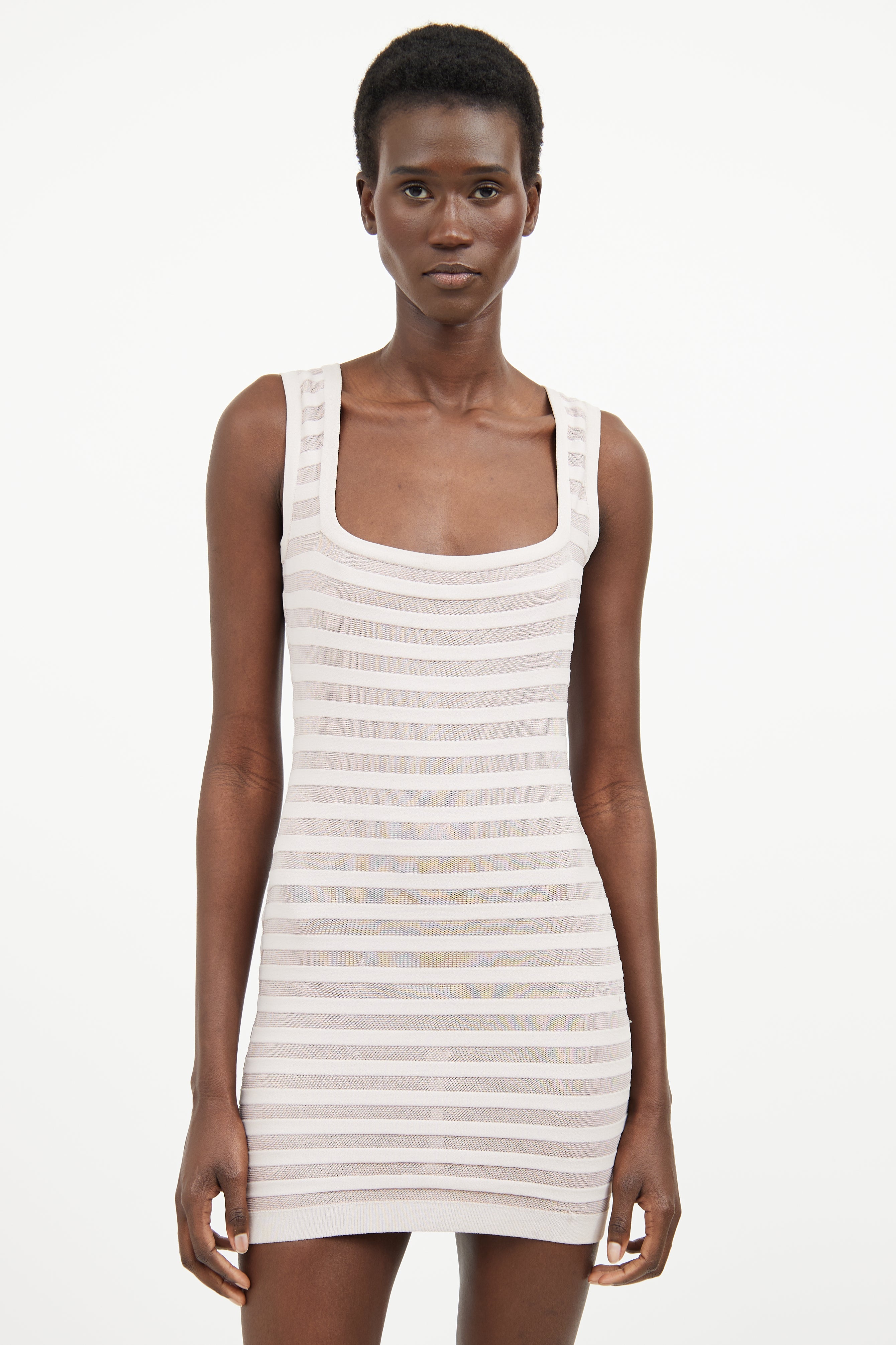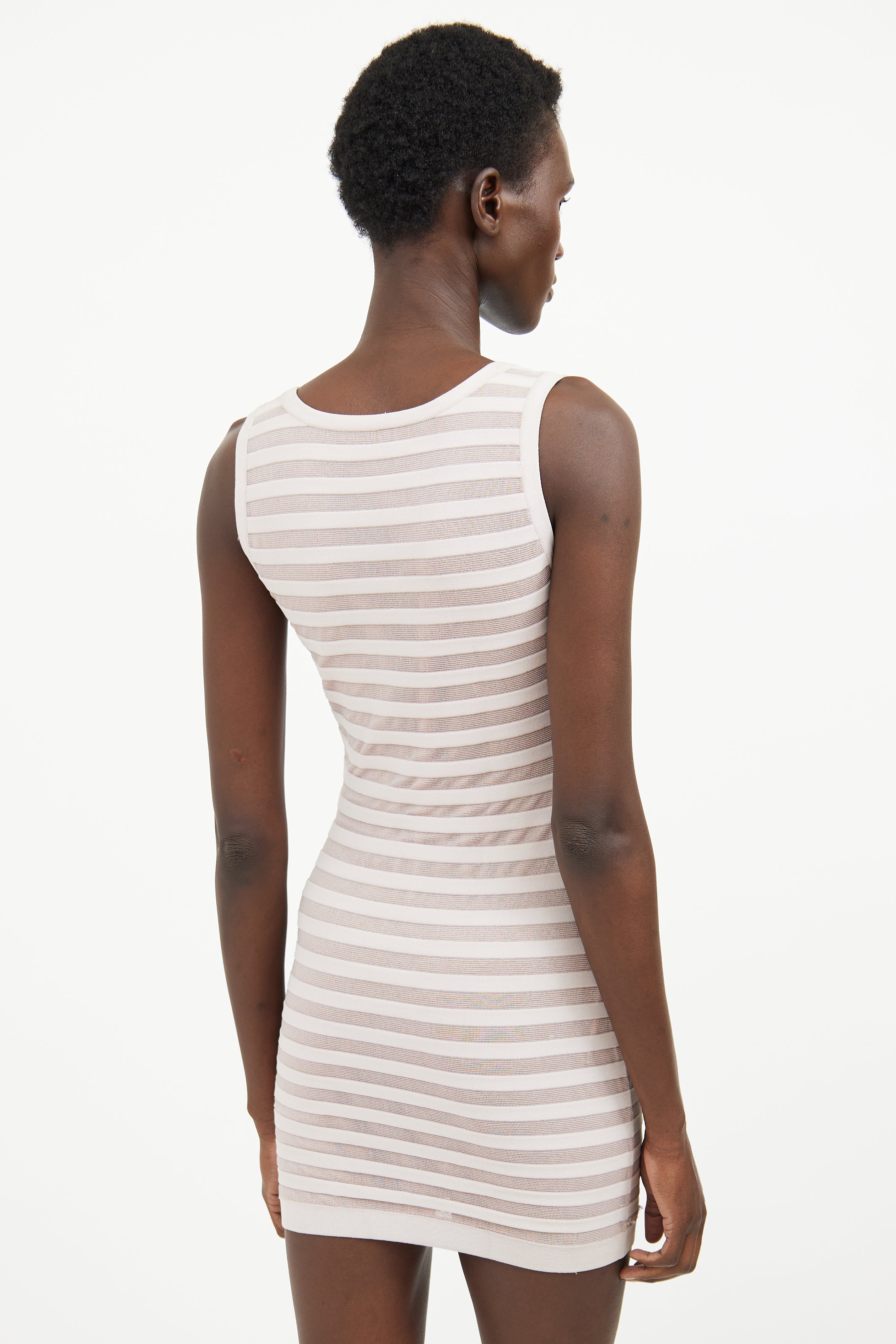 Pre-owned Alaïa pink and beige sleeveless dress featuring scoop neck, striping with sheer mesh paneling and bodycon styling.