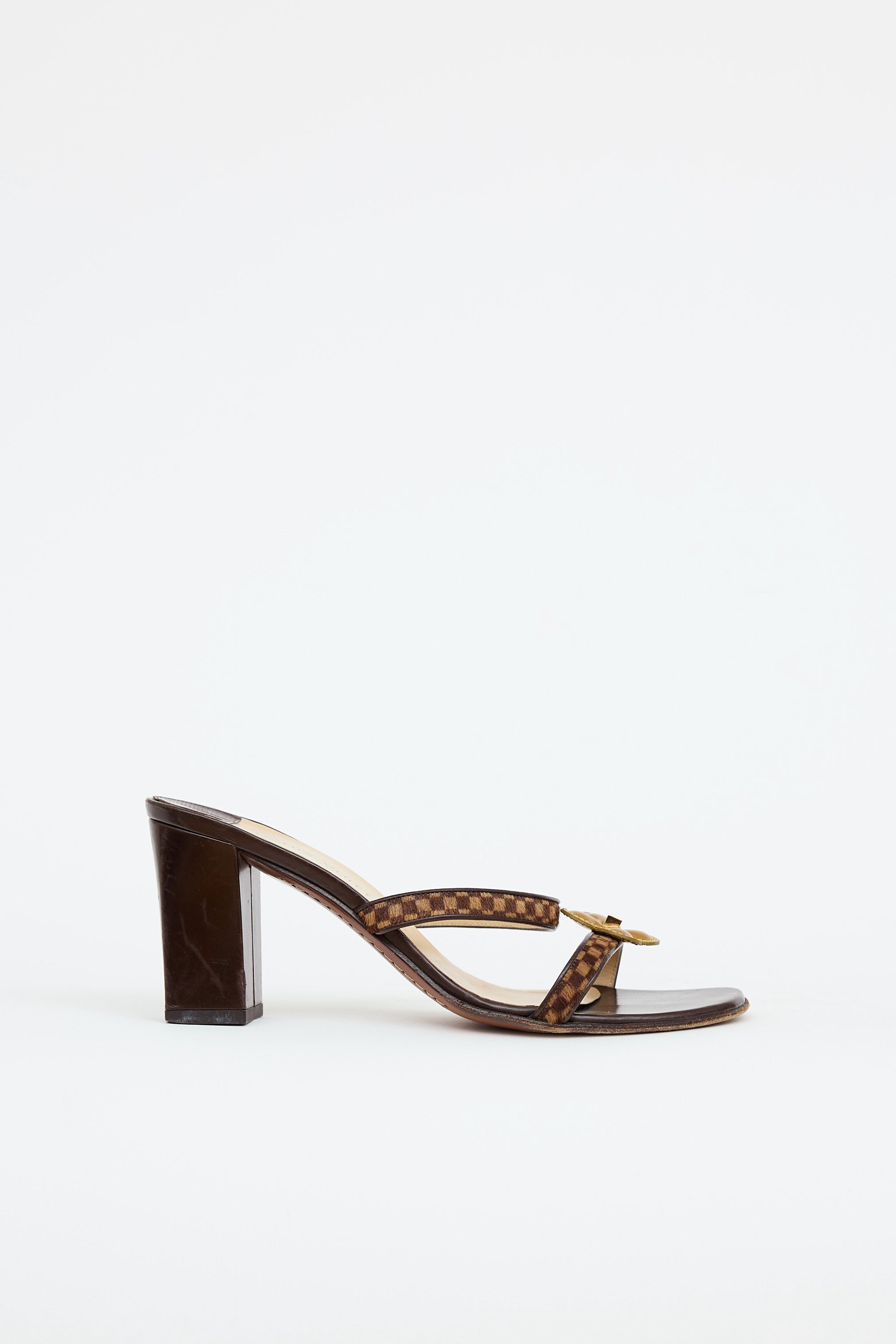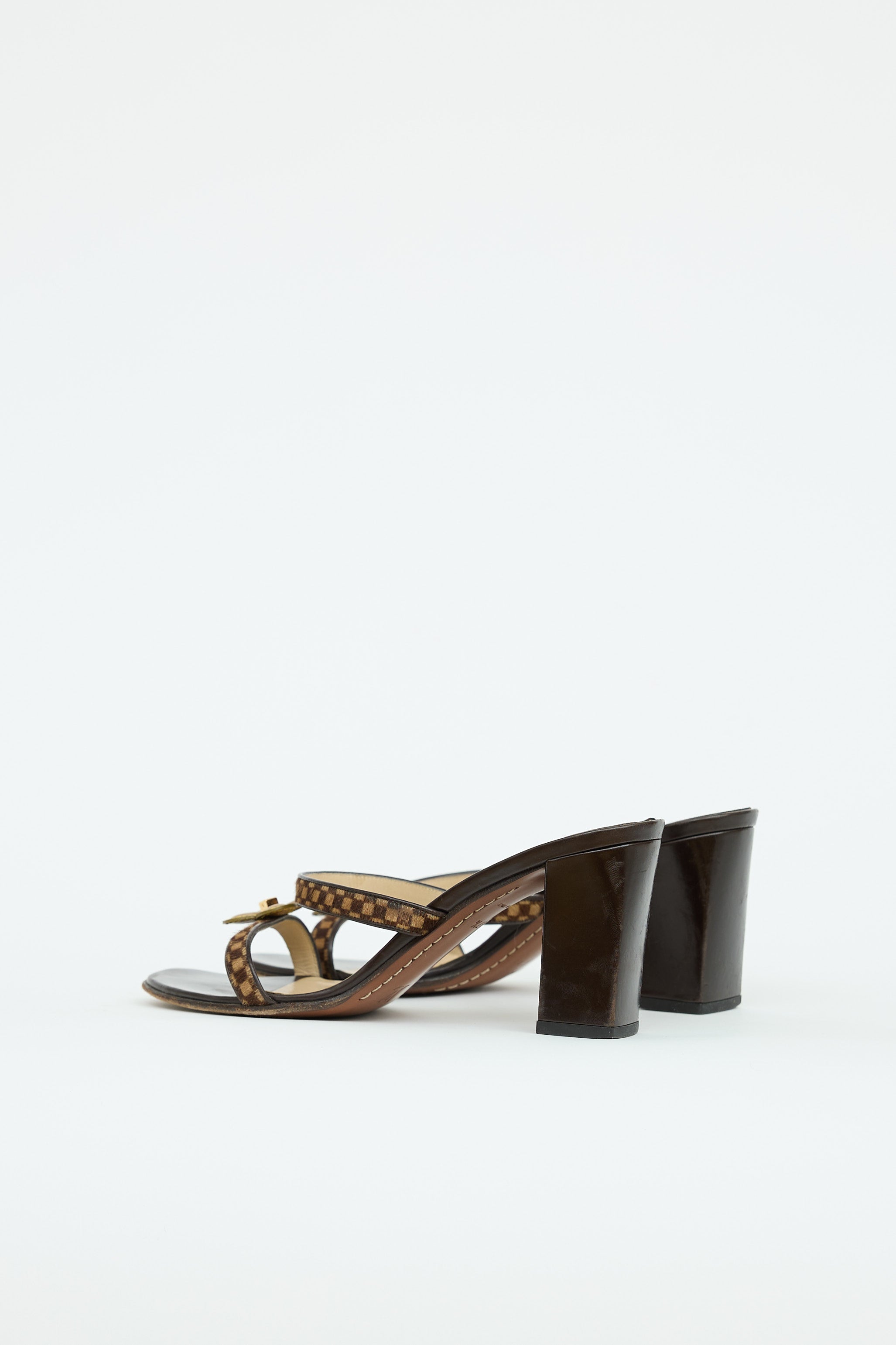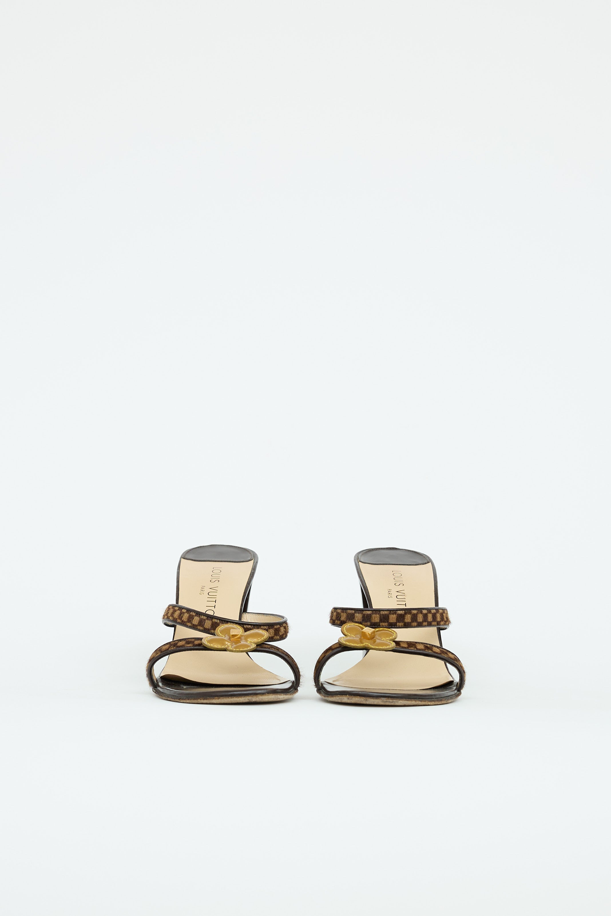 Pre-owned Louis Vuitton brown Damier Sauvage sandal featuring a square open toe, two pony hair Damier patterned strap across vamp with brown flower embellishment with LV logo debossed hardware, block heel, and leather outsole.