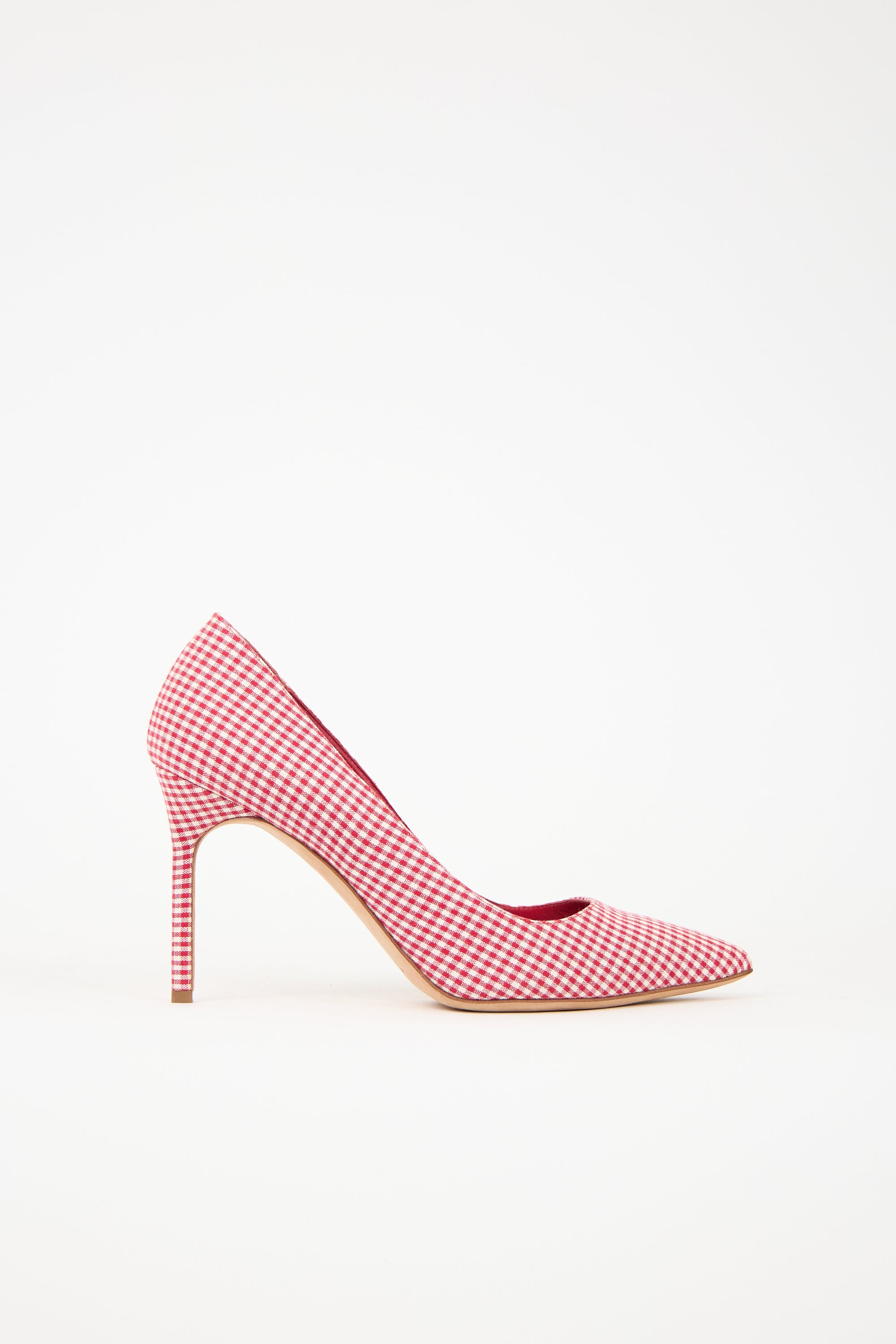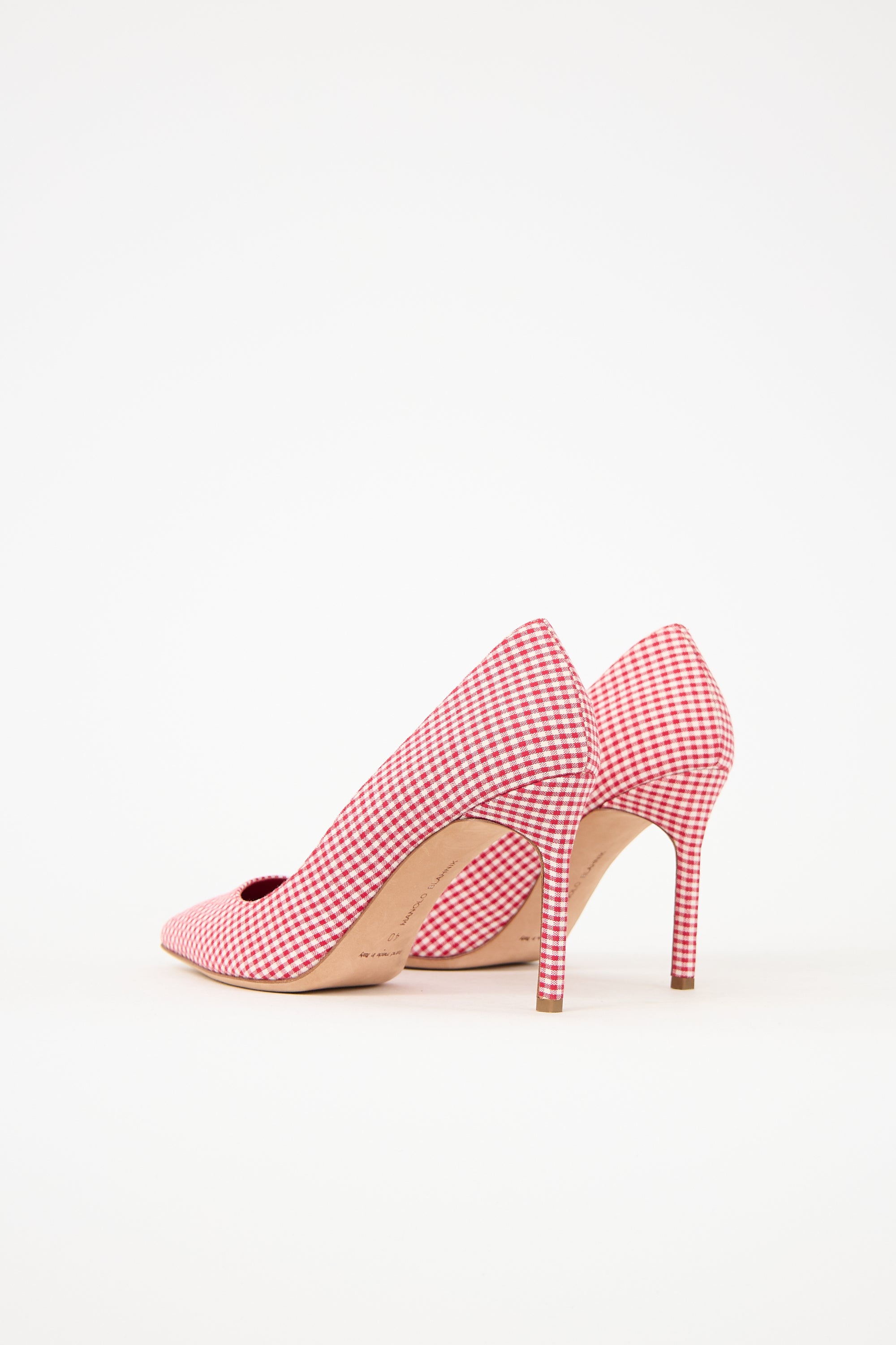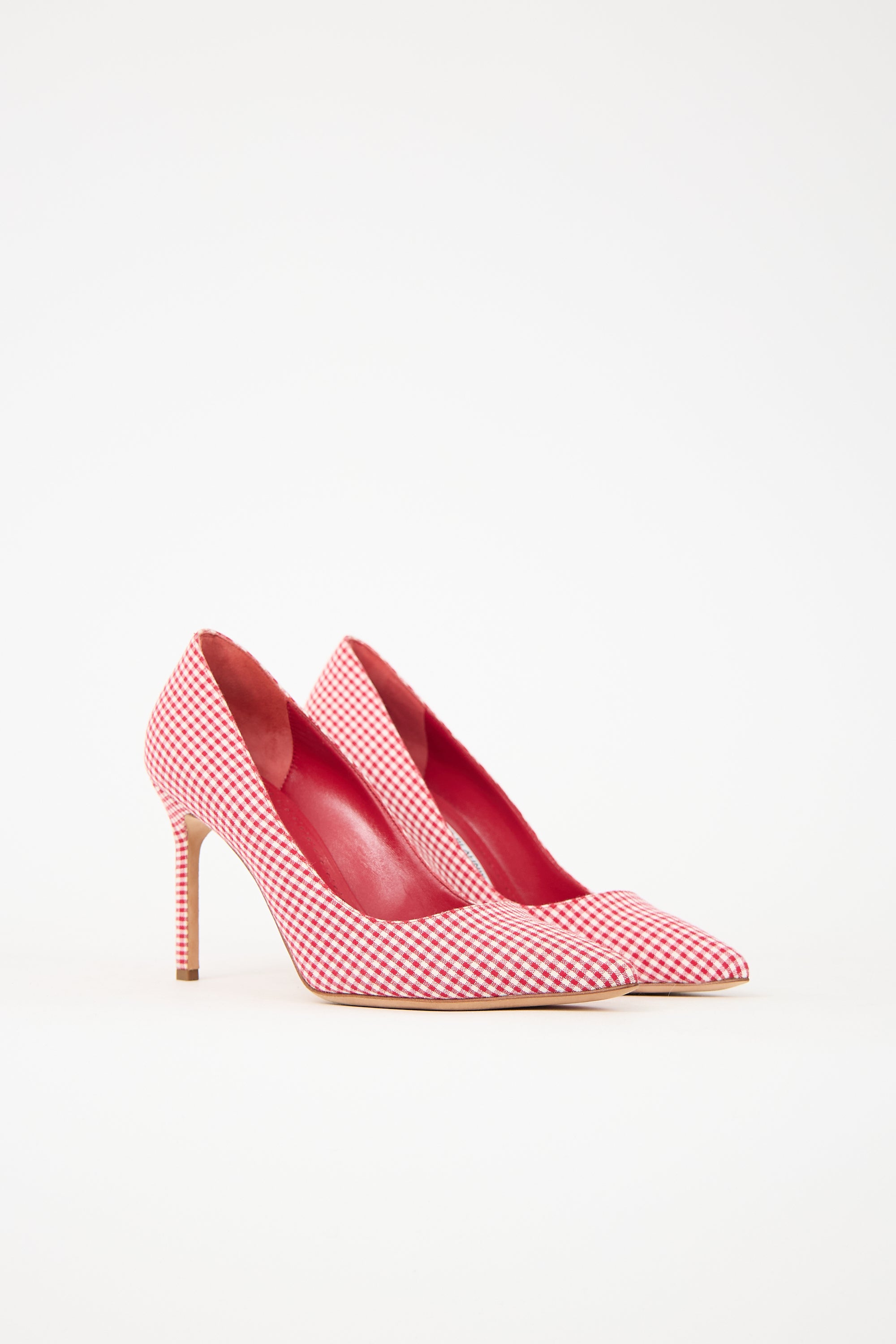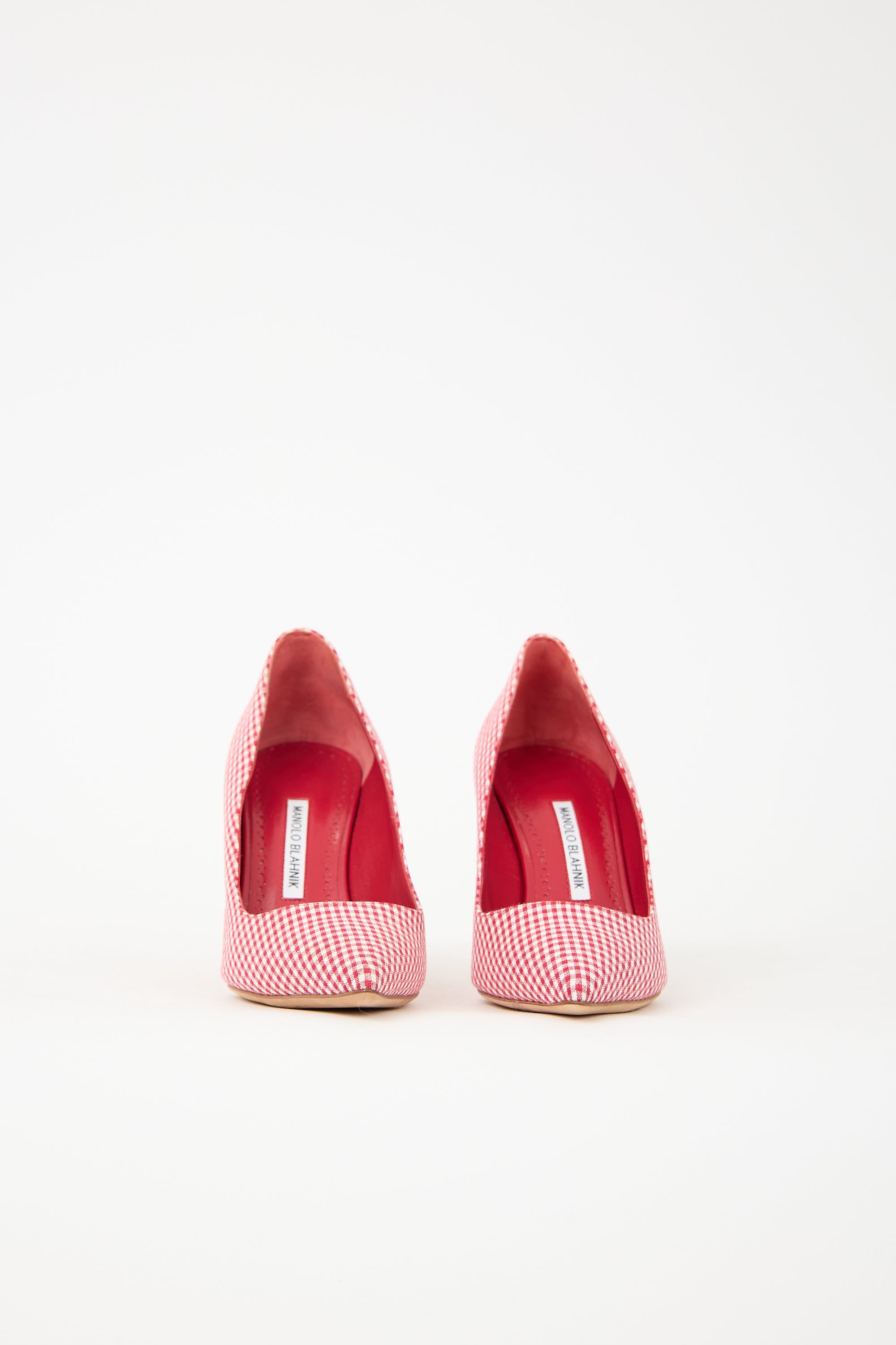 Pre-owned Manolo Blahnik red and white BB pumps featuring pointed toe, gingham pattern, and stiletto heel.