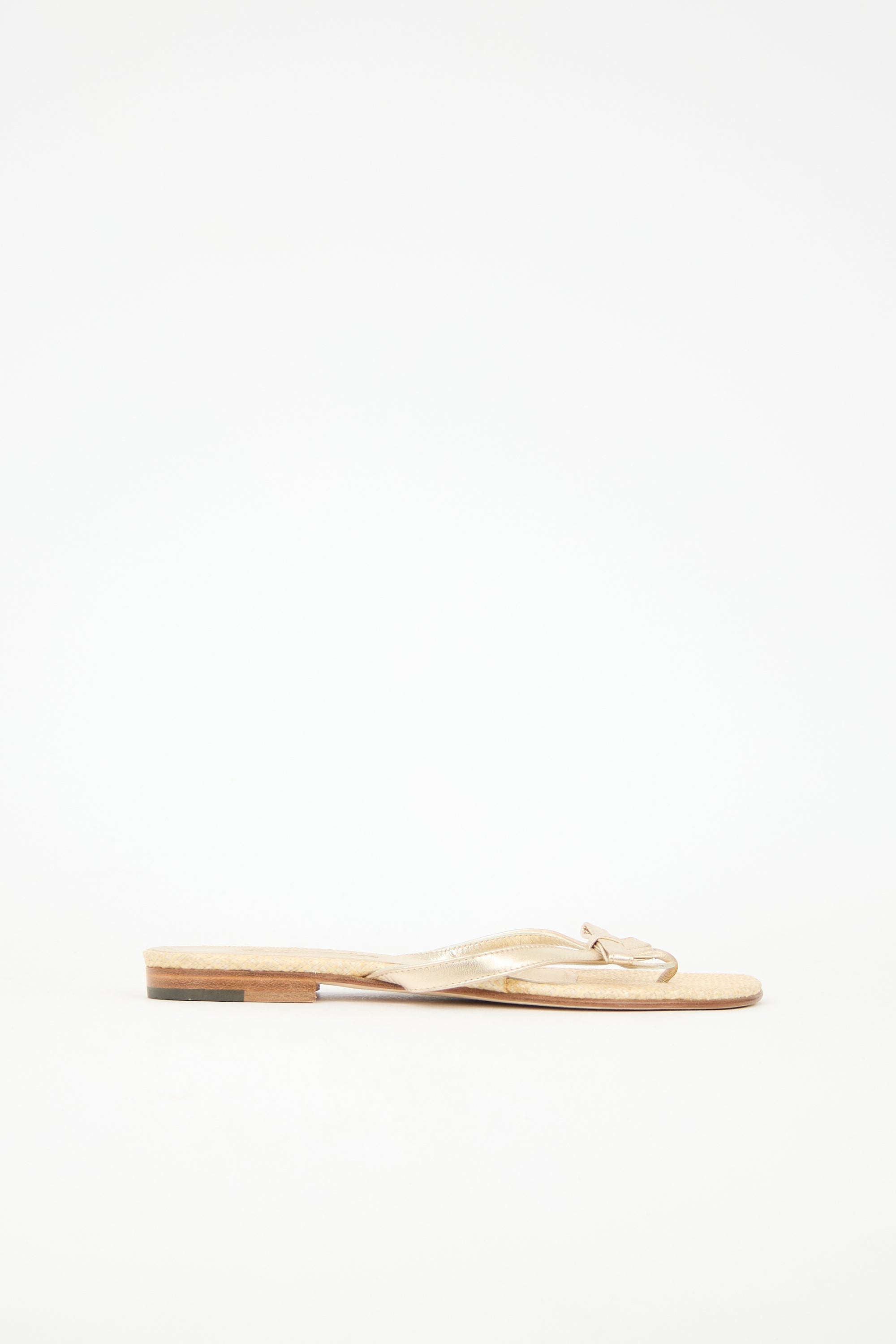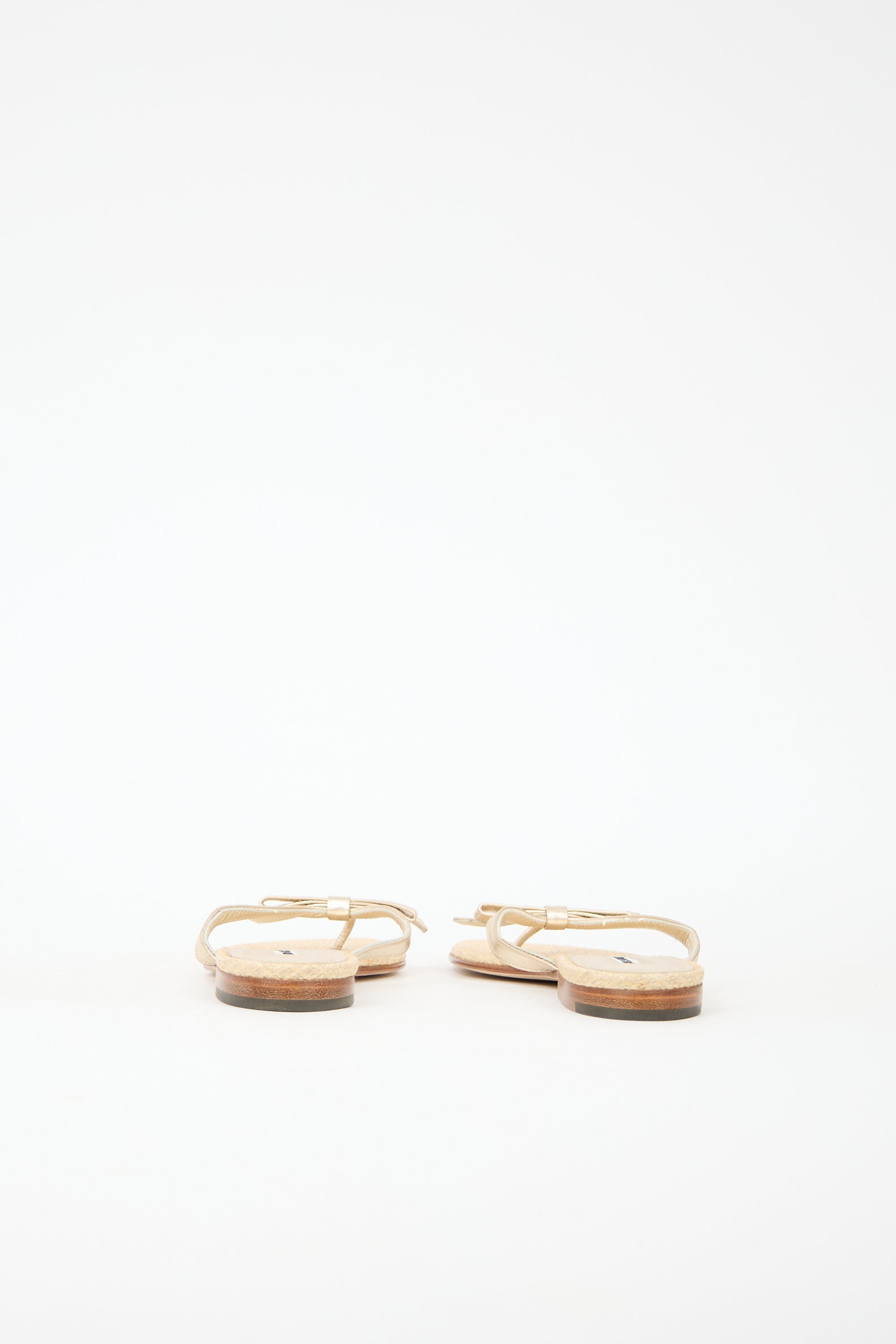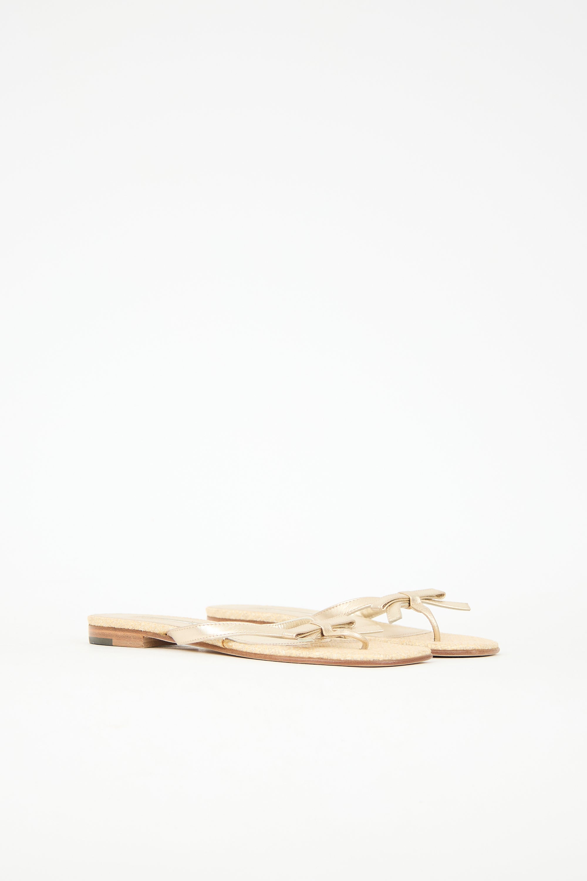Pre-owned Manolo Blahnik gold leather sandals featuring open rounded toe, mixed leather and woven insole, attached bow at thong strap, and short stacked heel. Includes original dust bag.