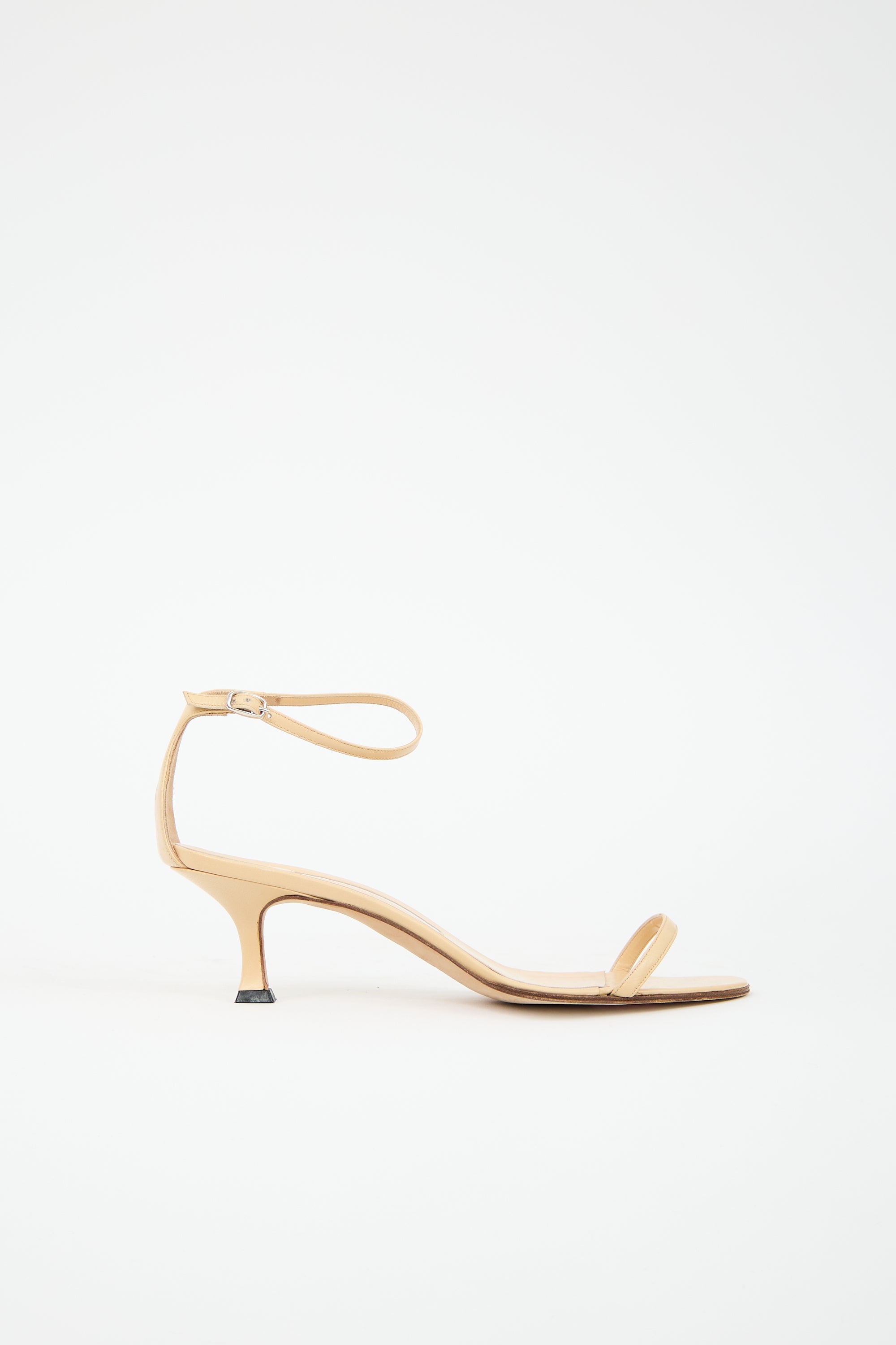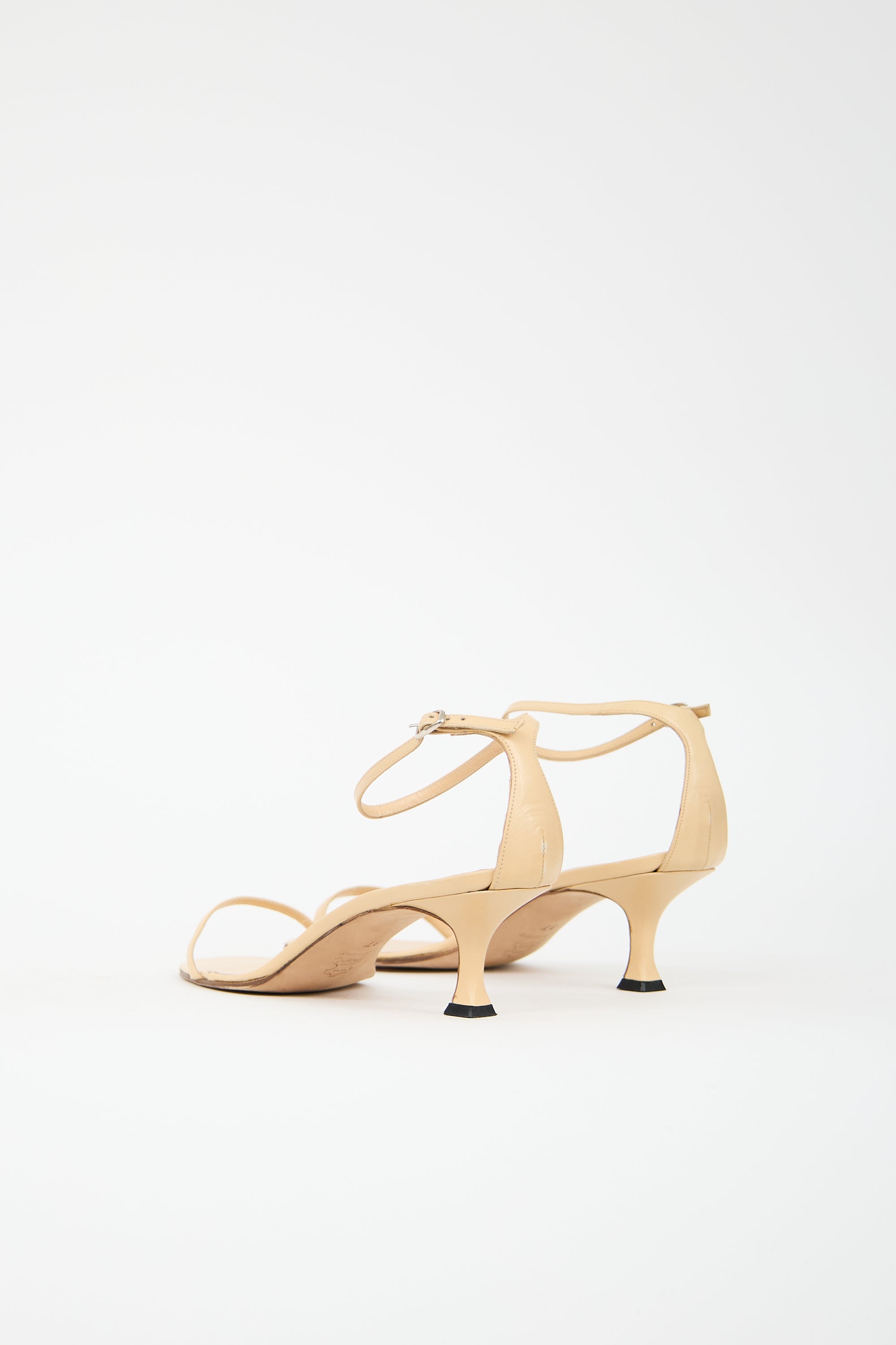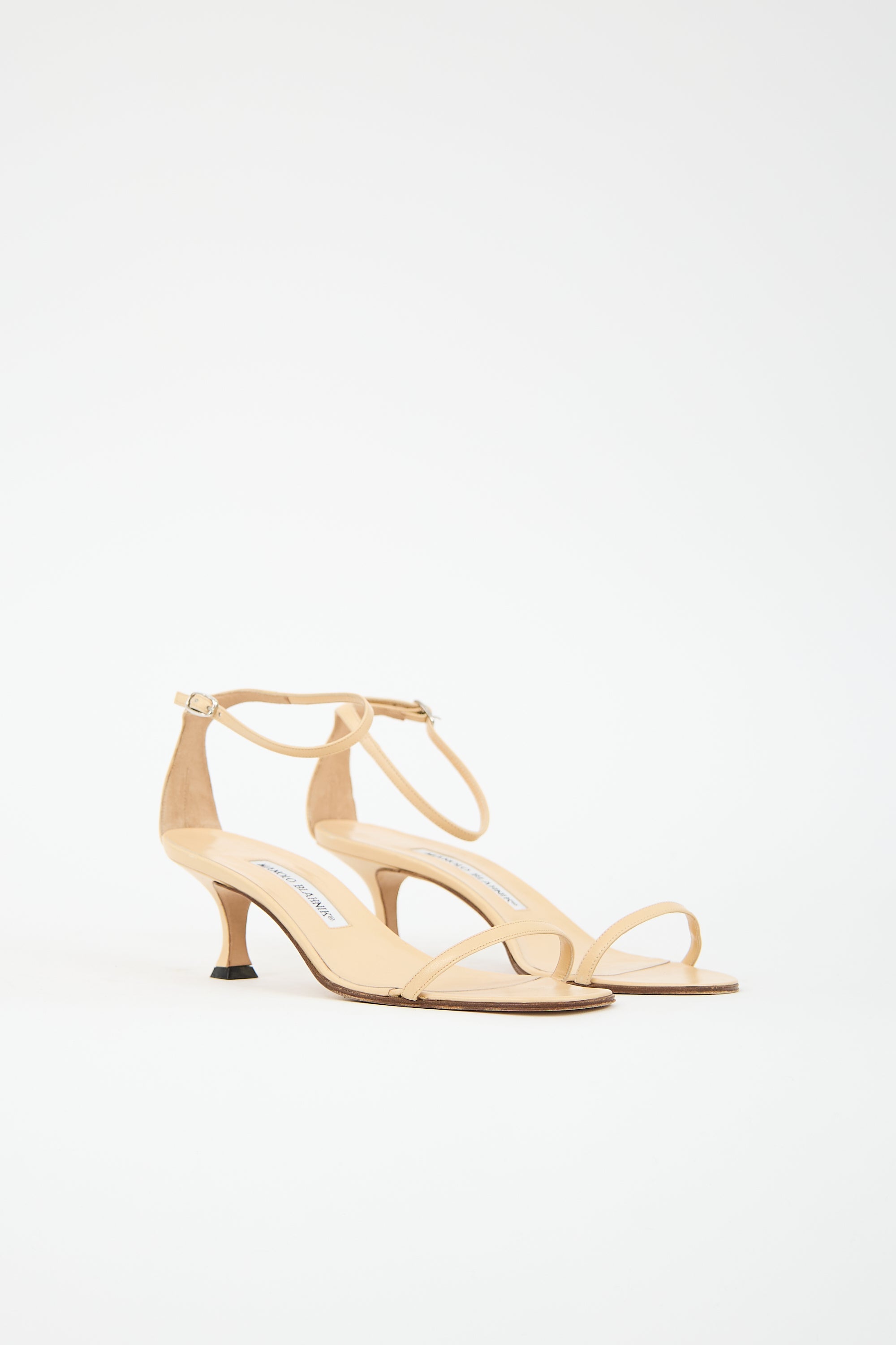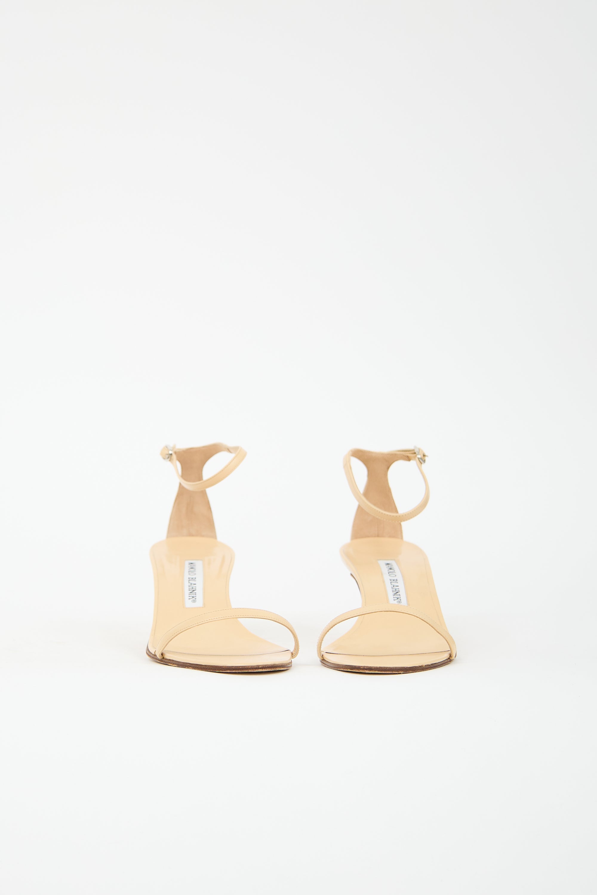 Pre-owned Manolo Blahnik beige leather Chaos sandals featuring open rounded toe, ankle strap with buckle fastening, and covered kitten heel.