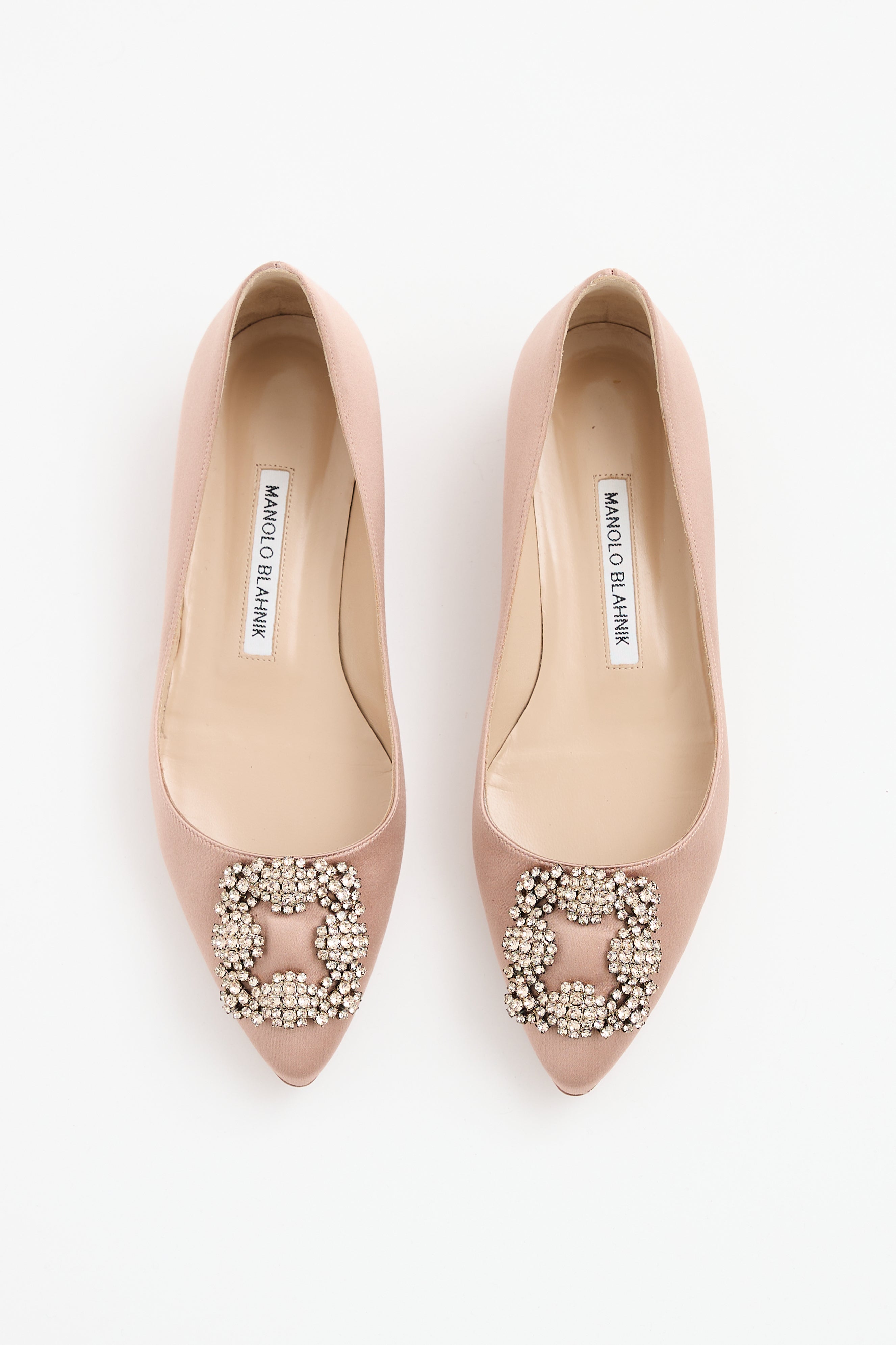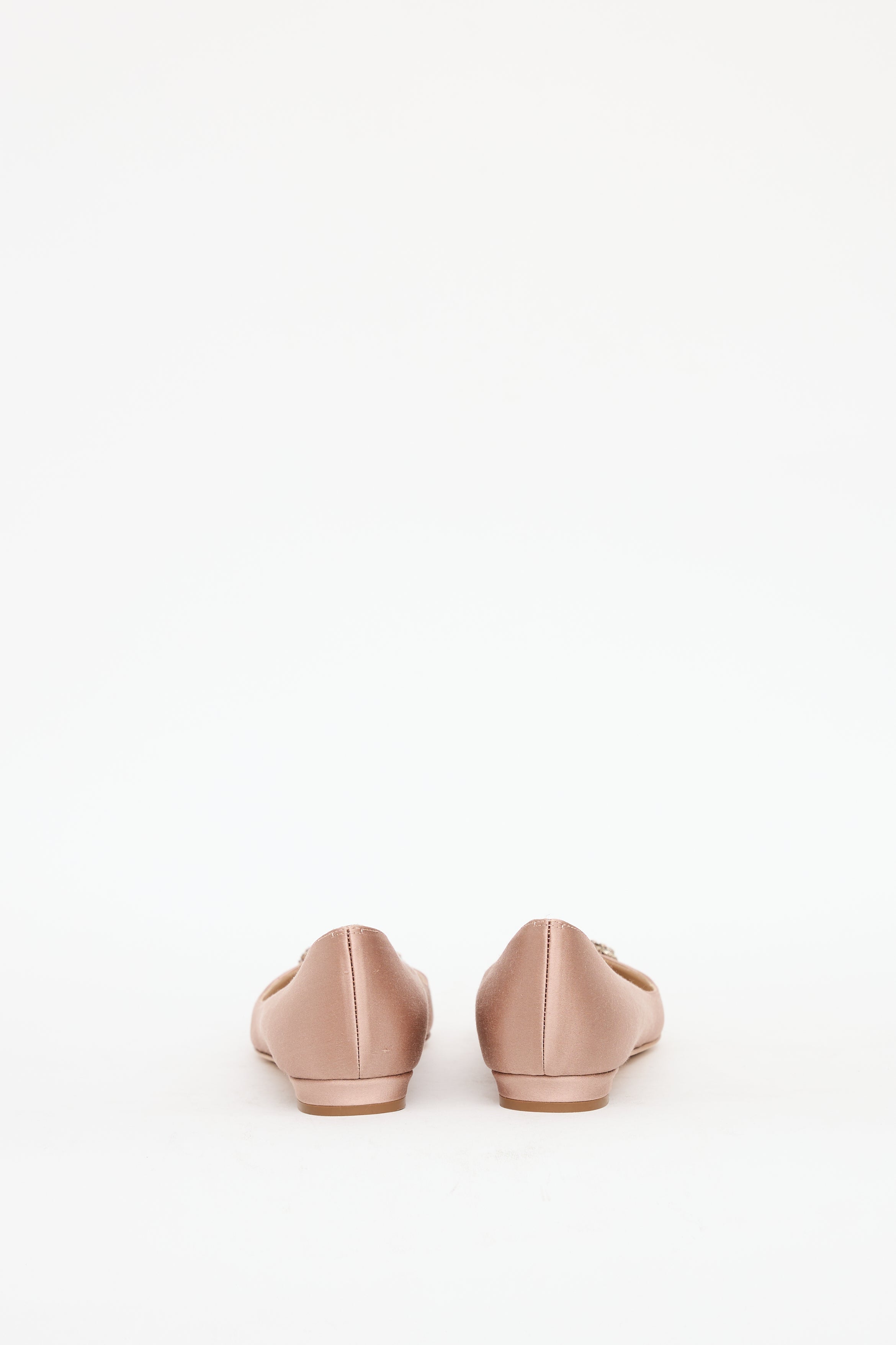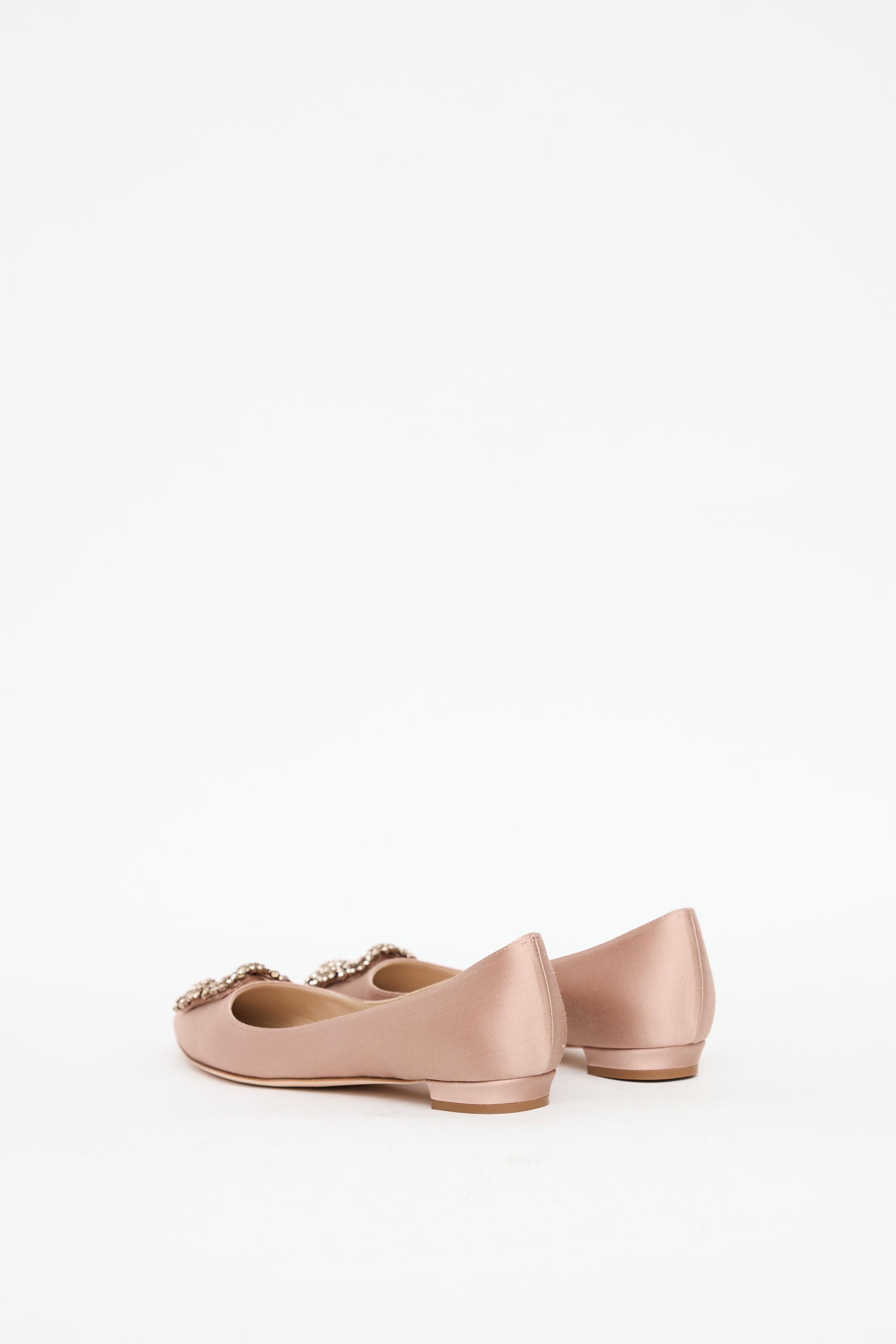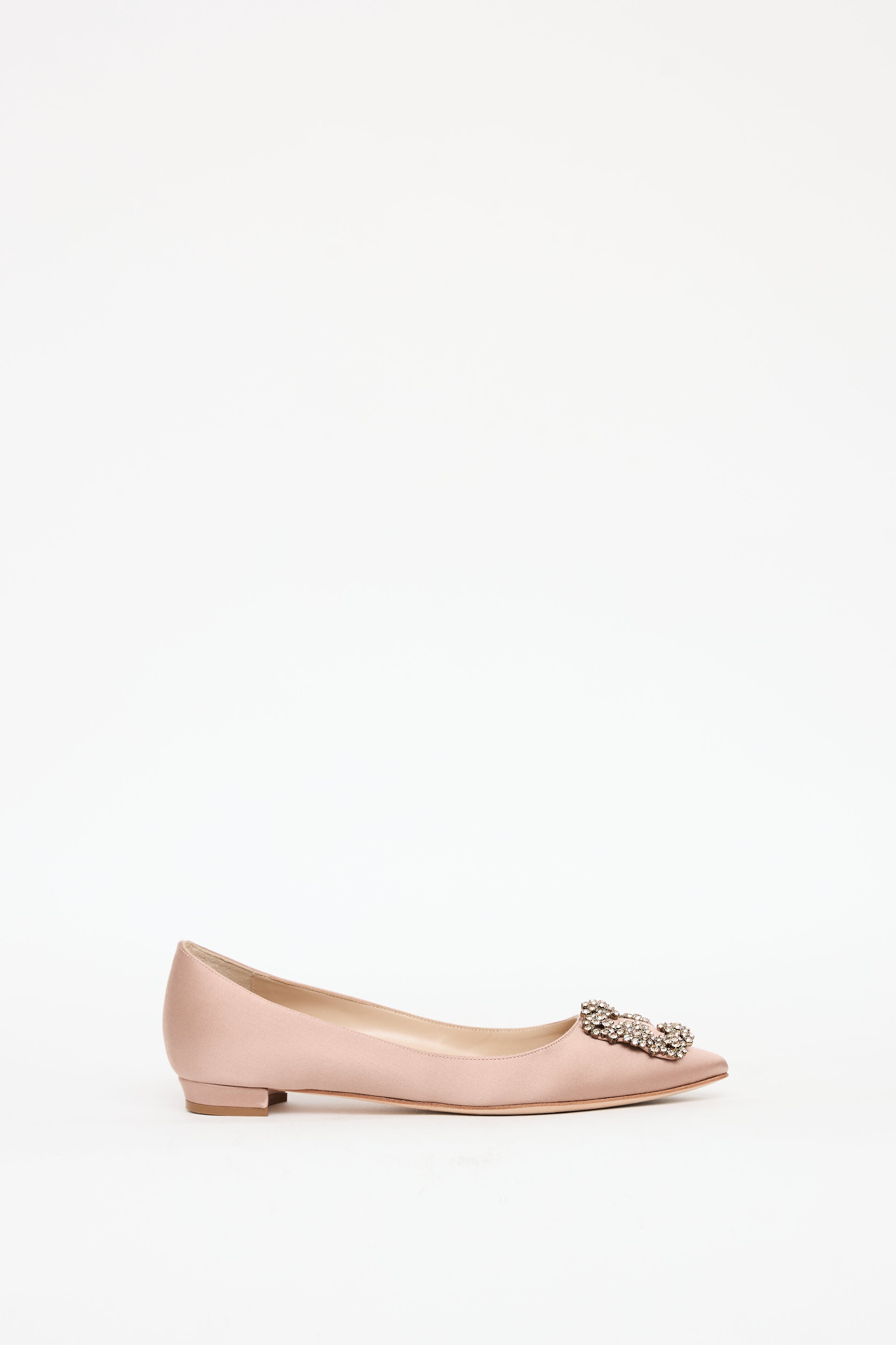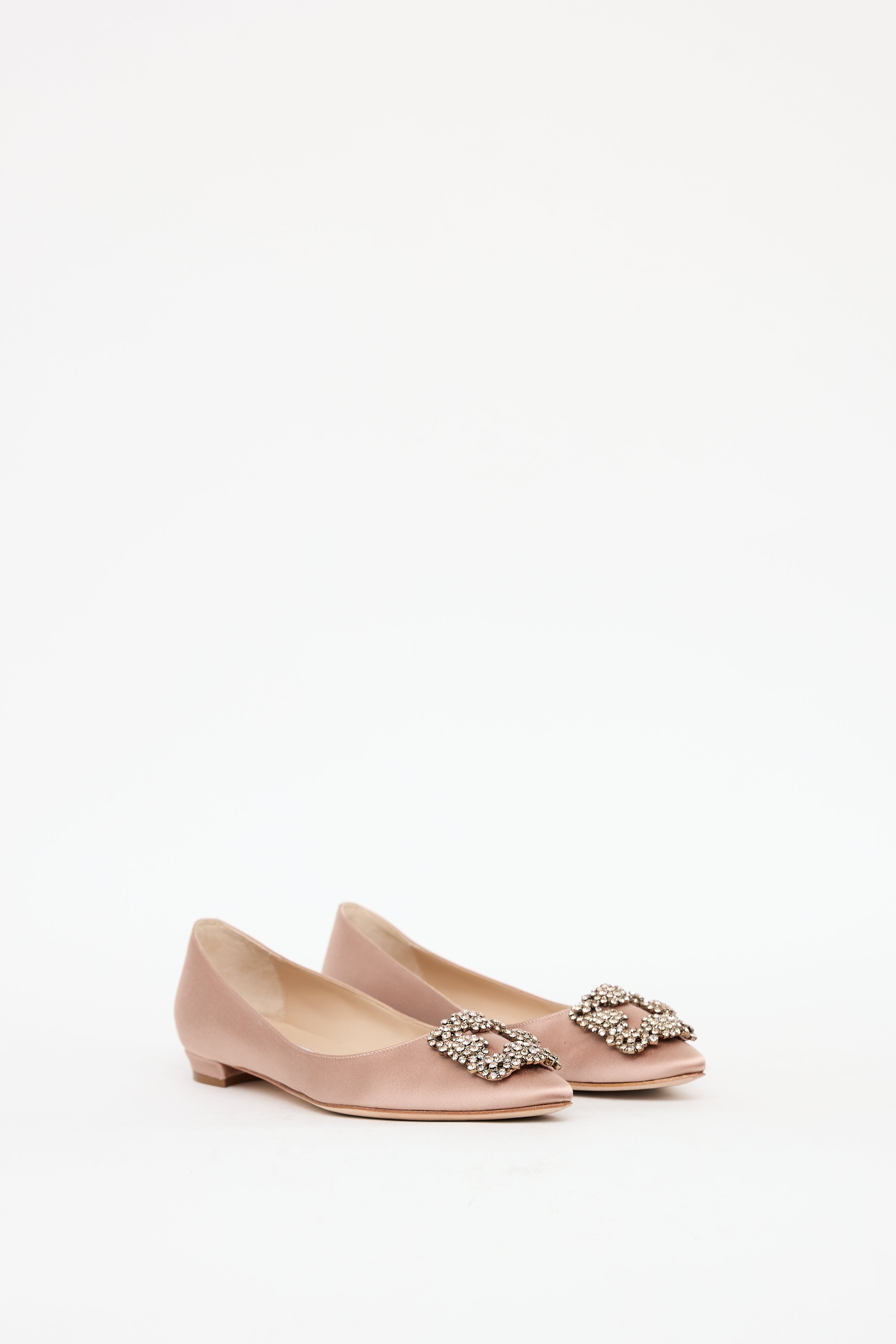 Pre-owned Manolo Blahnik pink Hangisi satin flats featuring a pointed toe, jewel embellished buckle at vamp, and slip on entry.