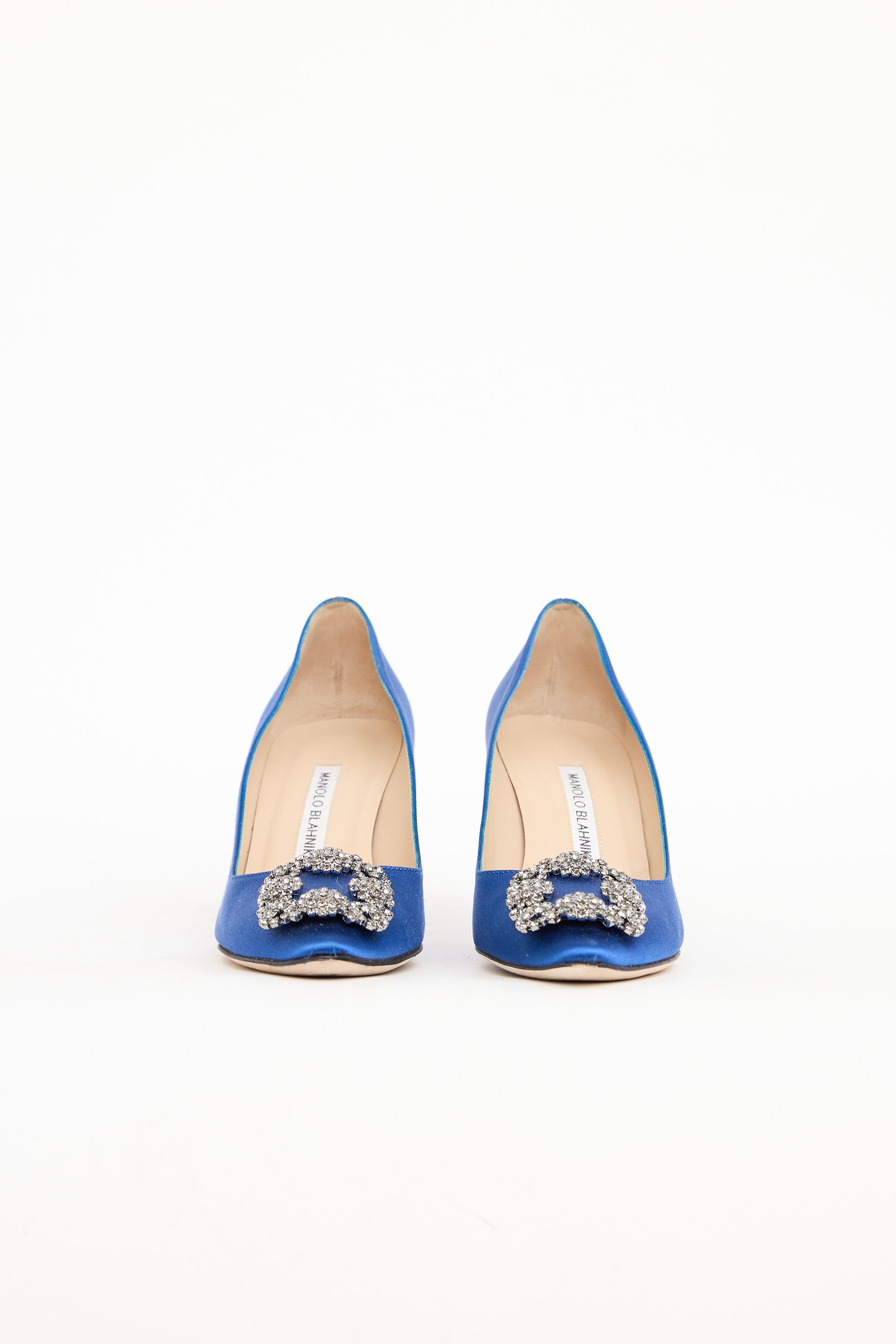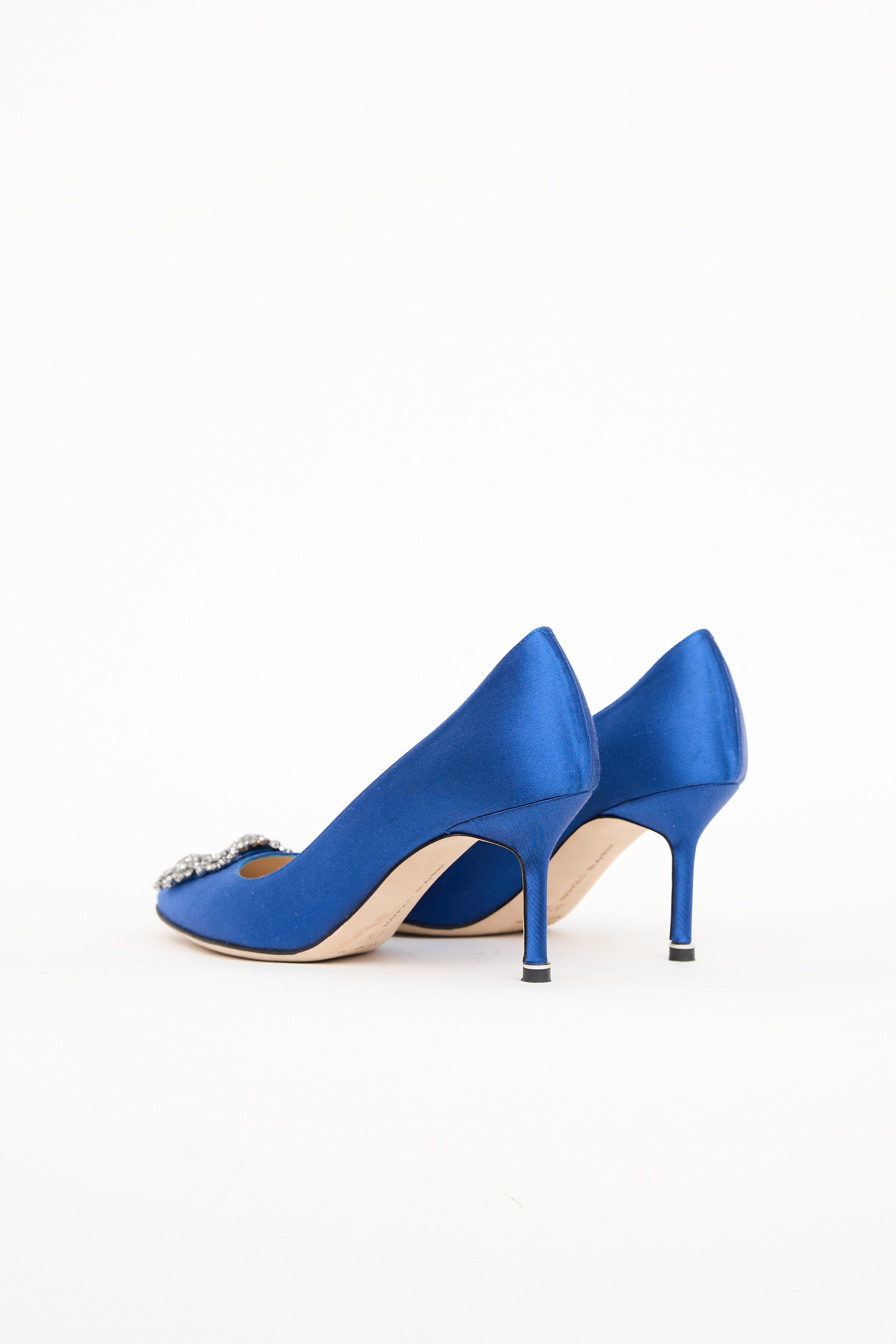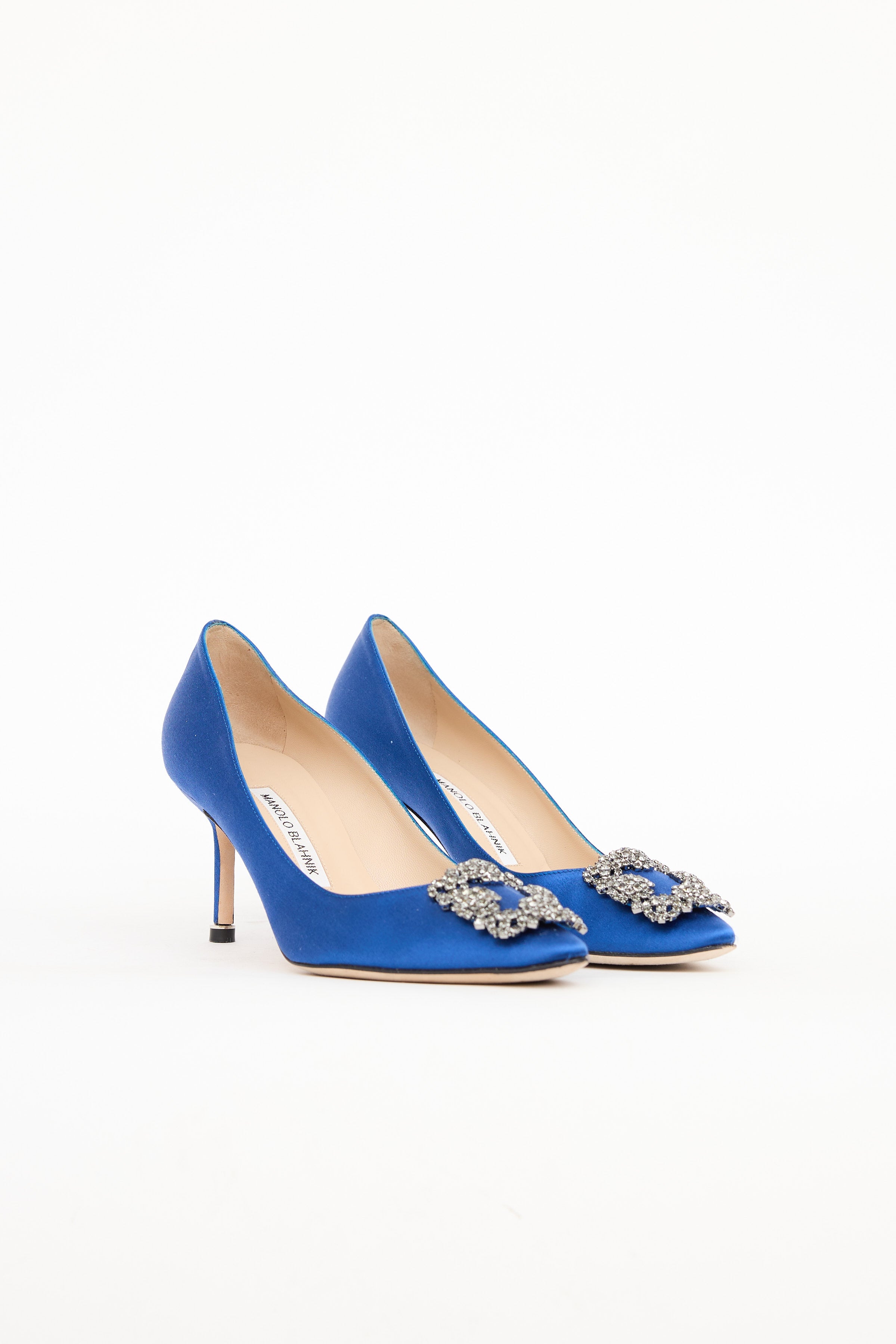 Pre-owned Manolo Blahnik blue satin Hangisi pumps featuring an almond toe, blue satin upper, signature Hangisi embellishment on toe box, satin wrapped heel, and leather outsole.