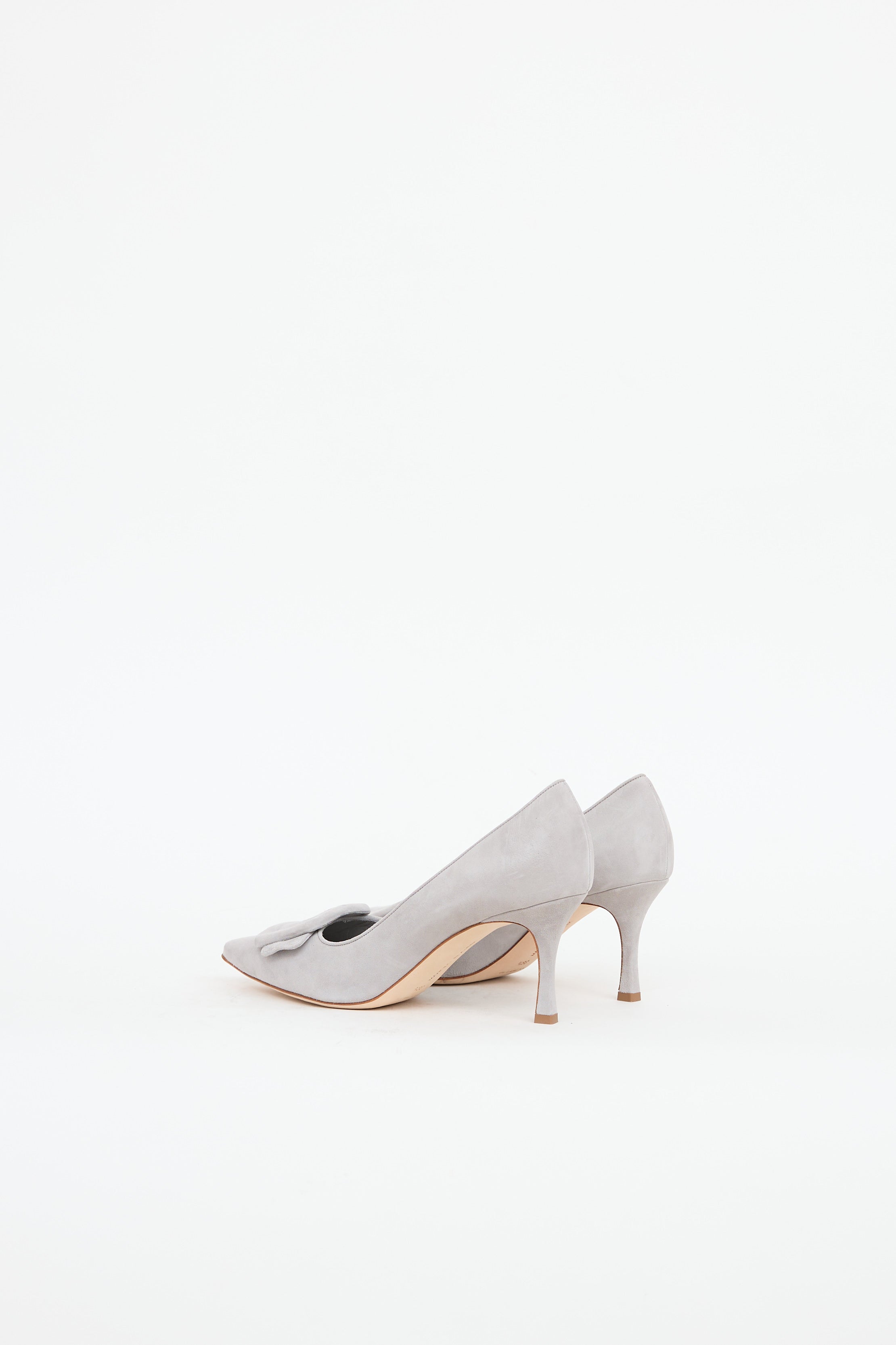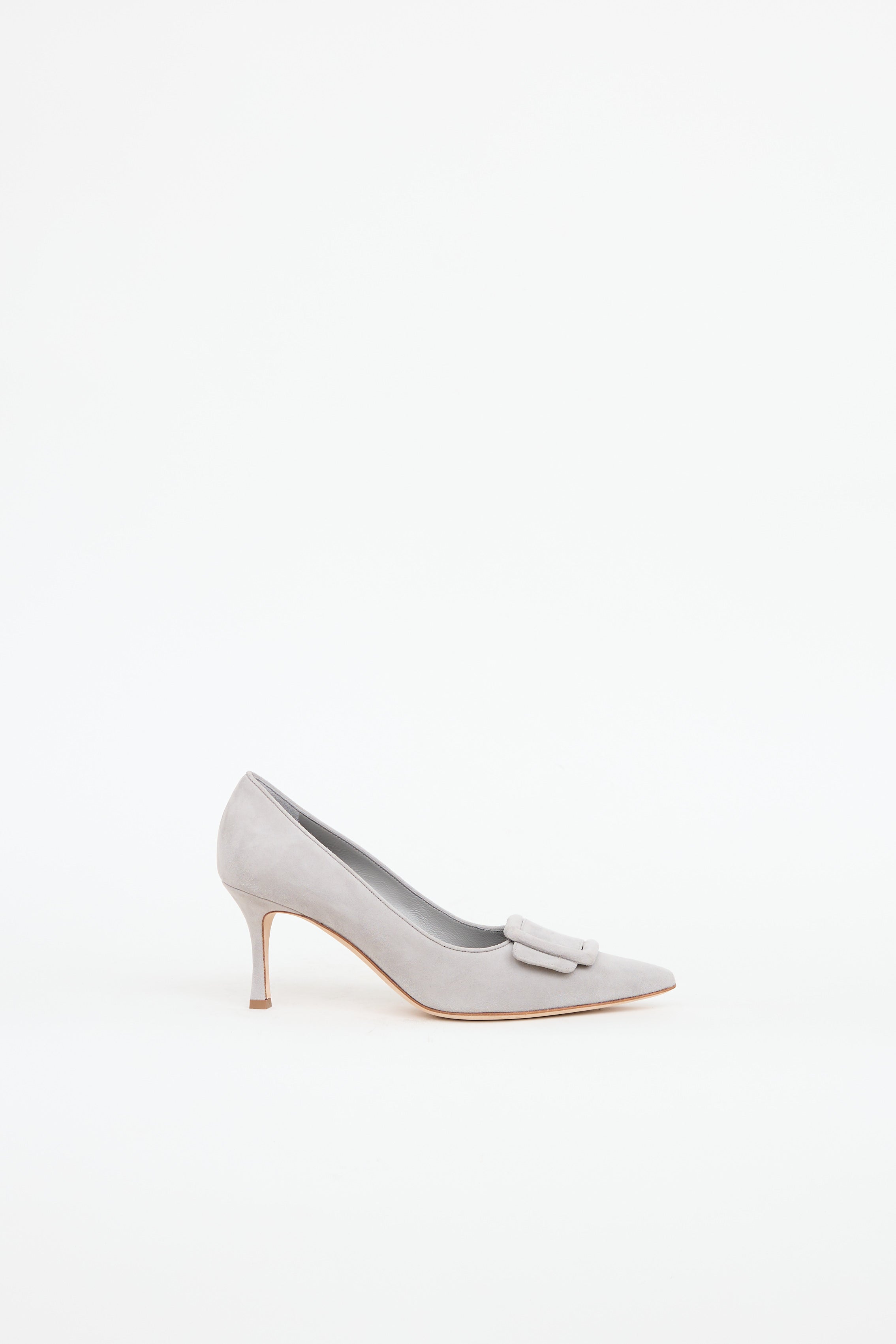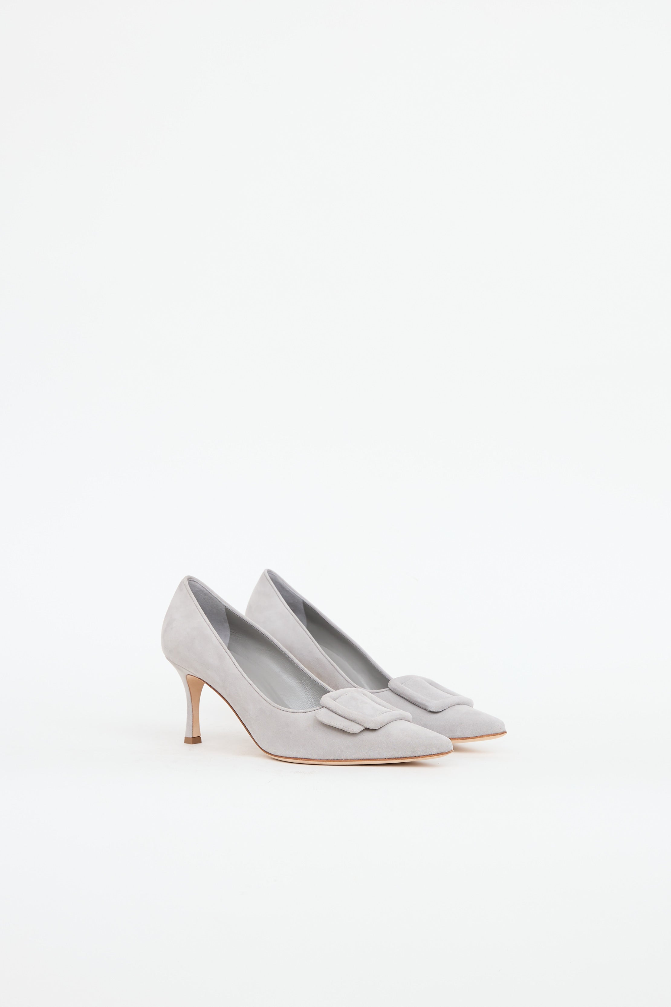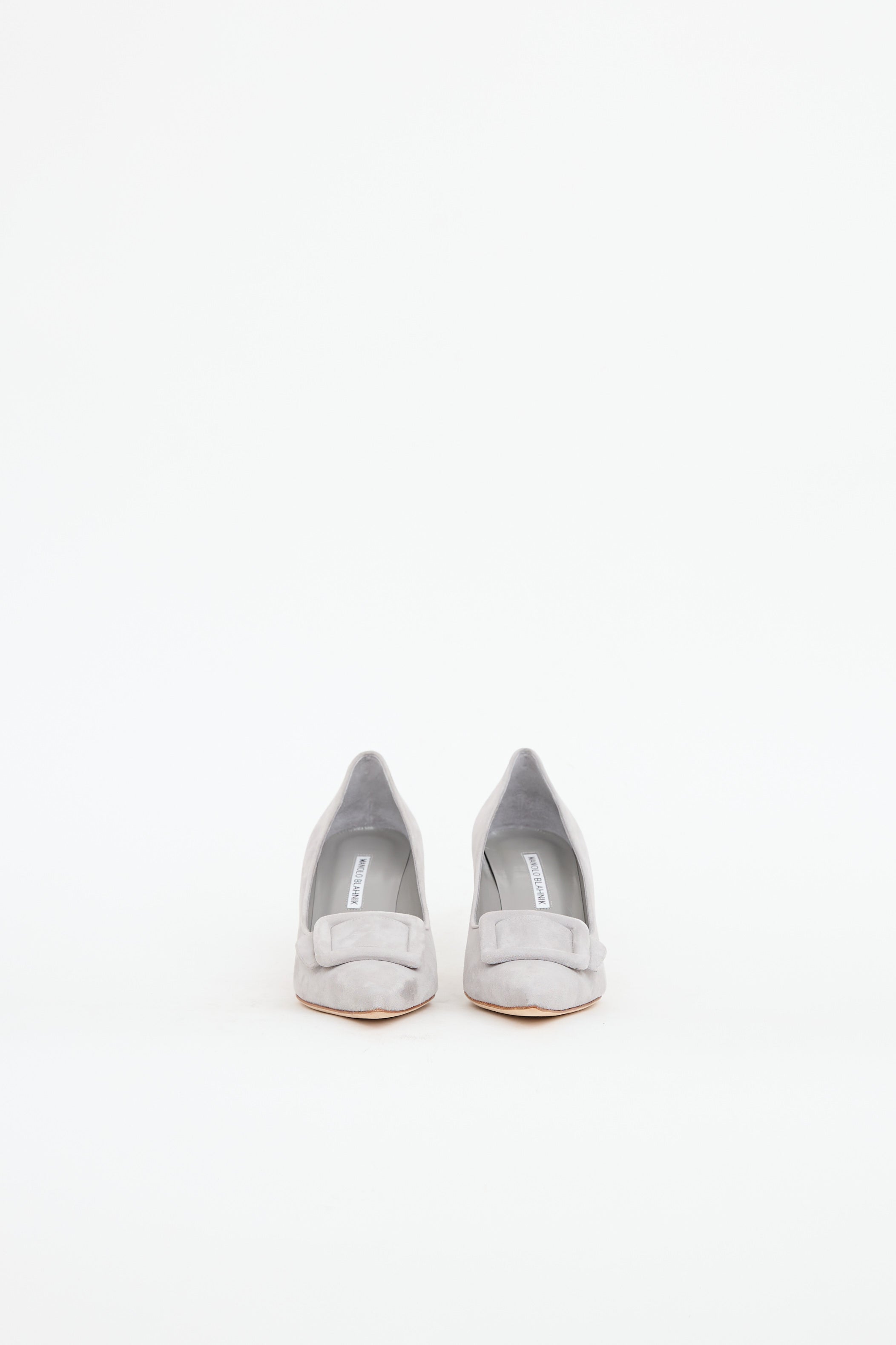 Pre-owned Manolo Blahnik grey suede Maysale pumps featuring pointed toe, strap with oversized buckle detail on toe box, rolled edges and covered heel.