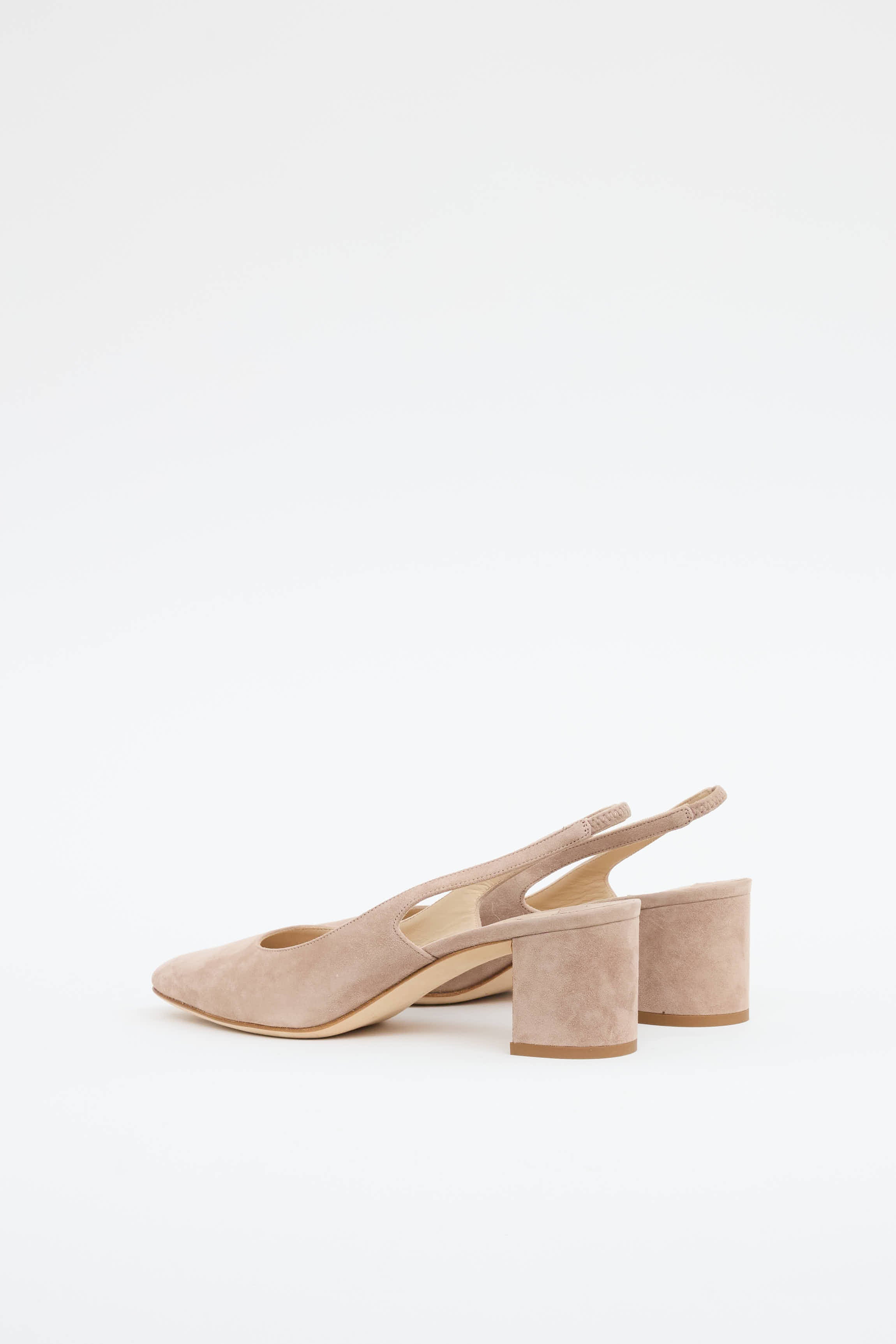 Pre-owned Manolo Blahnik beige suede pump featuring almond toe, slingback, and covered block heel.
