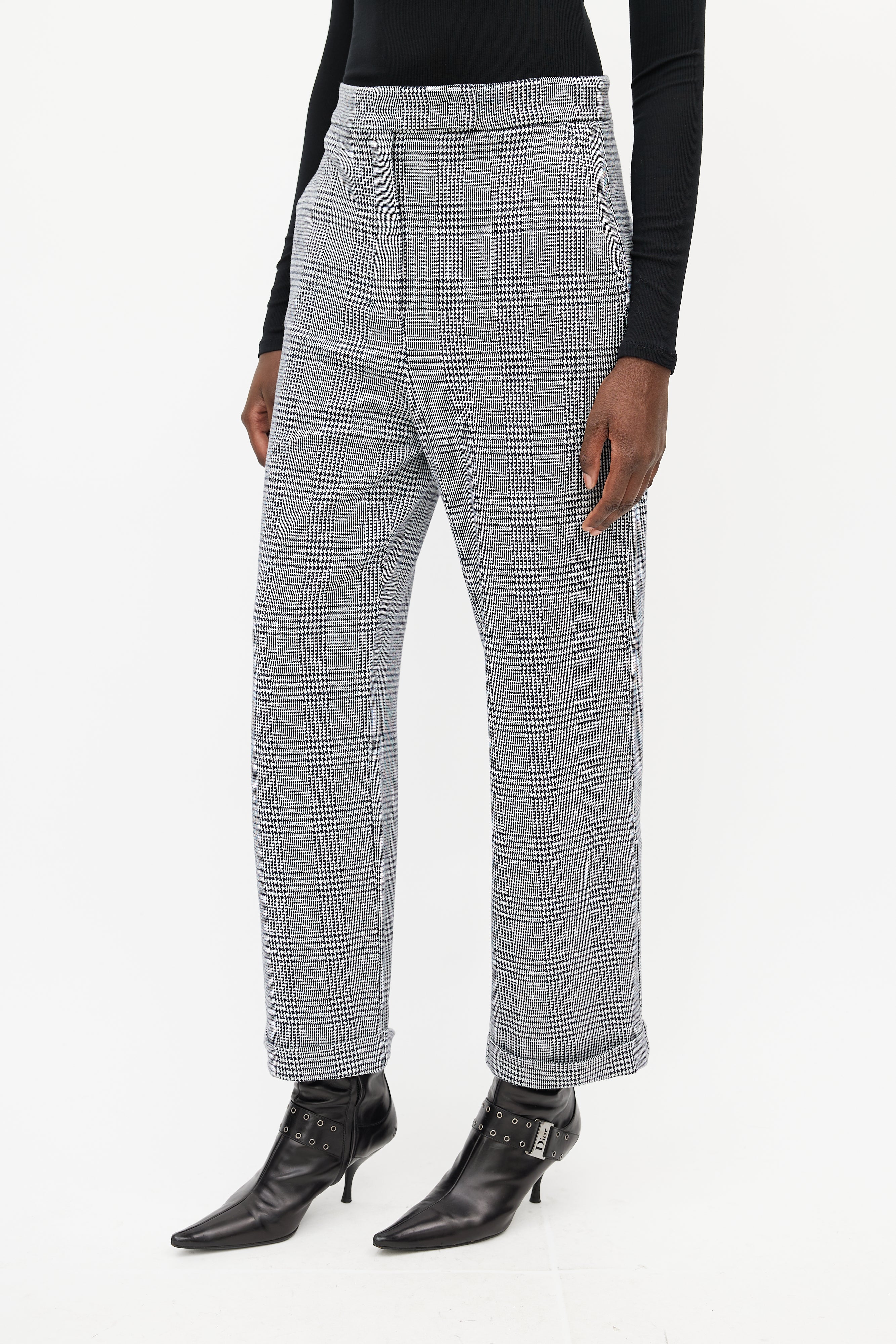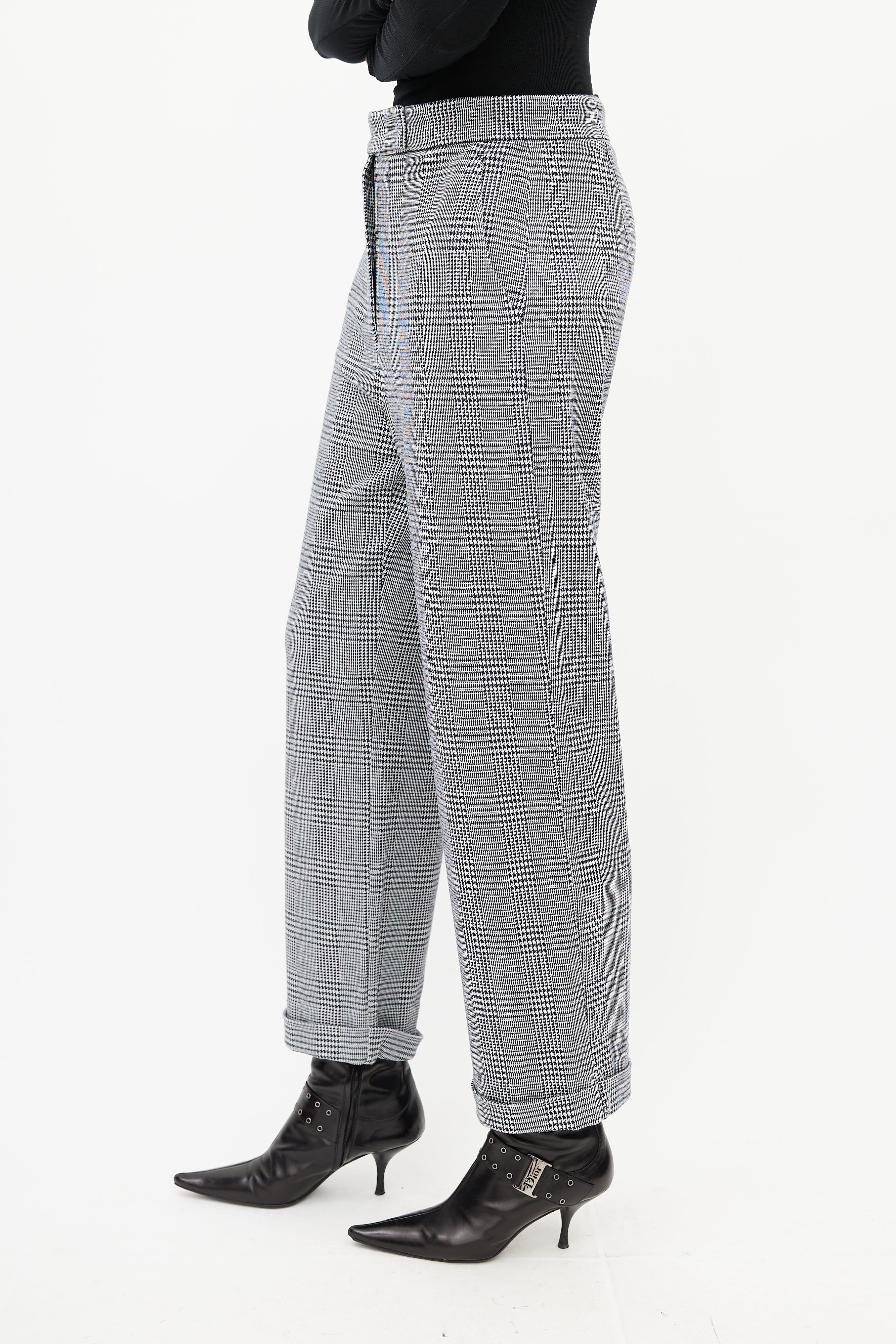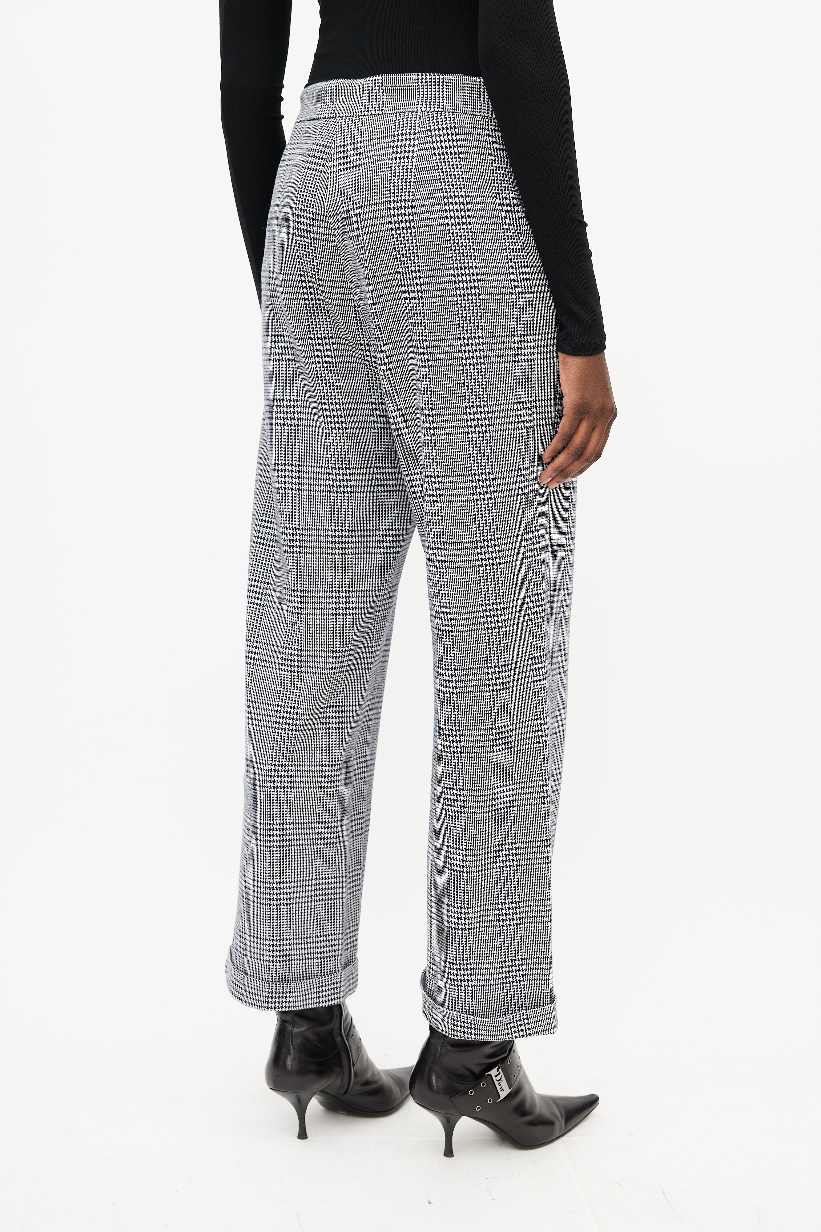 Pre-owned Max Mara black and white trousers featuring a houndstooth print throughout, two slip pockets at hip, wide leg, pleated cuff, and zip fly with hook and eye closure.