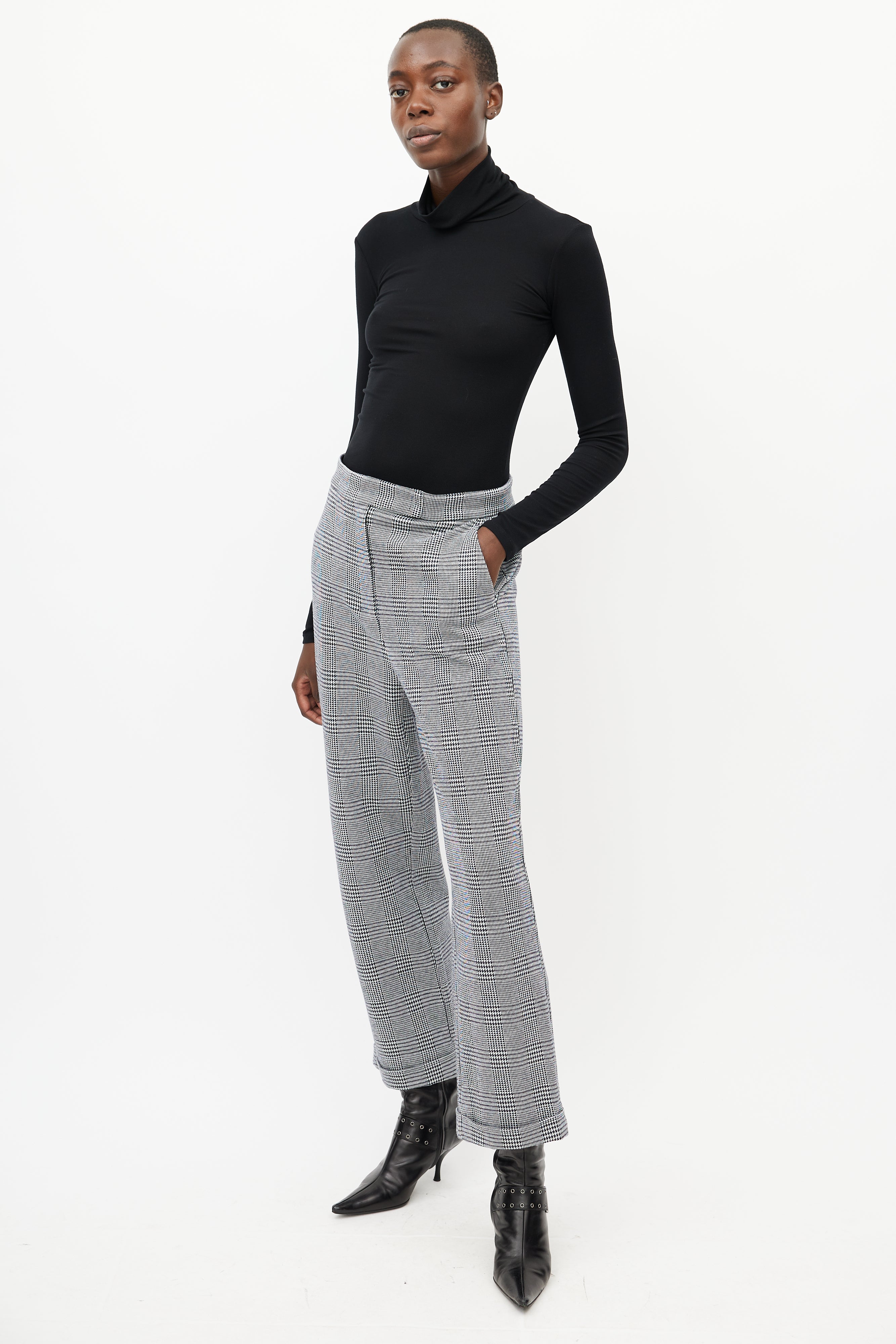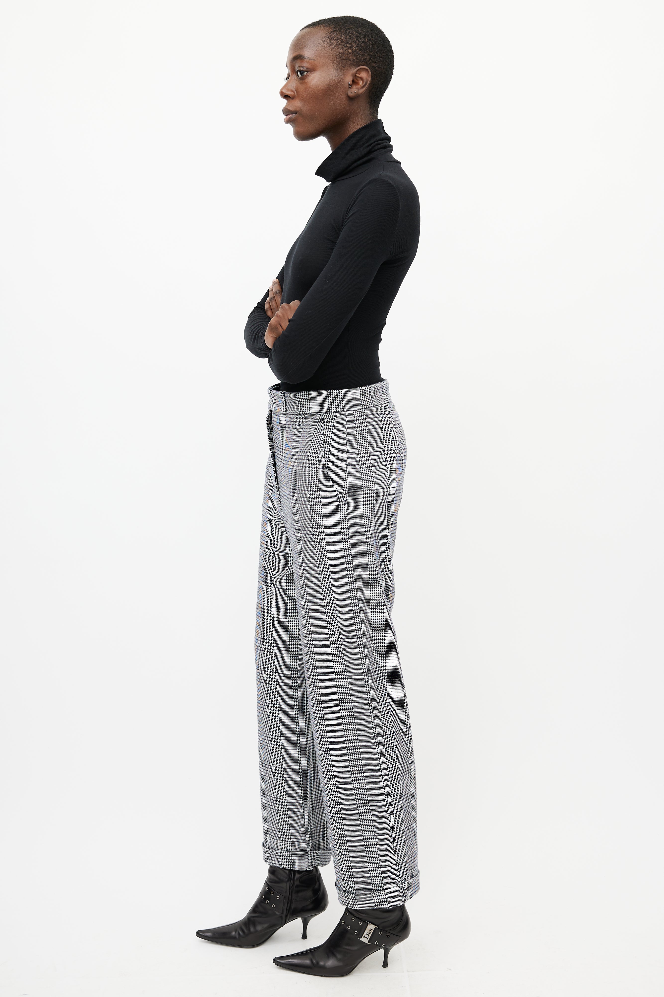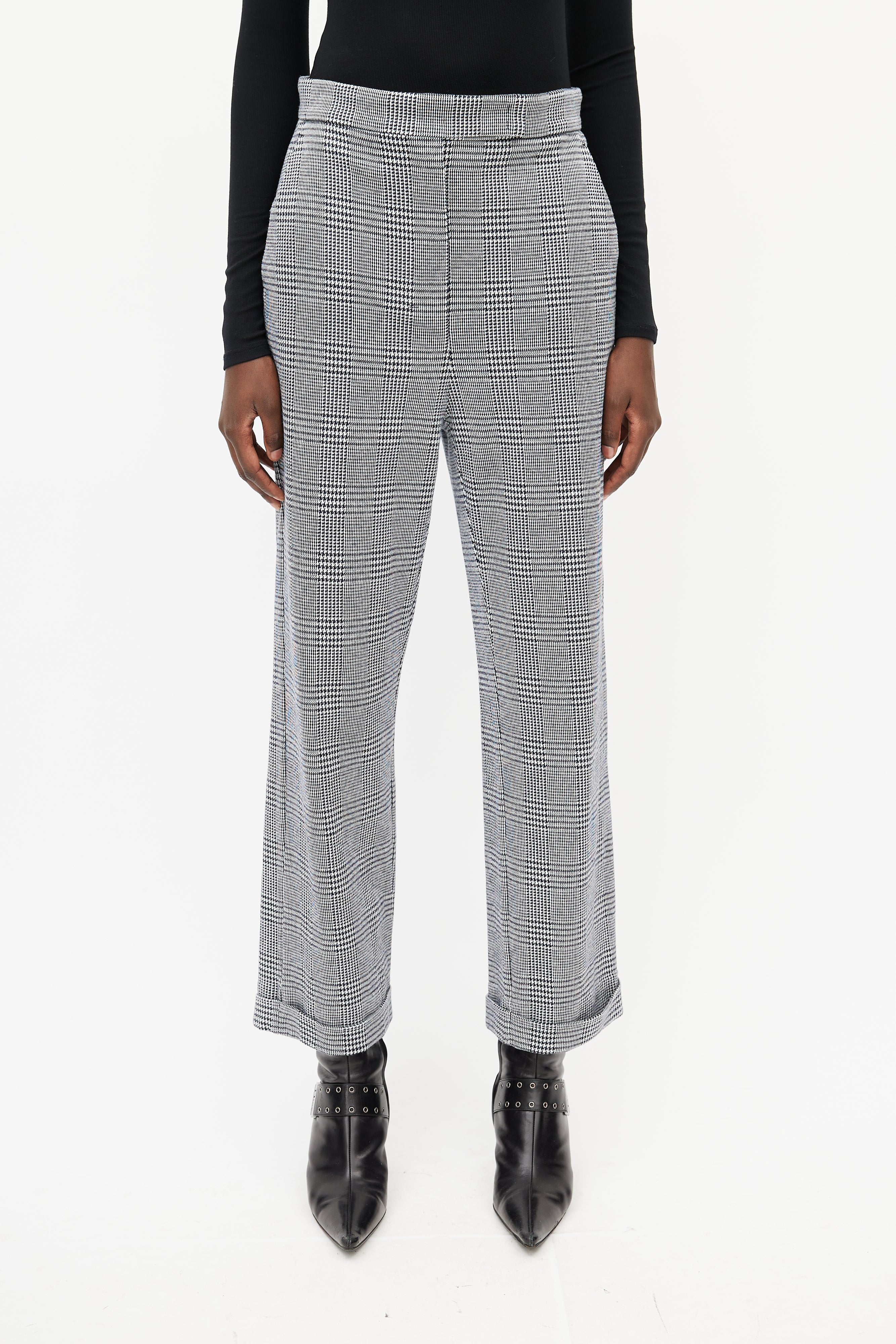 Pre-owned Max Mara black and white trousers featuring a houndstooth print throughout, two slip pockets at hip, wide leg, pleated cuff, and zip fly with hook and eye closure.