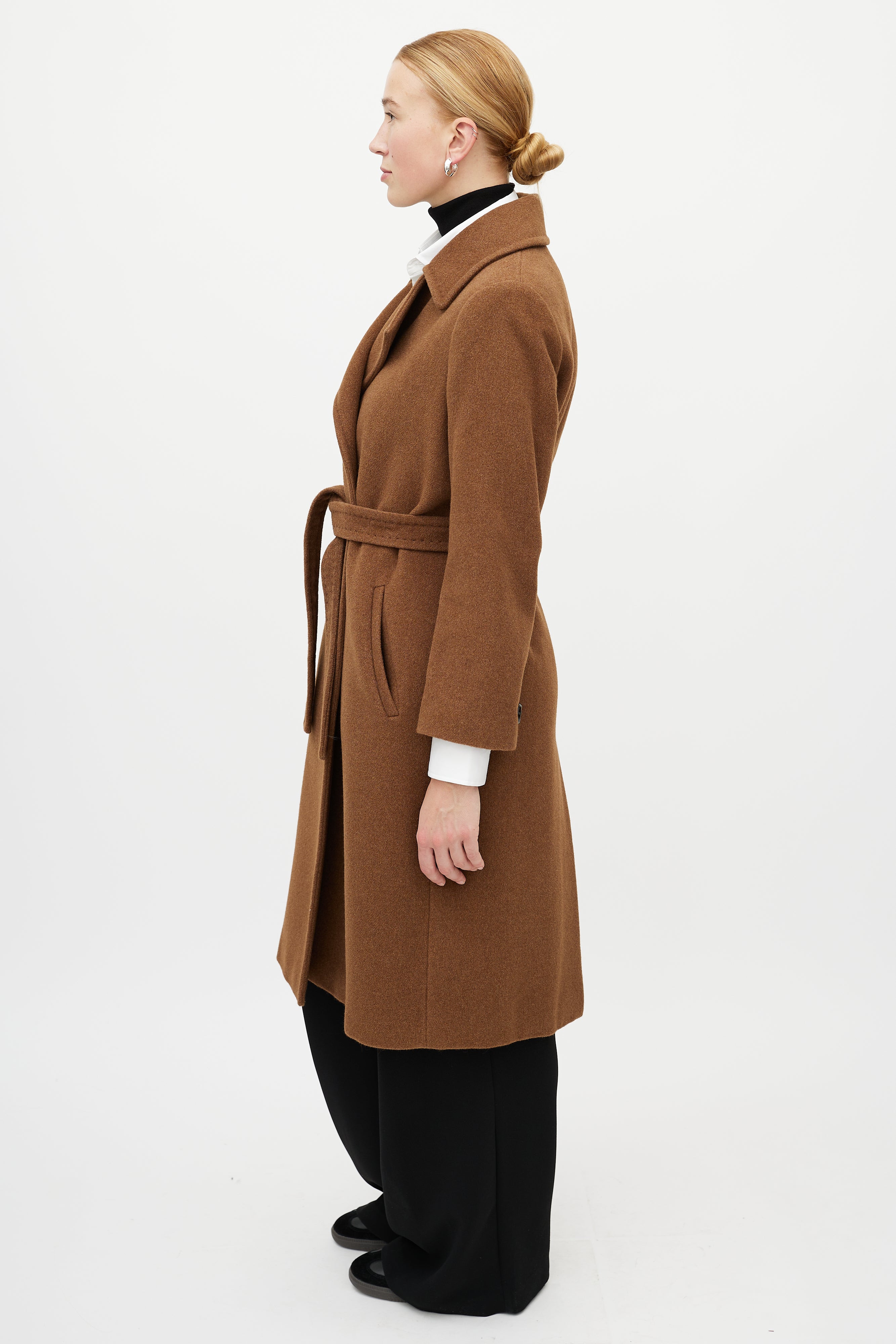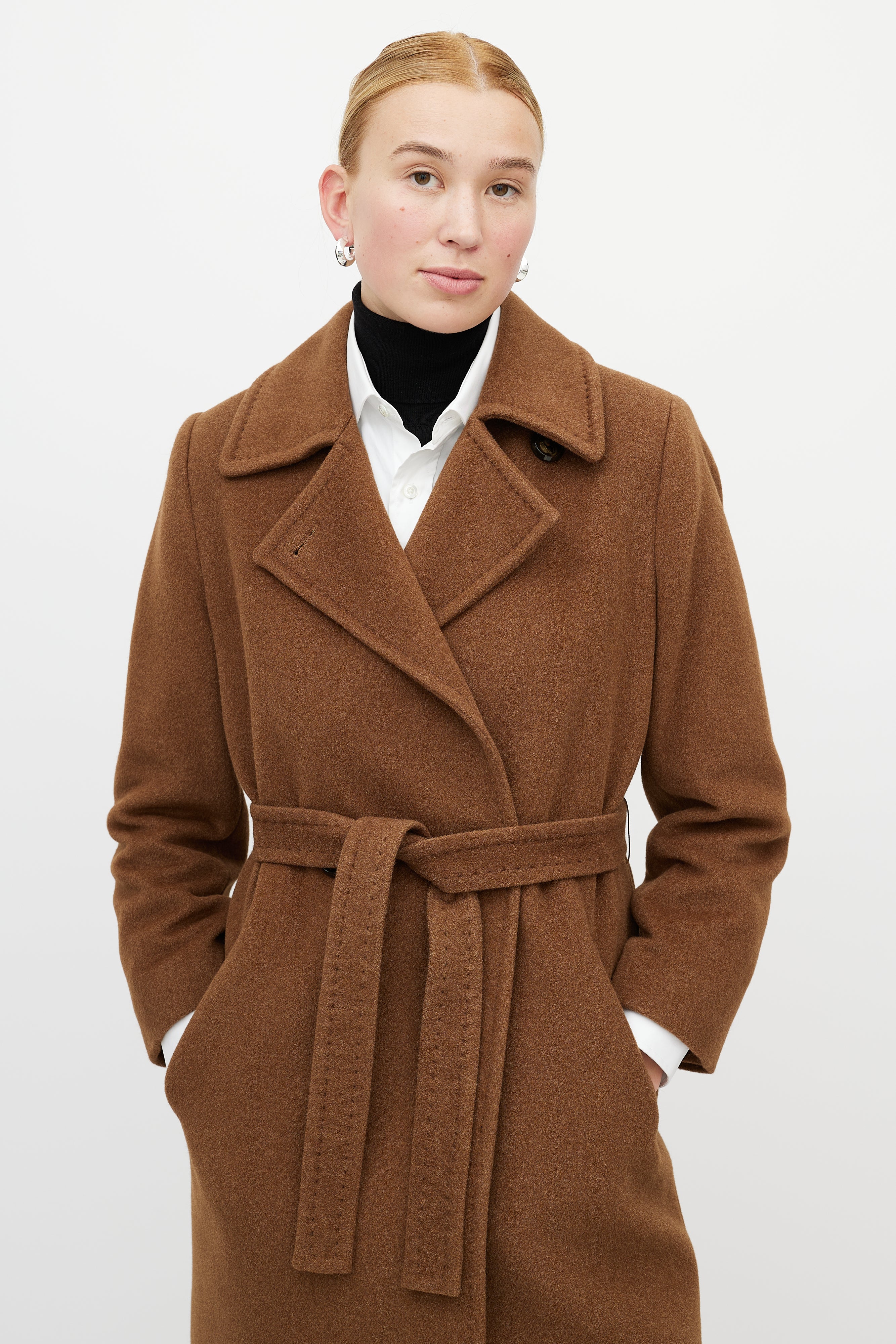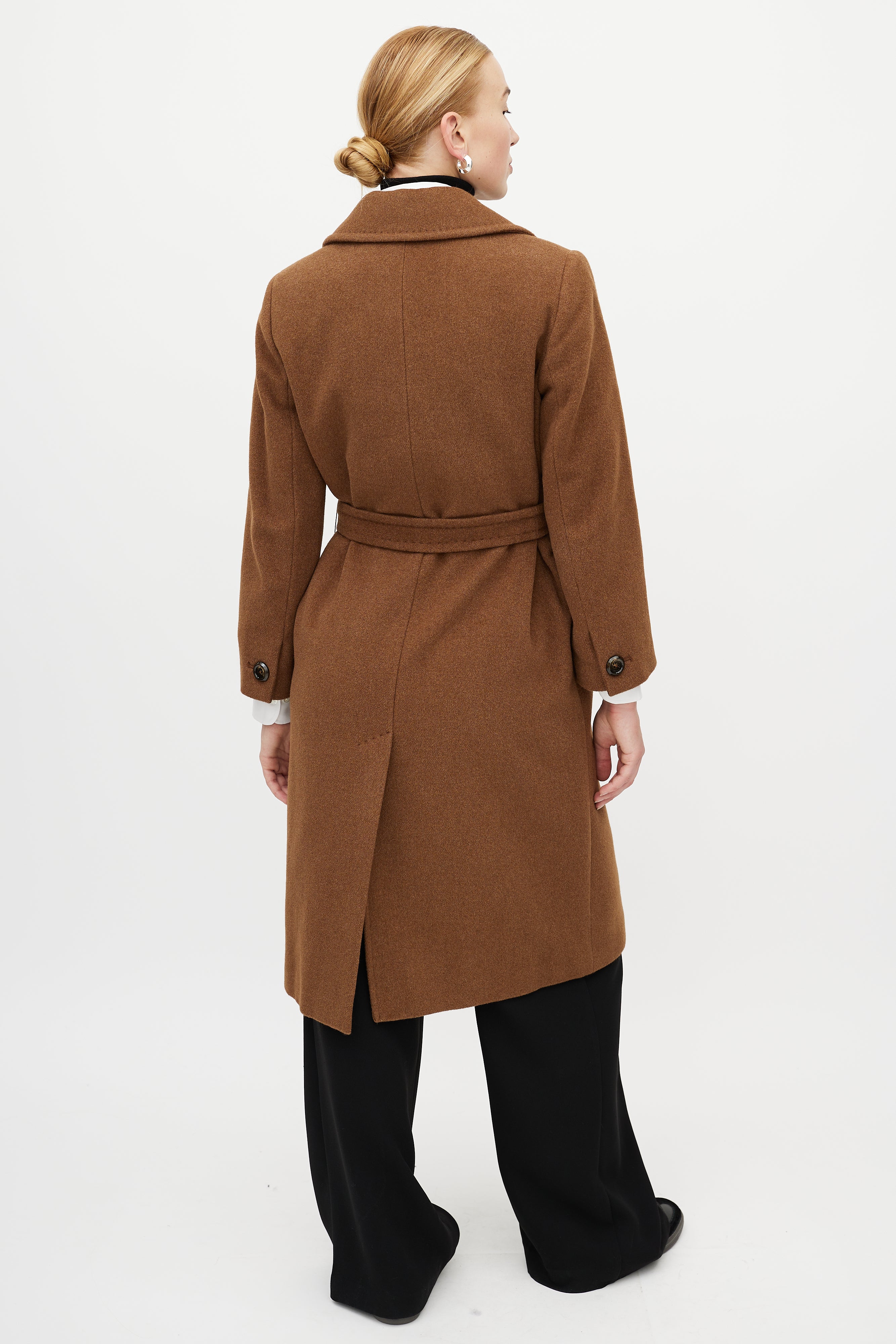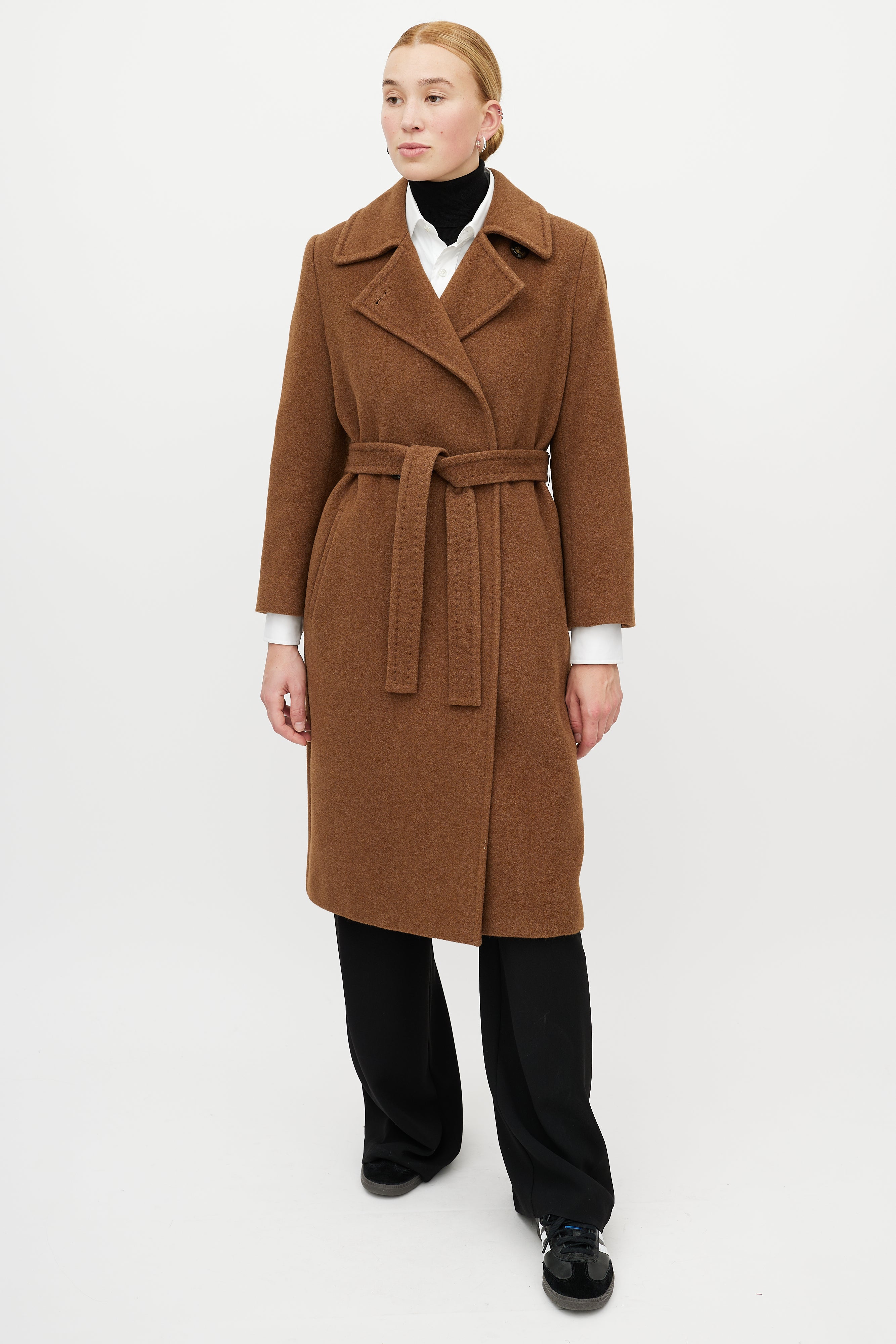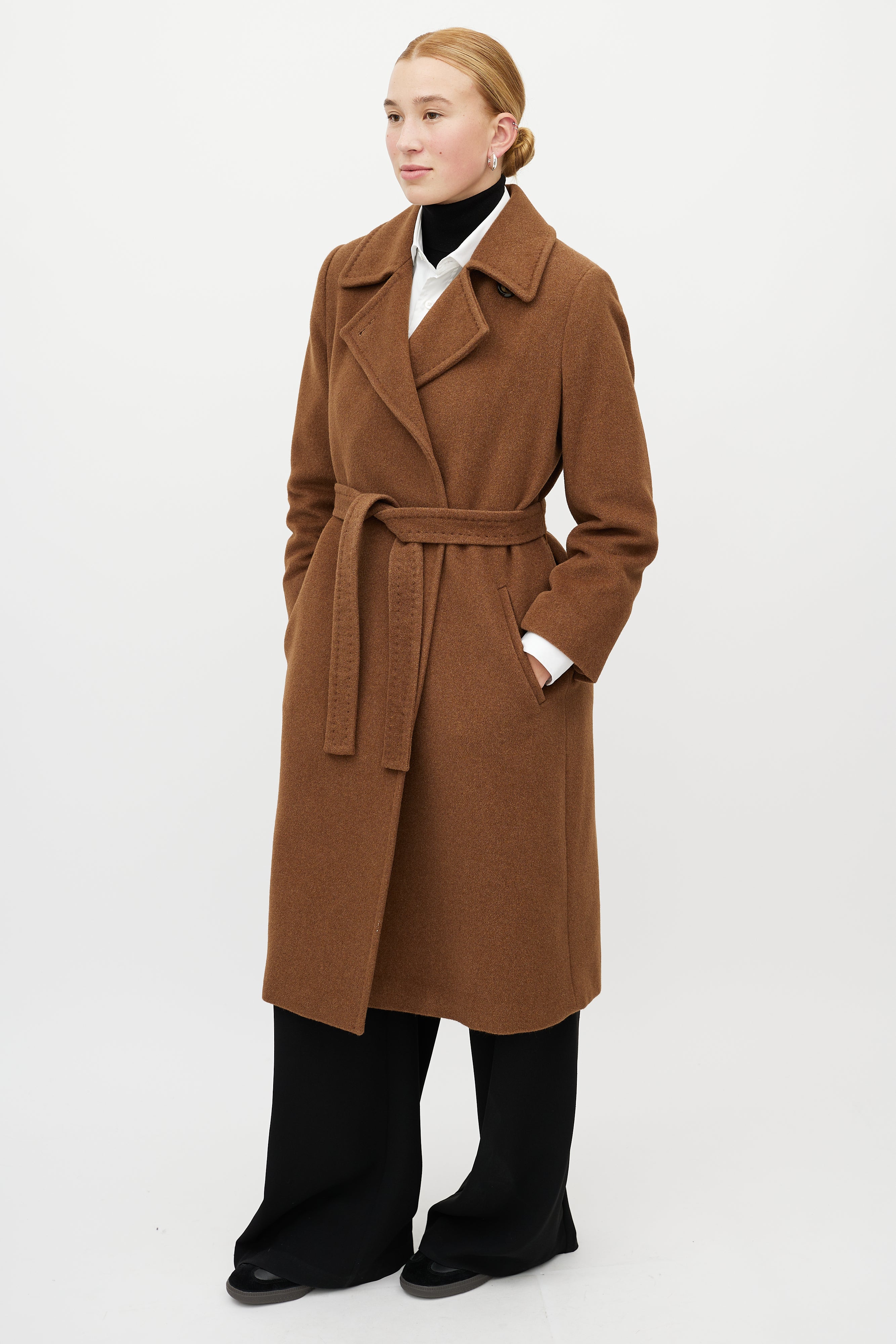 Pre-owned Max Mara brown wool coat featuring a notched lapel, long sleeves with buttoned cuffs, two slip pockets at waist, tie belt at waist, and double breasted button closure. Lined.